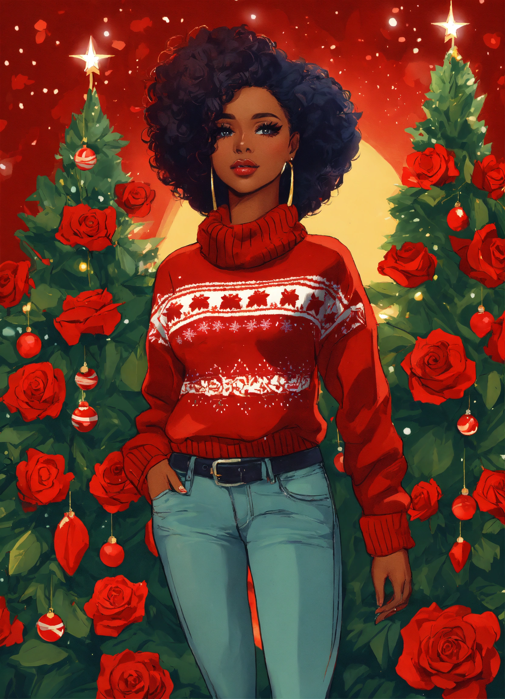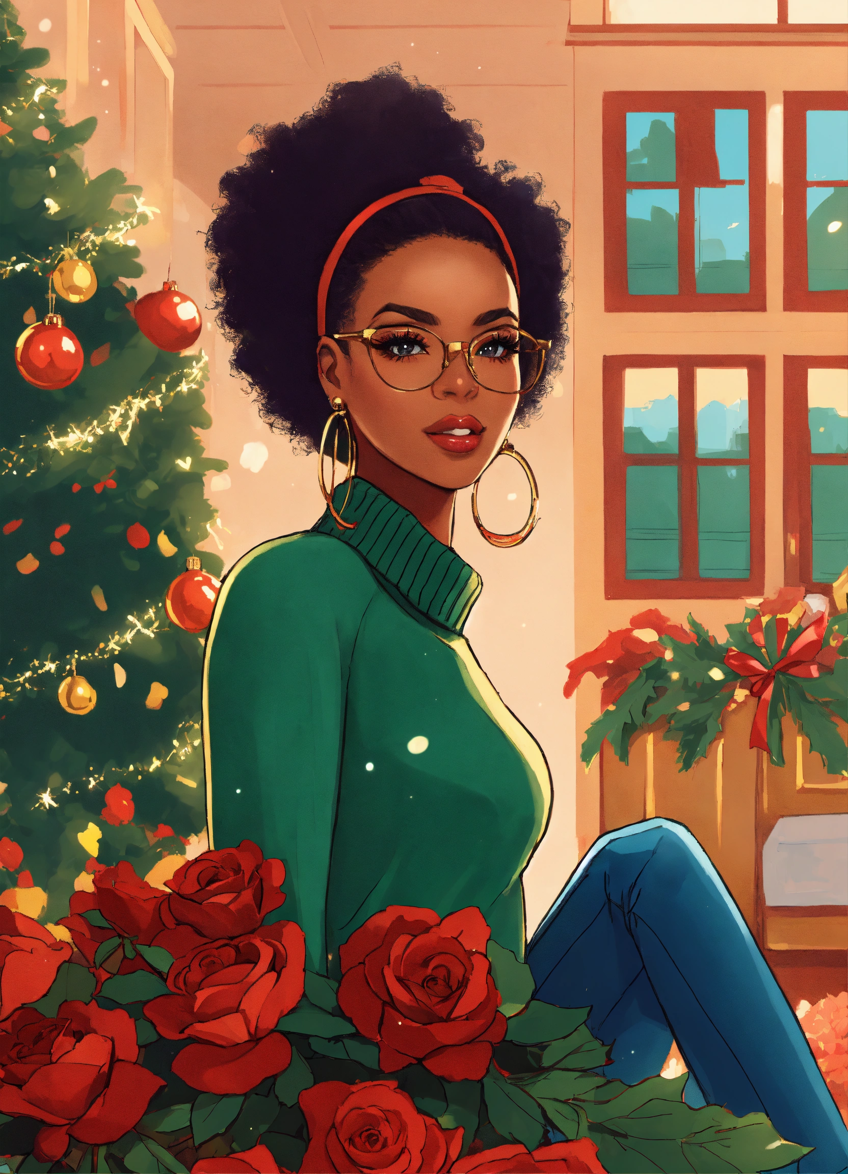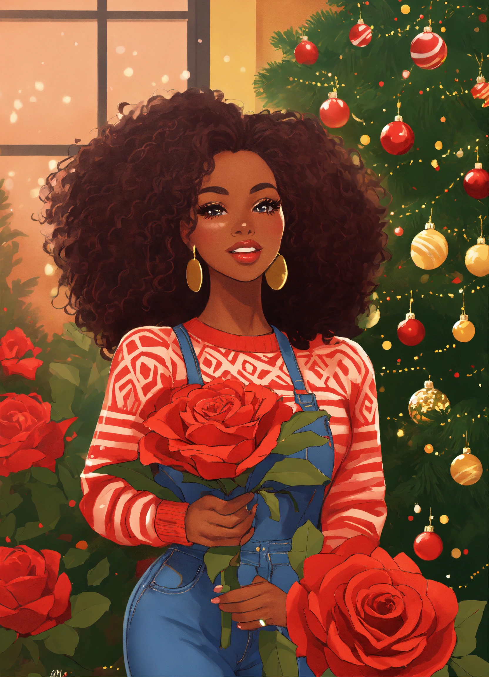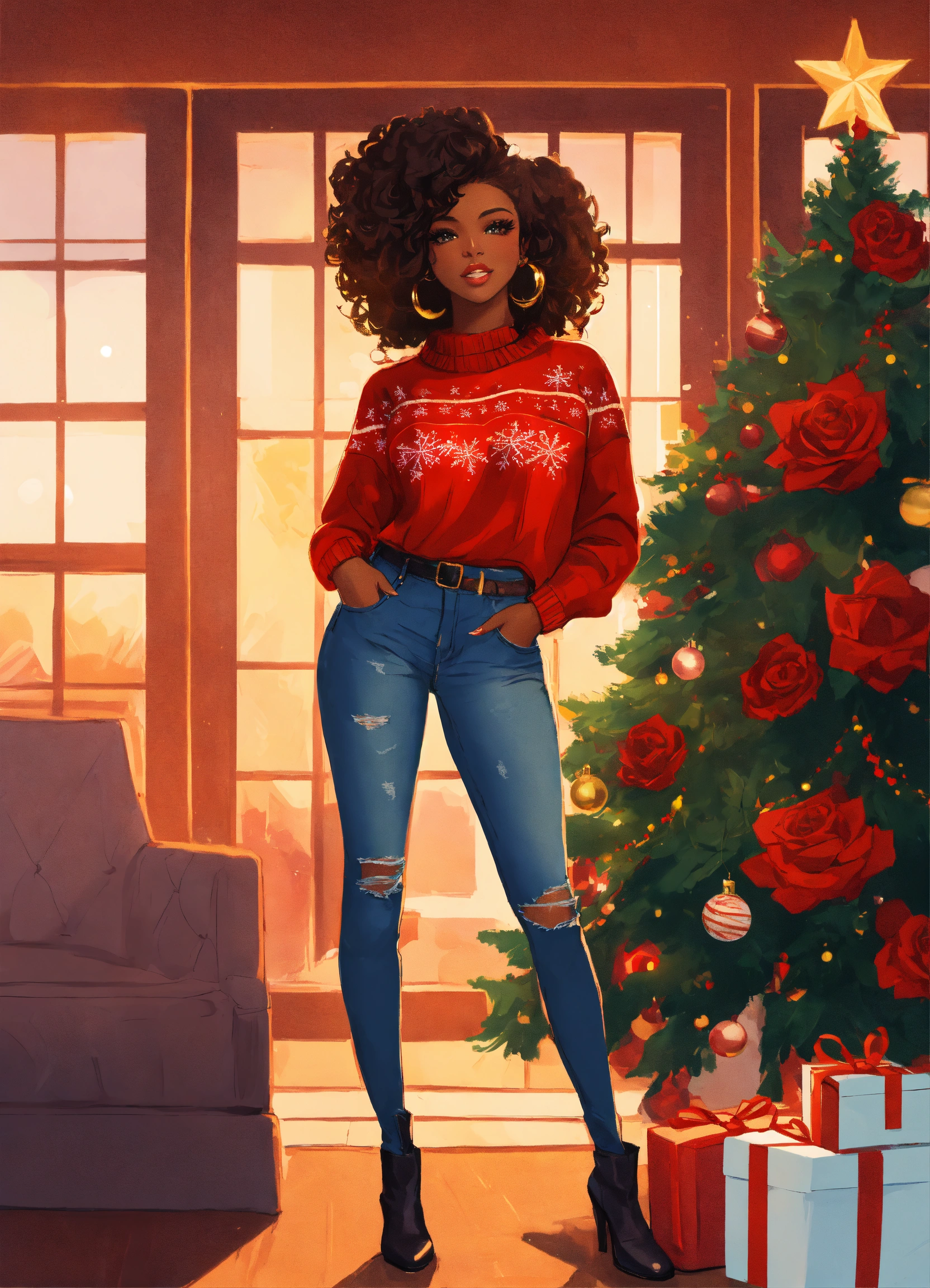 “illustration of a radiant african american woman entrepreneur, characterized by big eyes, long lashes, and full lips. she’s fashionably dressed in ripped jeans, thigh high boots and a beautiful christmas sweater holding a bundle of red roses. she elegantly stands in front of a beautifully decorated christmas tree. the overall color palette is warm and inviting, resonating with her determination and the positive influence of her venture.”