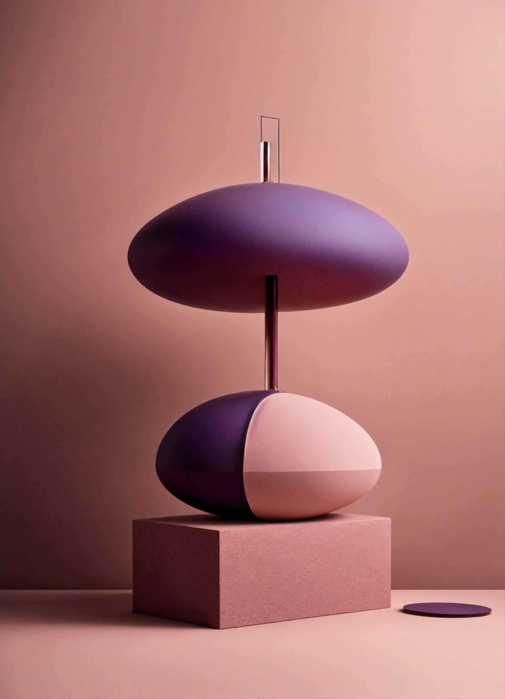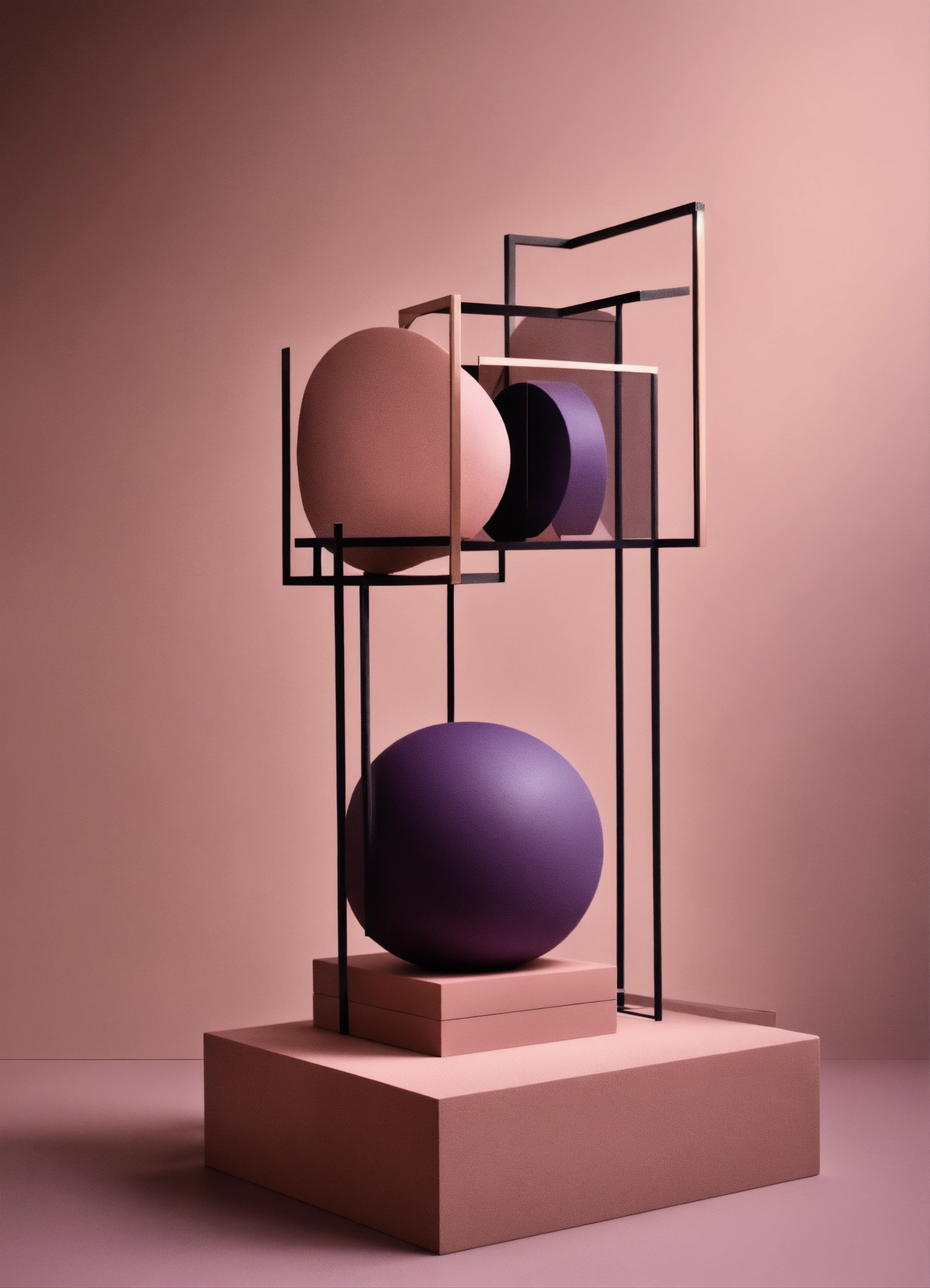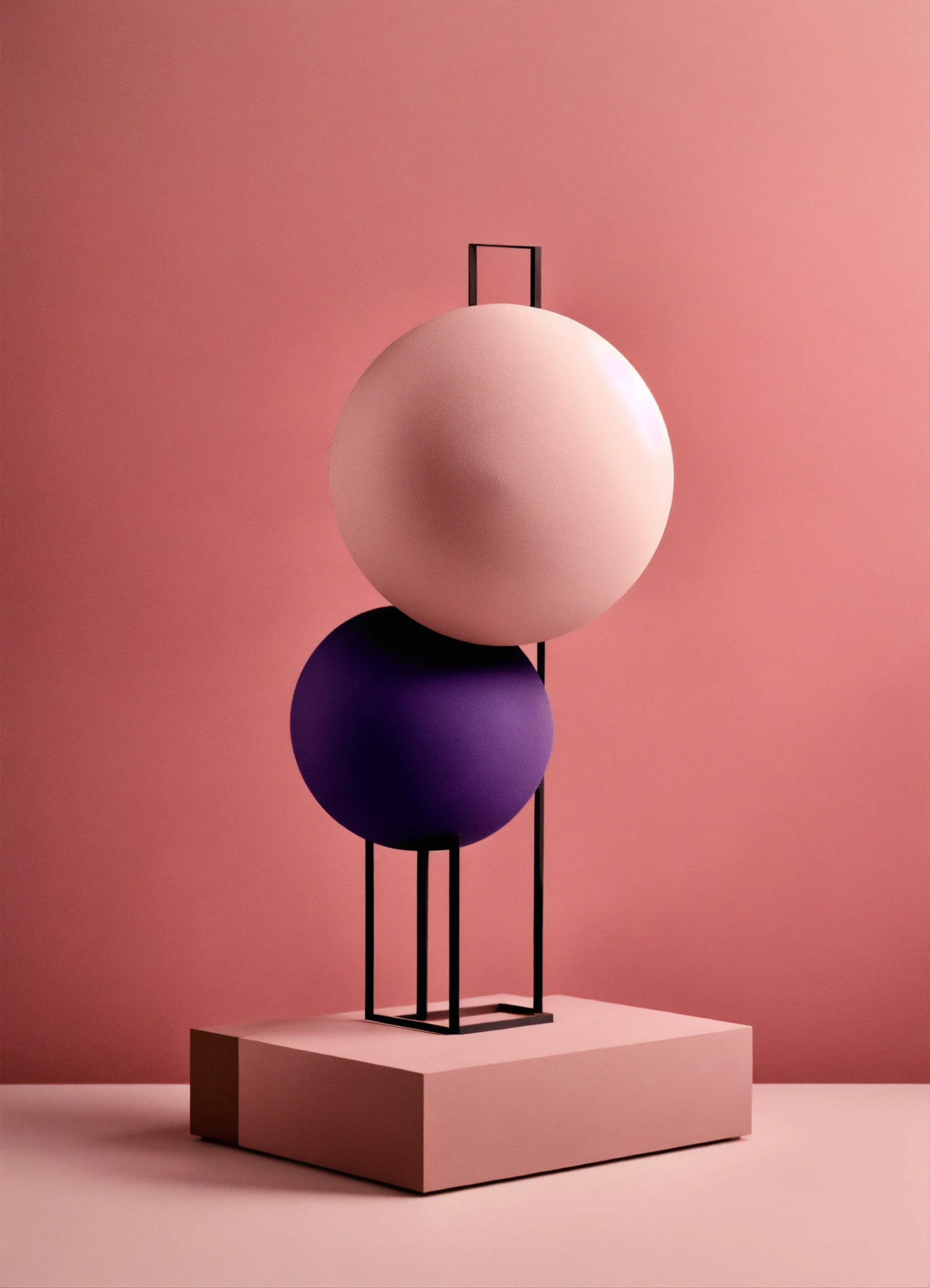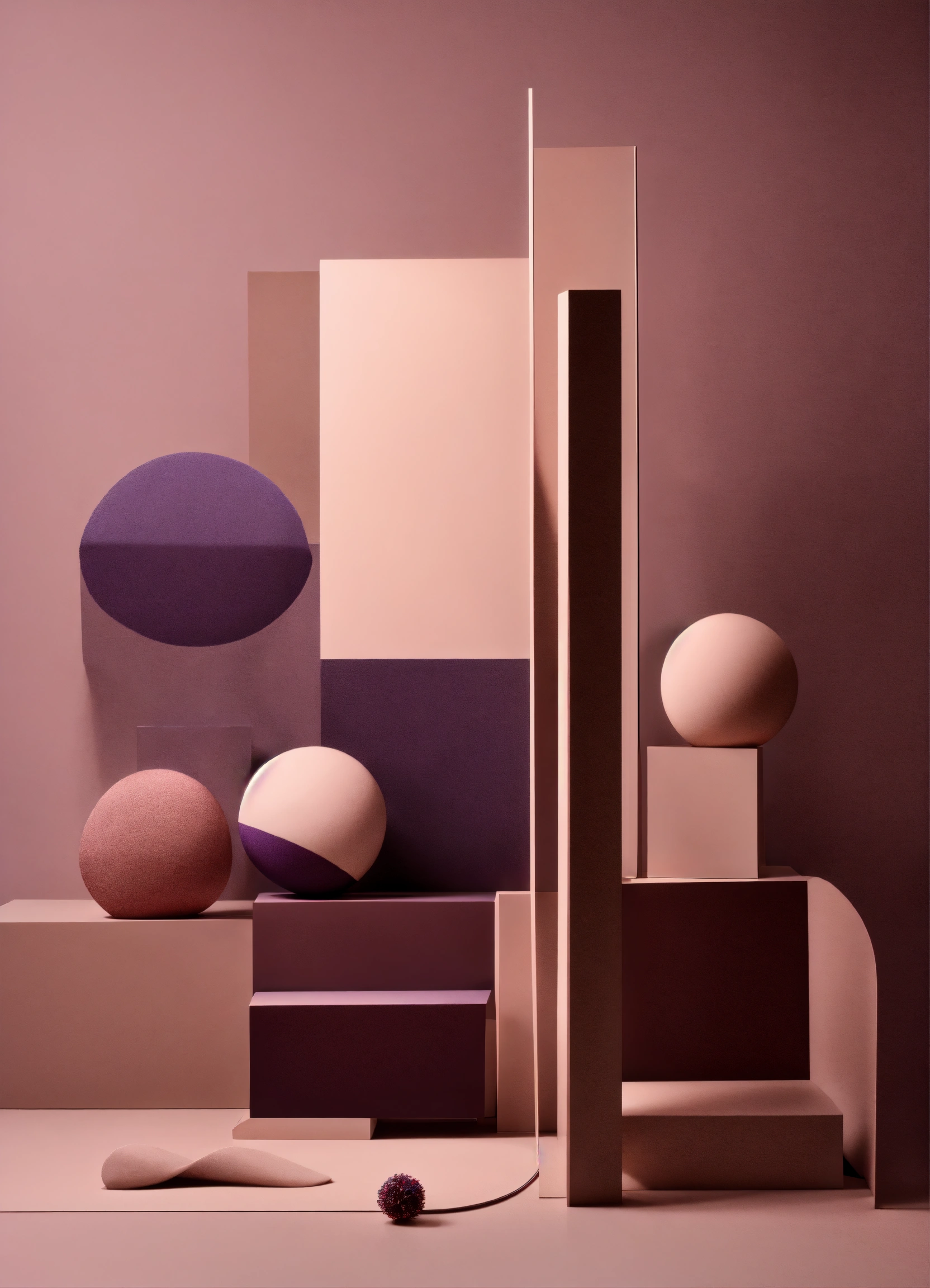 Muted tones of dusty pink and dark purple surreal combination with minimalist compositions, evoking a sense of calmness, mixed media sculpture, simple bare minimalist style 3d compositions, wedding theme.