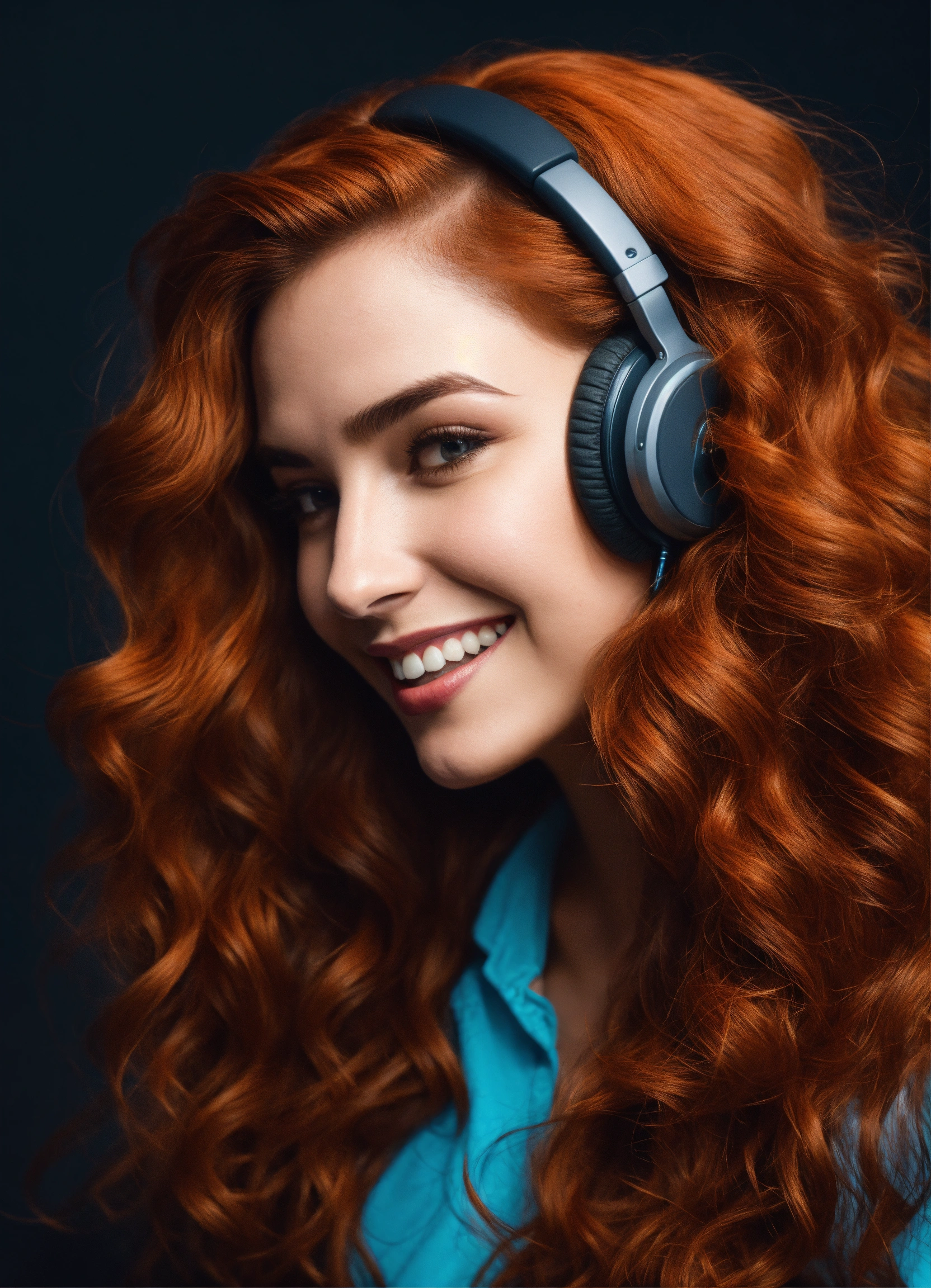 Mulher ruiva telemarketing com cabelo liso feliz apontando para a direita