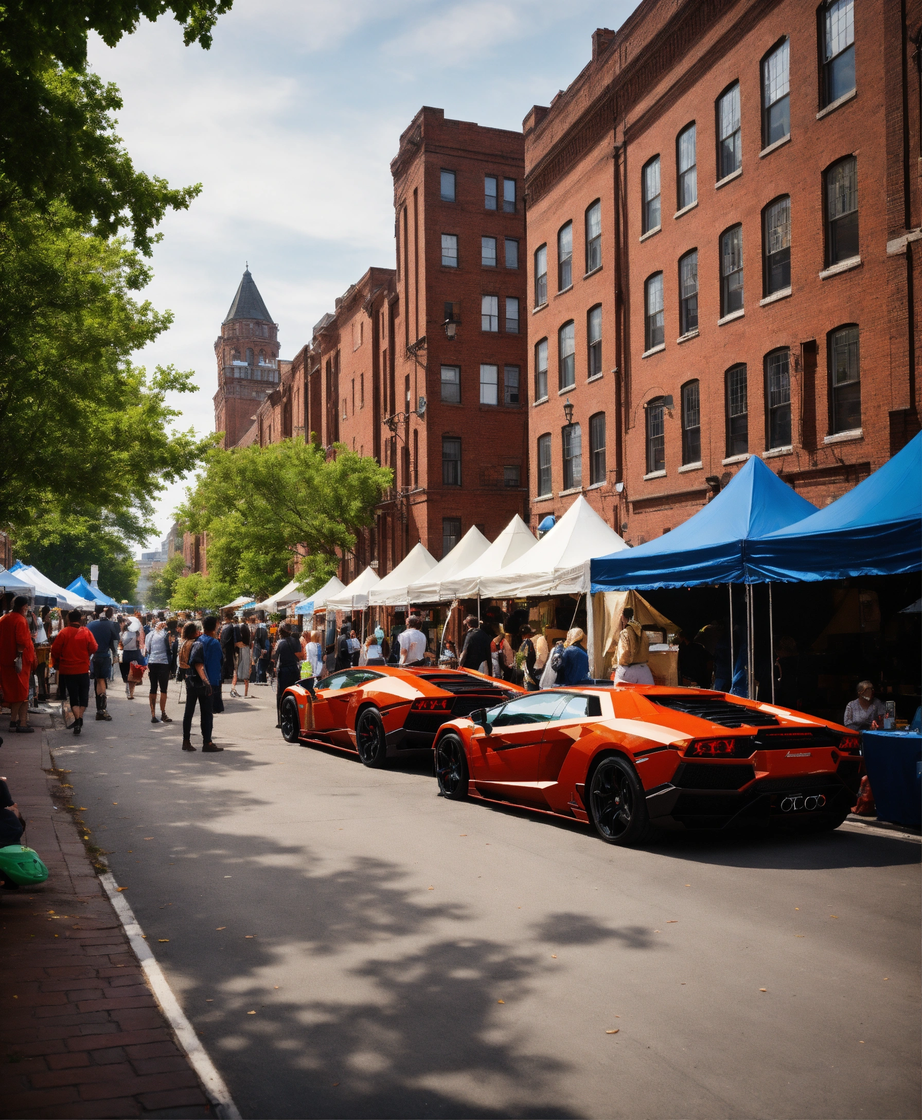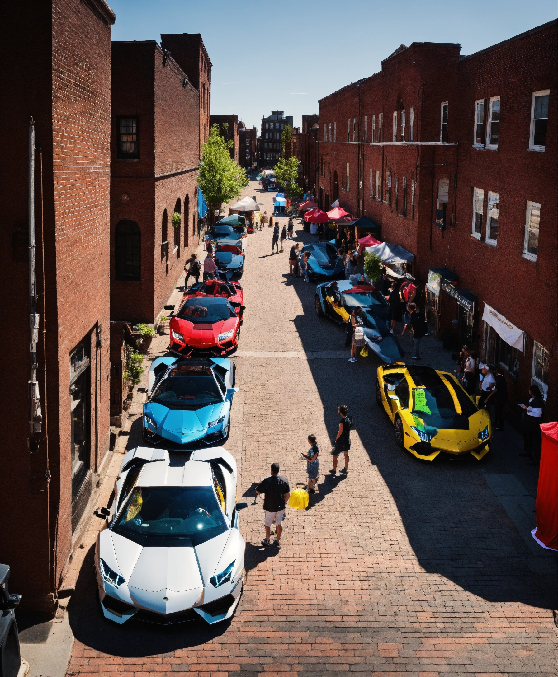People outside at block party with 3 lamborghinis in a row on a short street, red brick buildings on left side, vendor tents