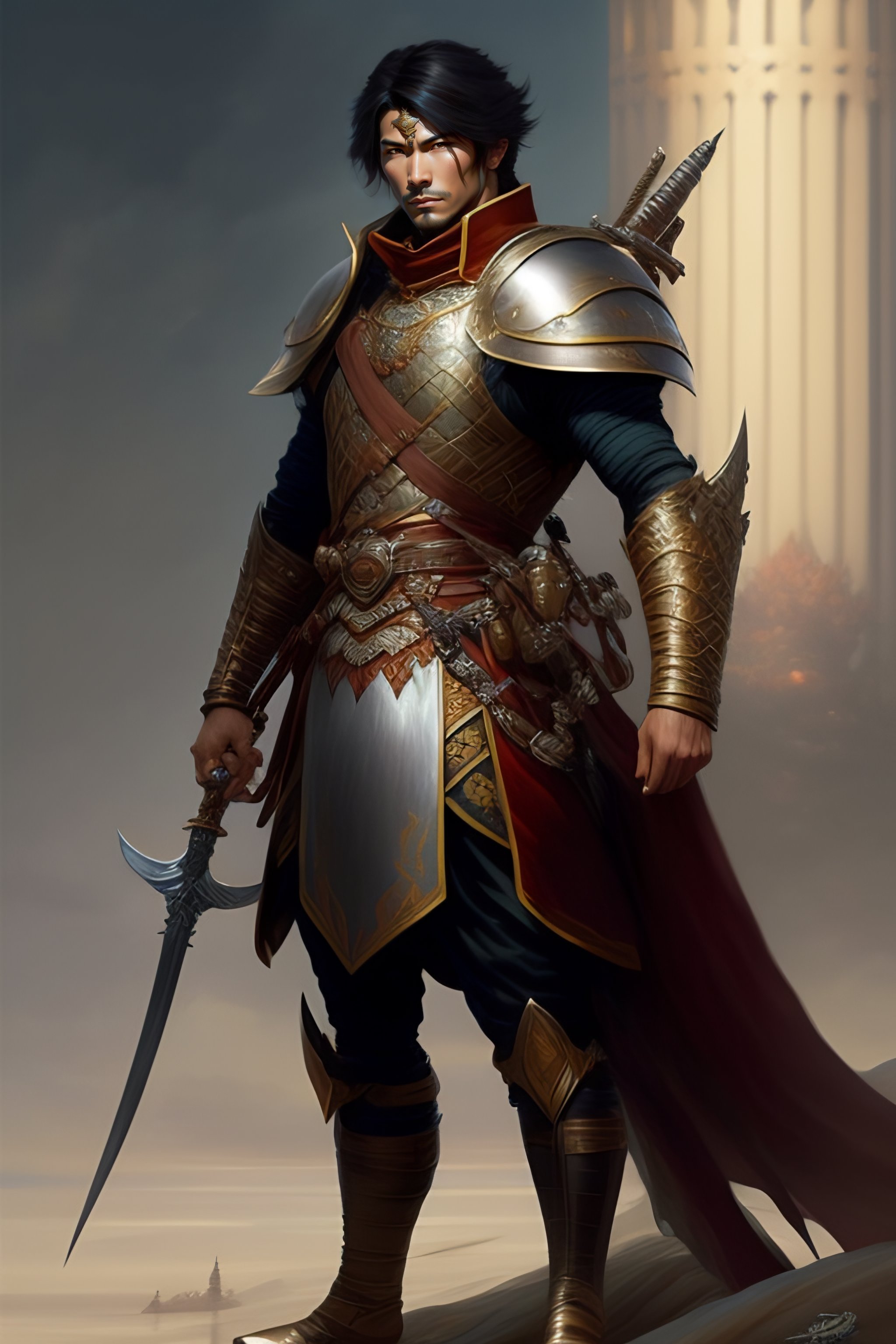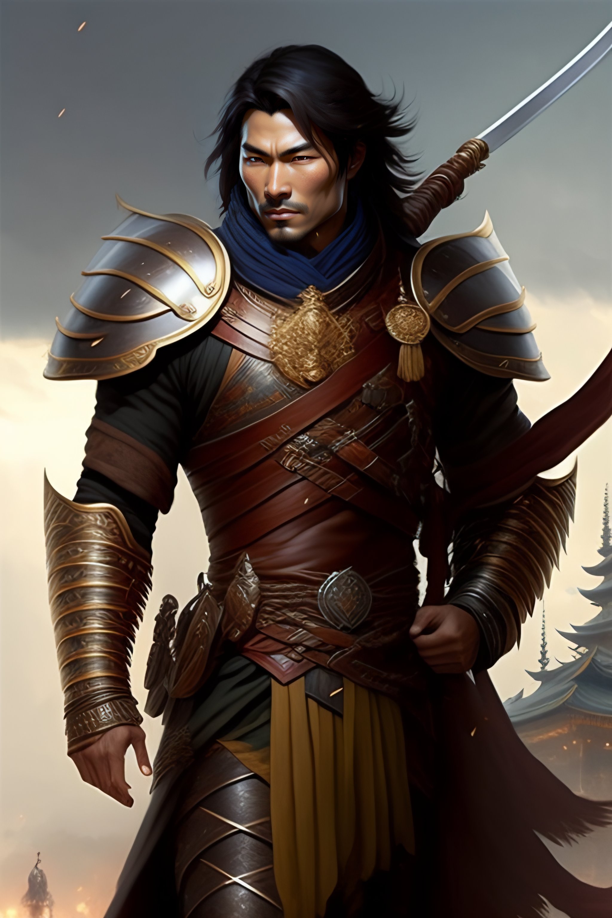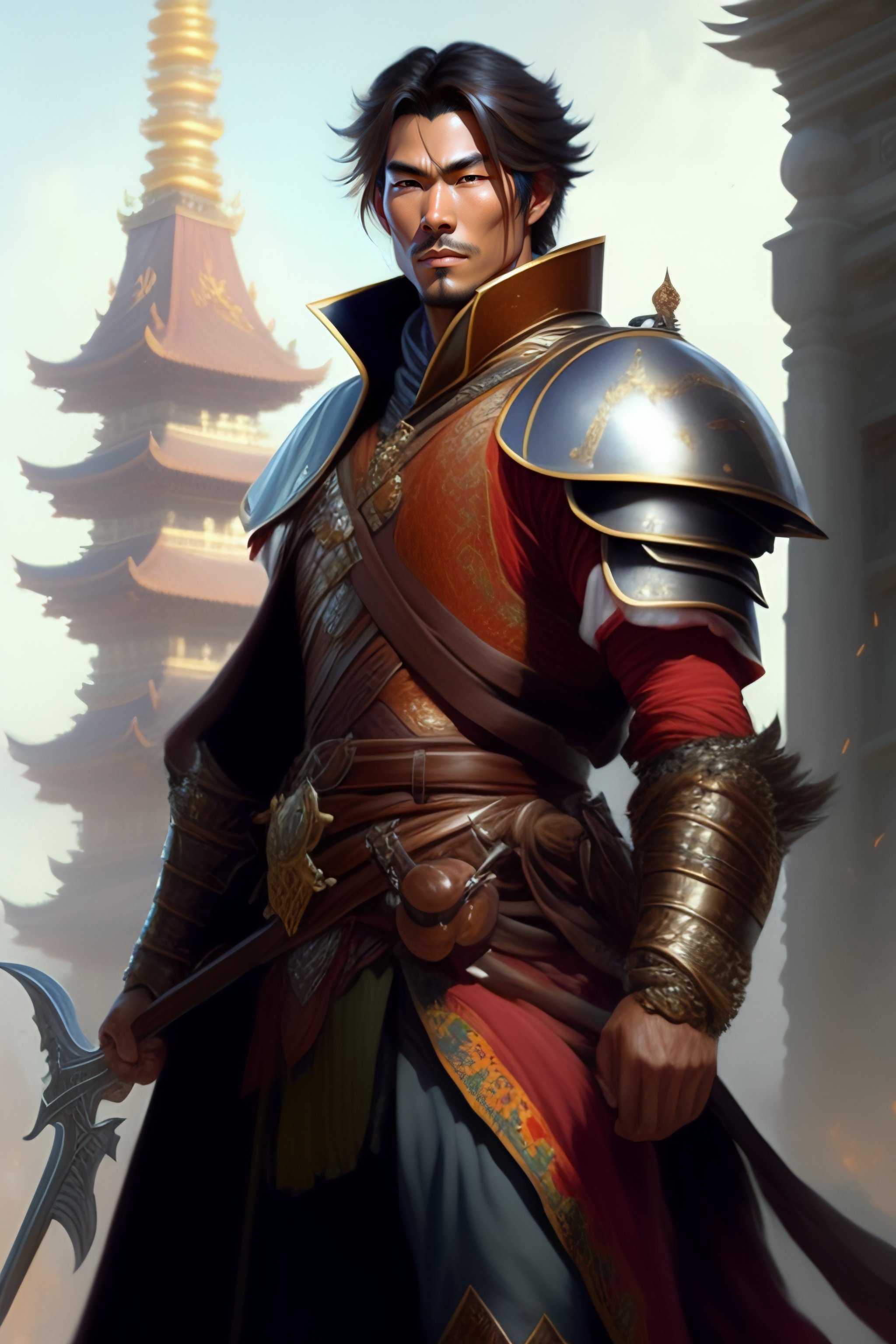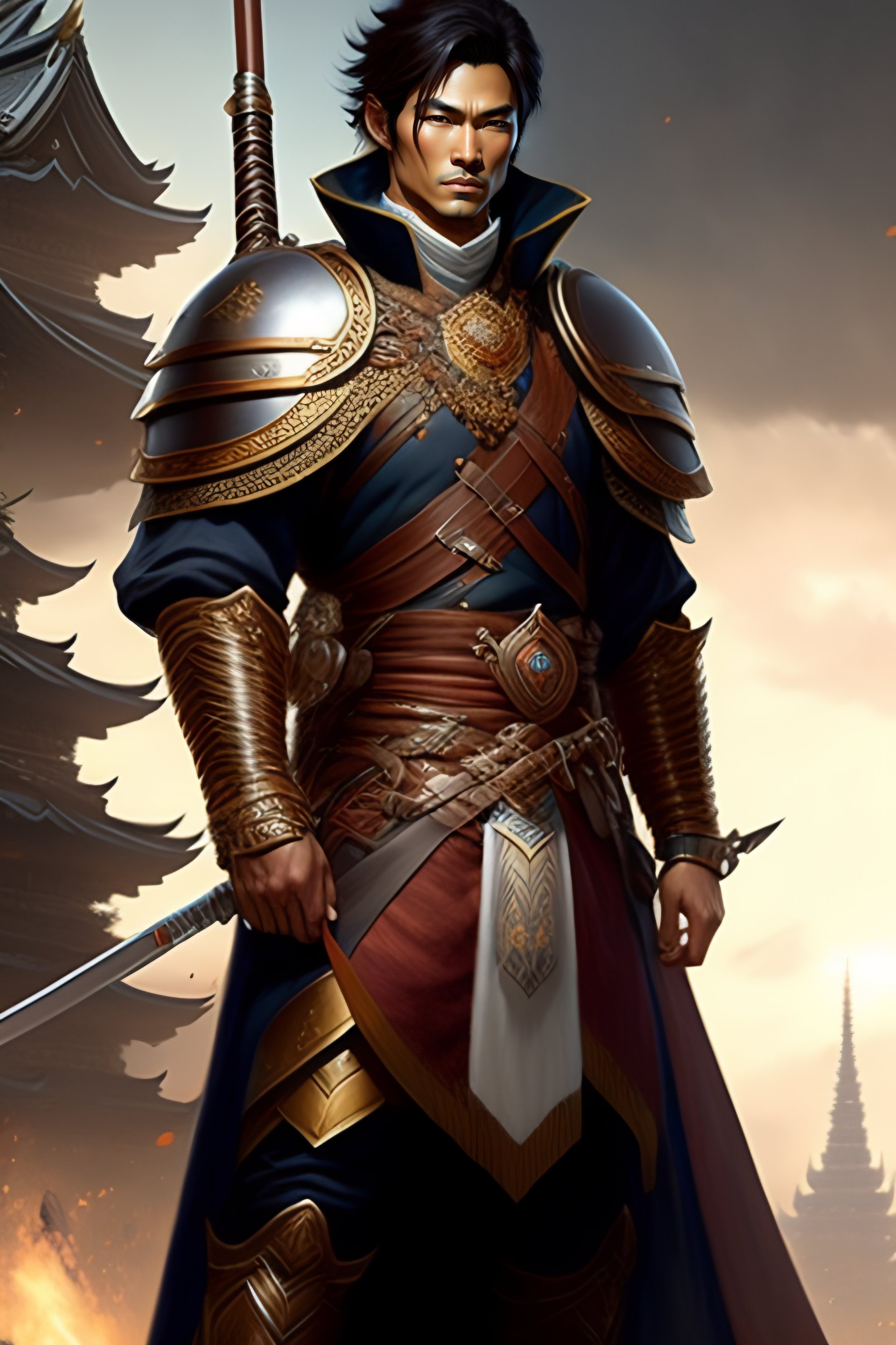Full body picture of a male japan warrior short length brown hair and a very highly detailed face holding a tall tower shield and a long flintlock pistol, highly detailed, ultra realistic, artstation, cgsociety, character concept art, sharp focus, illustration, art by michael komarck and greg rutkowski and alphonse mucha