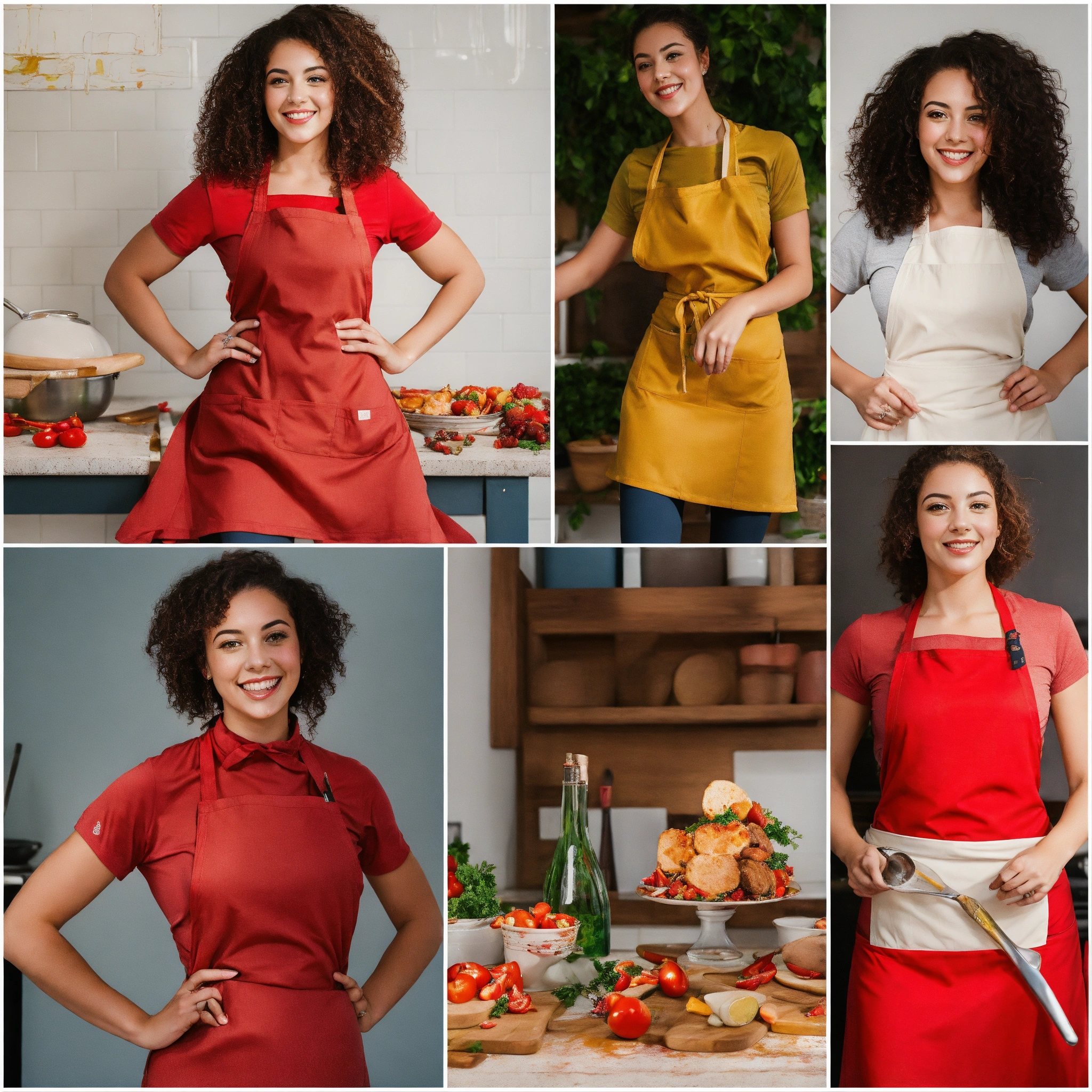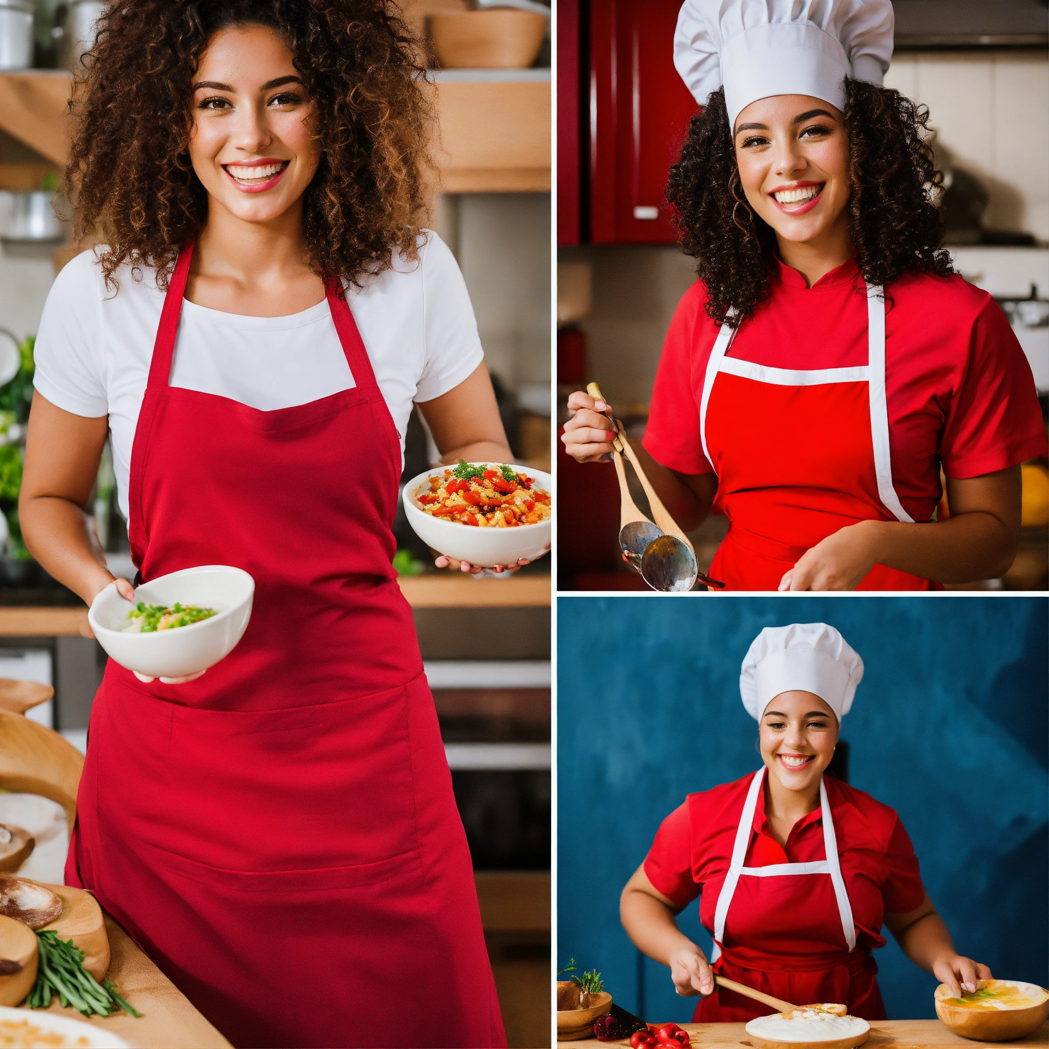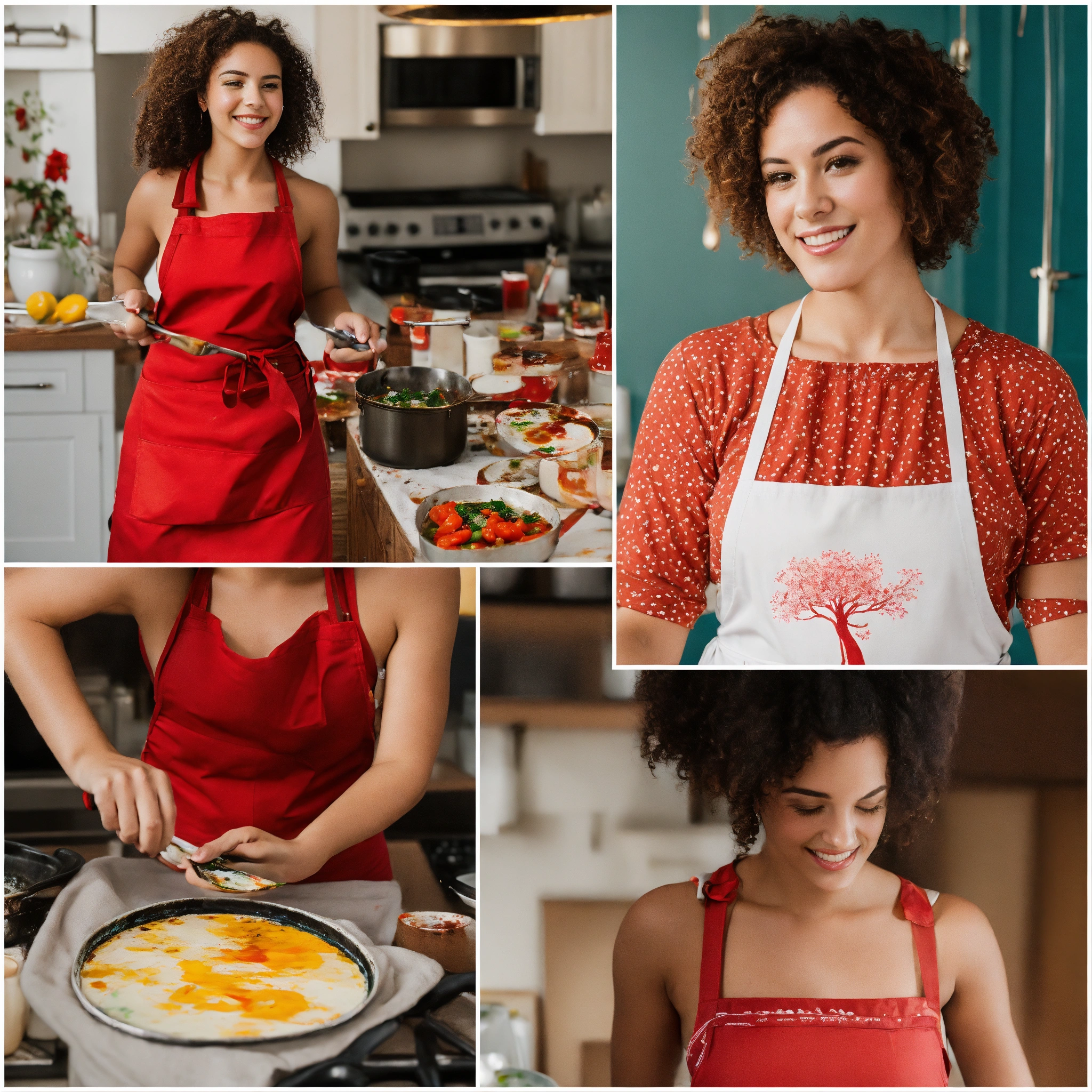 Photo grid of a young woman with curly hair, top-left captures her painting in an apron, top-right shows her dancing in a red dress, bottom-left illustrates her cooking in a chef's hat, bottom-right presents her cycling in sportswear