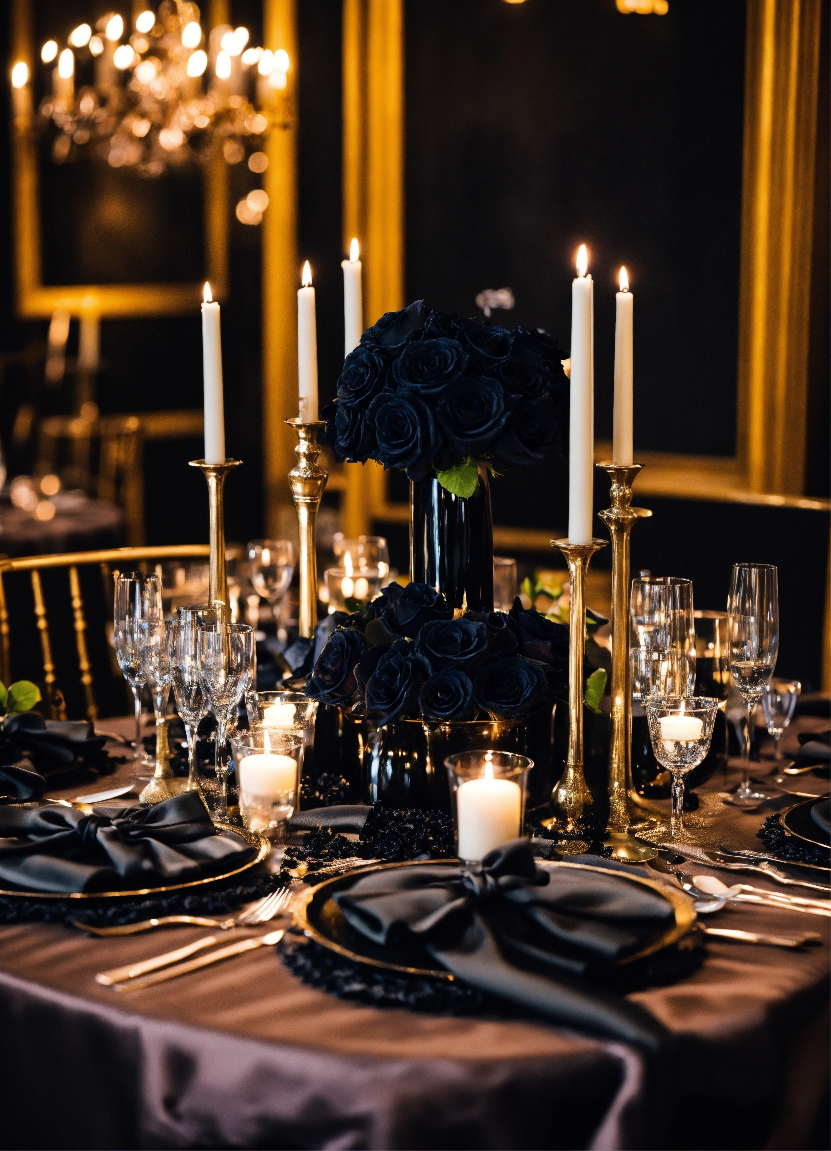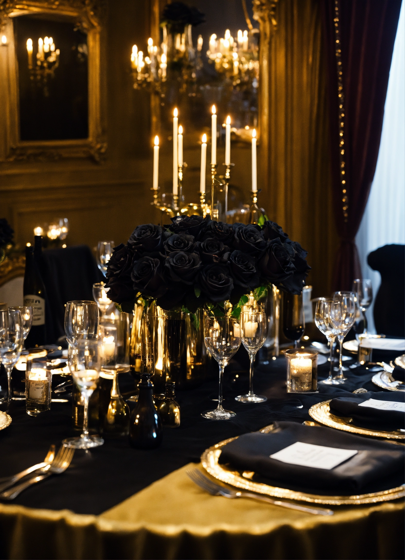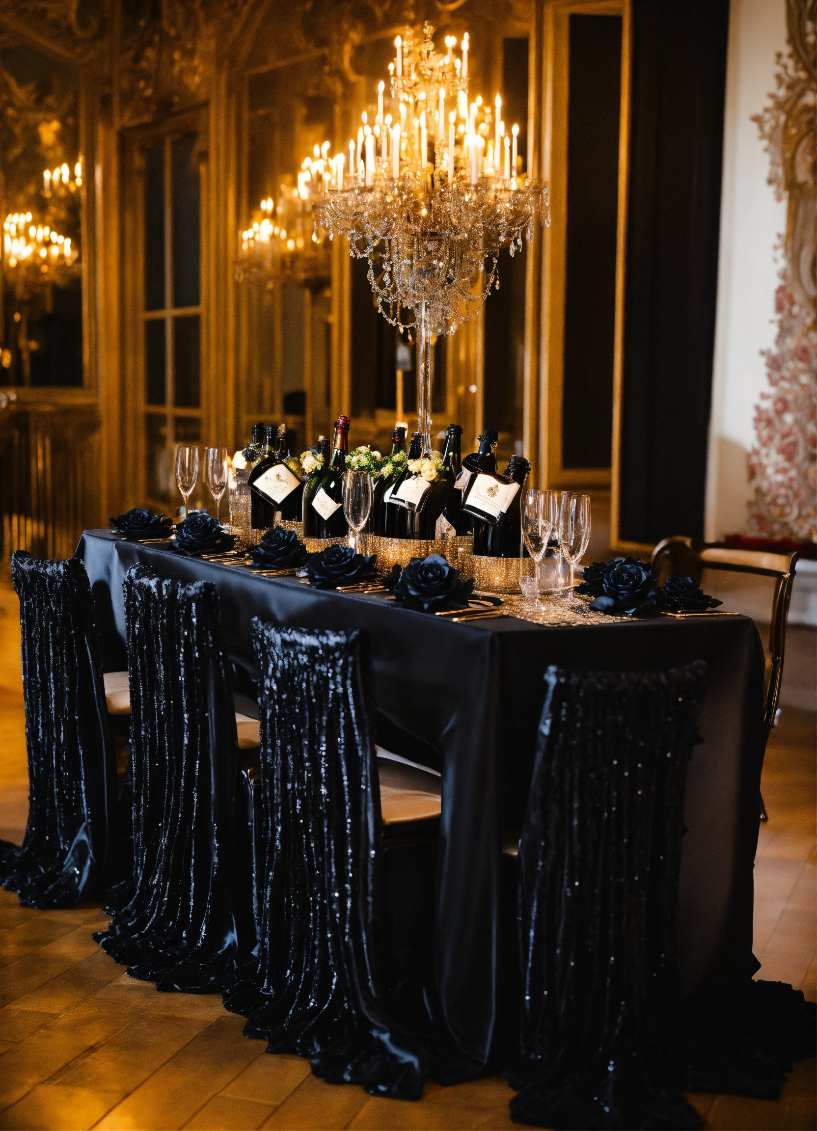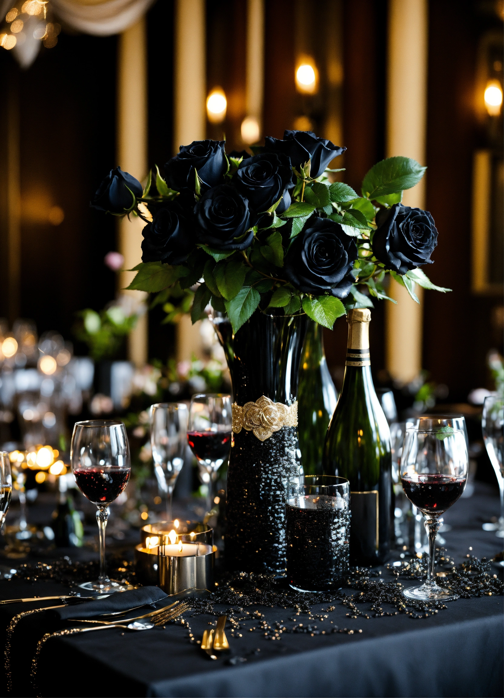 A fancy table with black roses black champagne bottles black centerpiece fancy