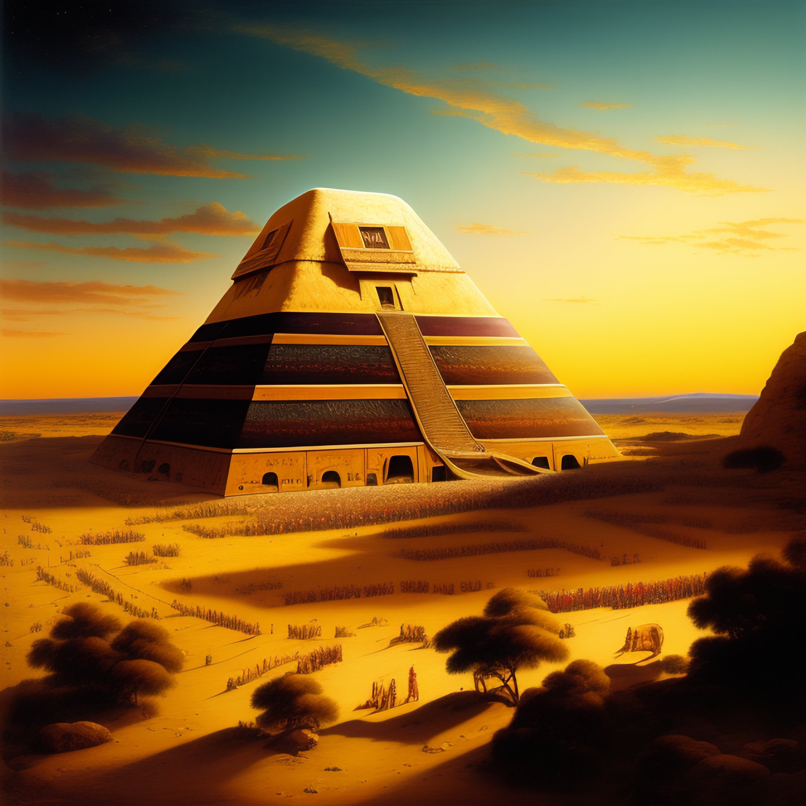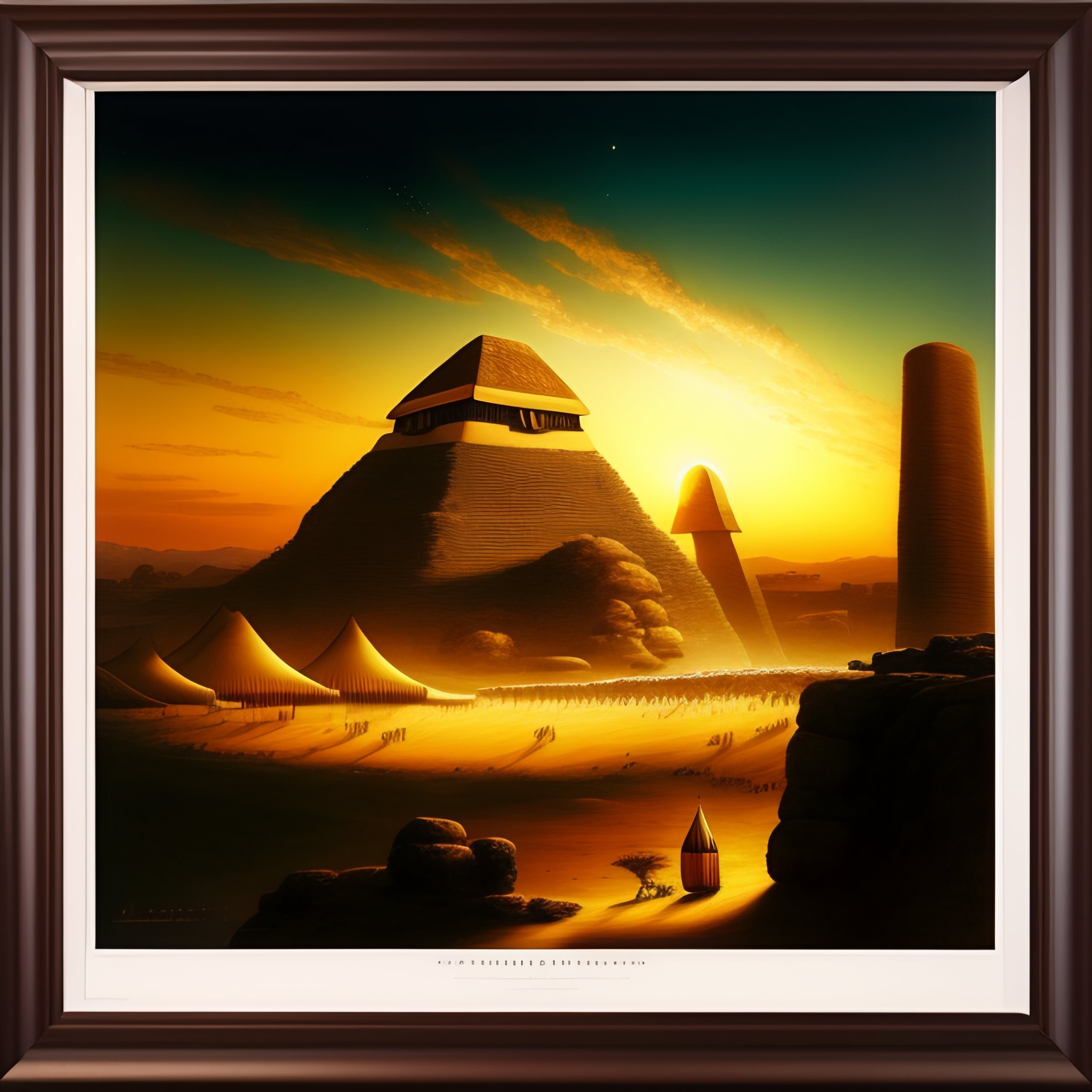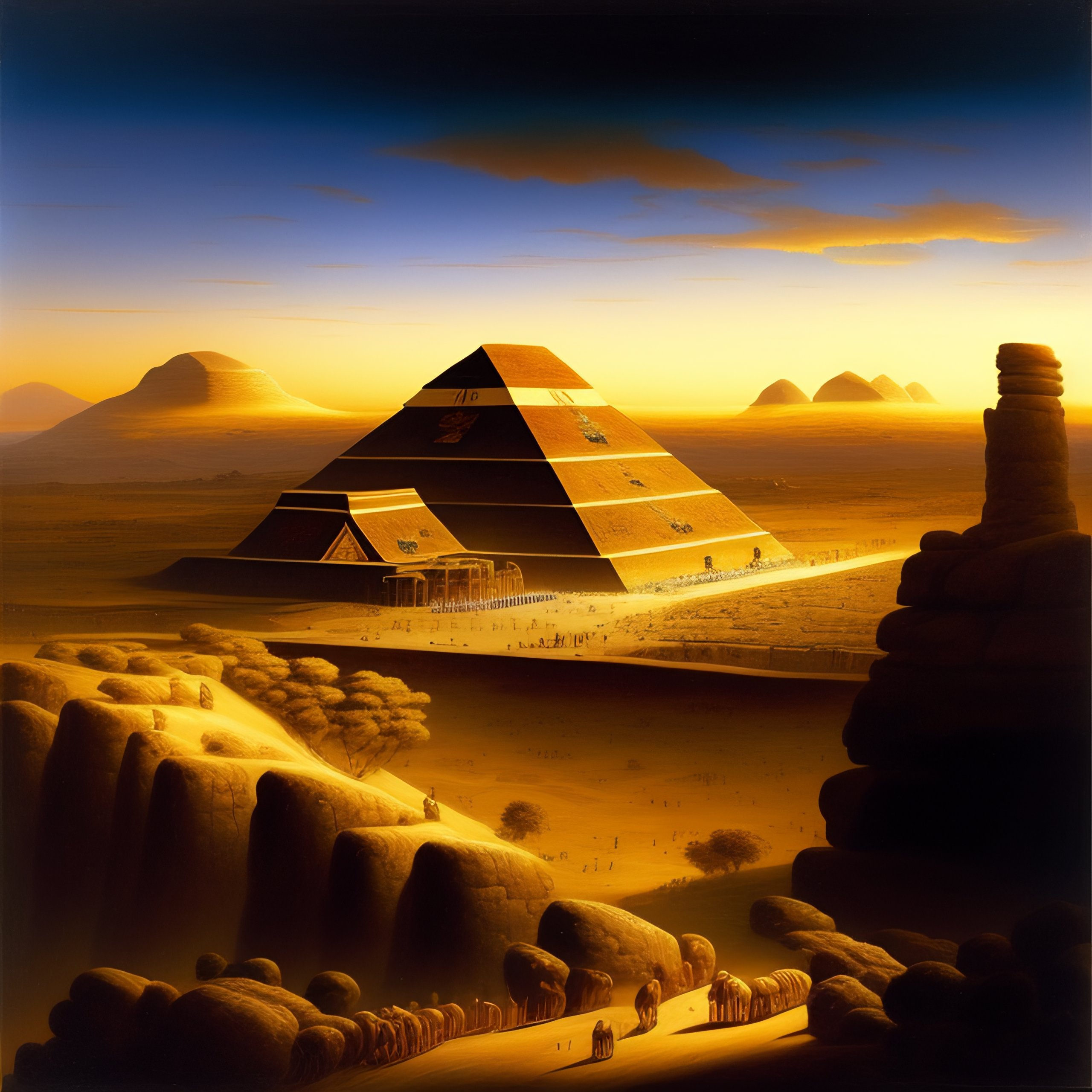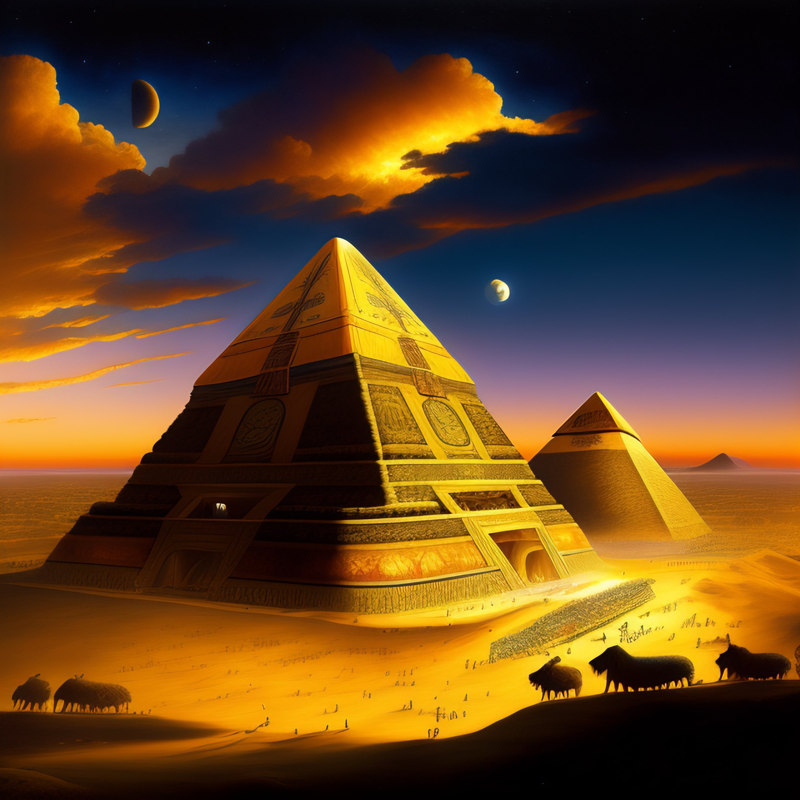 Tilt-shift photo of khufu, khafre, and menkaure pyramids of giza, in the sky, landscape by jacques-laurent agasse, night.