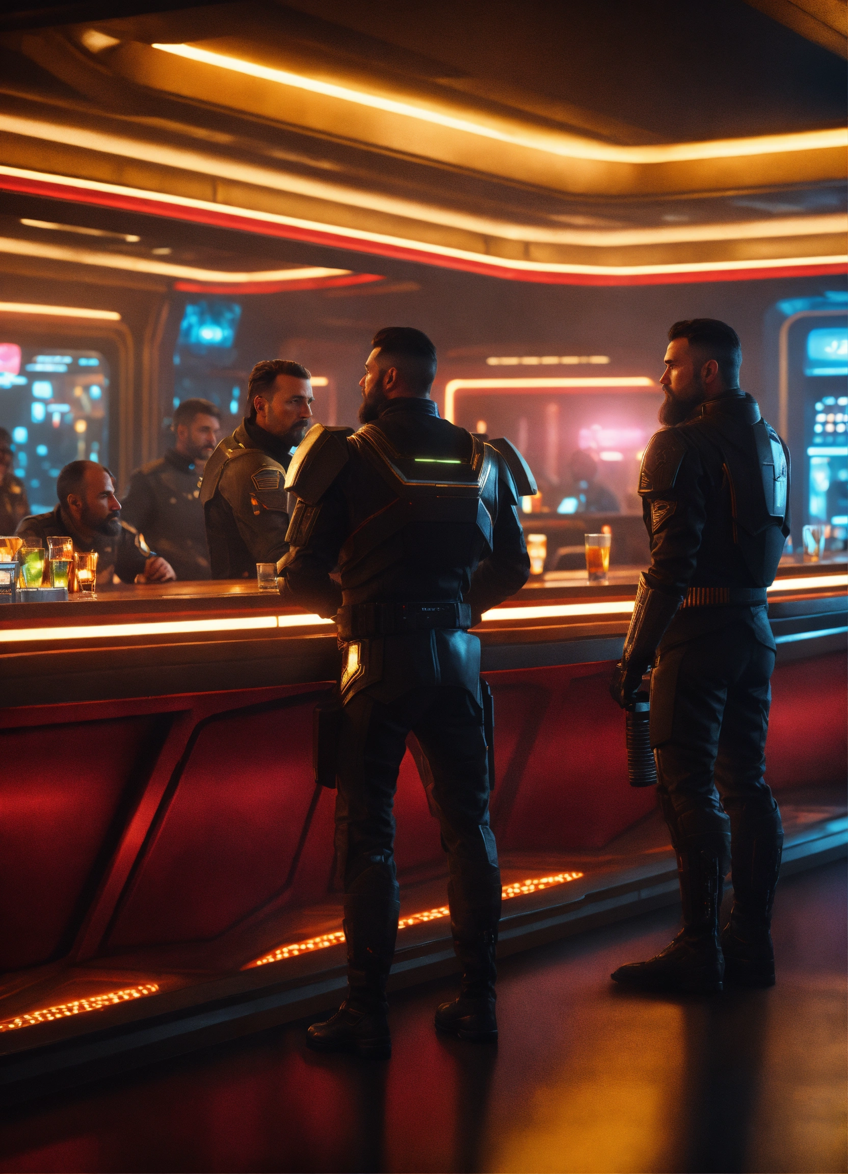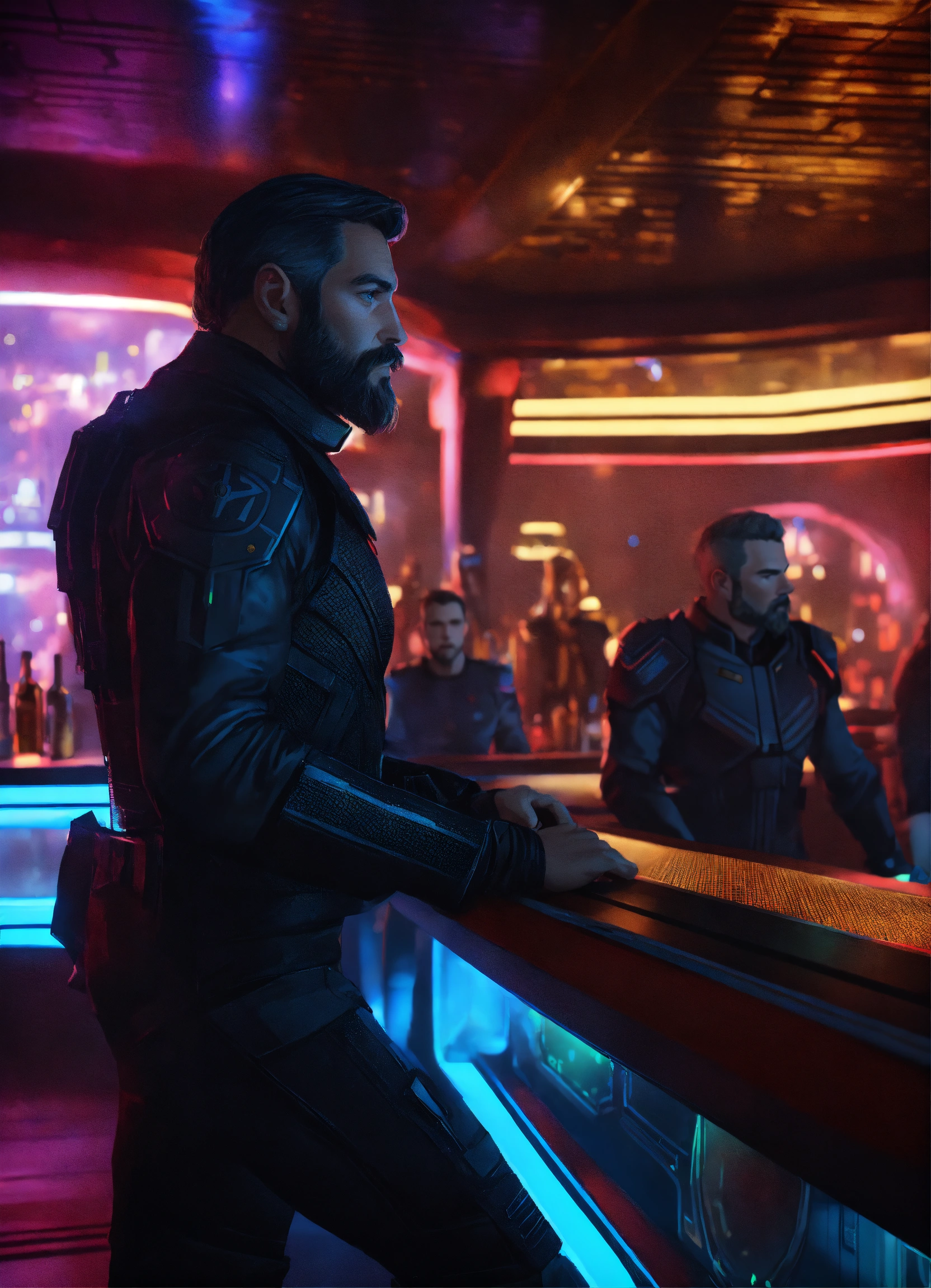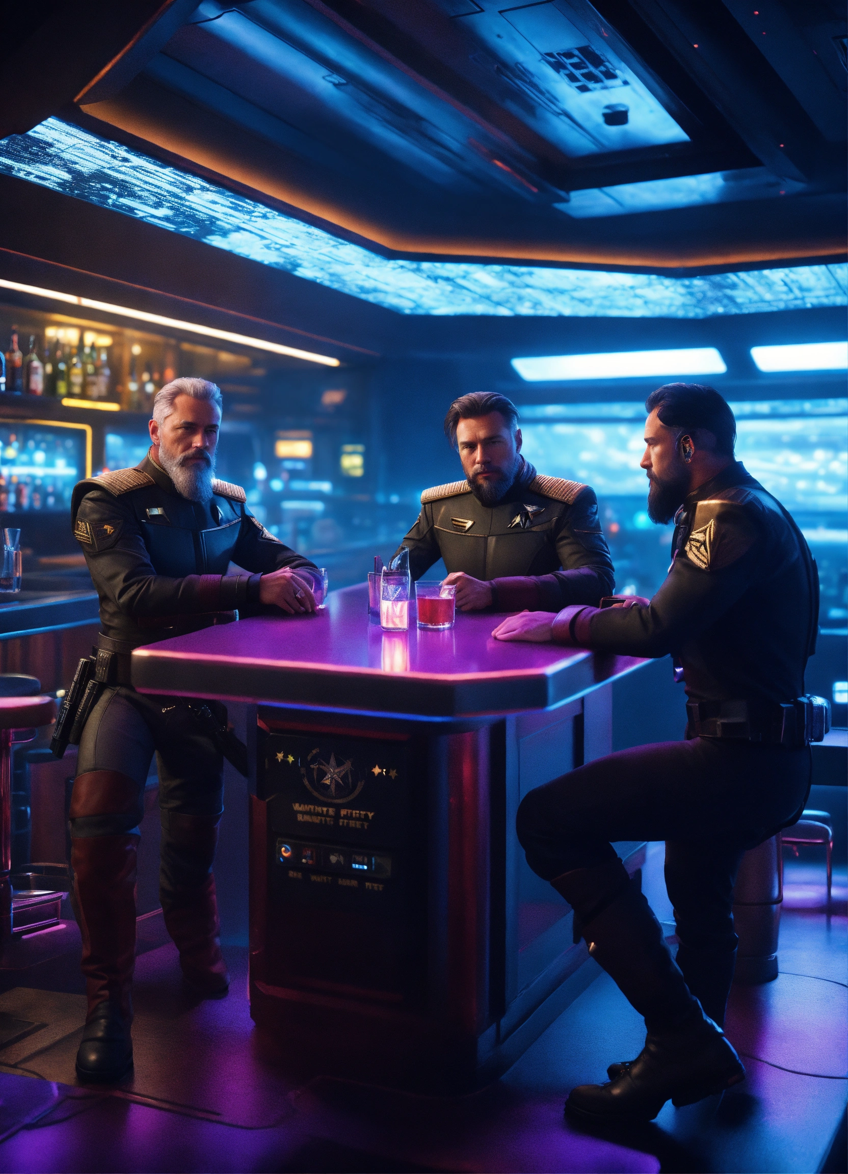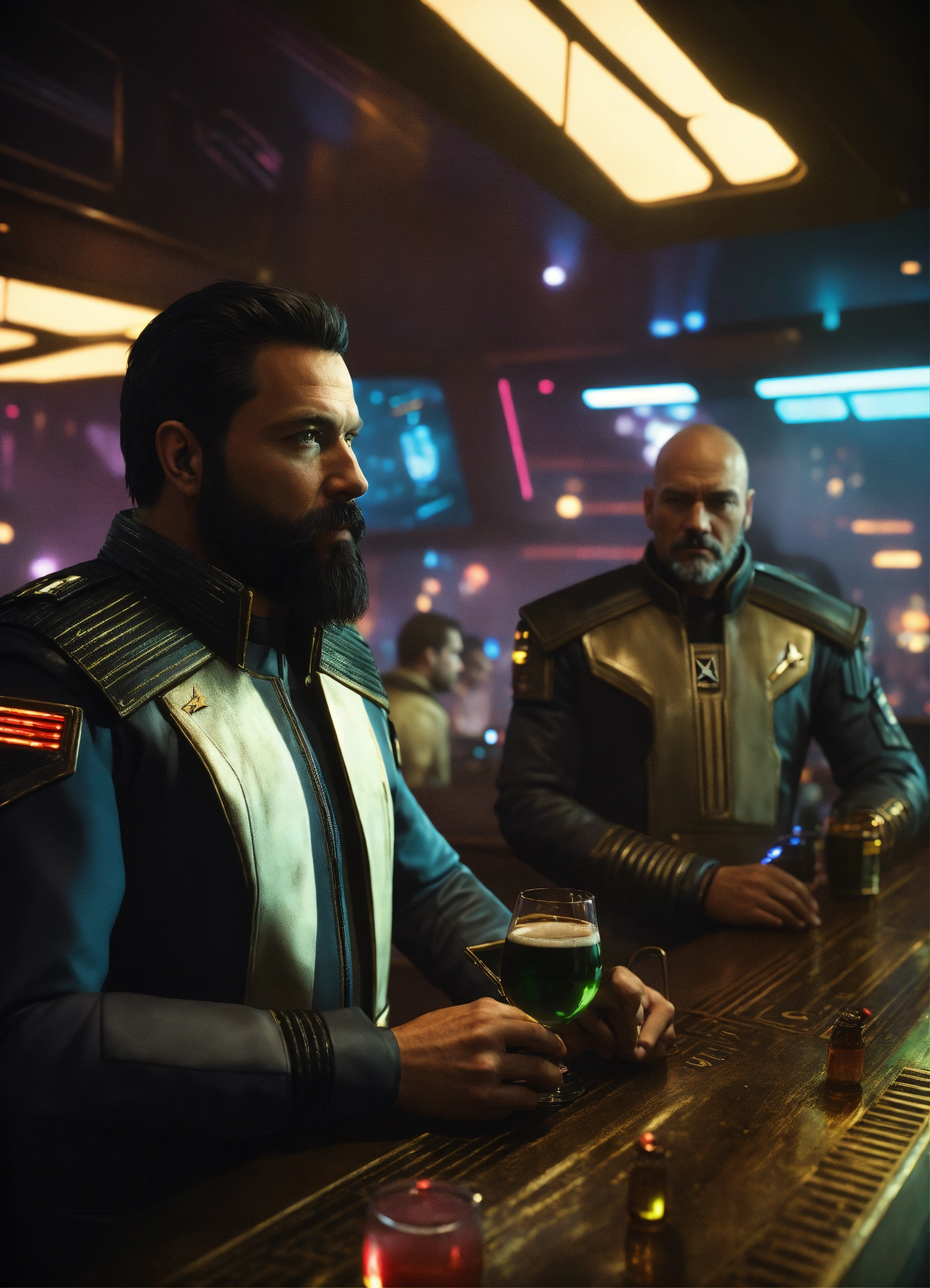 White male starfleet officer with black hair and 50 year old masculine star commander general with trim beard are at the bar in a dark seedy nightclub on a futuristic space port with rough neck looking people at bar, bounty hunters, mutants, aliens, realistic, 8k, unreal engine