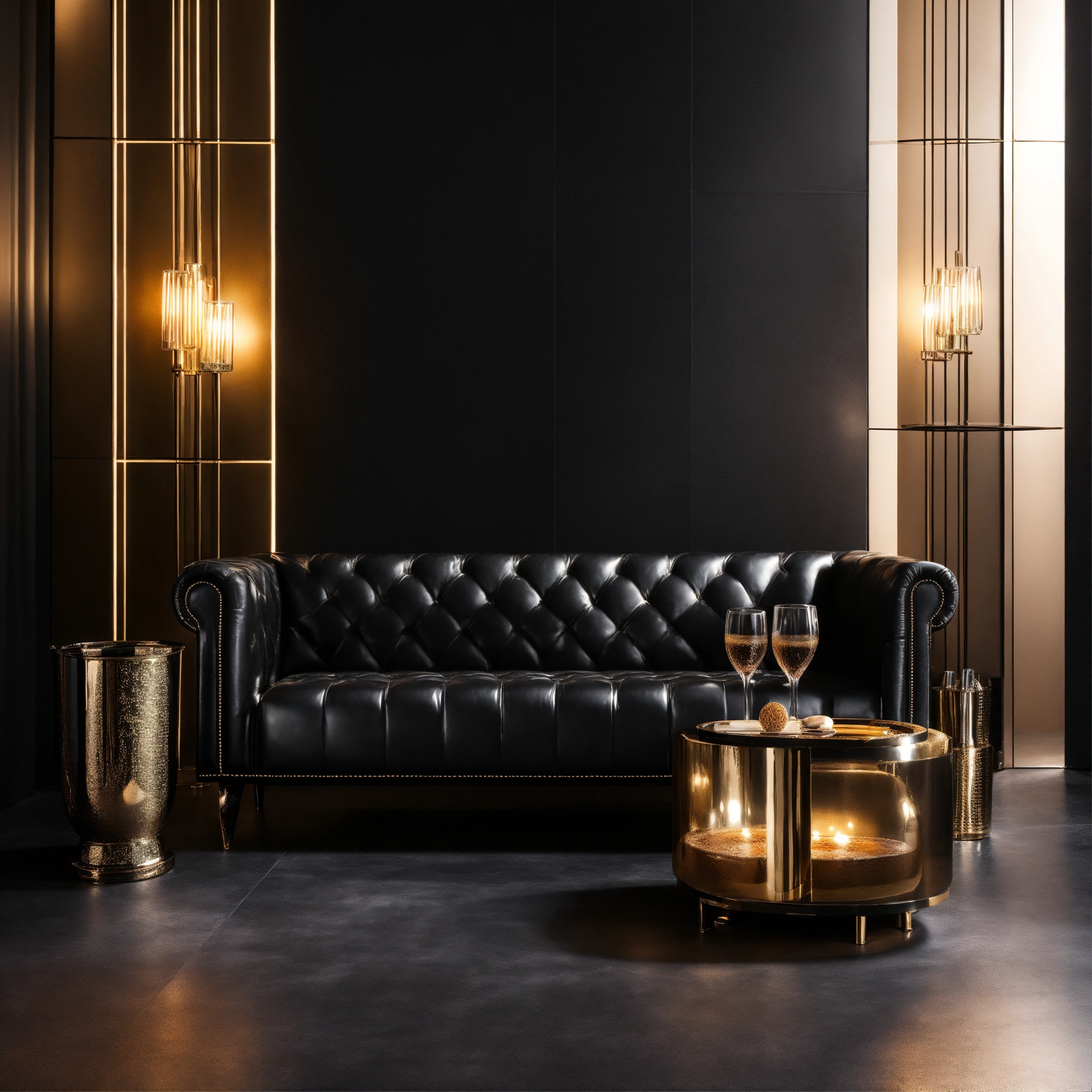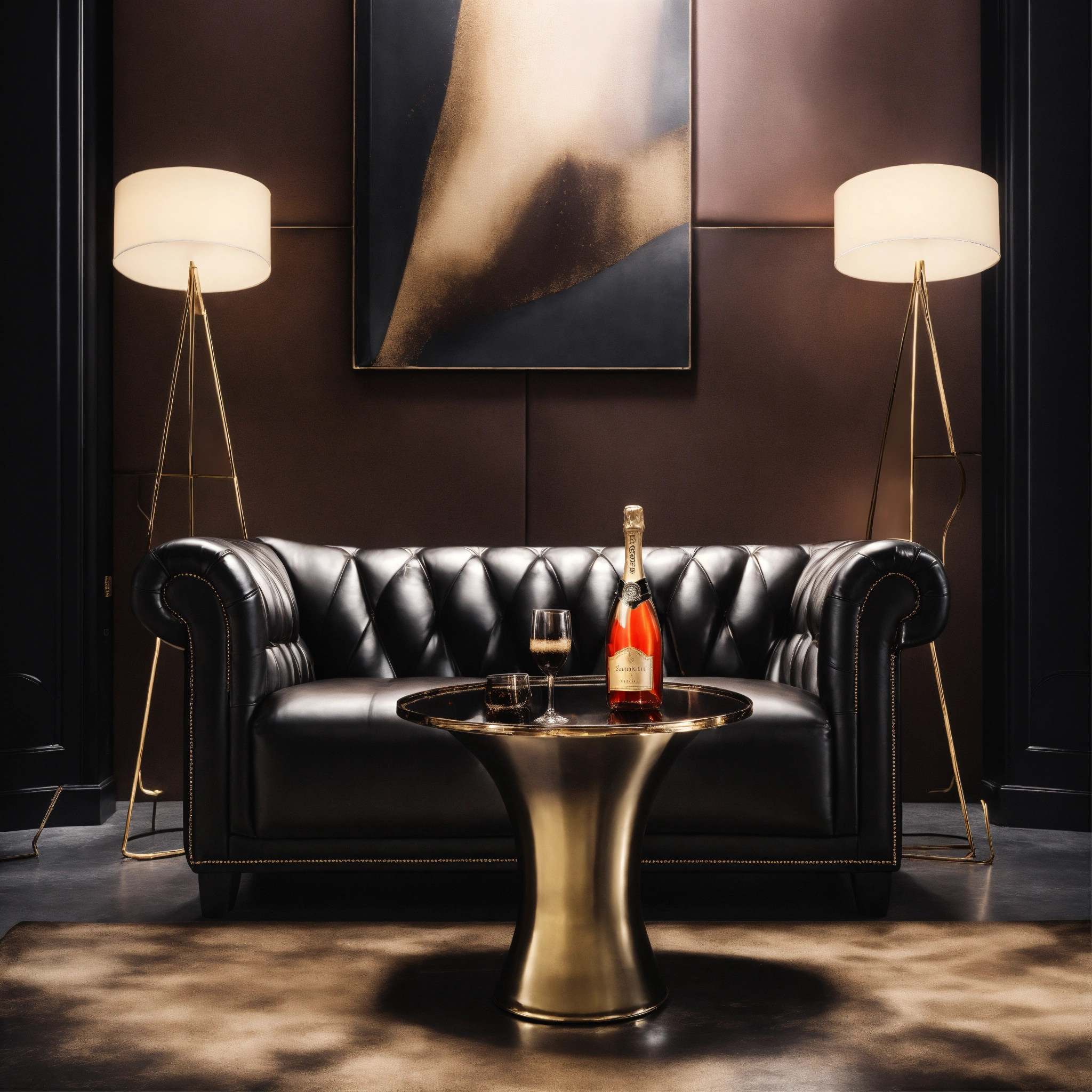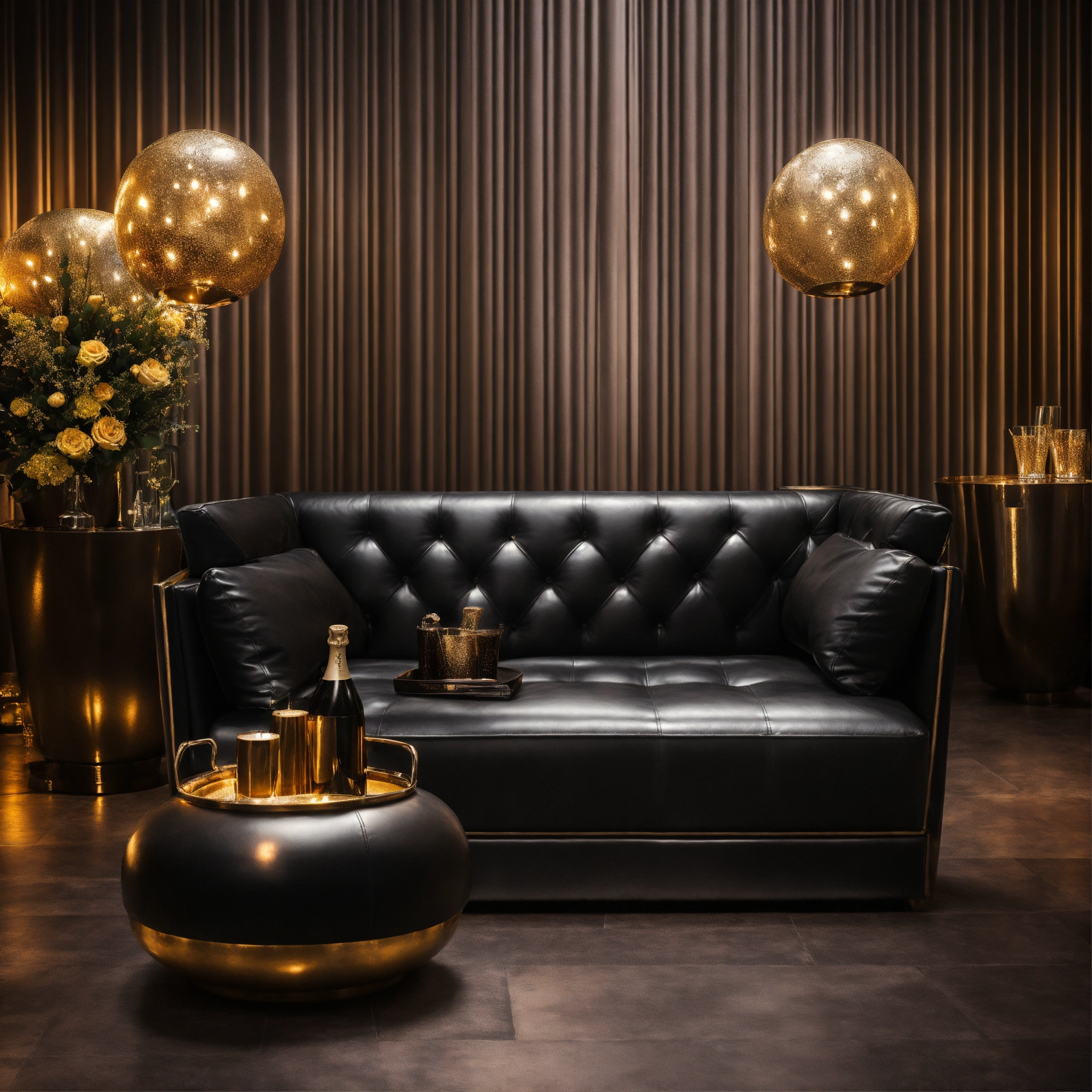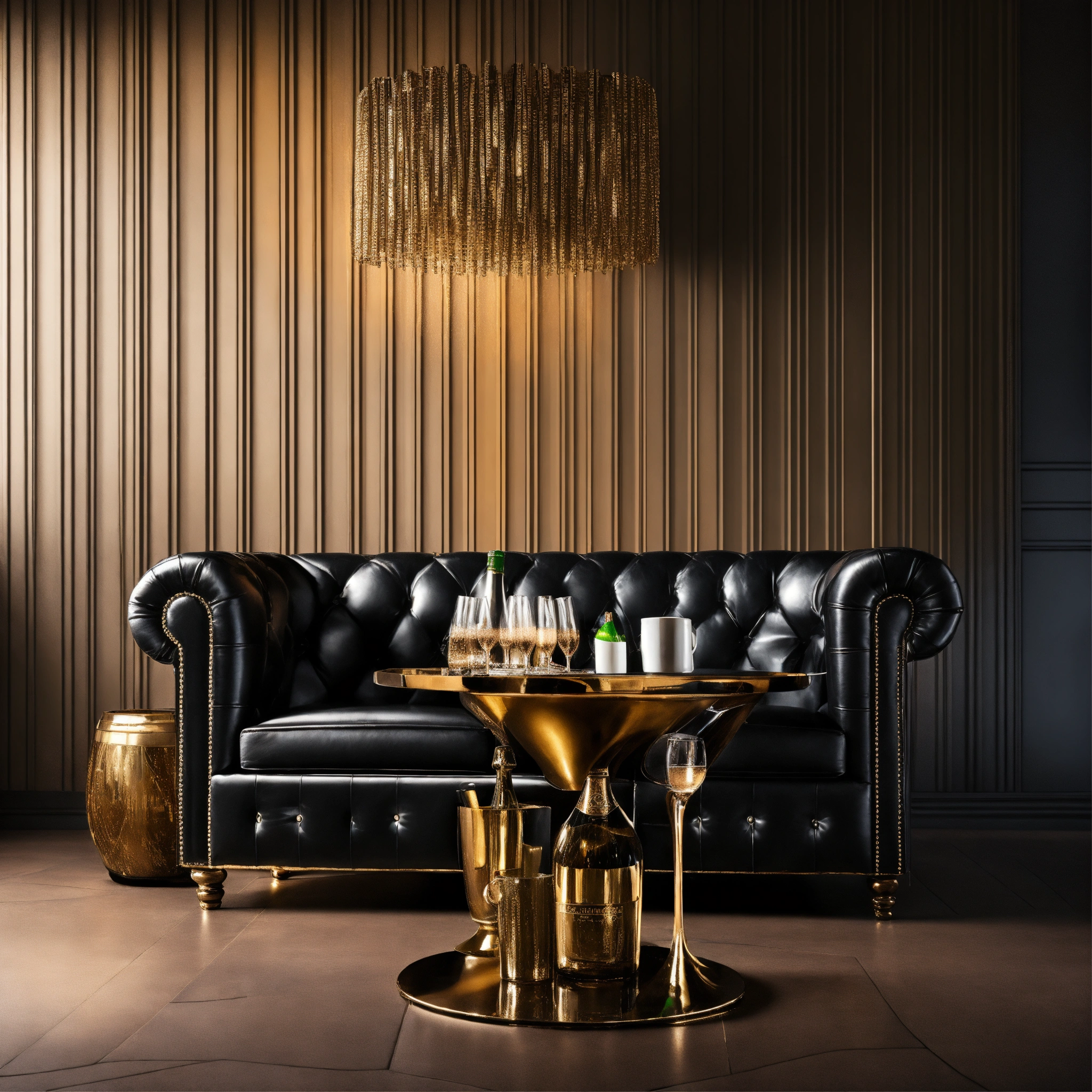 Black vip area black leather sofa coffee table with champagne bucket and bottle dark elegant background