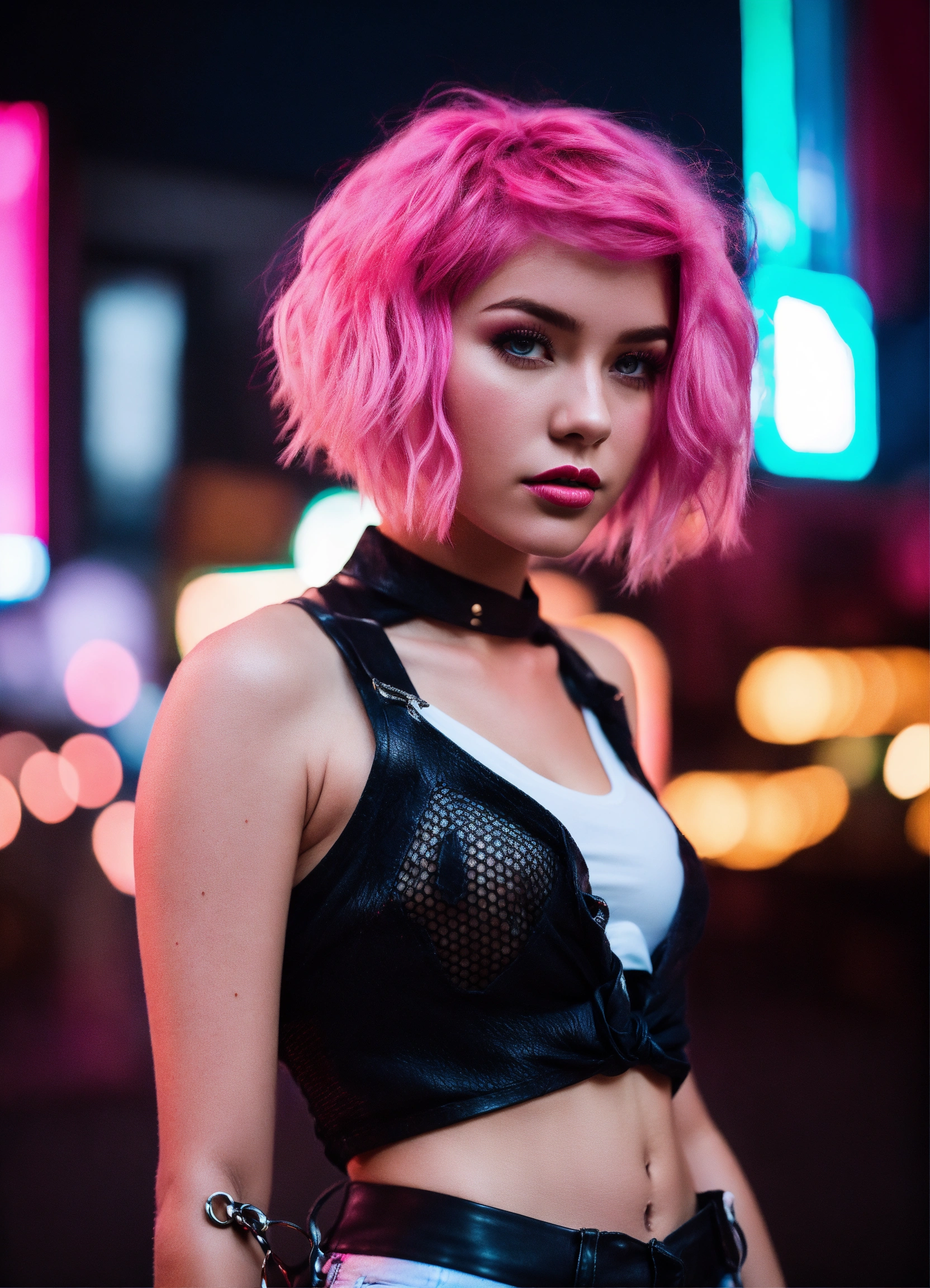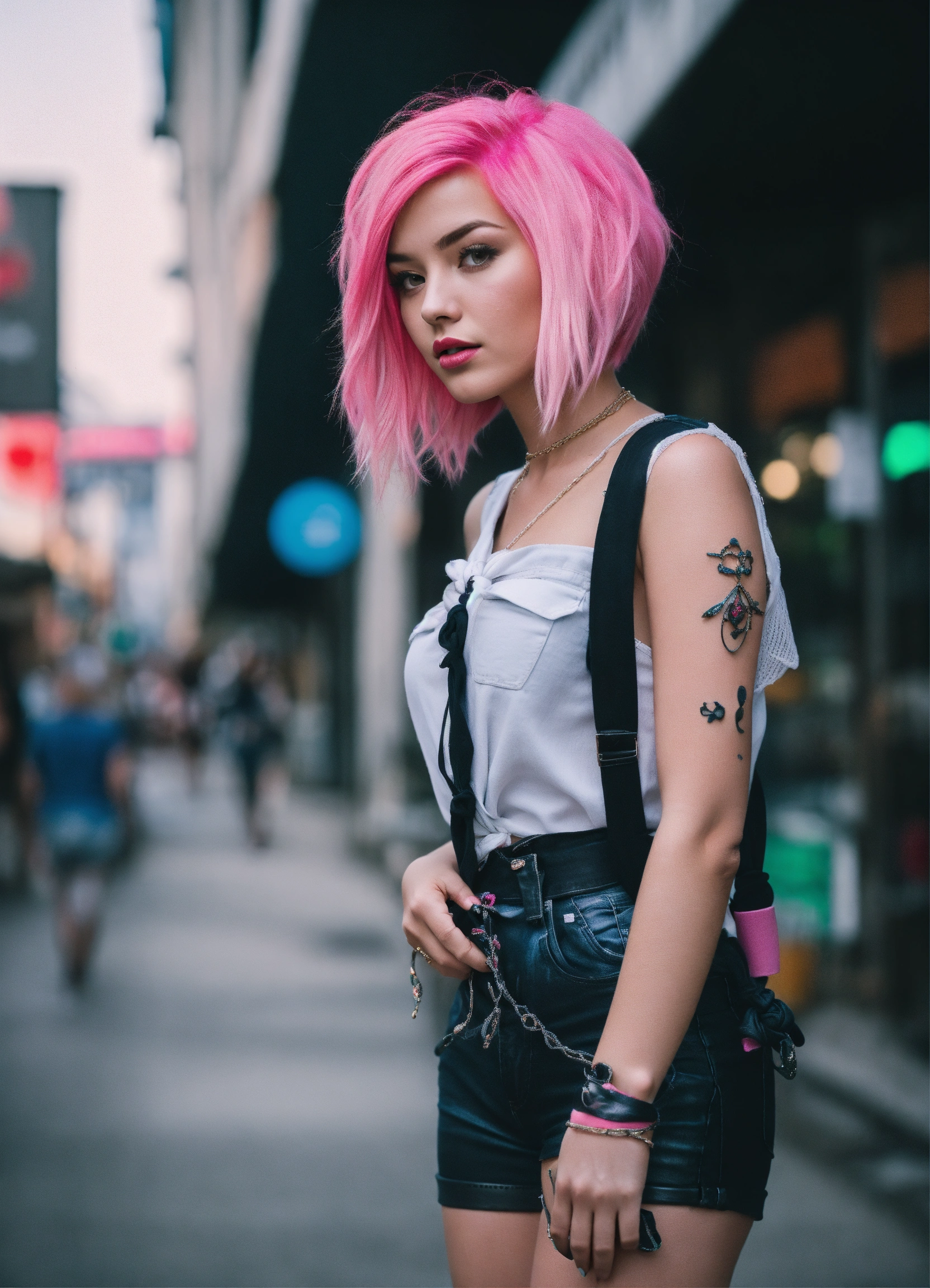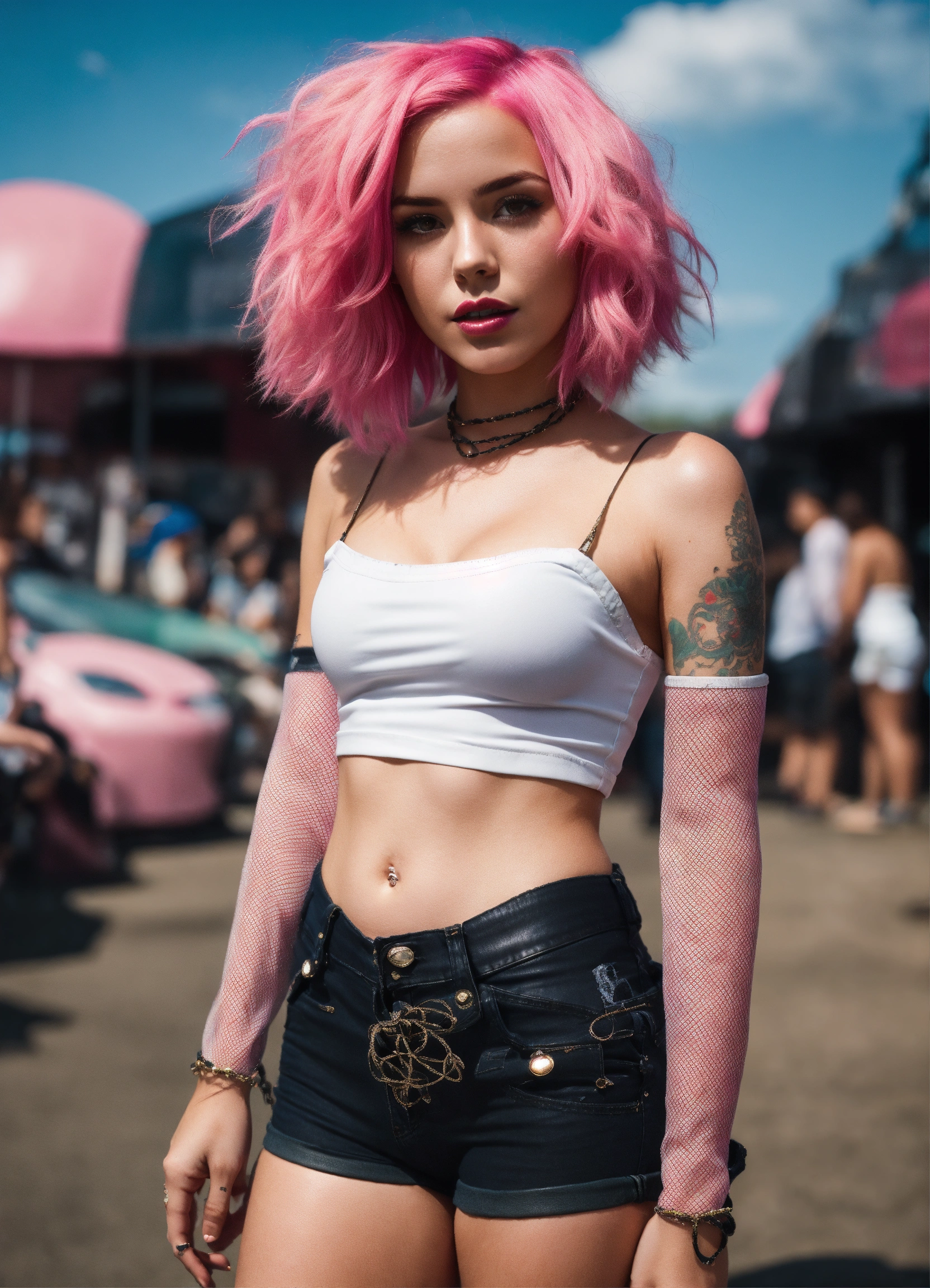 A real photo of a hot 25 year old spacegirl with bright pink hair. she is wearing a white knotted fishnet blouse, tight short black denim hotpants and a leather had. she stands in a future alien town
