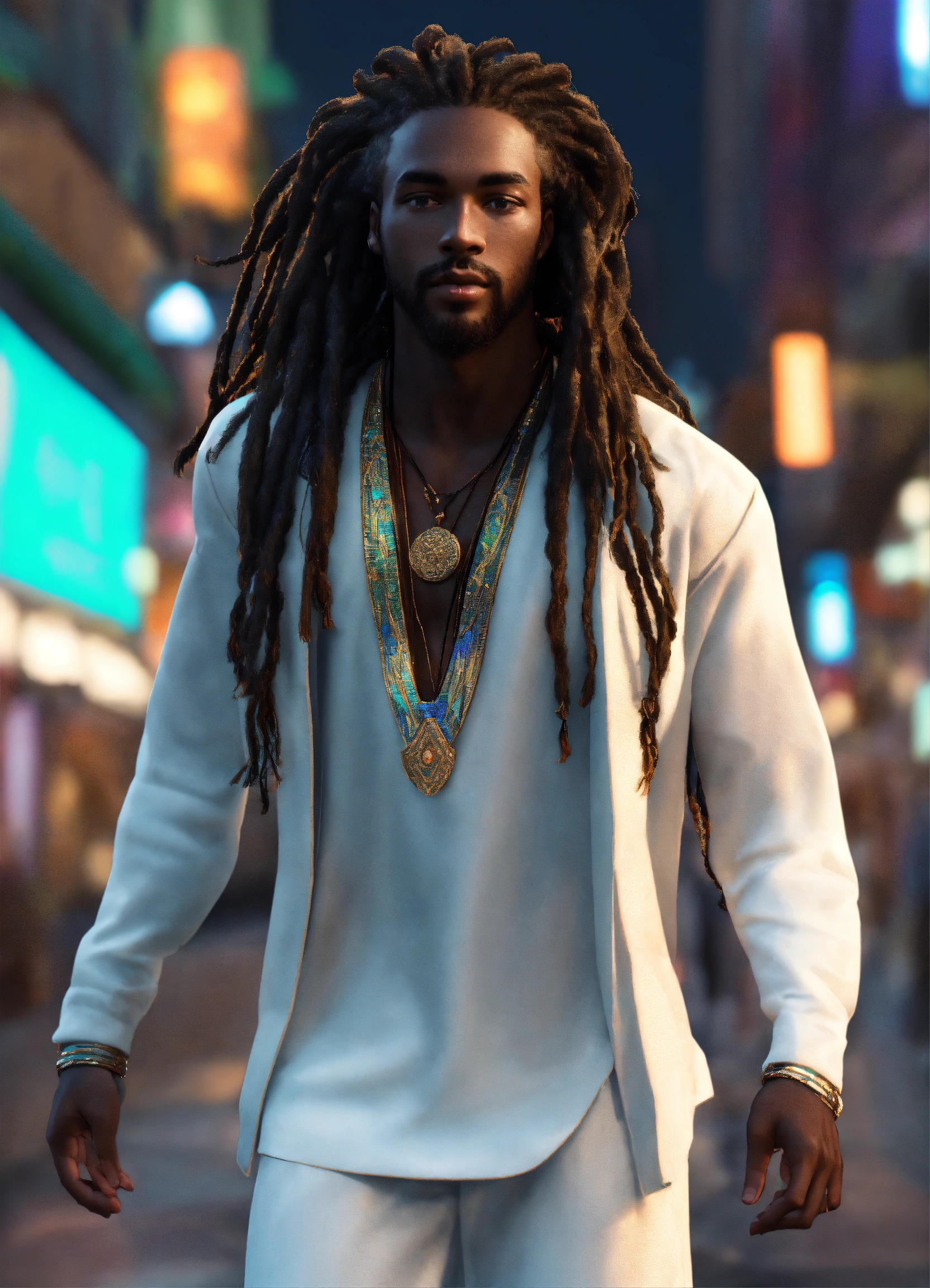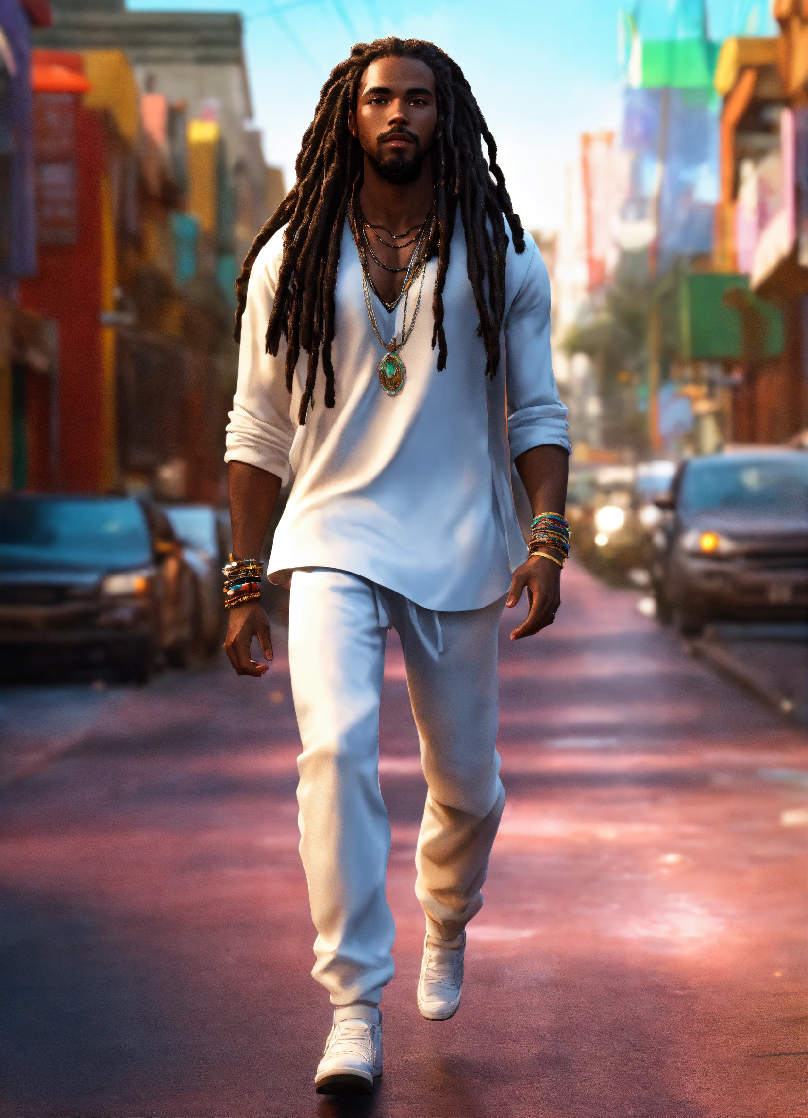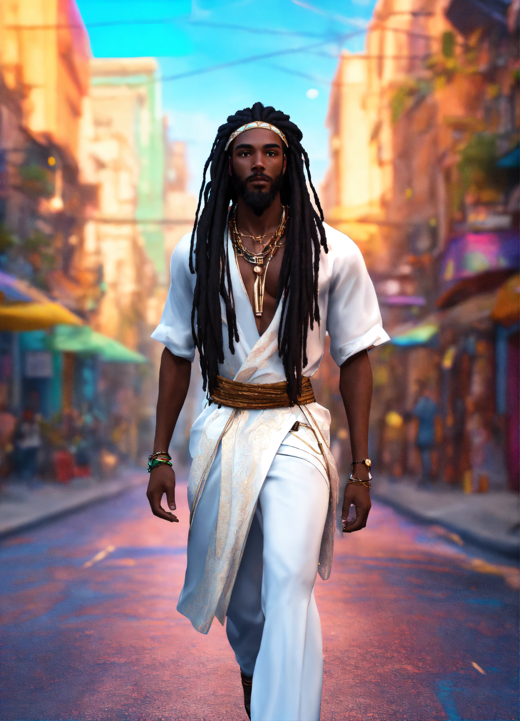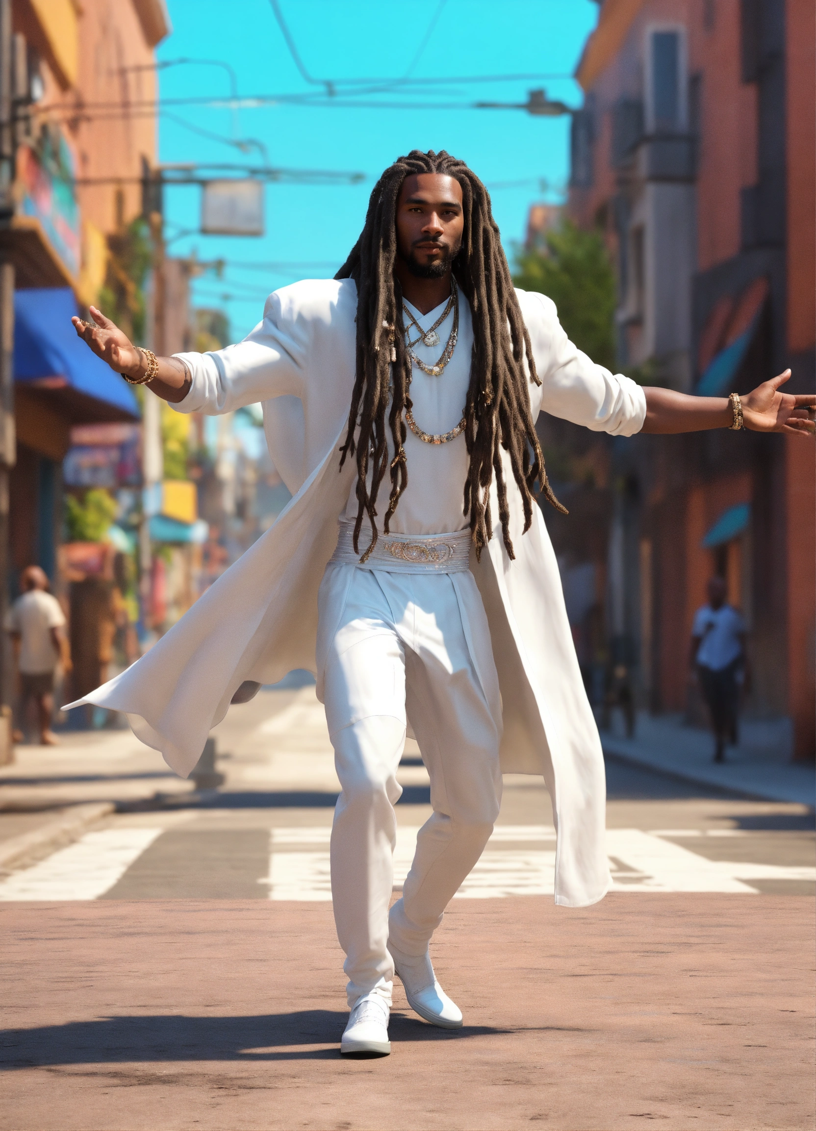 Black man with long flowing dreadlocks, well-built, 6' 5" tall, he has iridescent black skin, full body shot, striding up the street confidently, arms outstretched to the sides ready to hug someone, looking directly into camera, wearing all white iridescent clothing, african style iridescent white clothing head to toe, 3d render