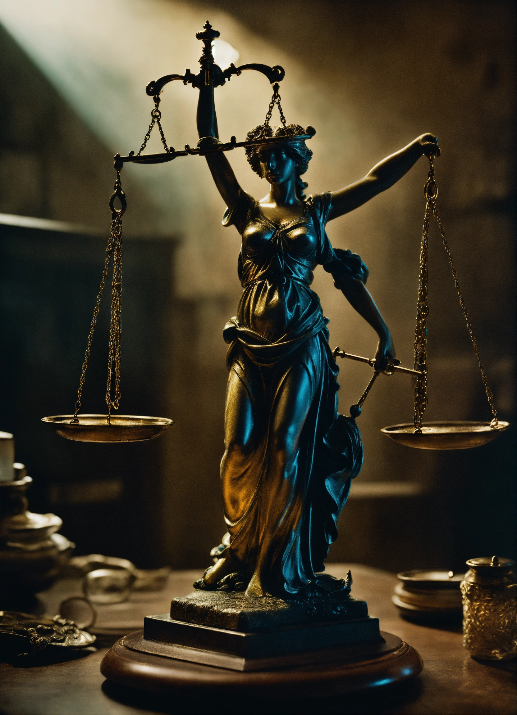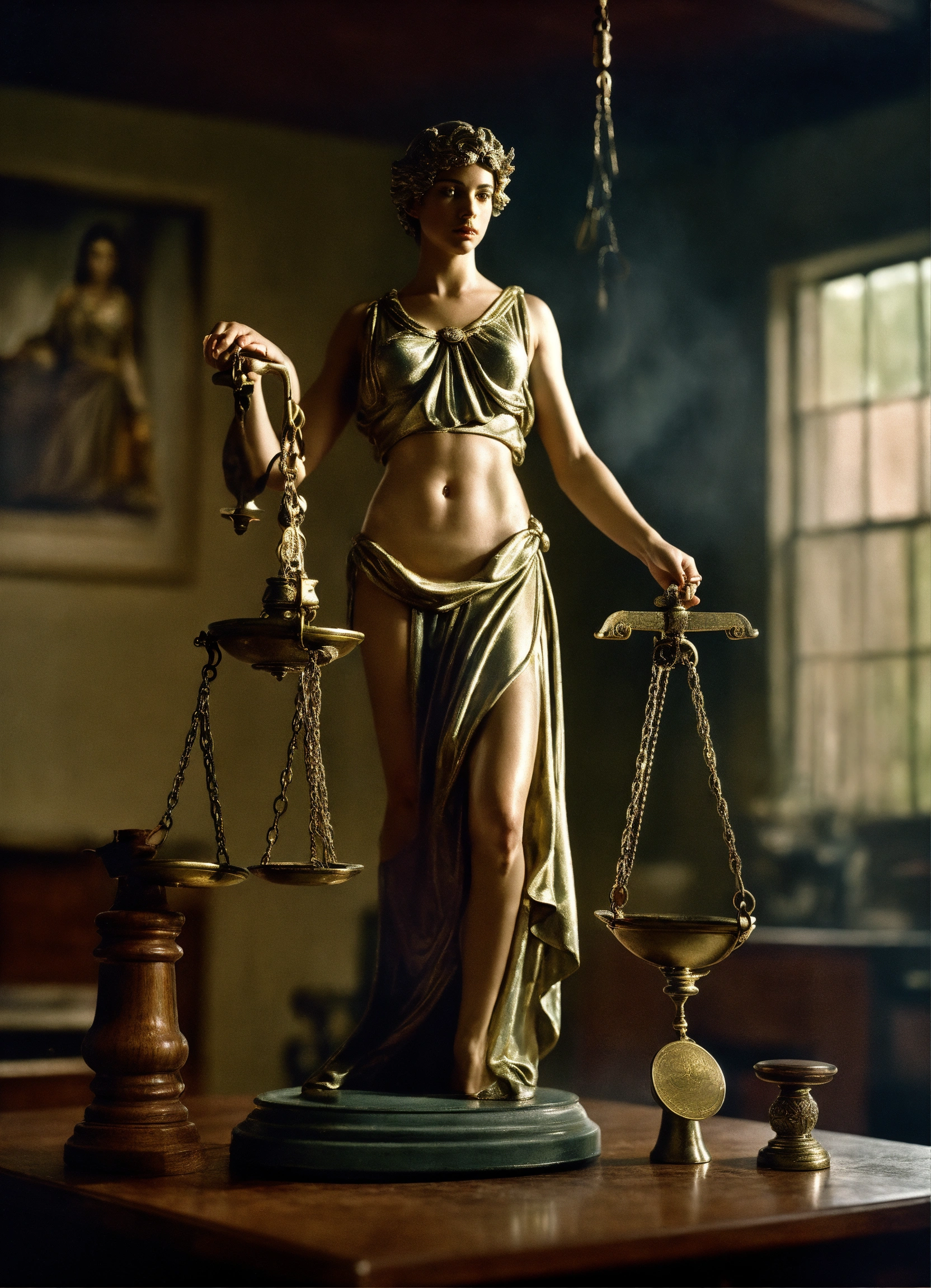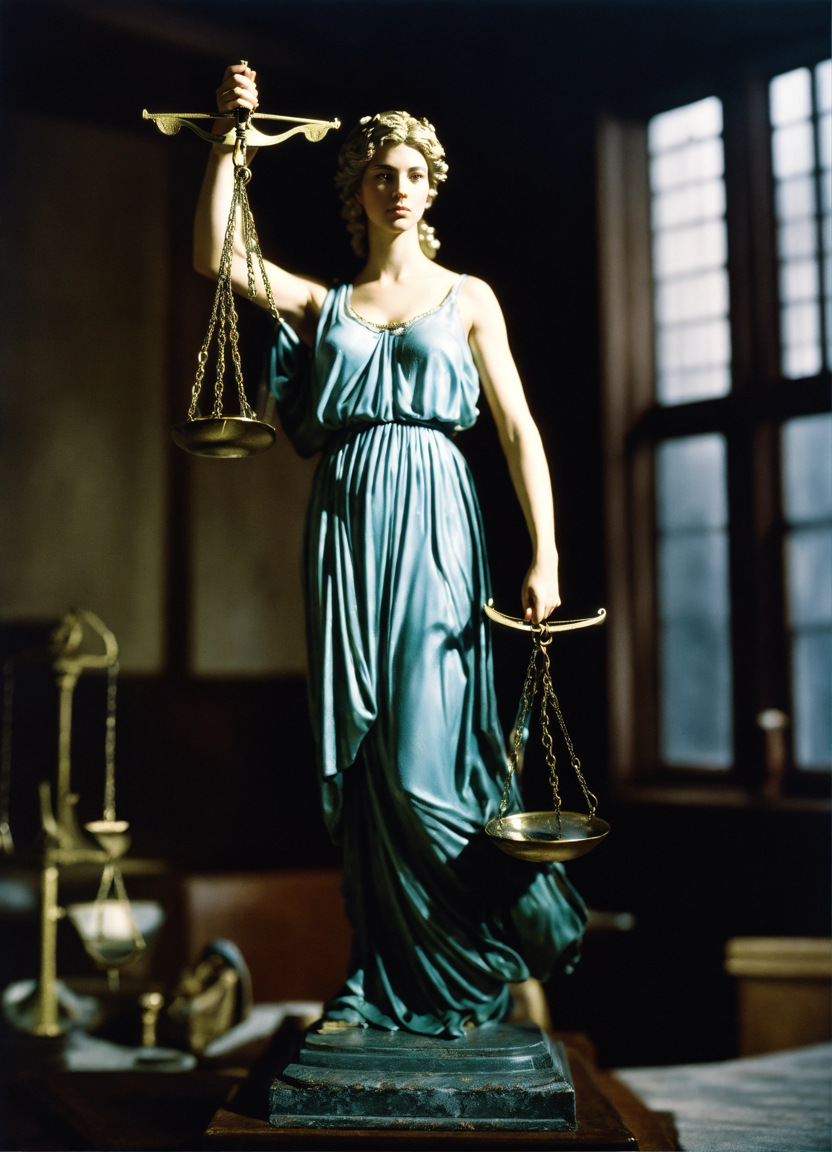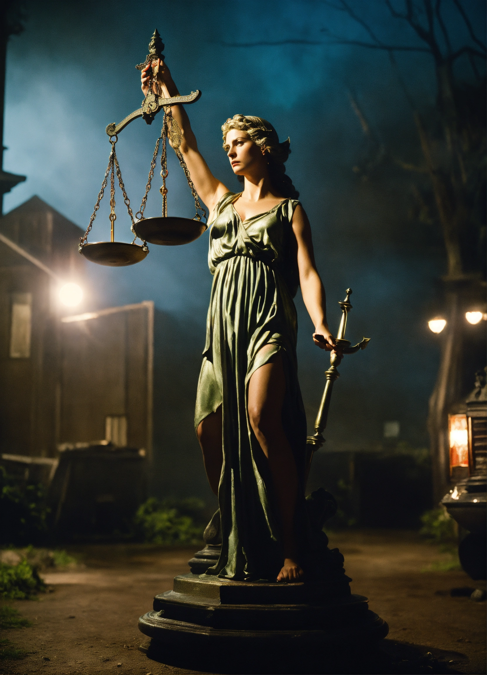Analog photographic highly detailed cinematic photograph of lady justice holding scales, hyperdetailed, ominous, ethereal, dramatic lighting, gregory crewdson