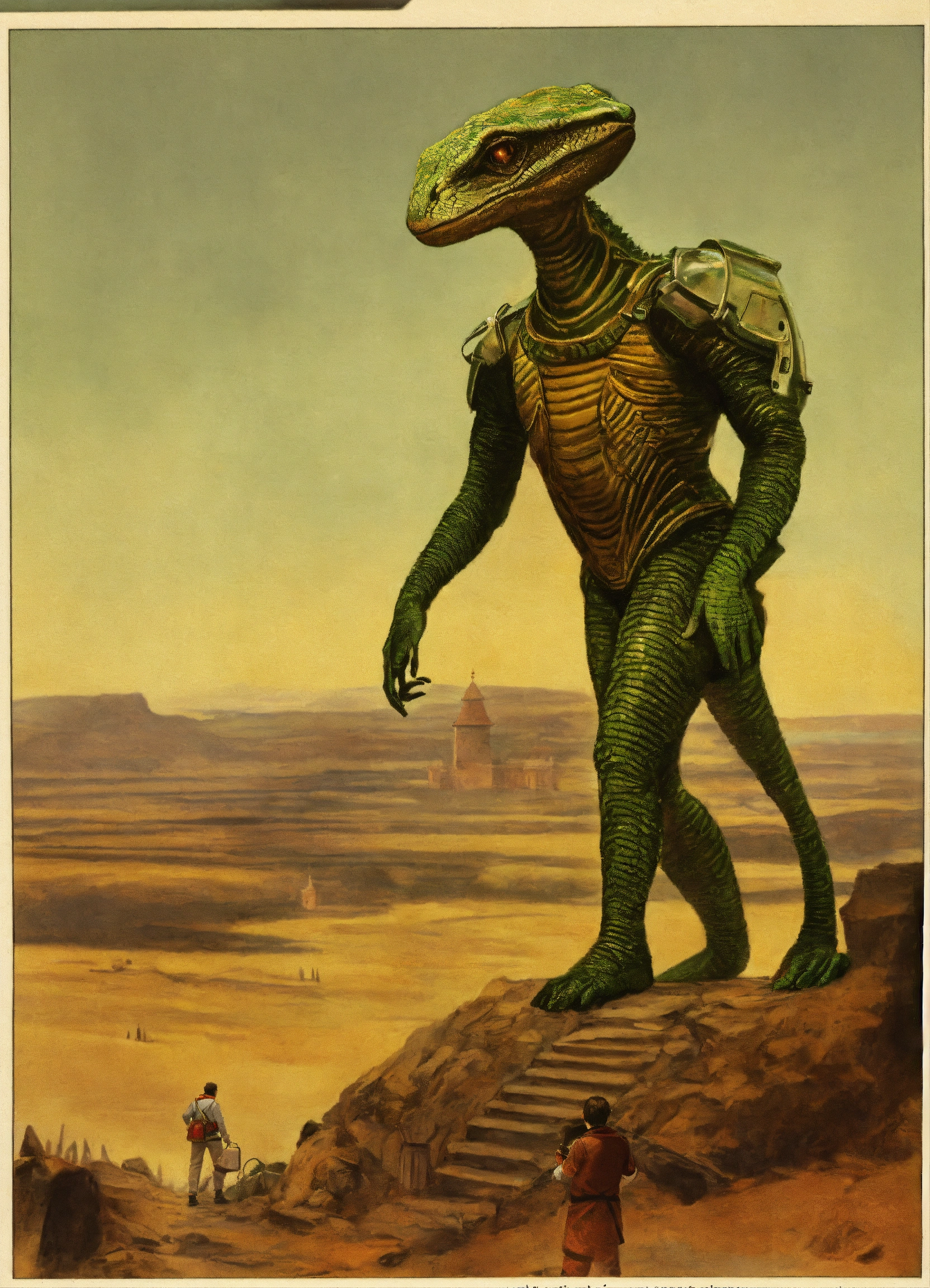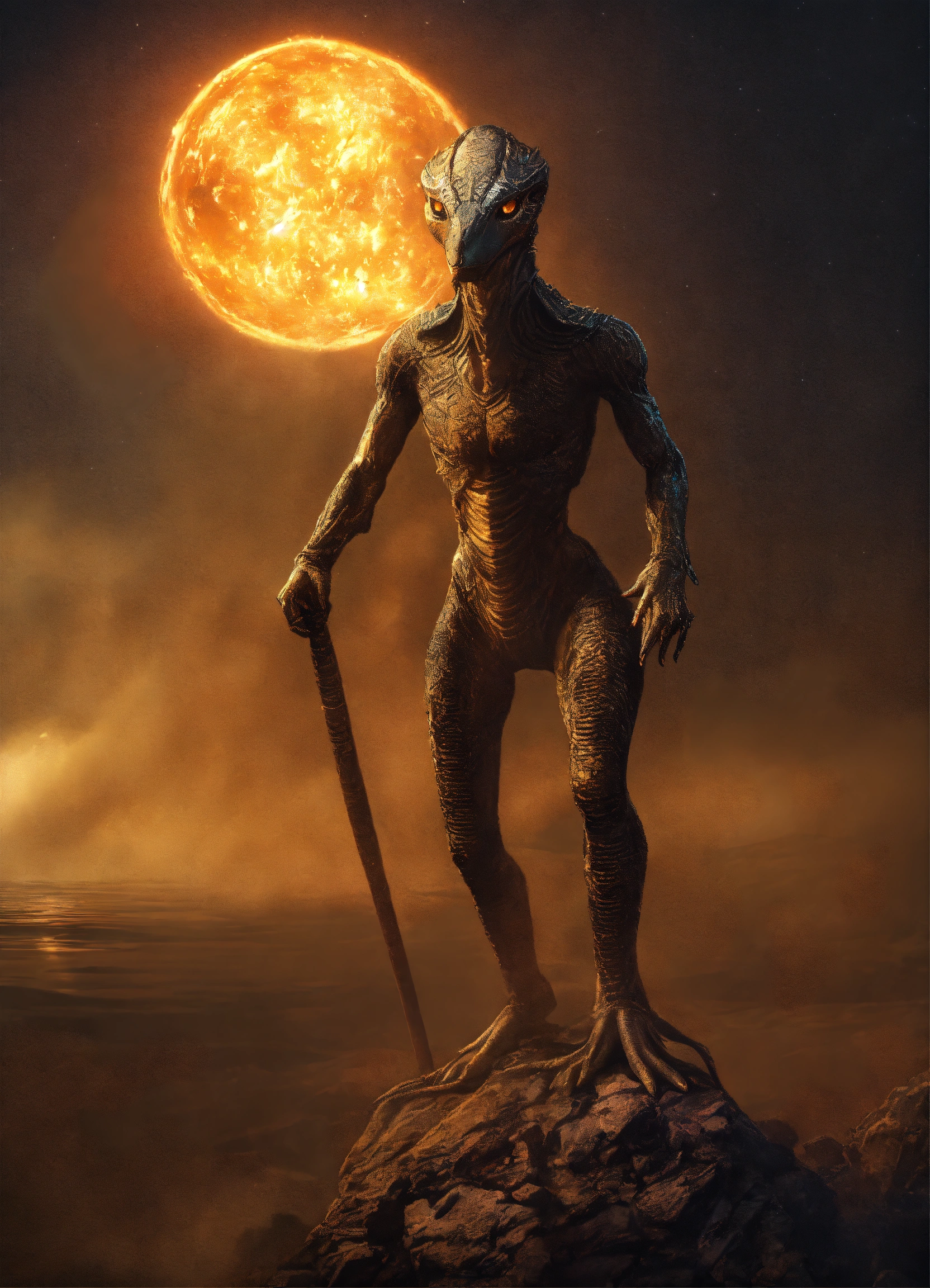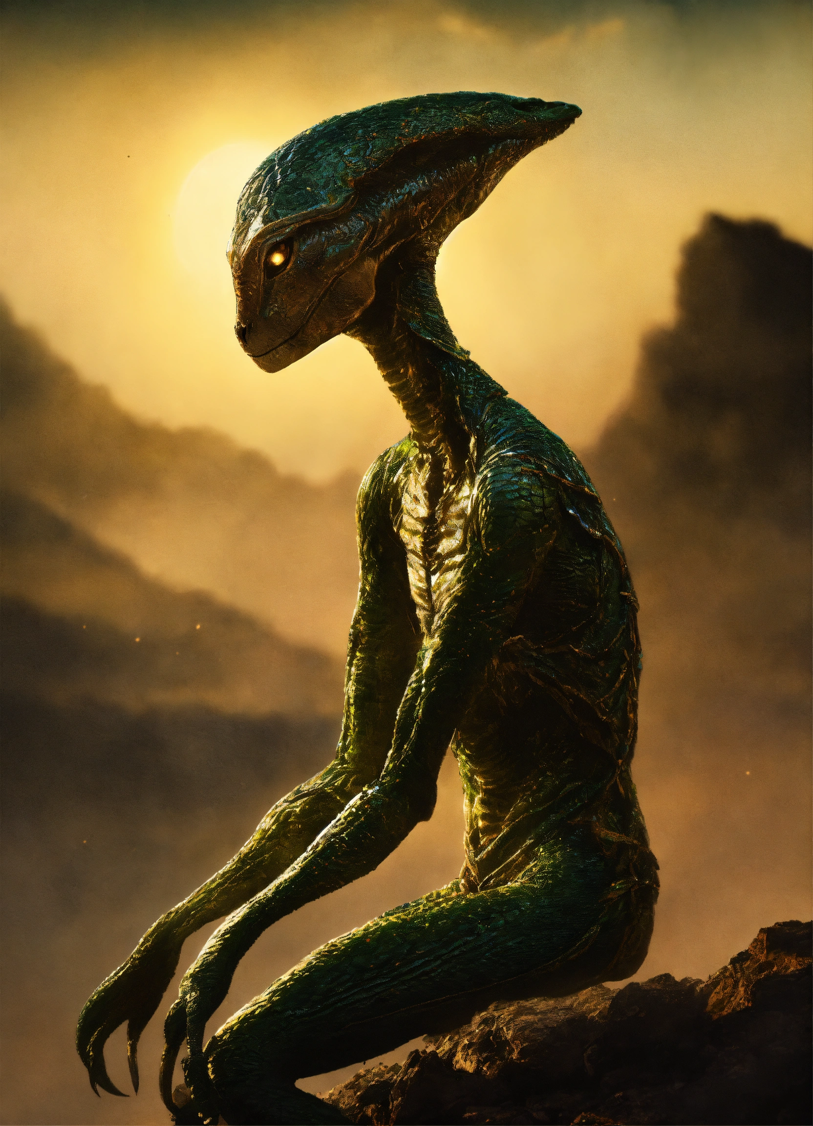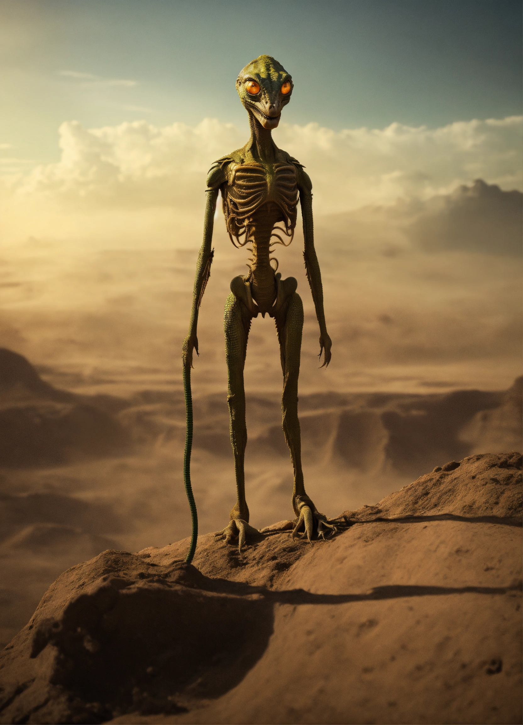 Genera una imagen de un extraterrestre reptiliano sosteniendo una balanza de justicia, nalanza desequilibrio