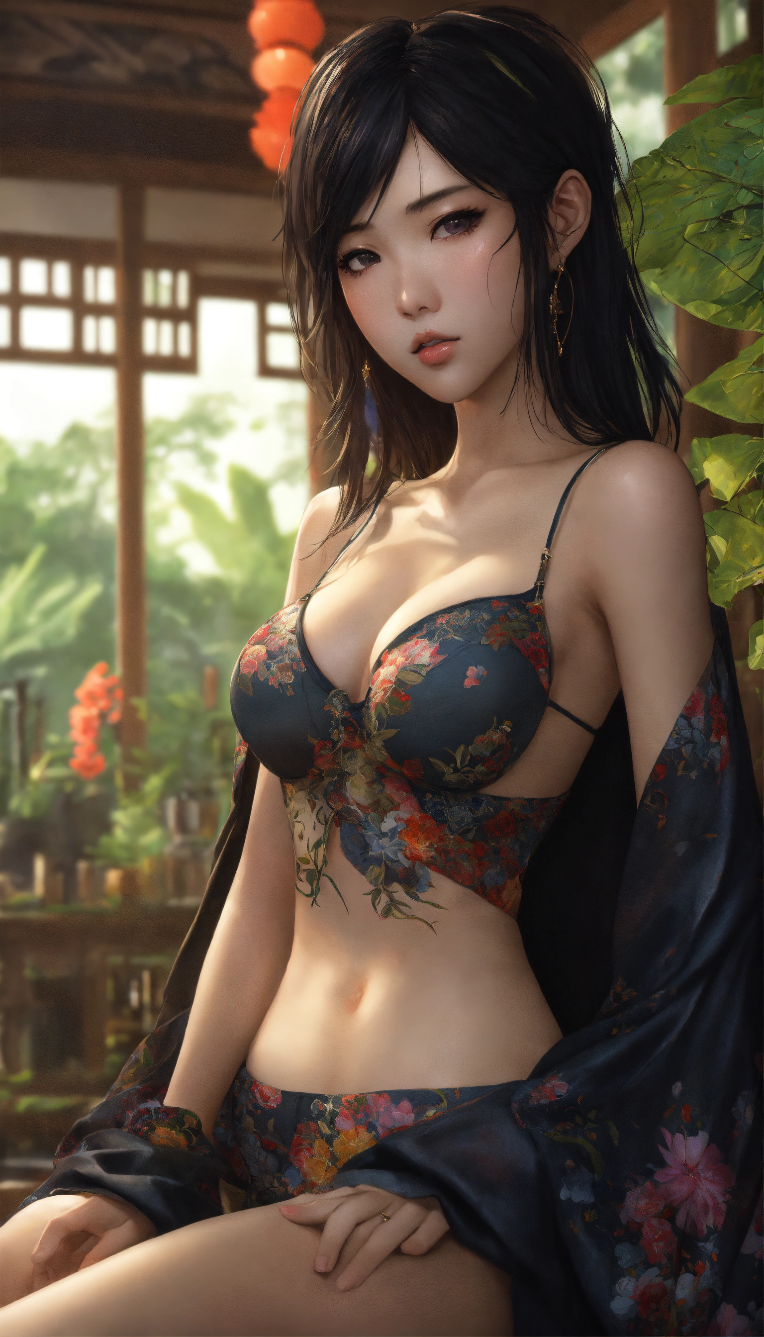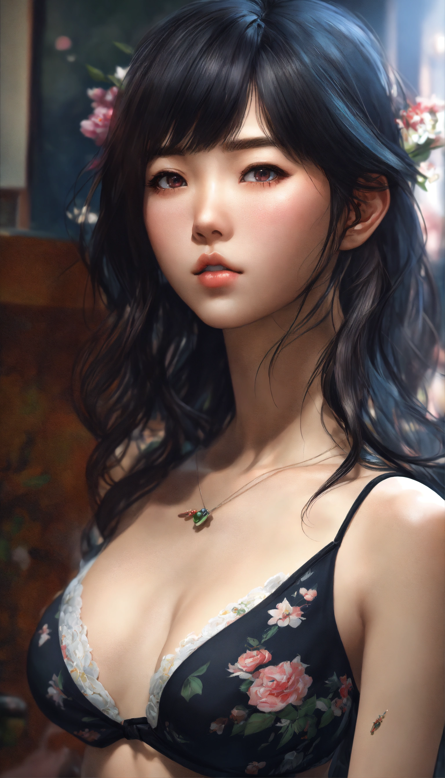 A beautiful asian girl, soft skin, messy hair, thin legs, black bra, monet range murata artgerm katsuhiro otomo, highly detailed intricately sharp focus, bedroom eyes trending on pinterest vogue italia unreal engine 5, 4 k uhd image