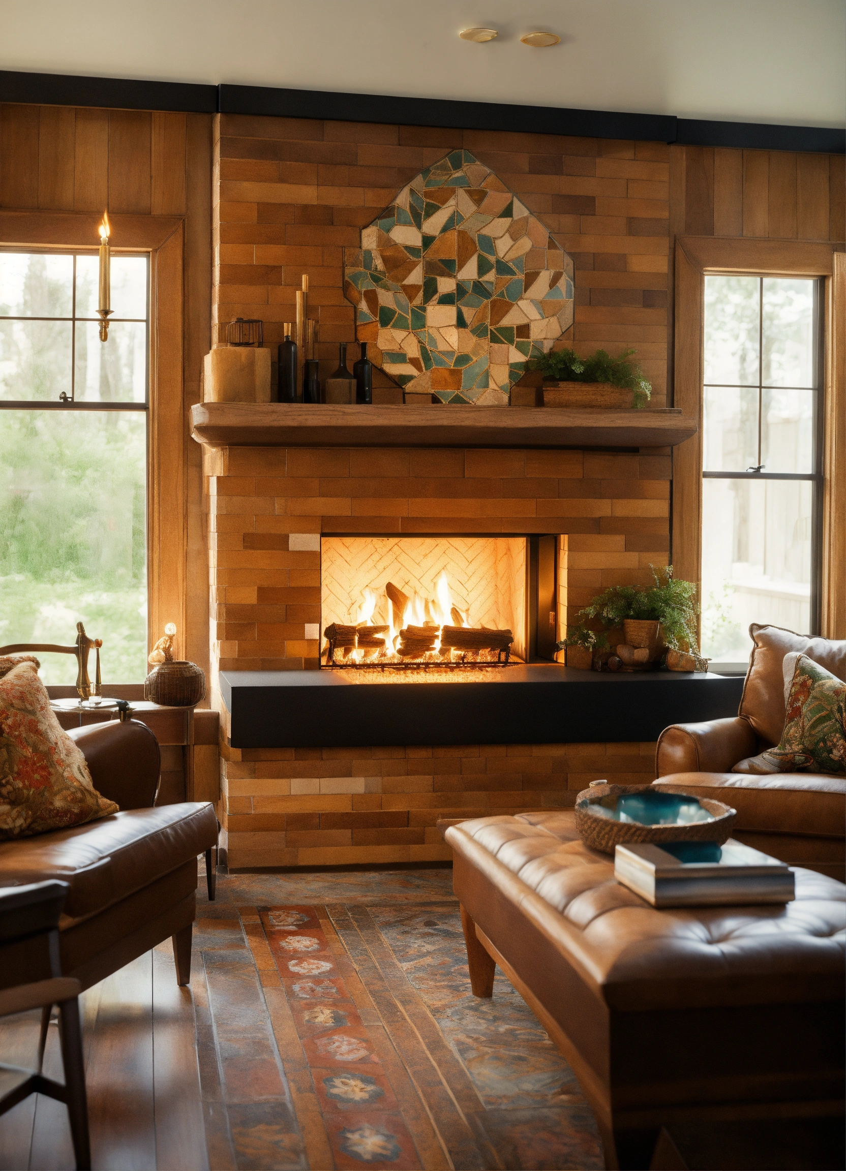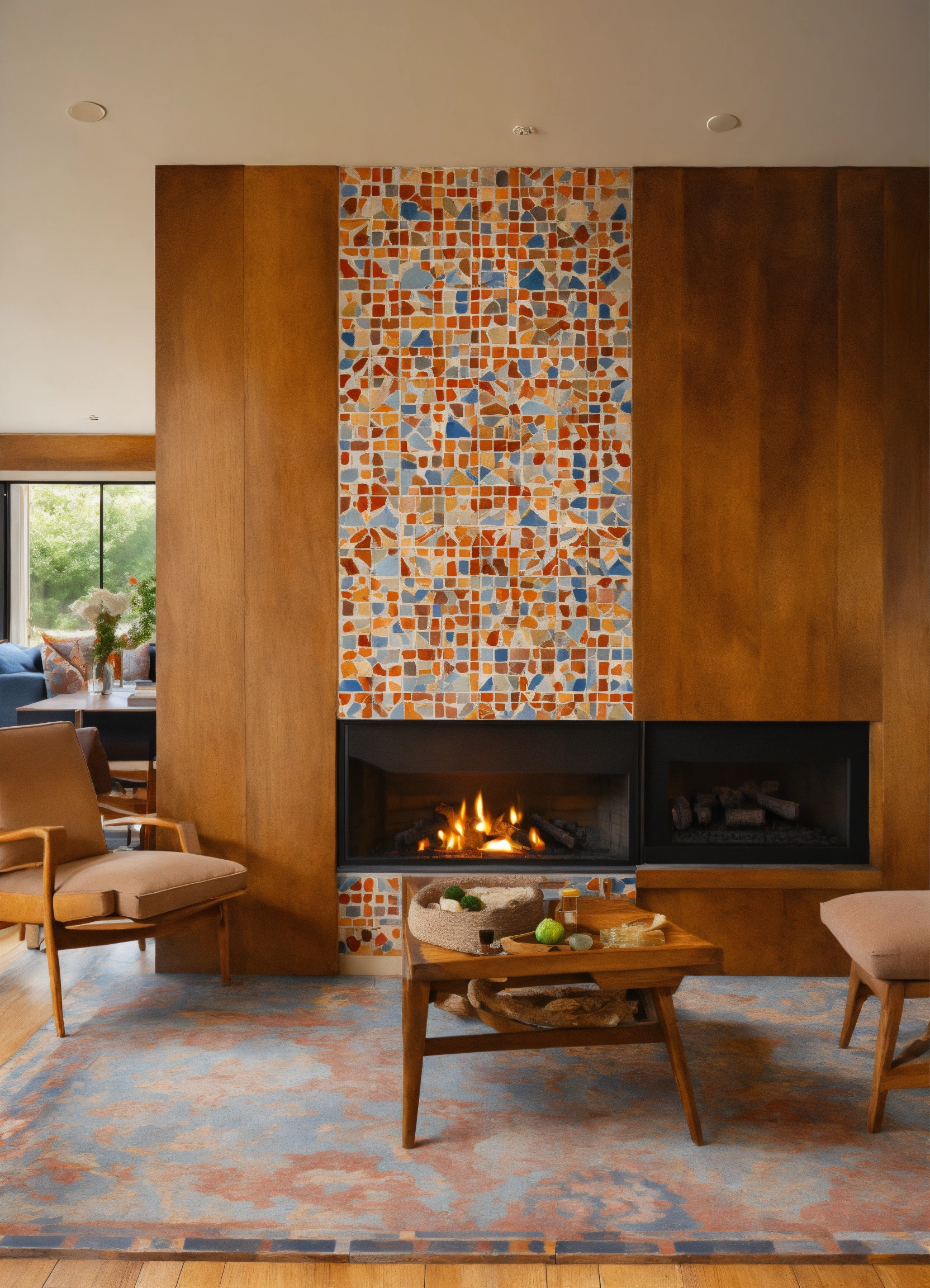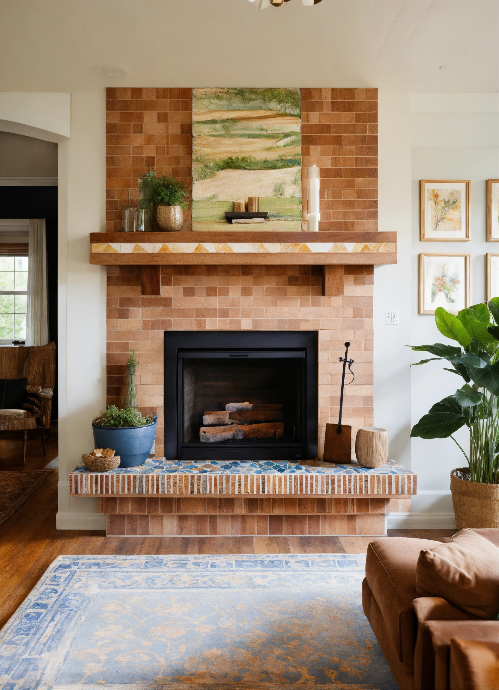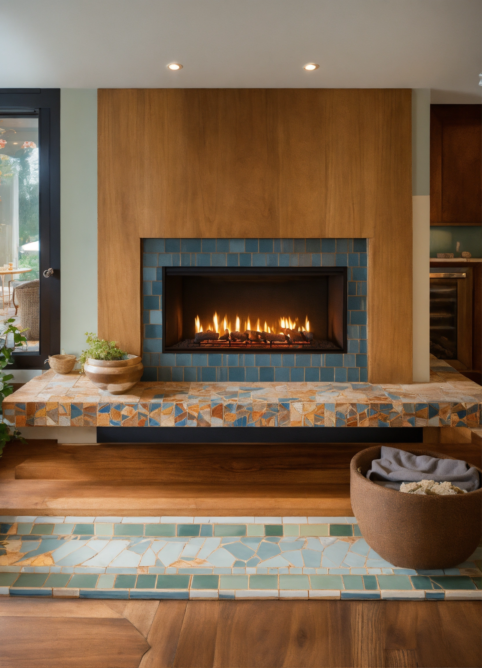 A floating, natural wood mantle over a small living room fireplace, hand painted tiles surrounding a rectangular fireplace, low to the ground, 4k, hd