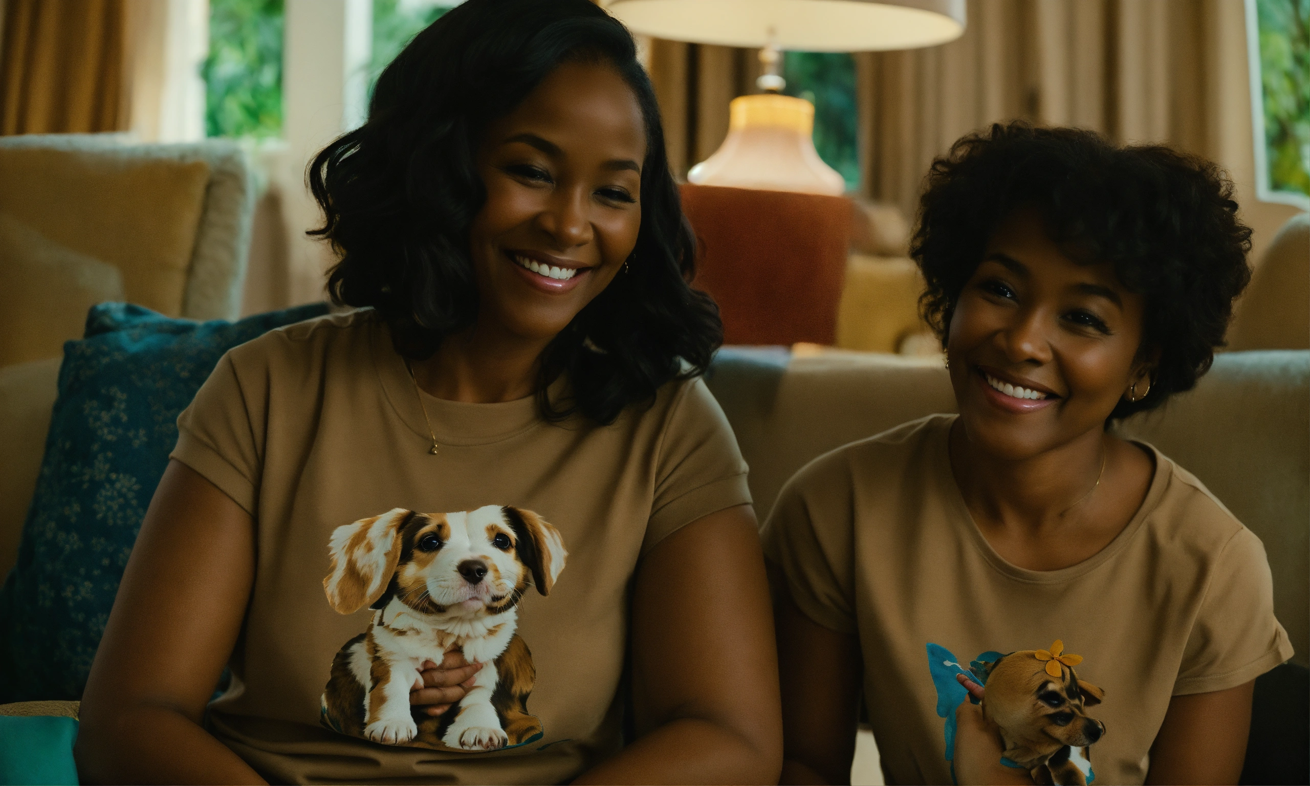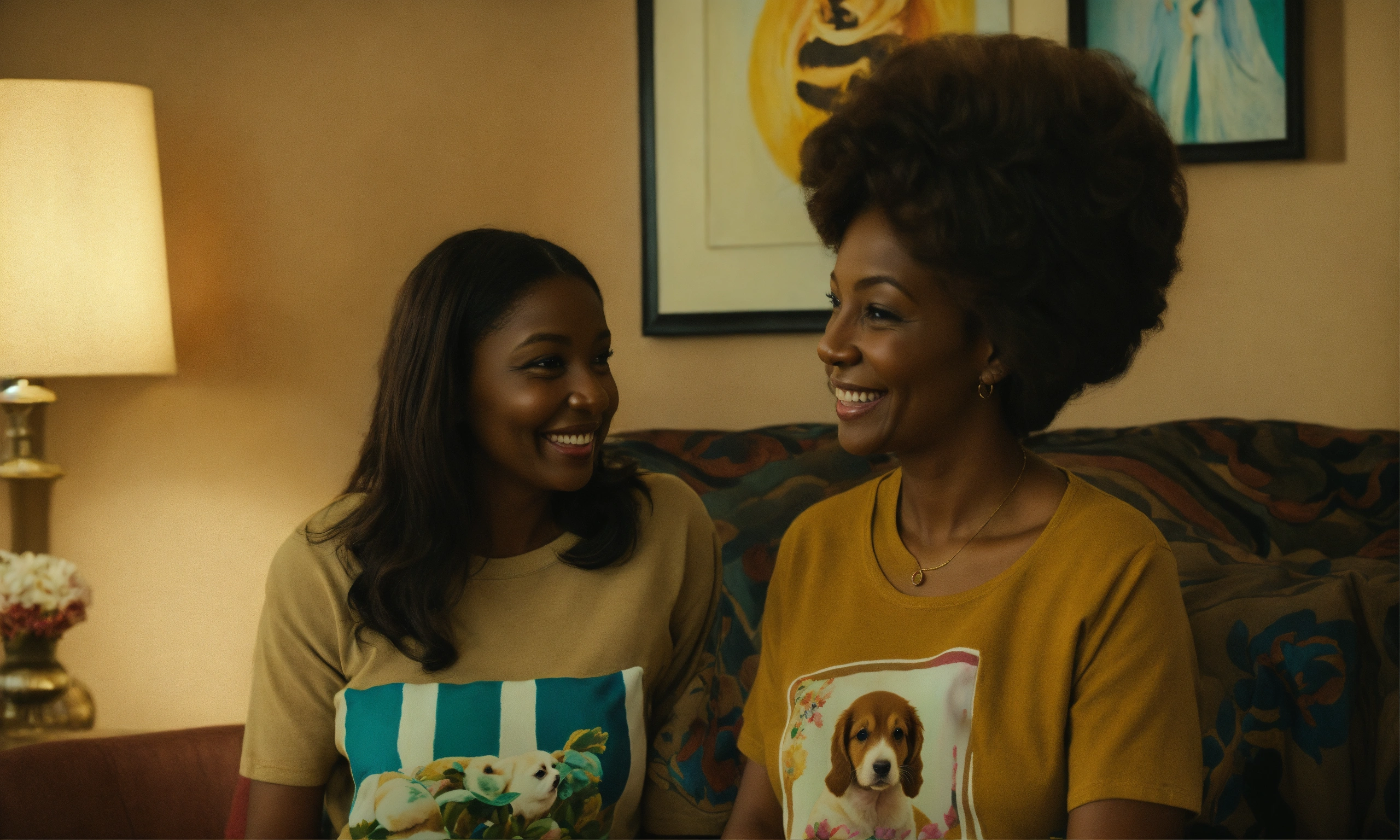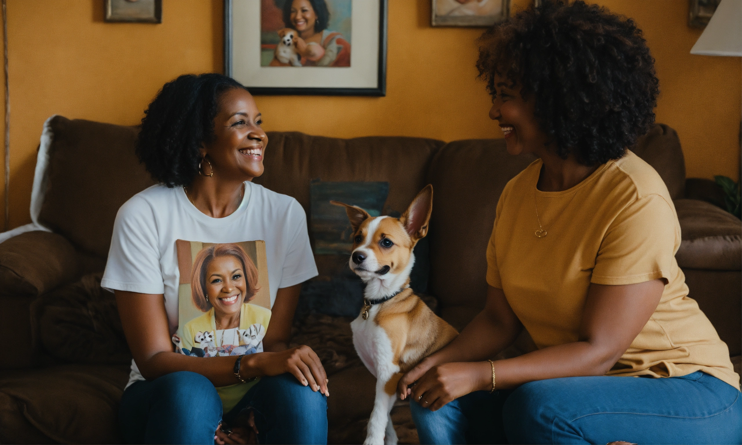 A brown skinned adult female with her aged mother smiling as they look up at a painting of a brown skinned aged women holding t-shirt with a image of a puppy on it. sitting in a living room designed with brown, tan and black.