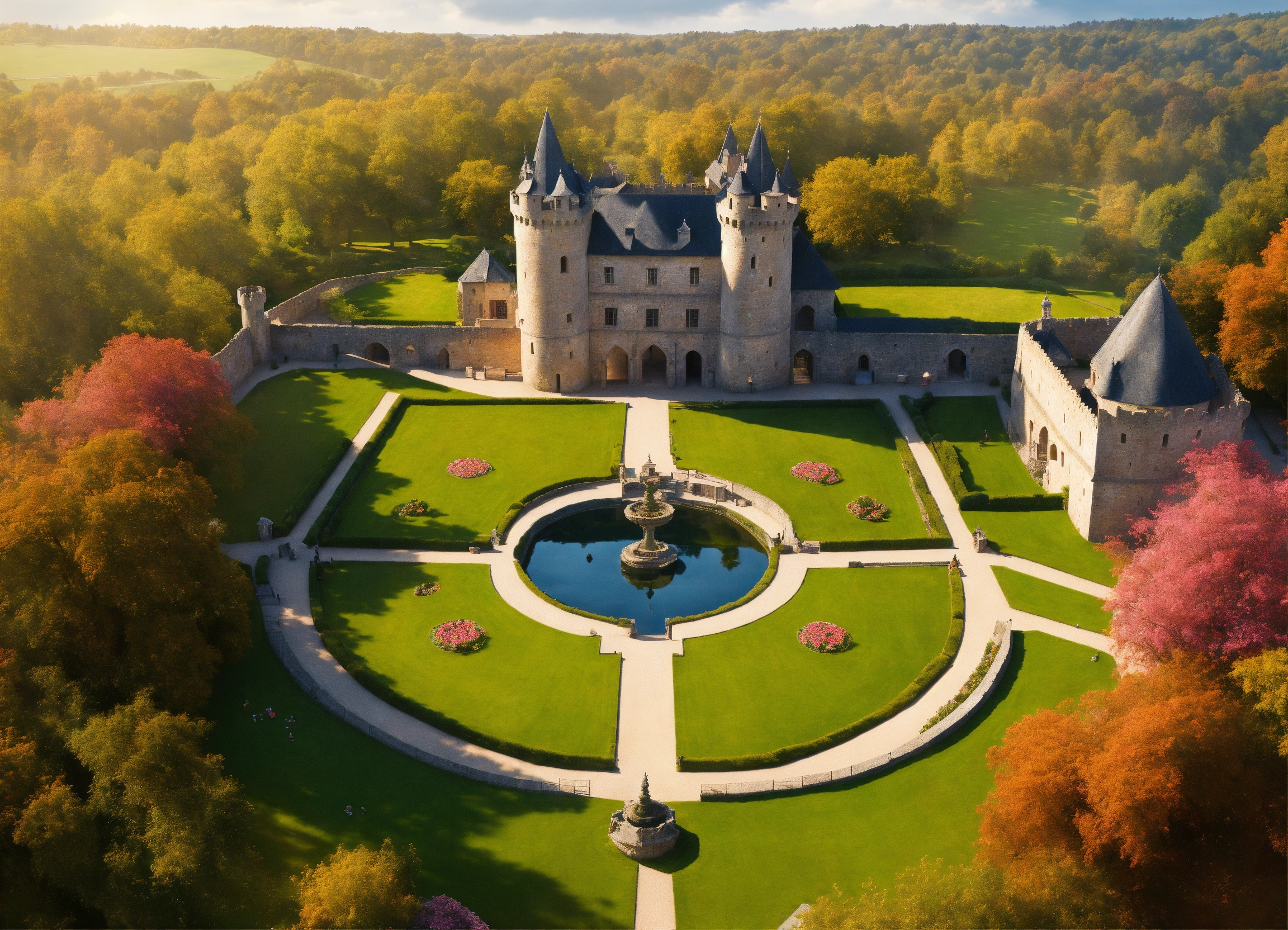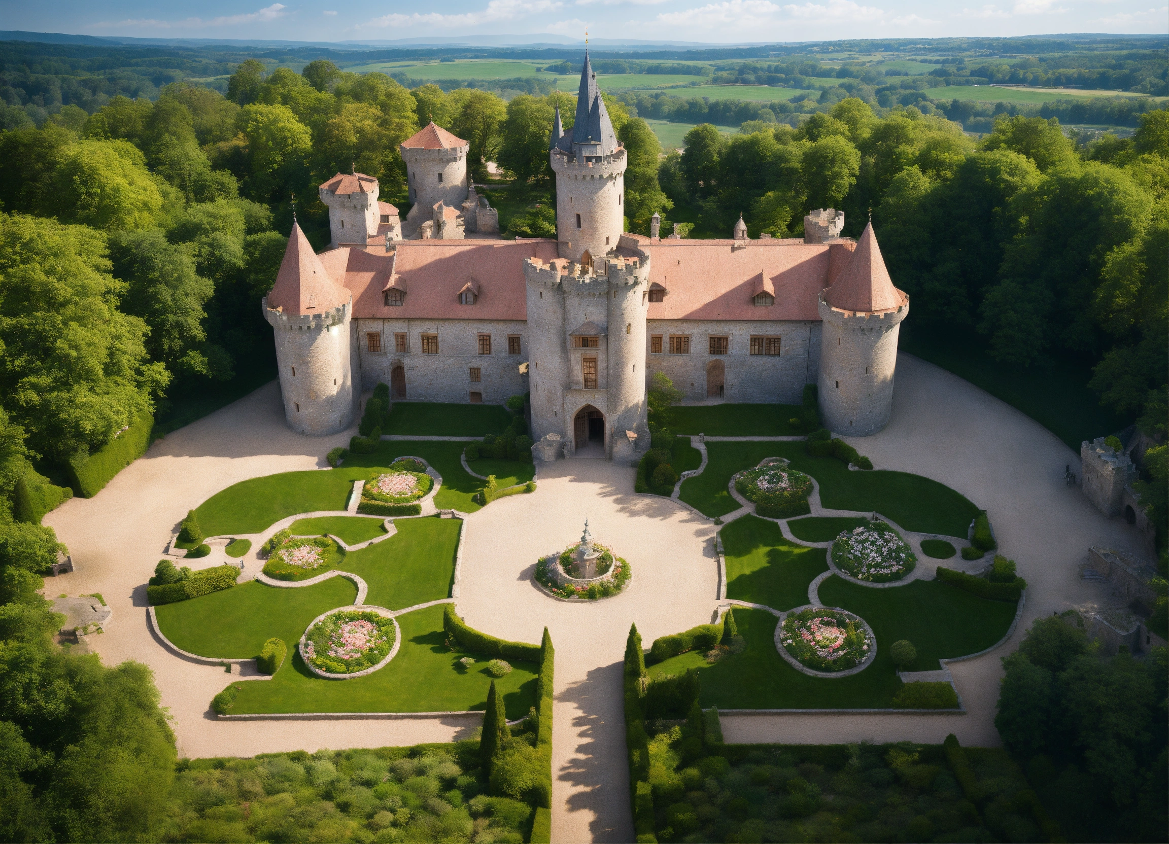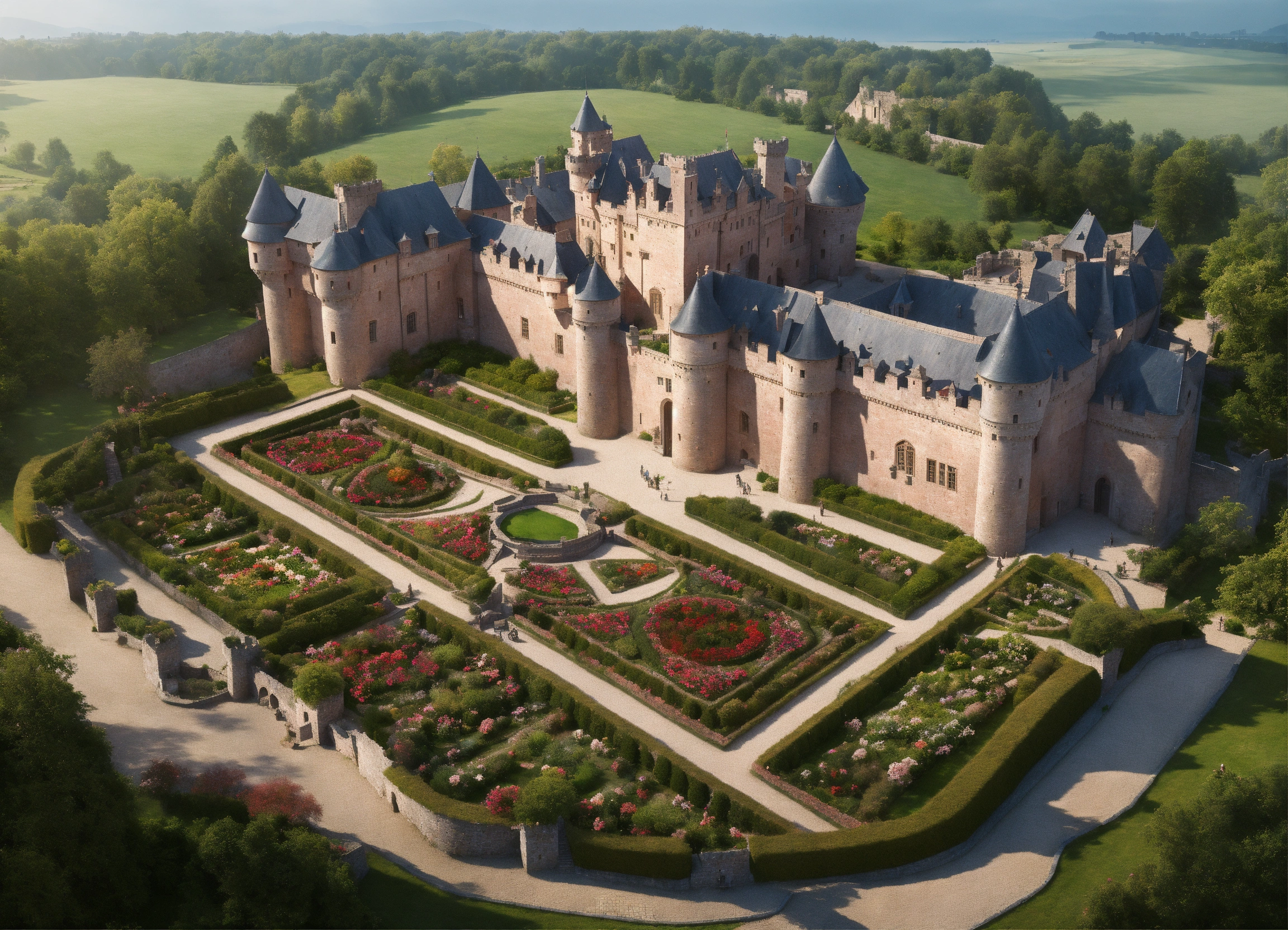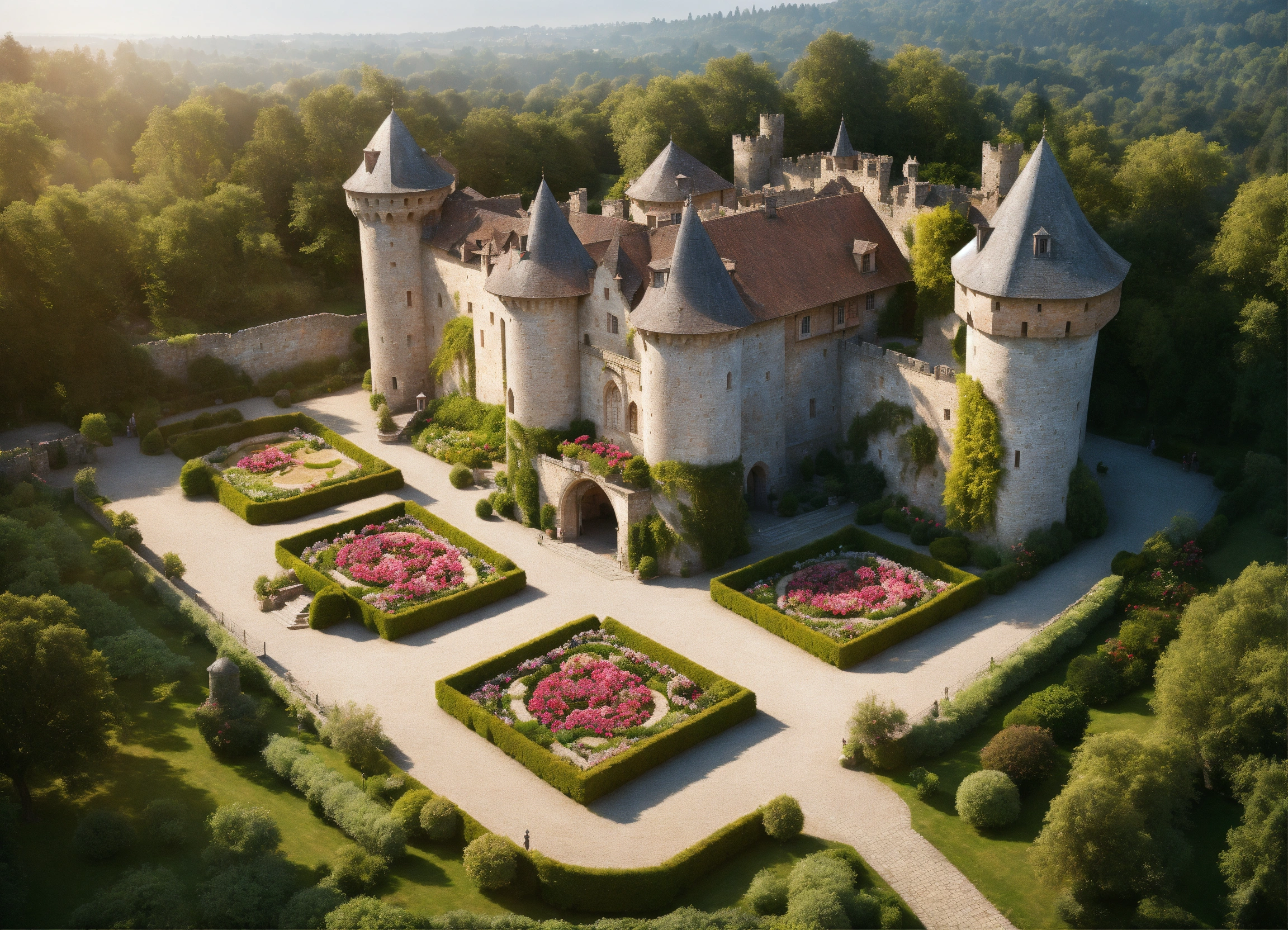 Ultra realistic, photorealistic, bird's eye view of a small medieval castle on a rock, garden terraces with pond, rose bowers, magnificent rose garden and arcades, magnificent fountain, massive crenellated stone wall with a central wall gate and watchtowers surrounds the castle area, with a large inner courtyard and several servants quarters and stables, rose pavillon, pleasure grotto, large forecourt, a wide boulevard leads to the entrance of the castle, extensive rose fields on hilly landscapes in the area around the castle, ultra detailled, focus on castle, sharp focus, sharp, ambient lighting, ksiąz castle in poland