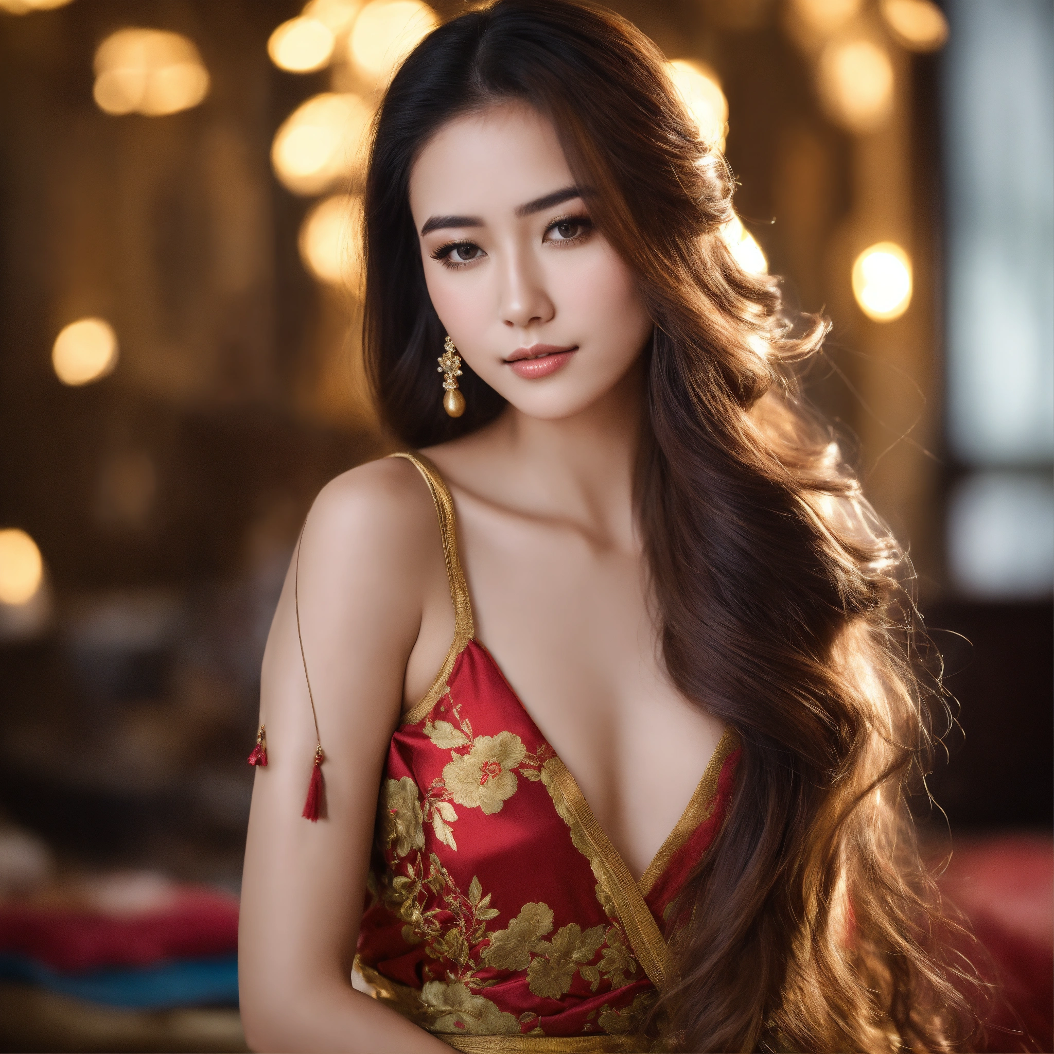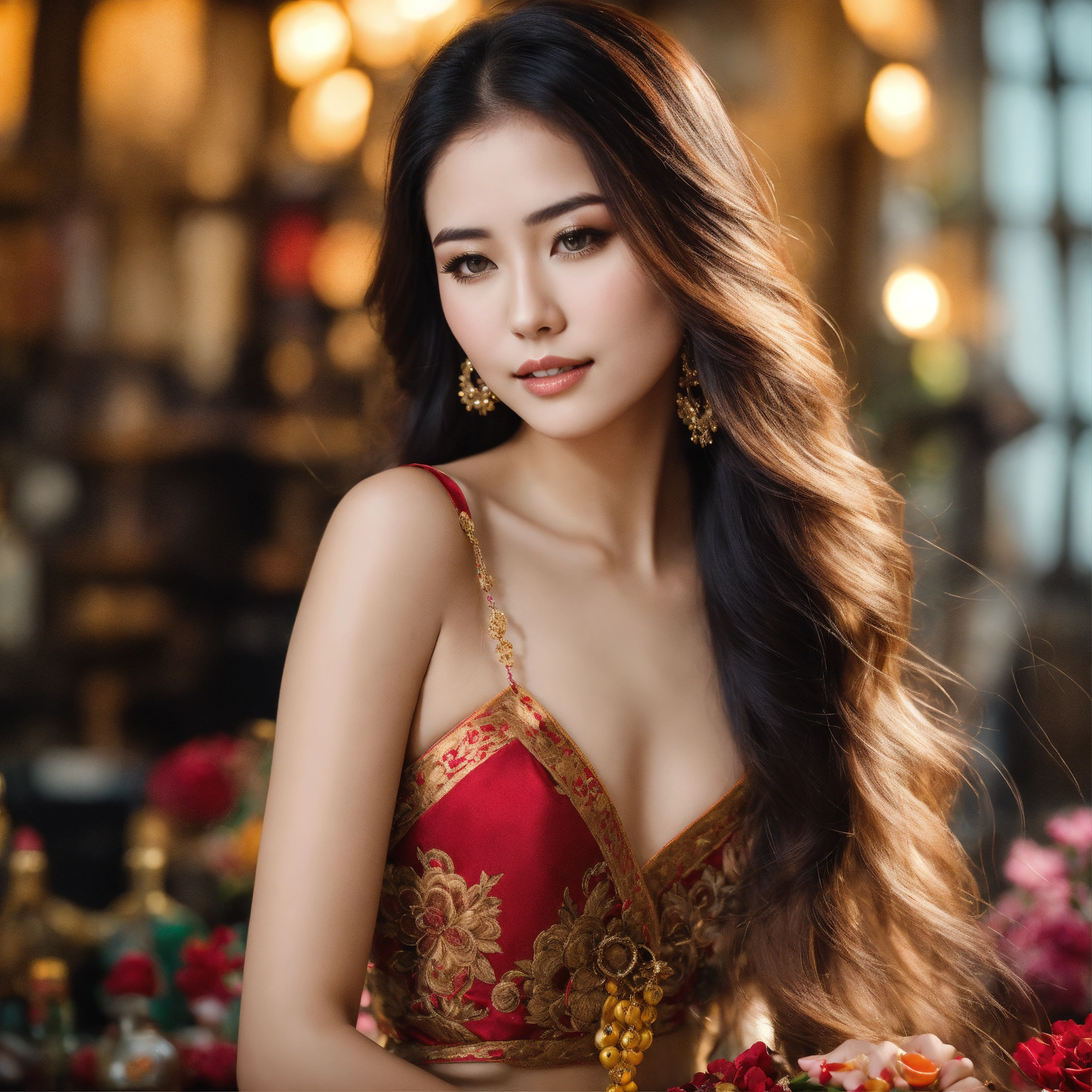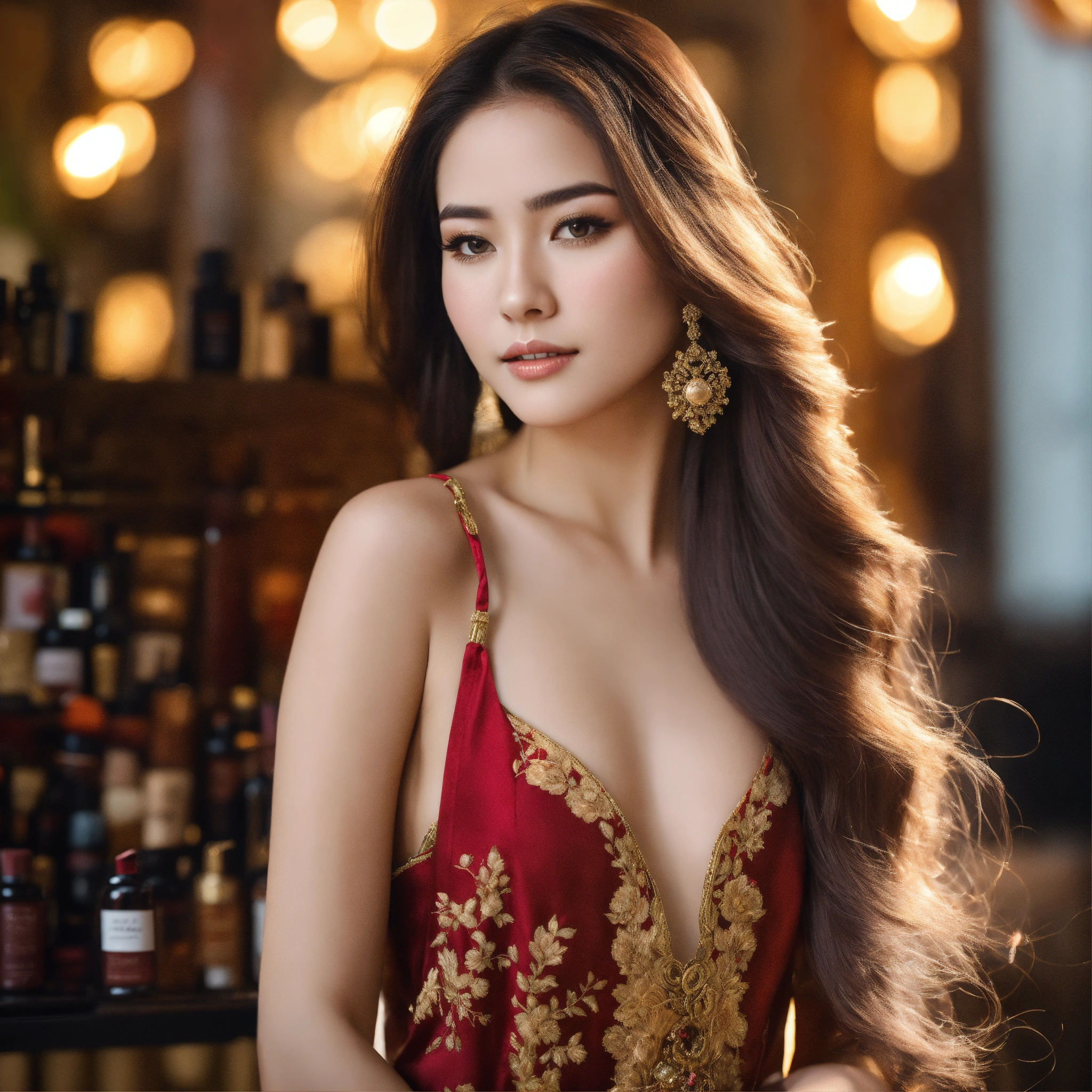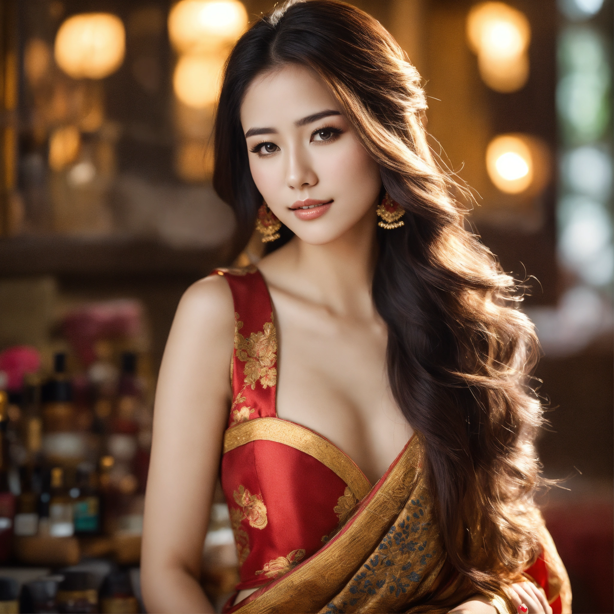 Create a image long hair beautiful lady with traditional look full compilate body with slim waist, she hold her hand a product of hair serum