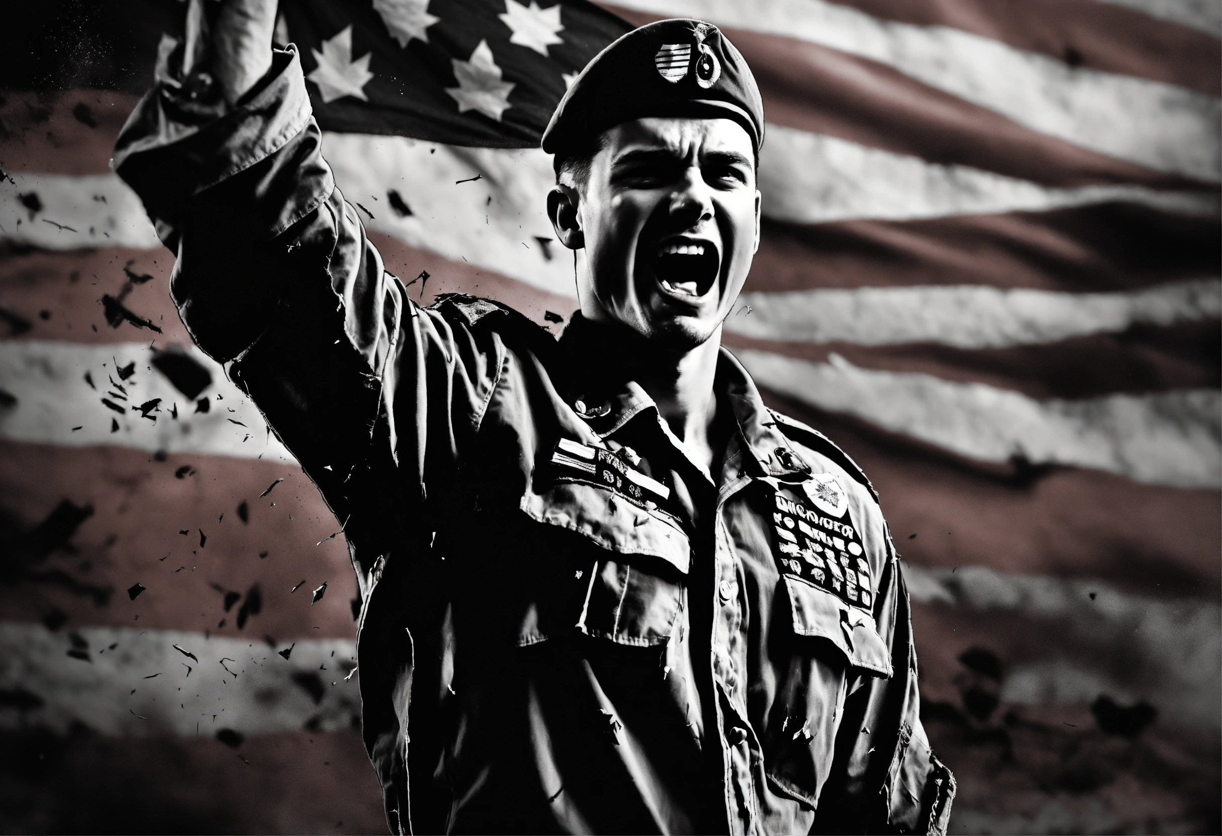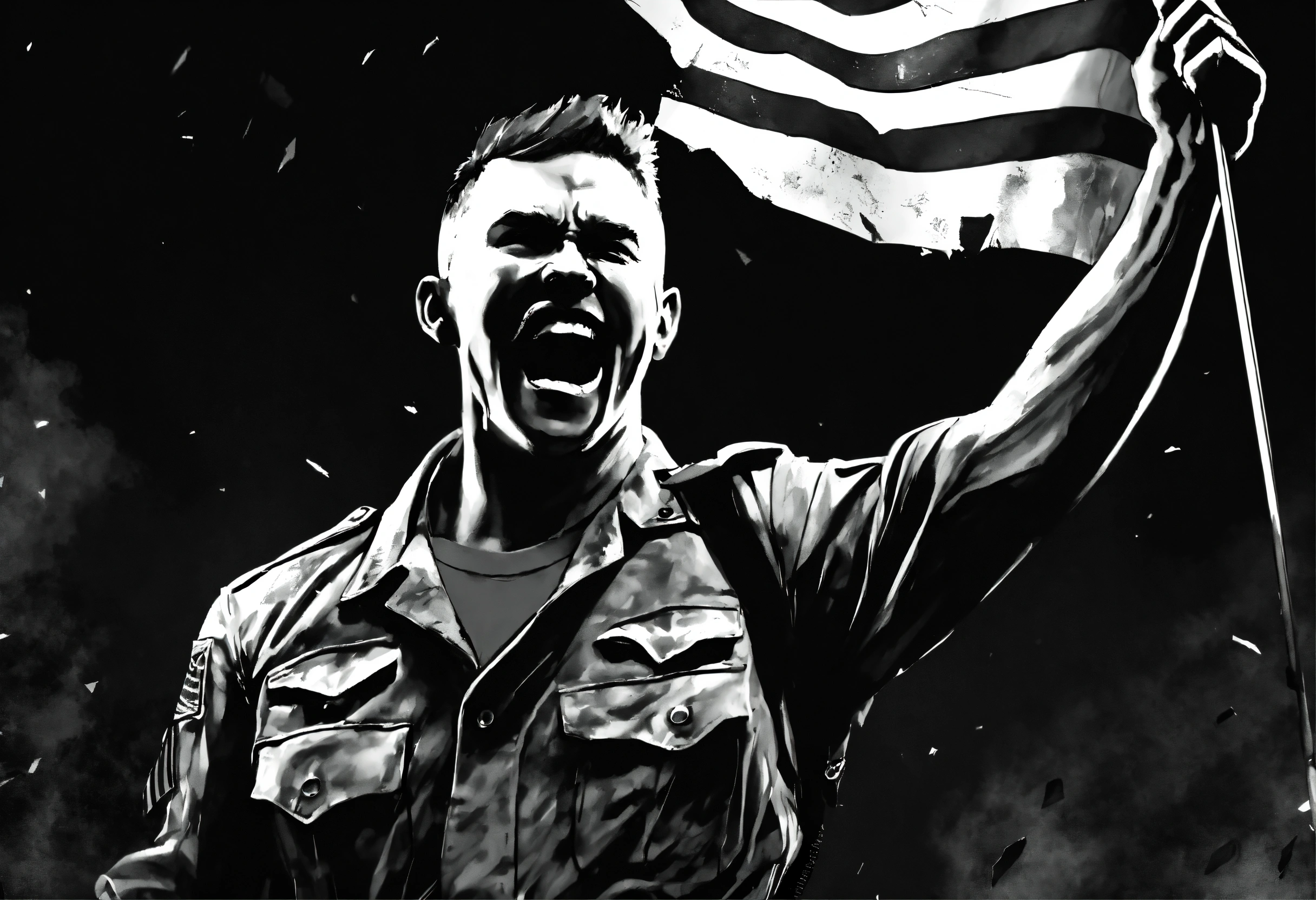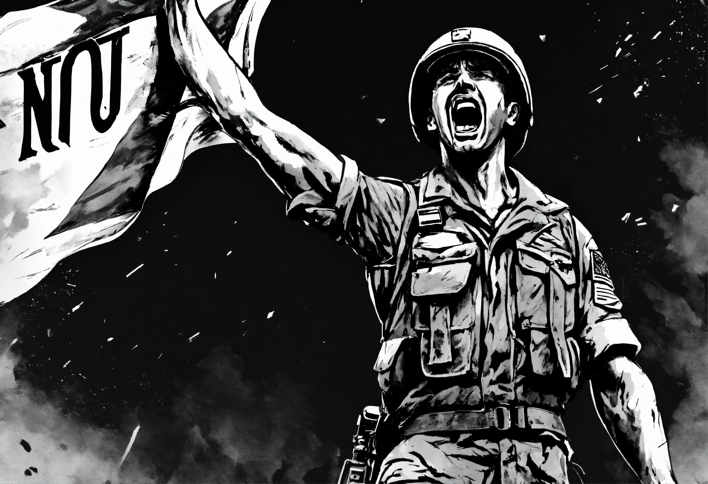 Black and white illustration of enraged male soldier waving flag that says "no nut november", emotional, screaming, action shot, tattered torn shirt, porcelain cracked skin (vibrant, dramatic, dark, sharp focus, 8k).