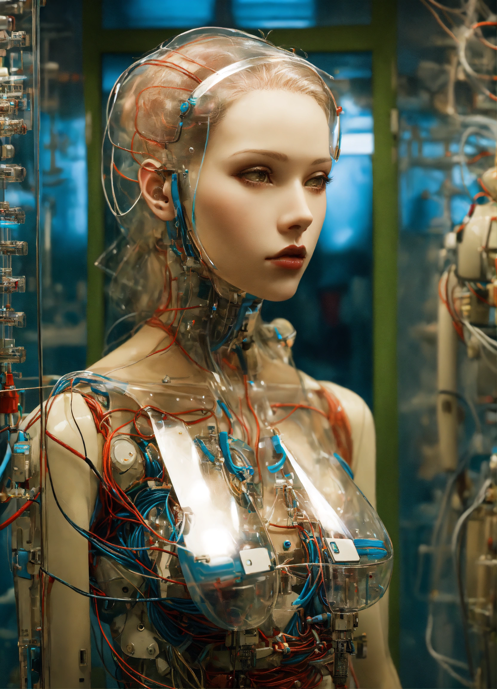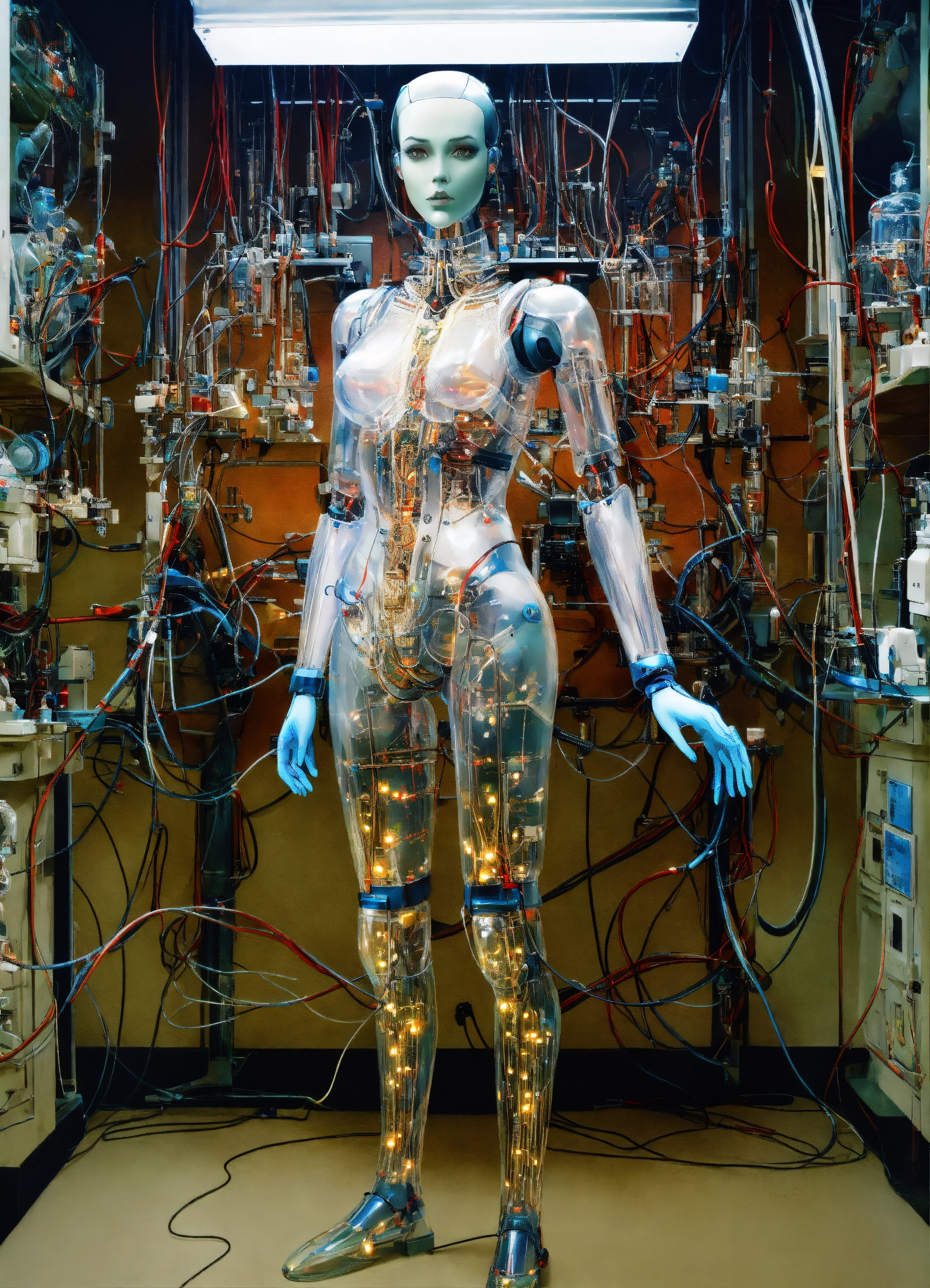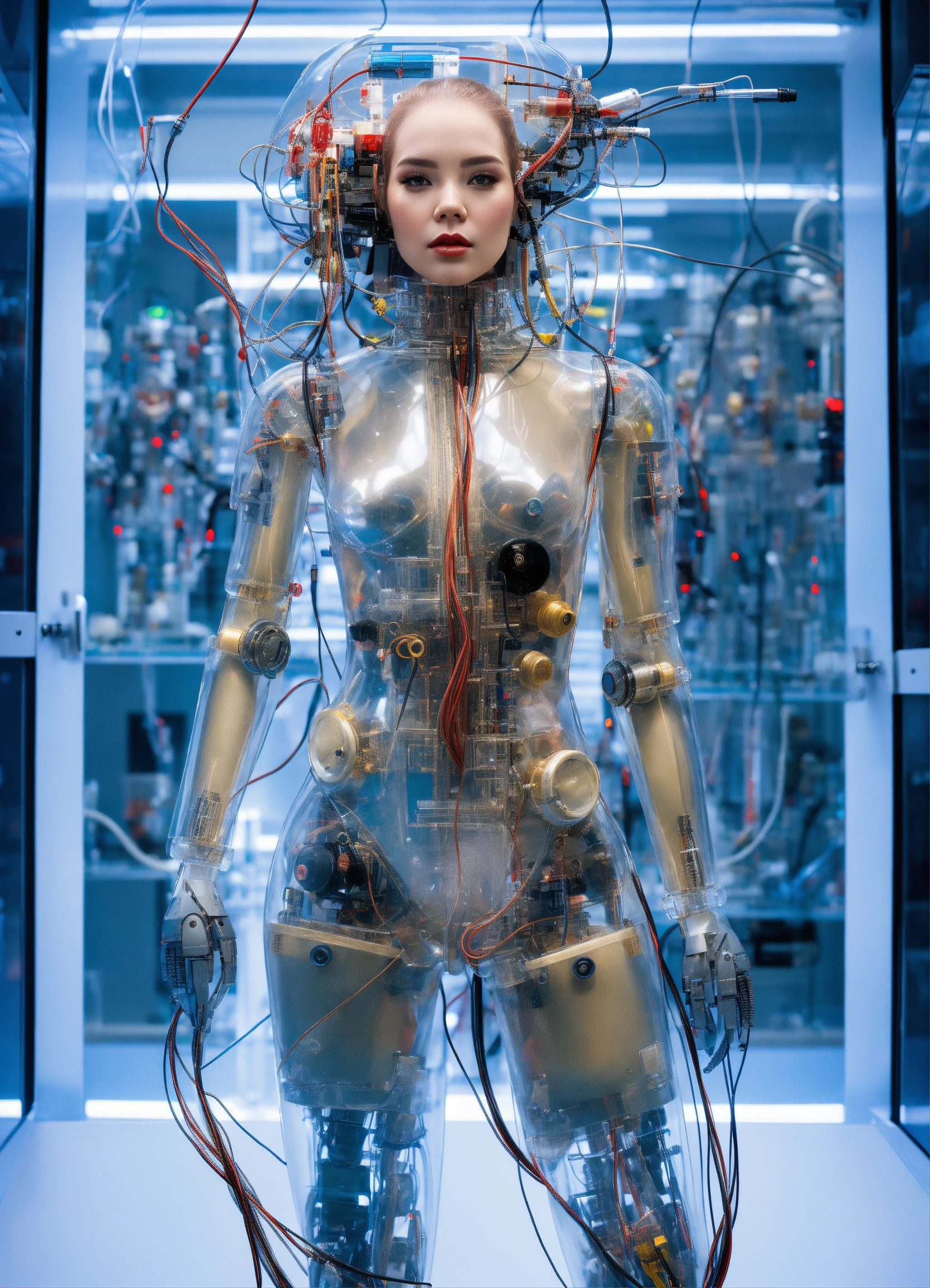 Body portrait photography, in a laboratory full of cables and wires, standing an attractive transparent plexiglass body humanoid robots, with ray guns, 80 degree view, art by sergio lopez, natalie shau, james jean and salvador dali