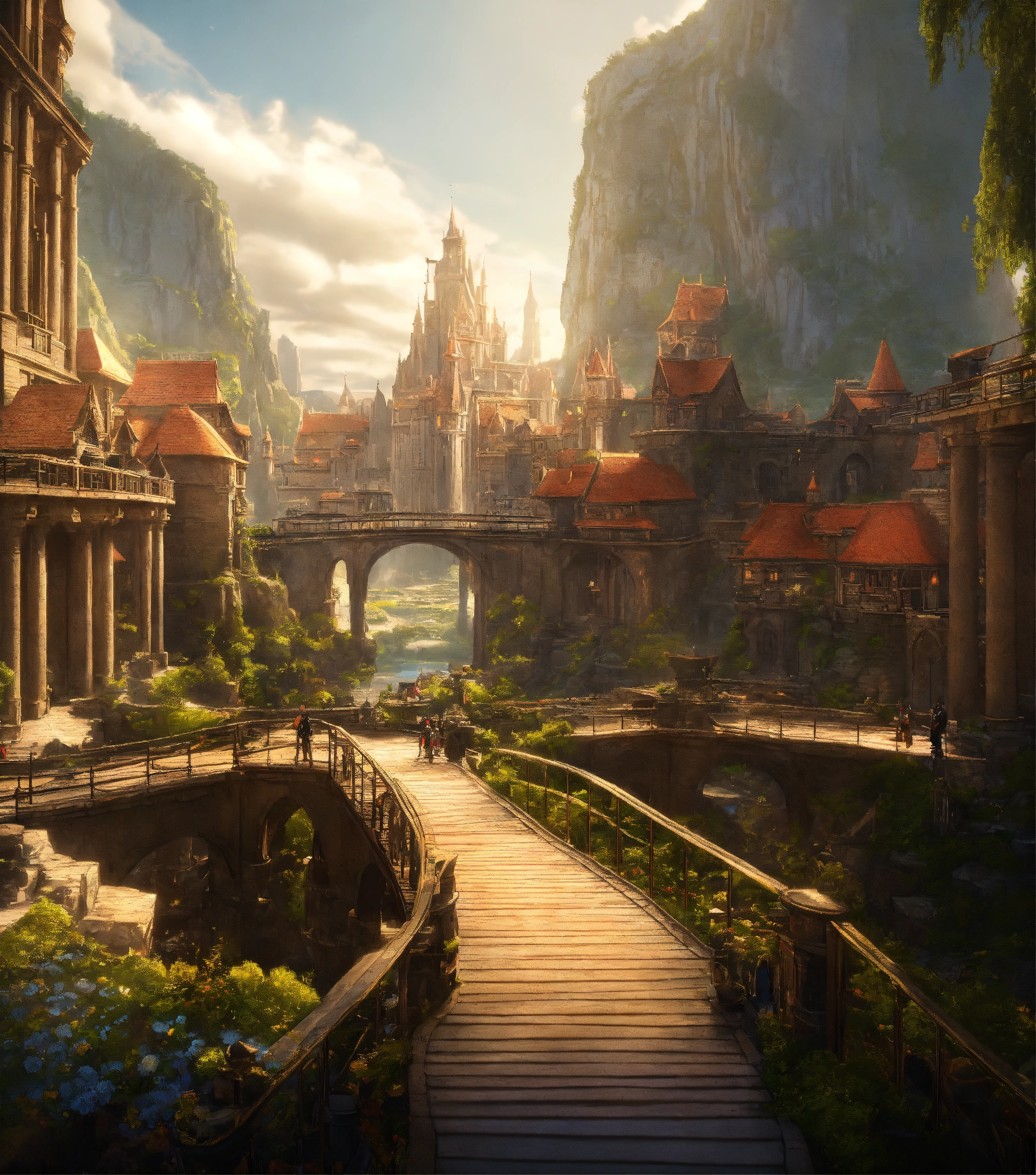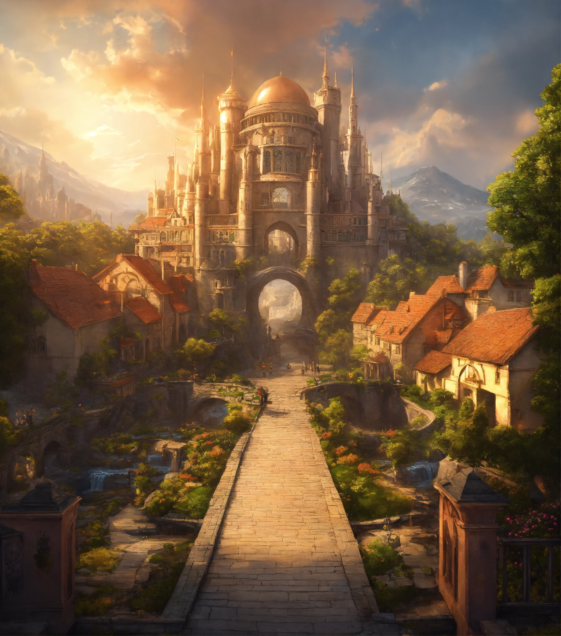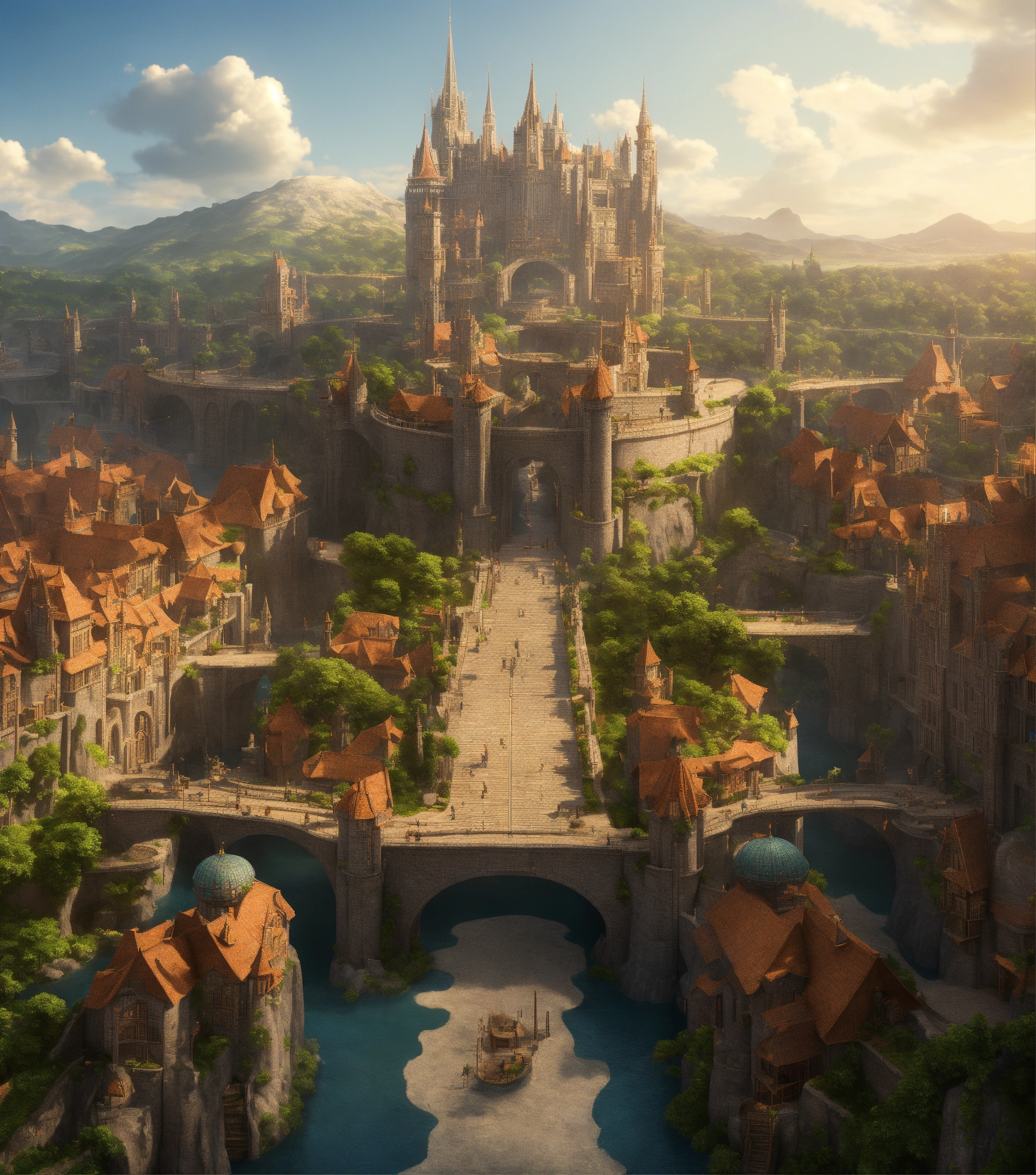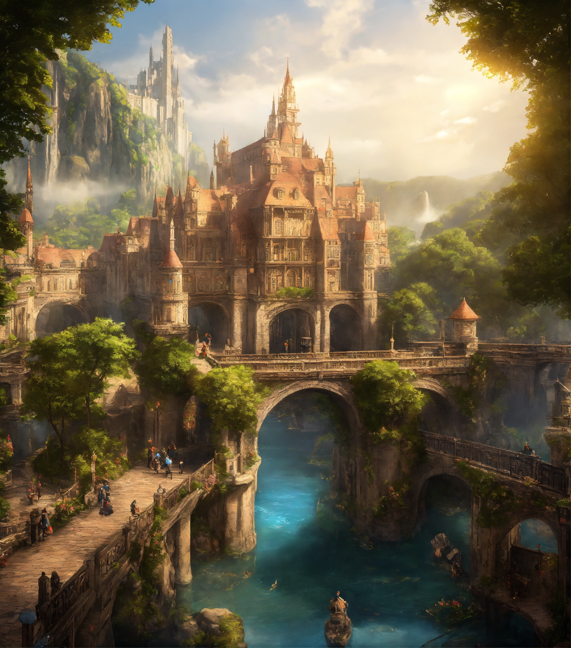 Fantasy city with a colossal academy at the center with a bridge leading up to the entrance
