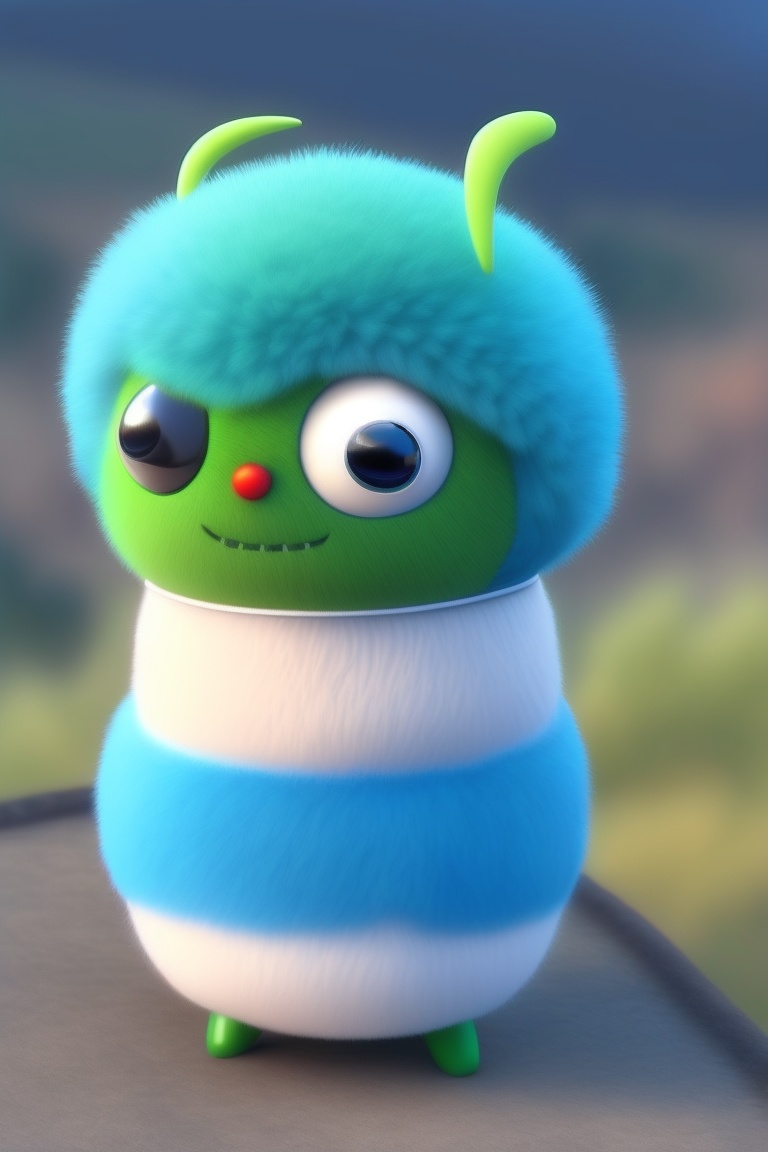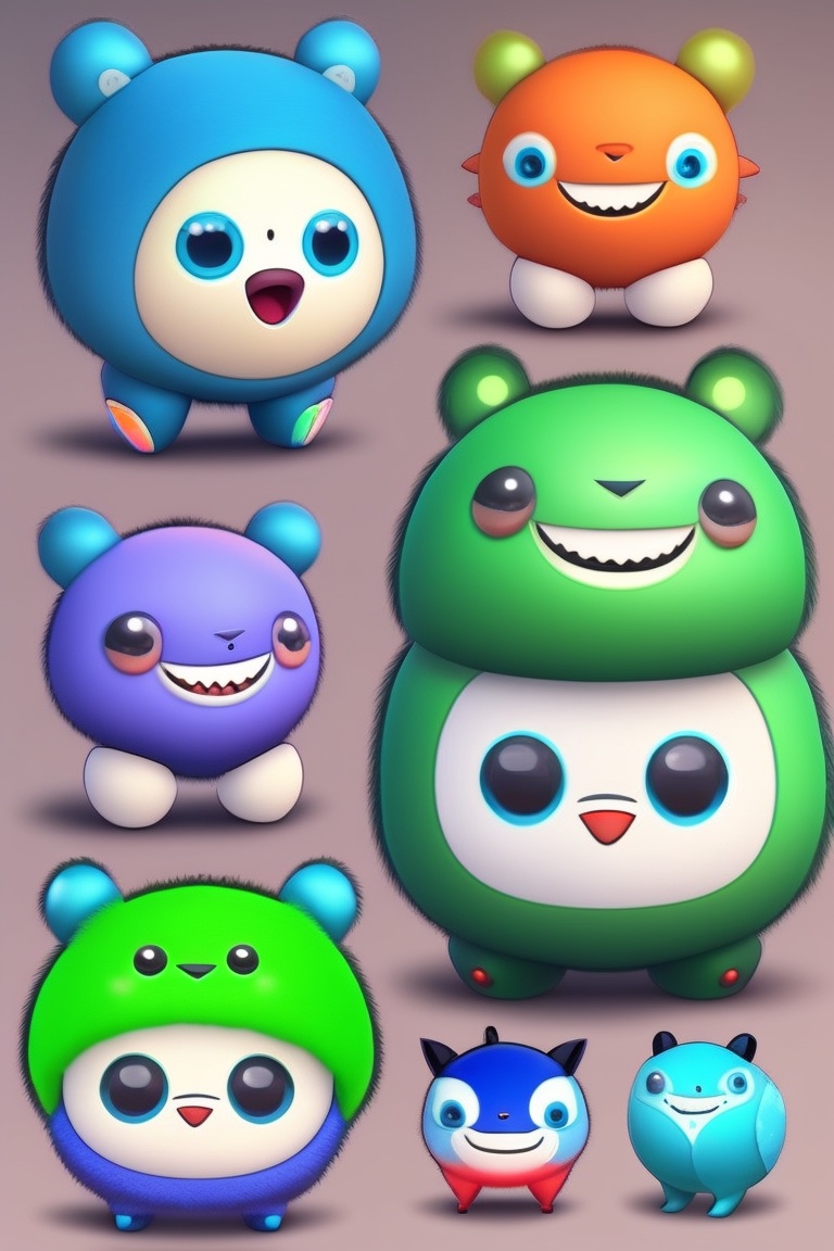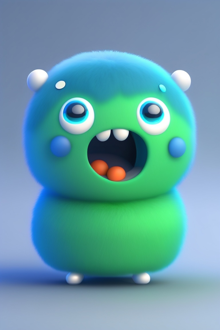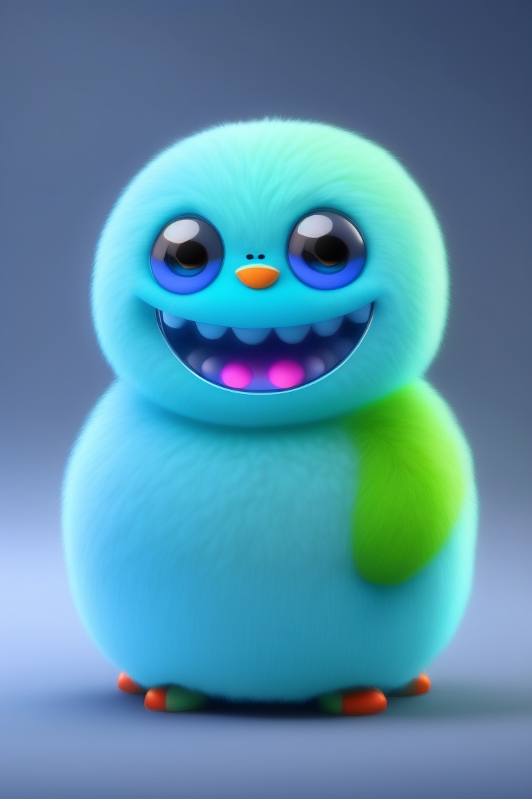 Please draw a small cartoon monster for me with blue fur, big anime-style eyes, two white fangs, a smile, a slightly open mouth, and green ears. let the shape of its body be similar to a cartoon snowman, with short limbs and a round belly. make the monster cute and friendly, with patterns on its fur, and please add bright colors to emphasize its cartoonish character.
