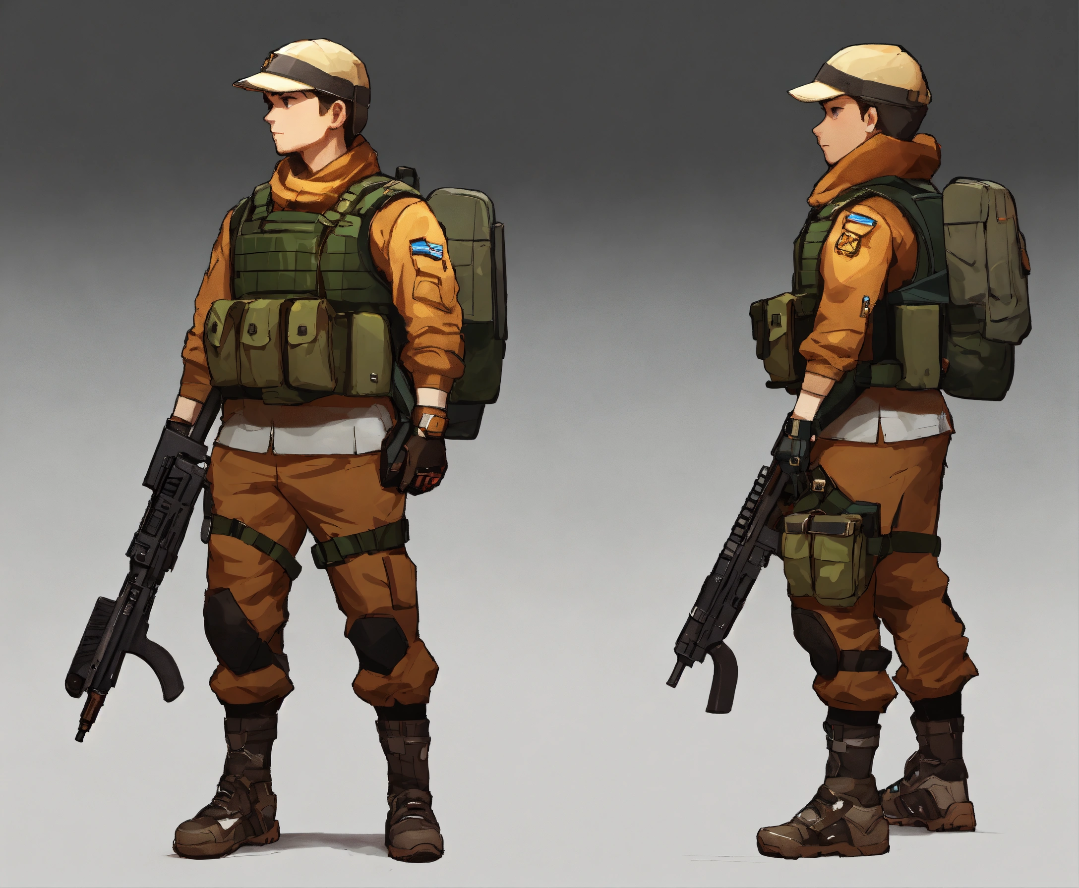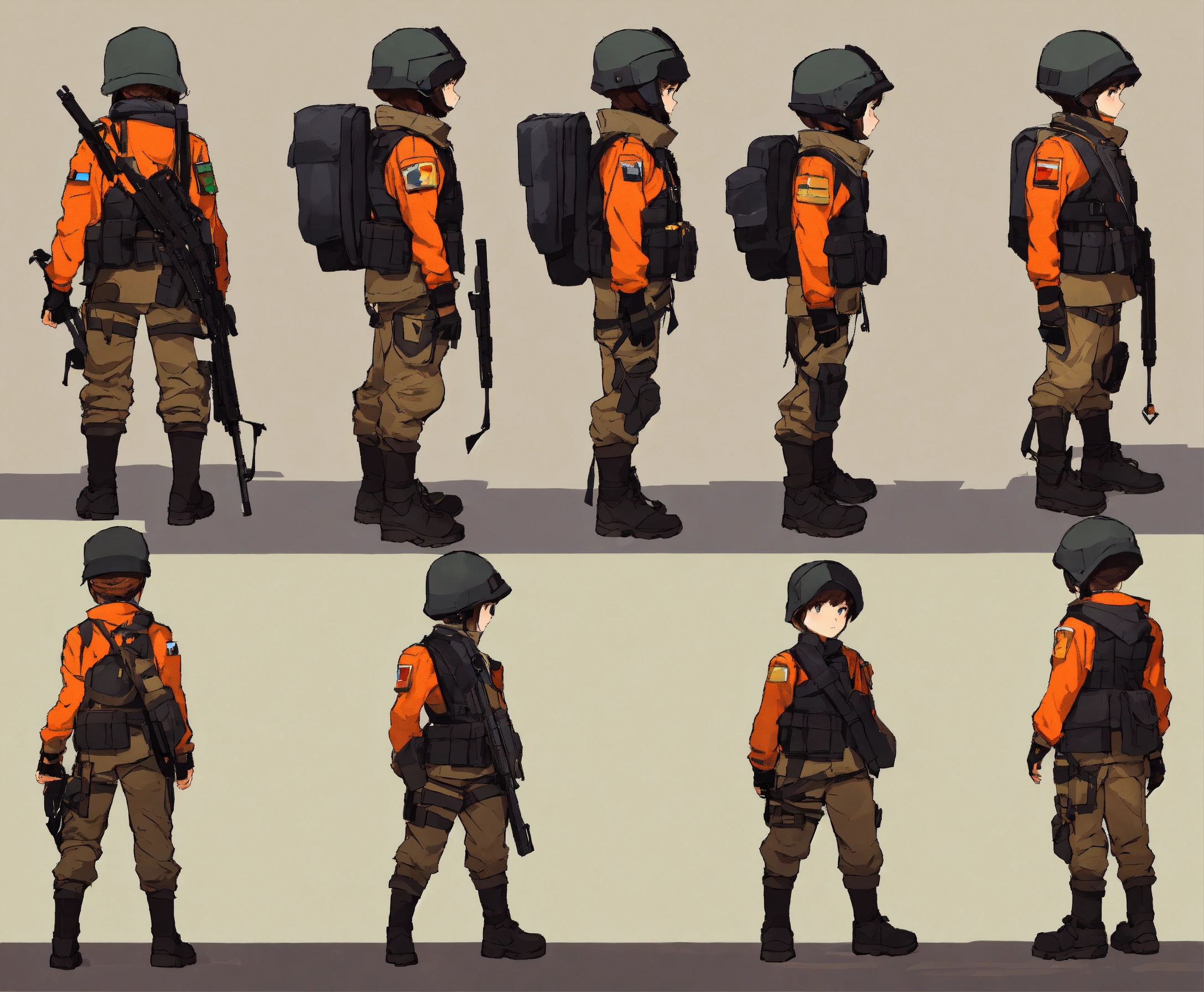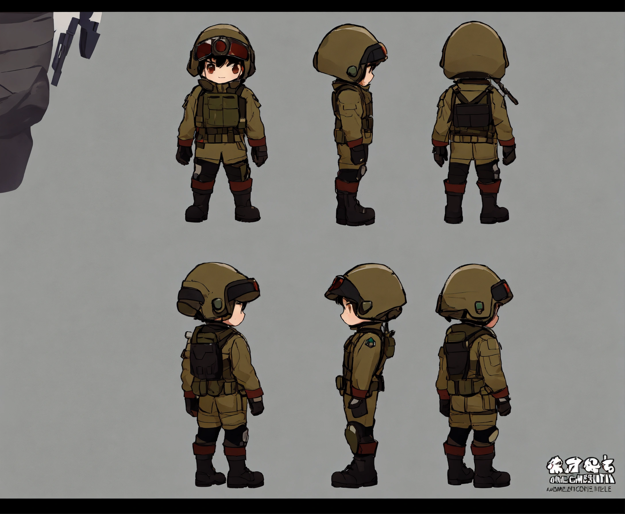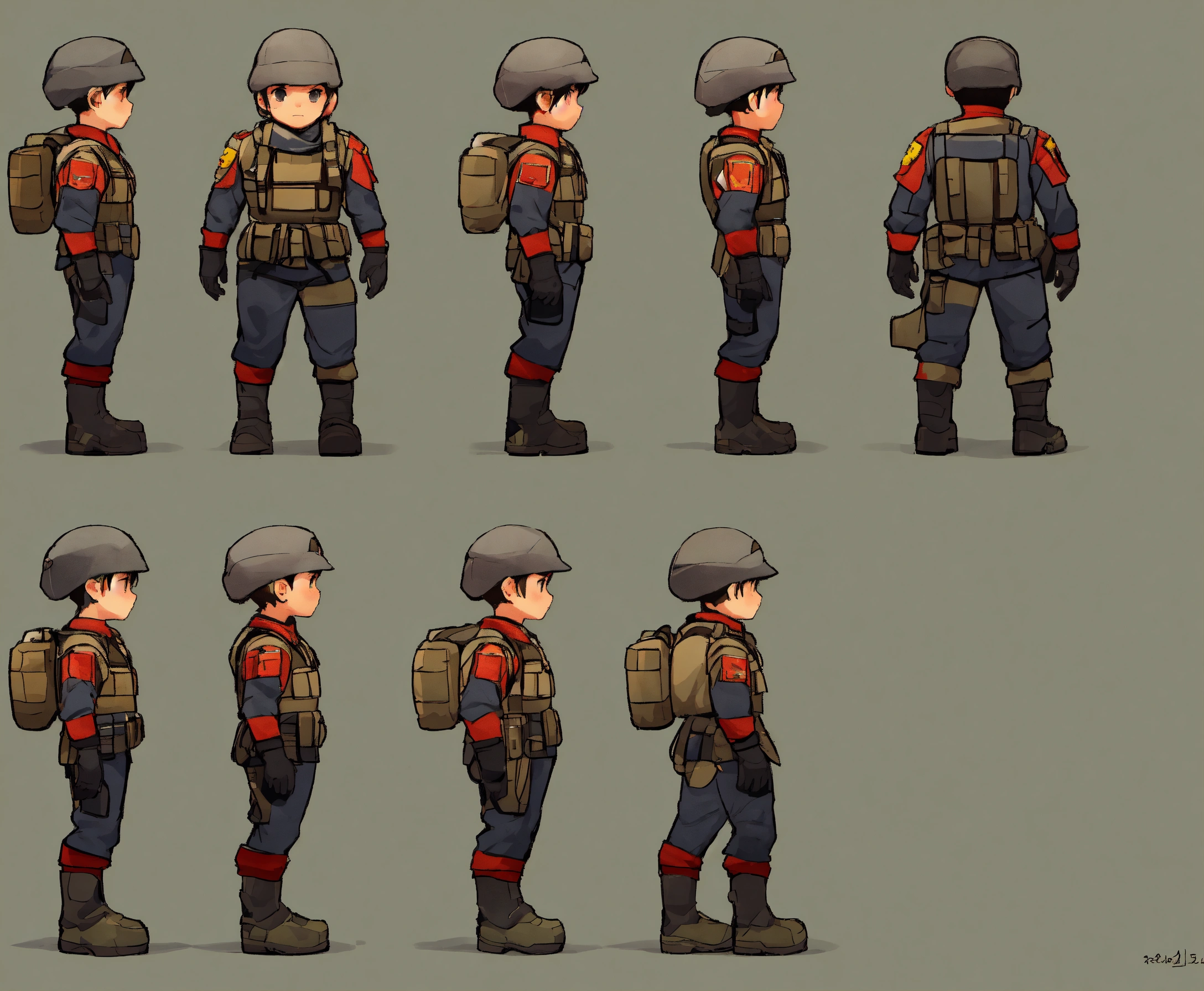 Game assets, concept art, soldier, boy, walking, full body view, side view, blank background, chibi proportions, 2.5d