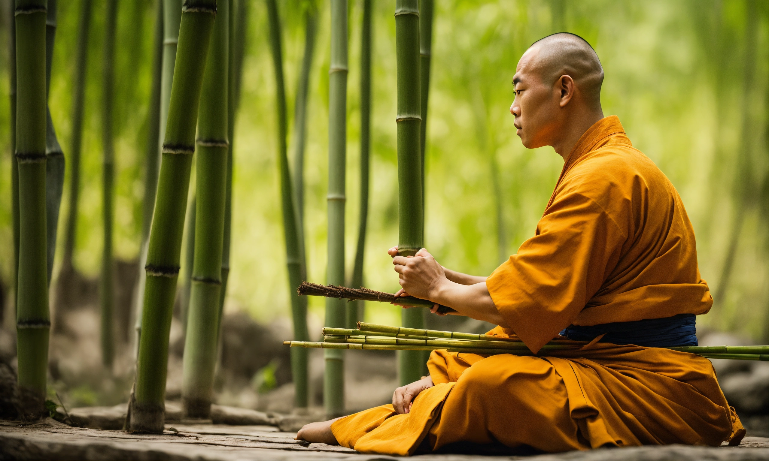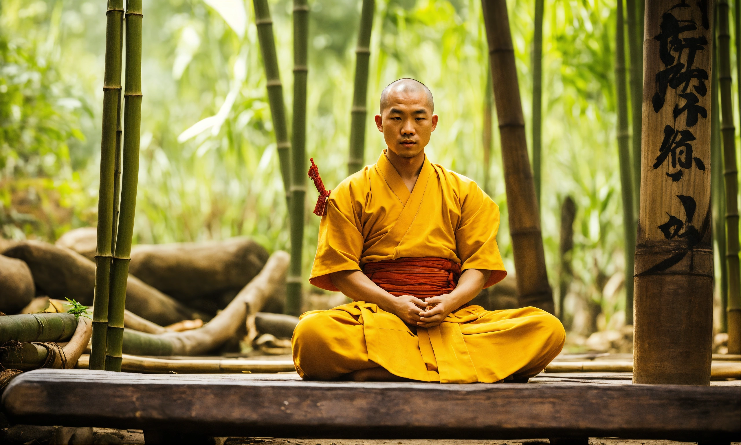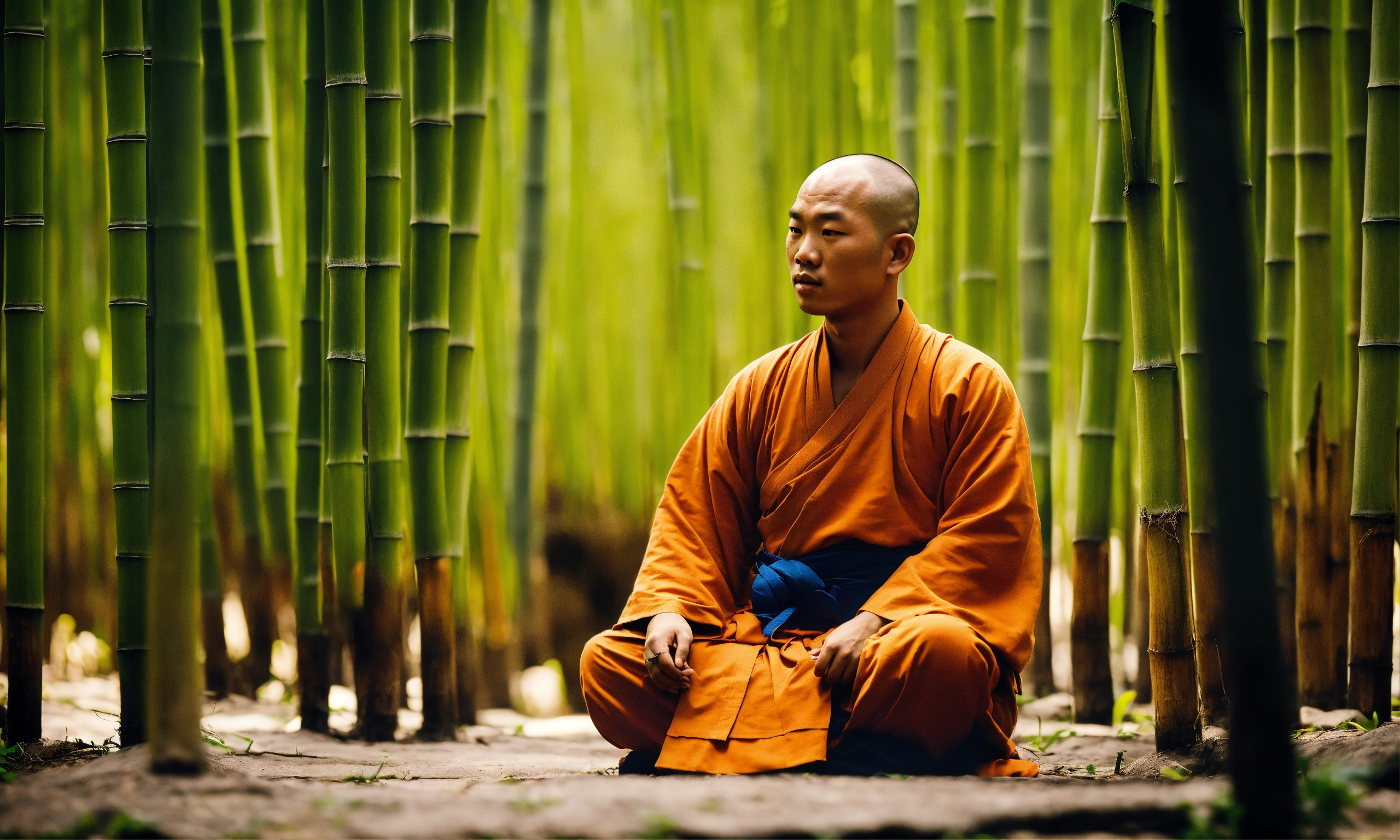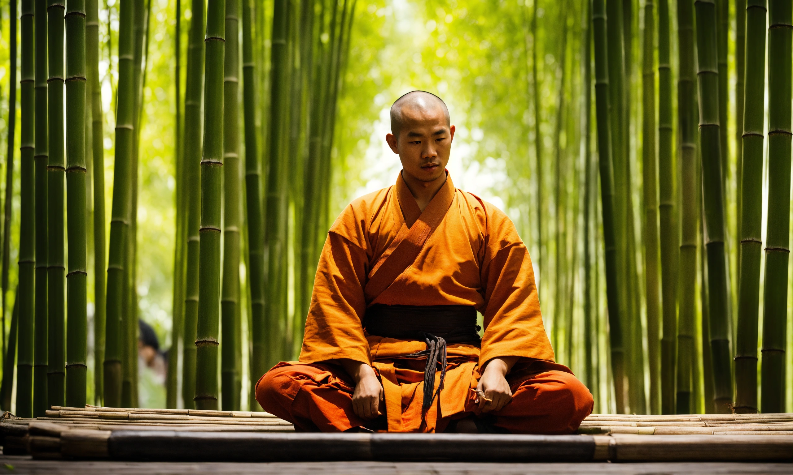 Peaceful scene featuring a shaolin monk sitting cross-legged onto a vertical bamboo stalk