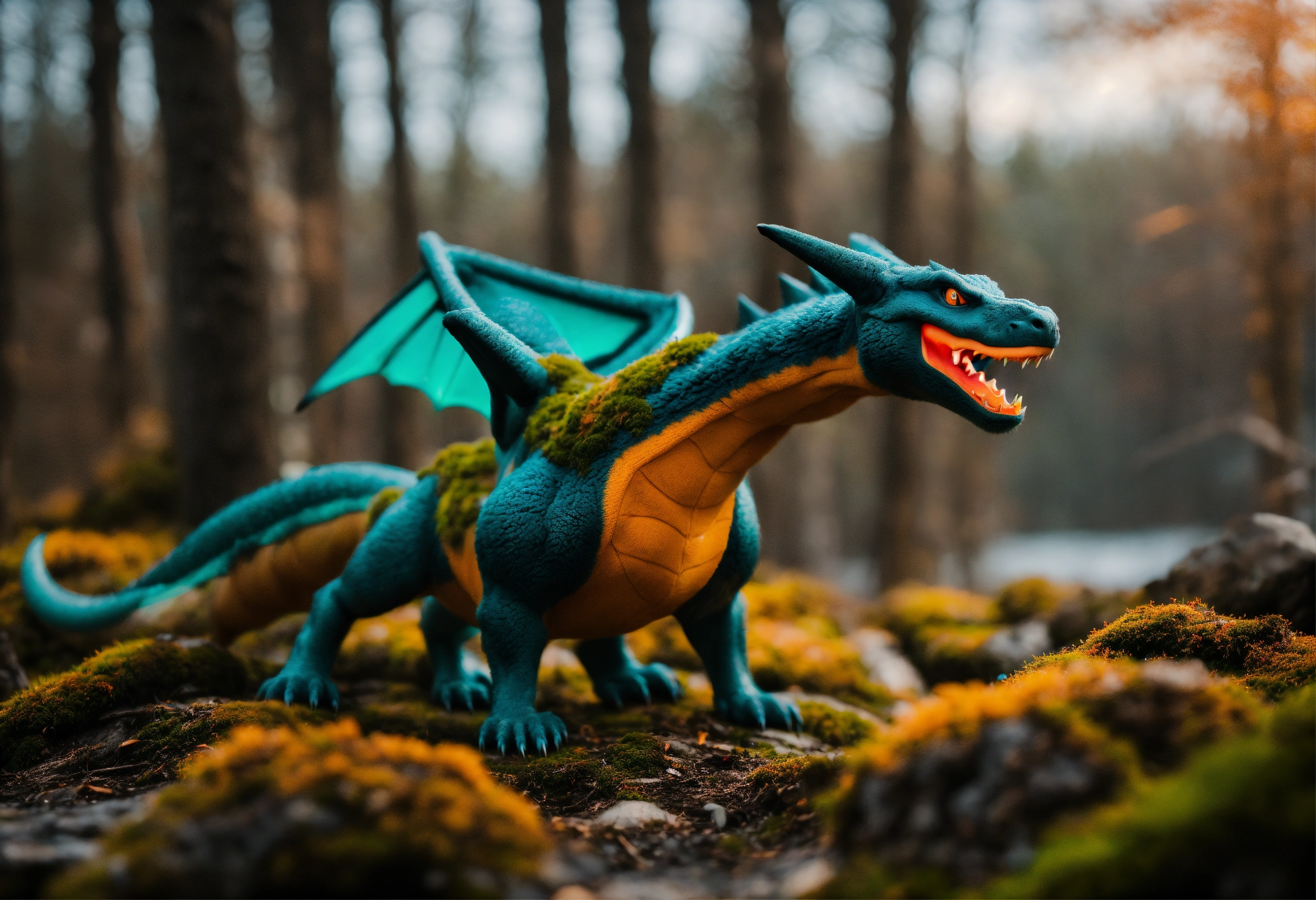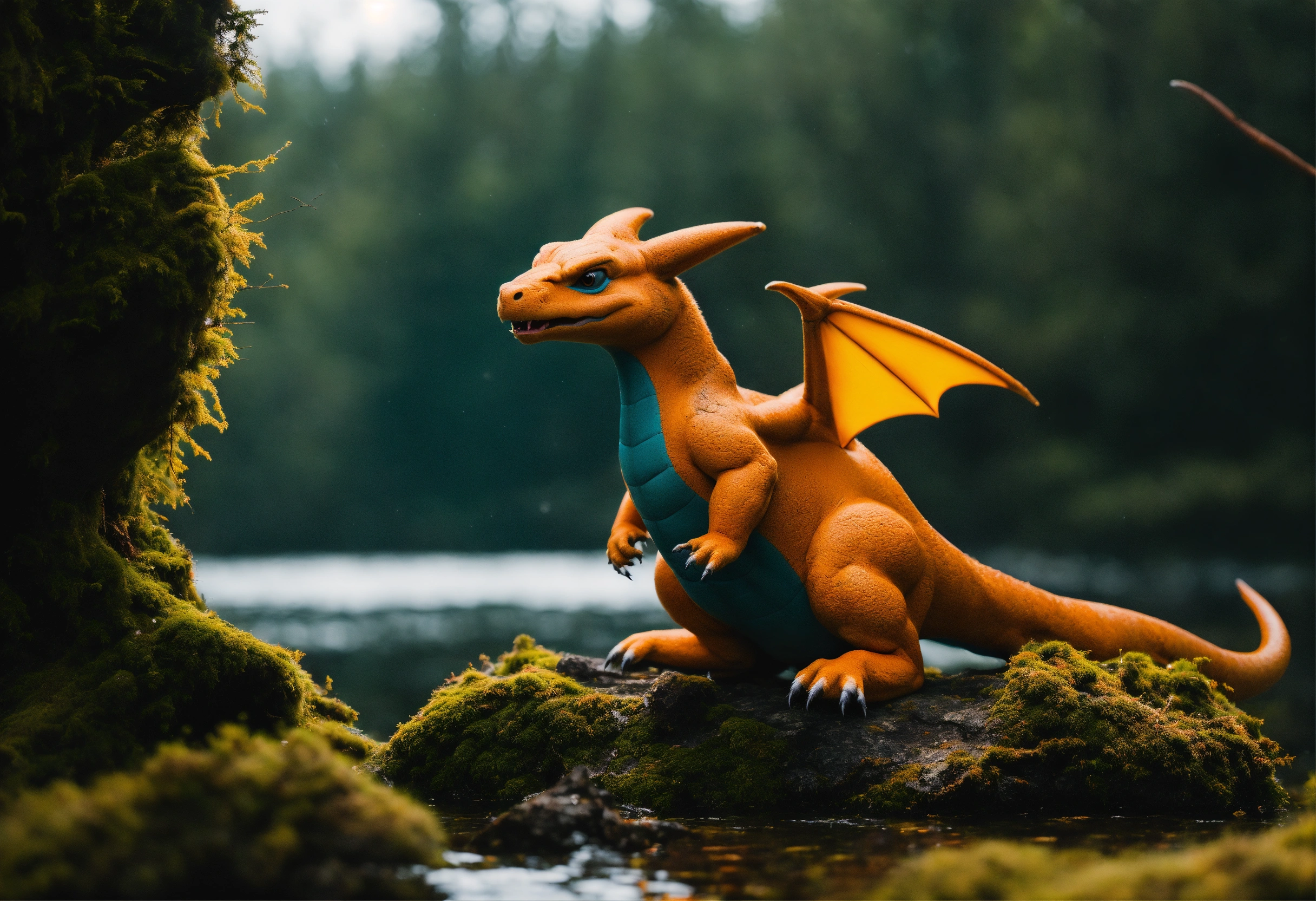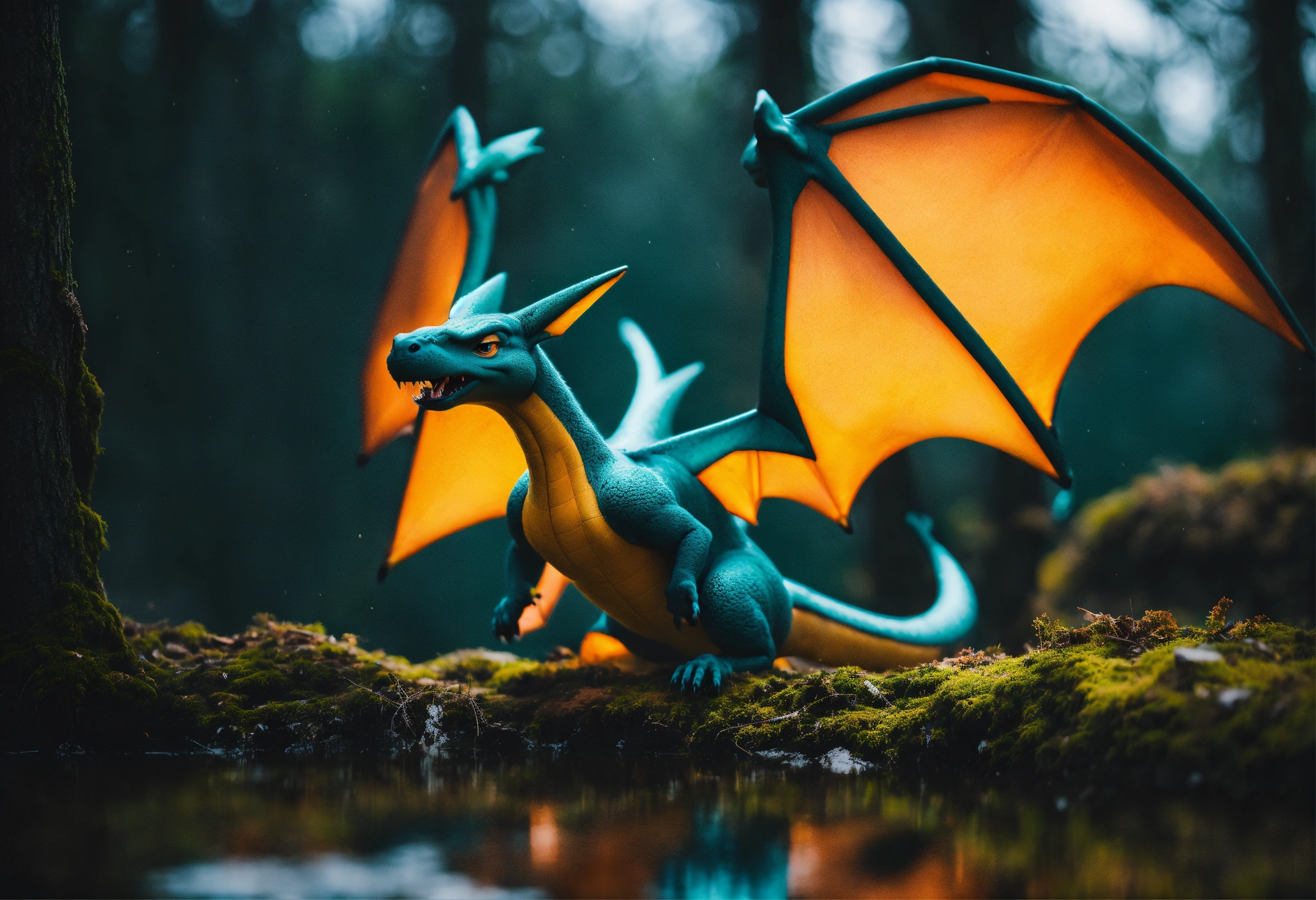 Minimal, cinematic, a realistic charizard animal among the trees, forest lake, moss, cold weather, dark teal and amber, sony a7 iv