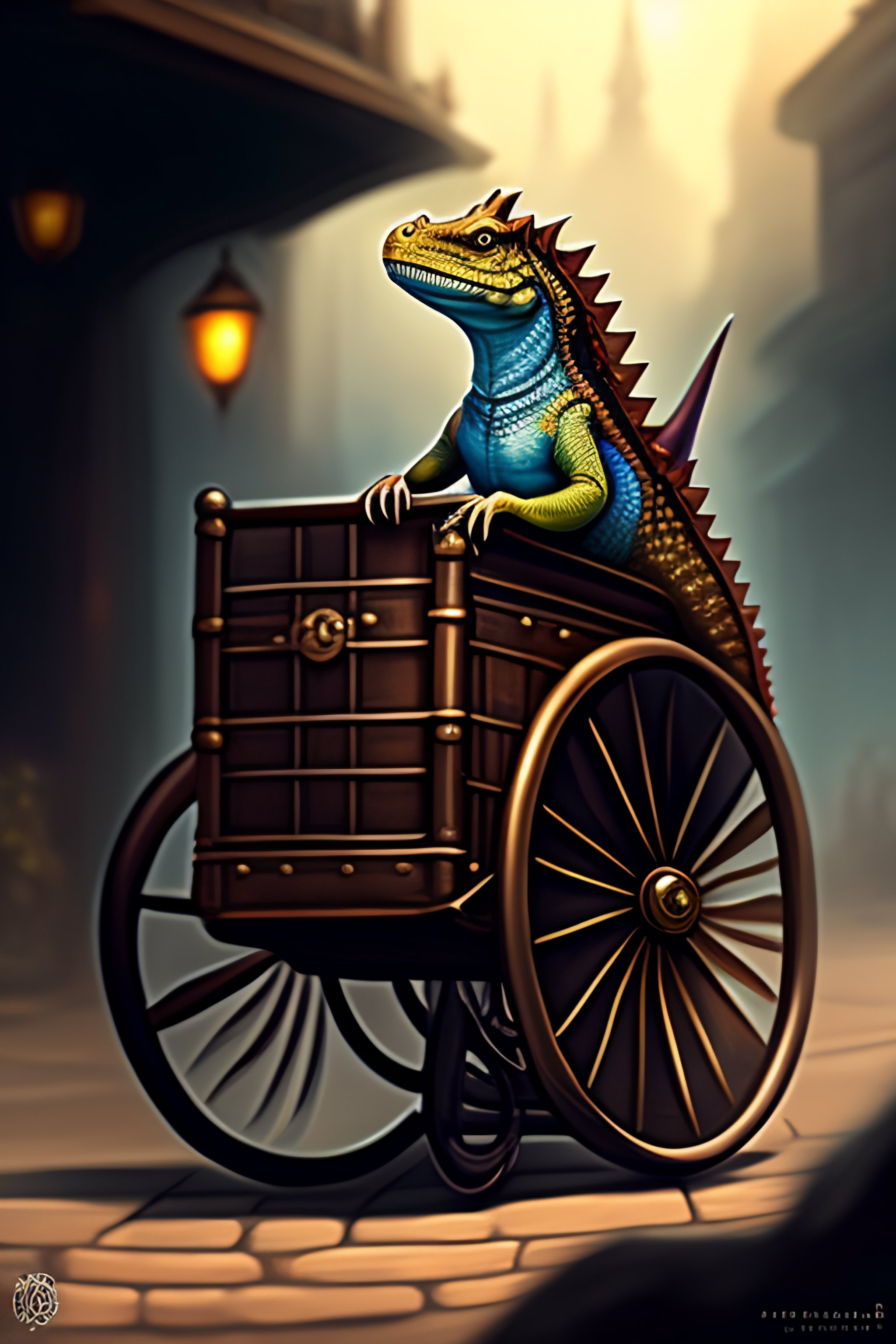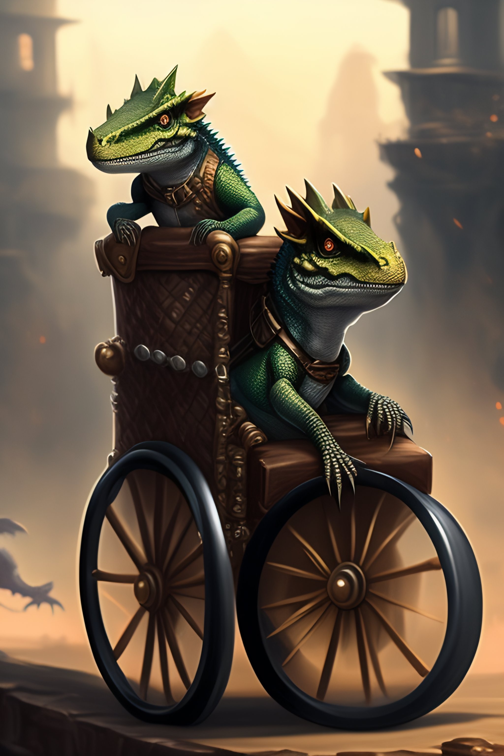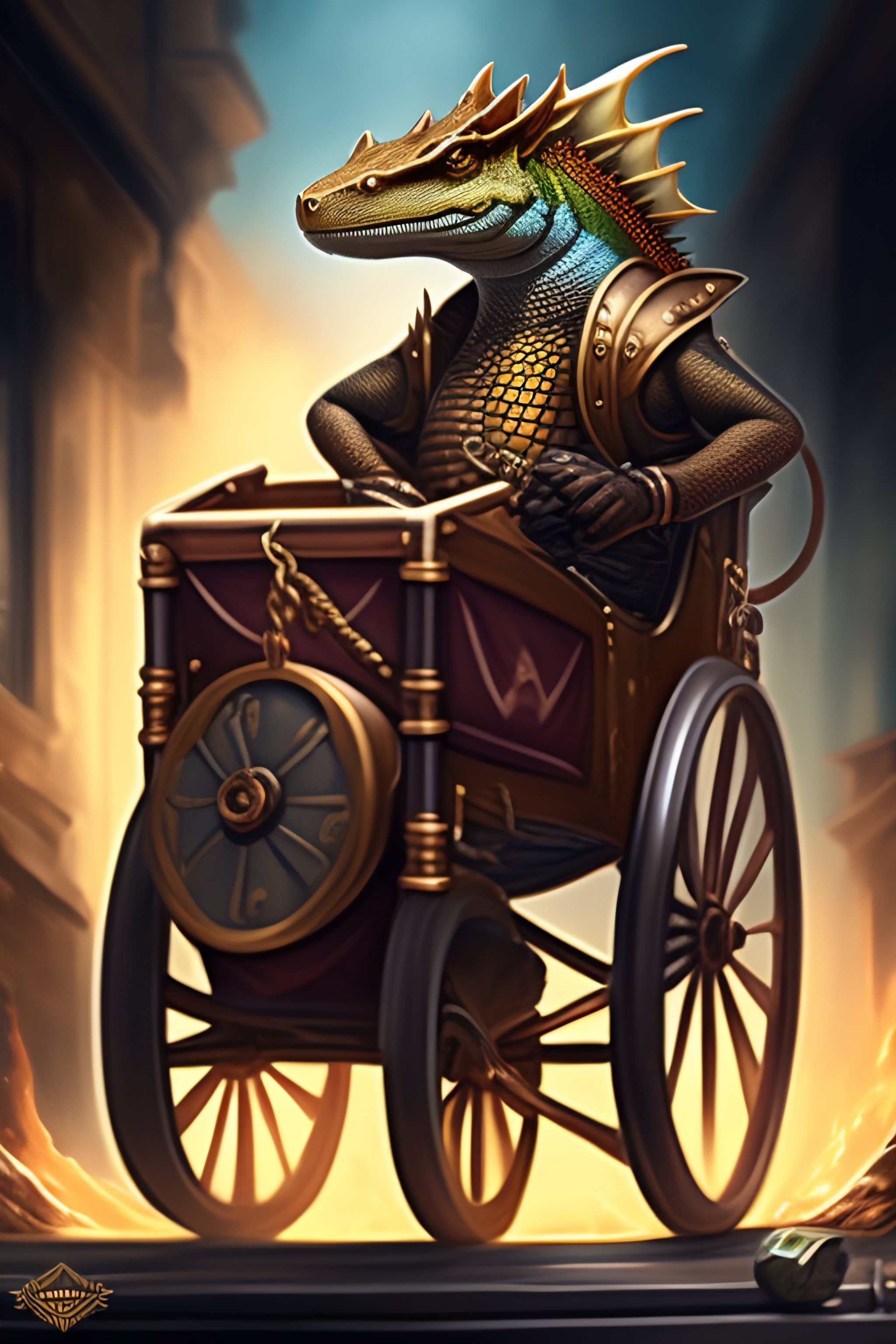 Dnd lizardfolk in a steampunk wheelchair about to throw a bomb
