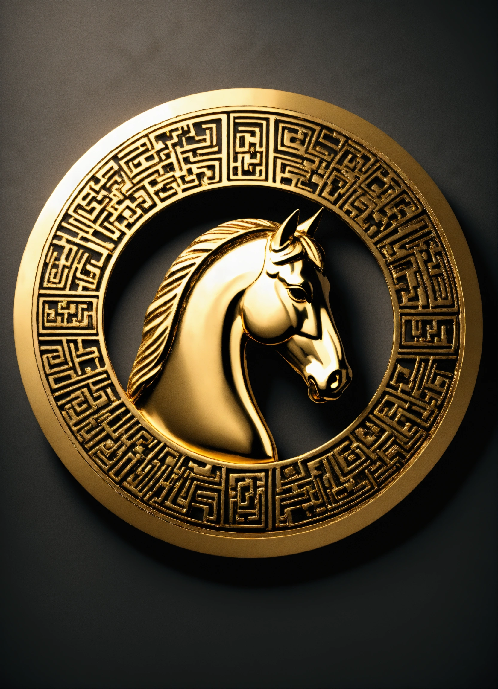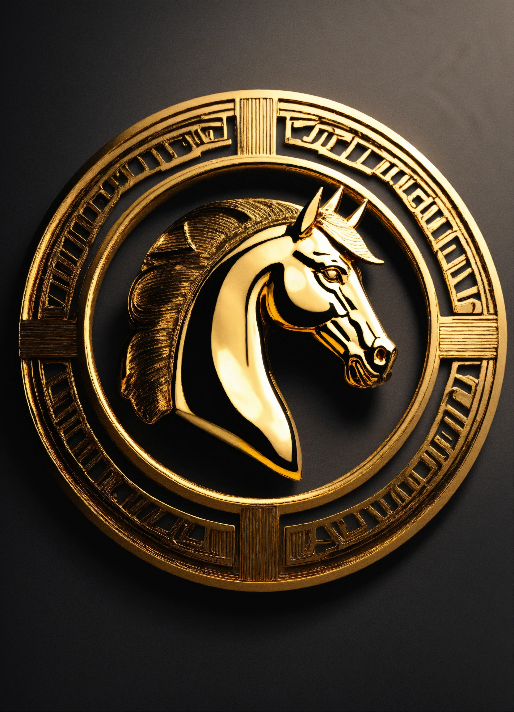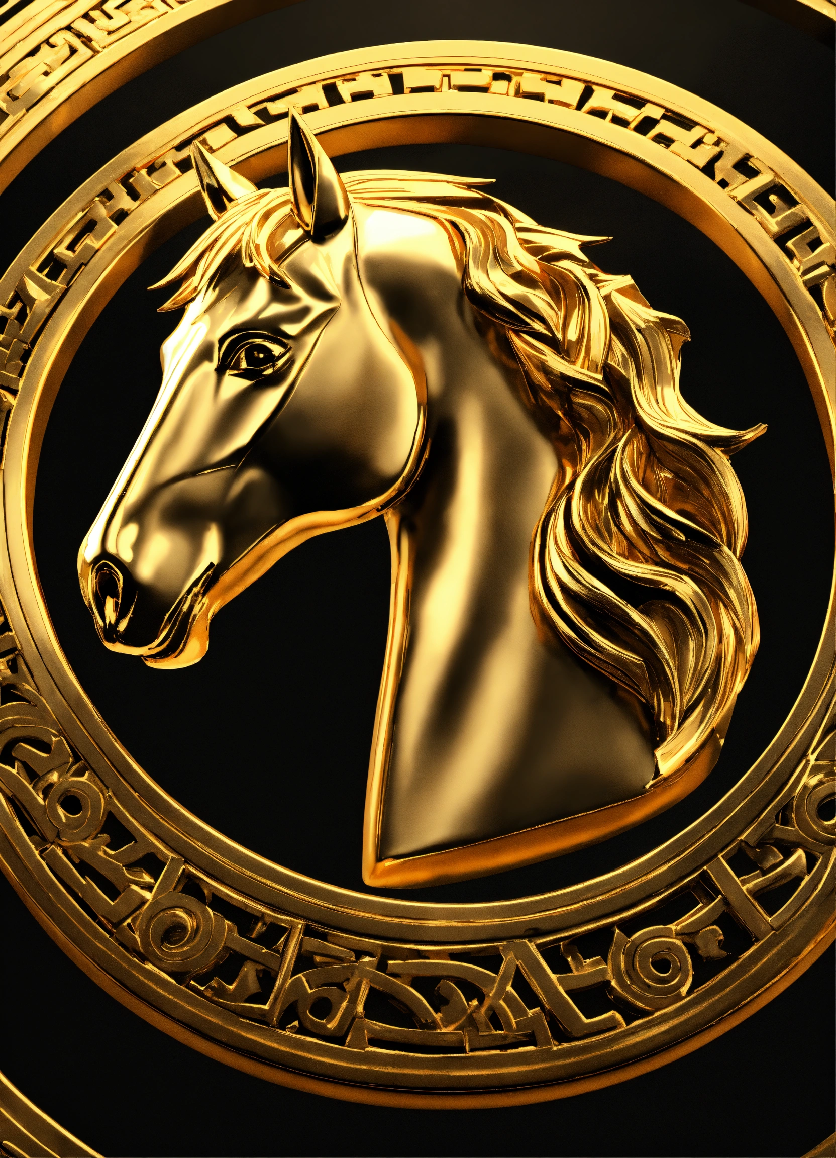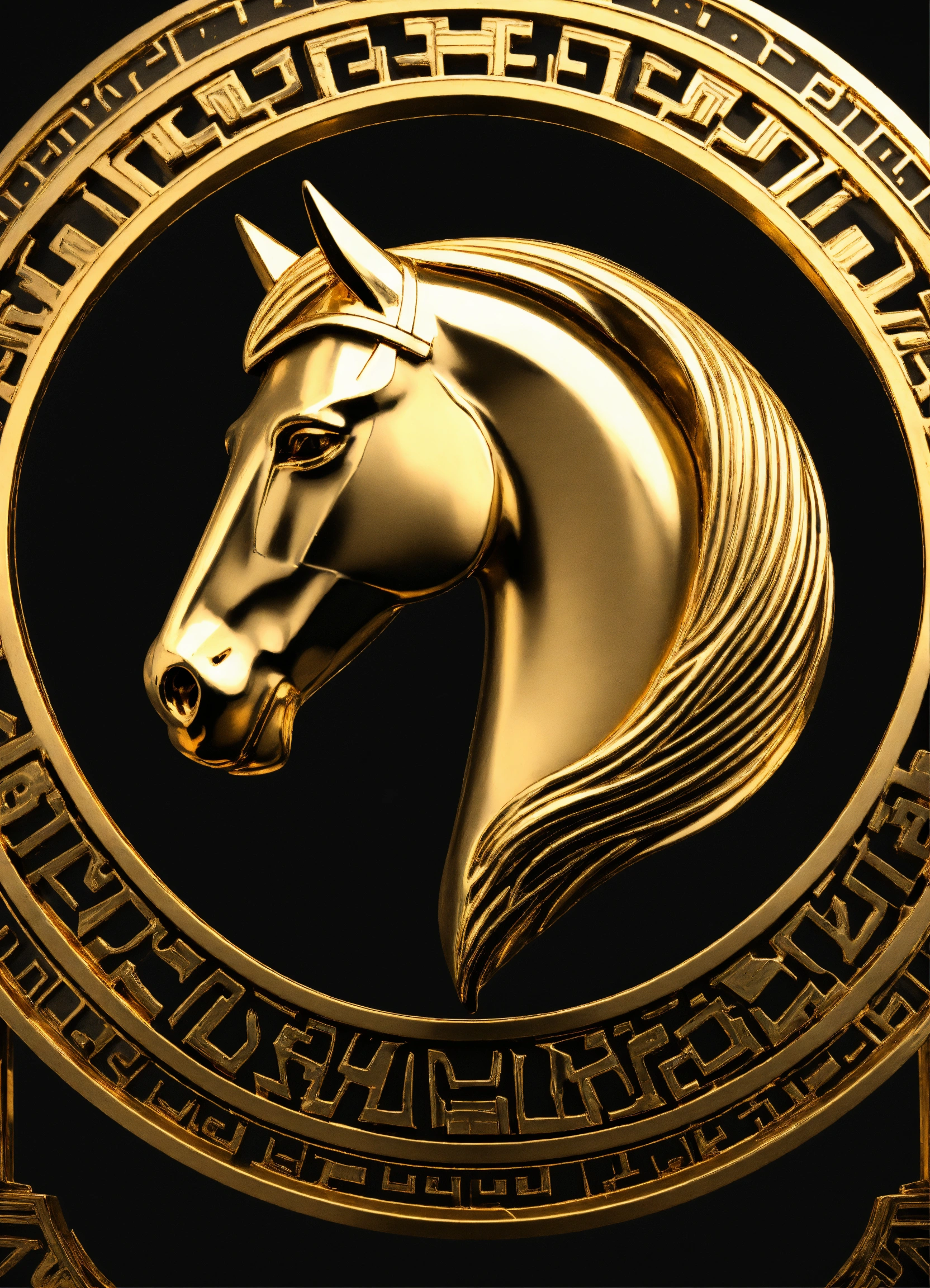 A golden metal horse head for a logo, contained within a metal circle with greek meander pattern, full shot, plain black background suitable for a png, unreal engine render, 8k
