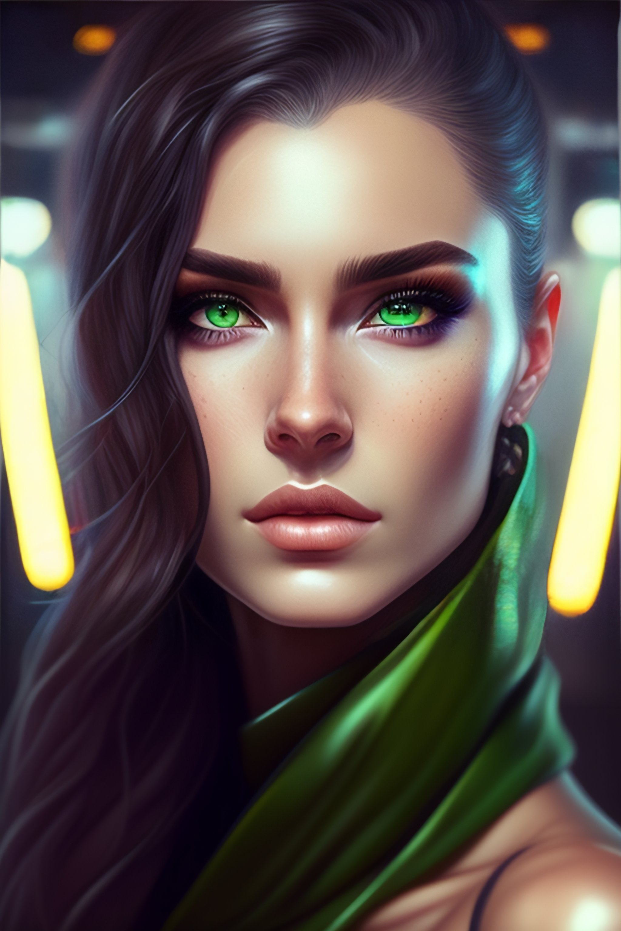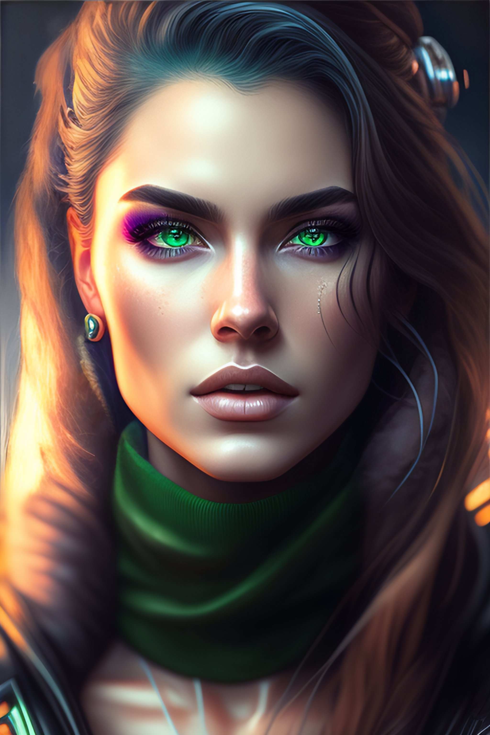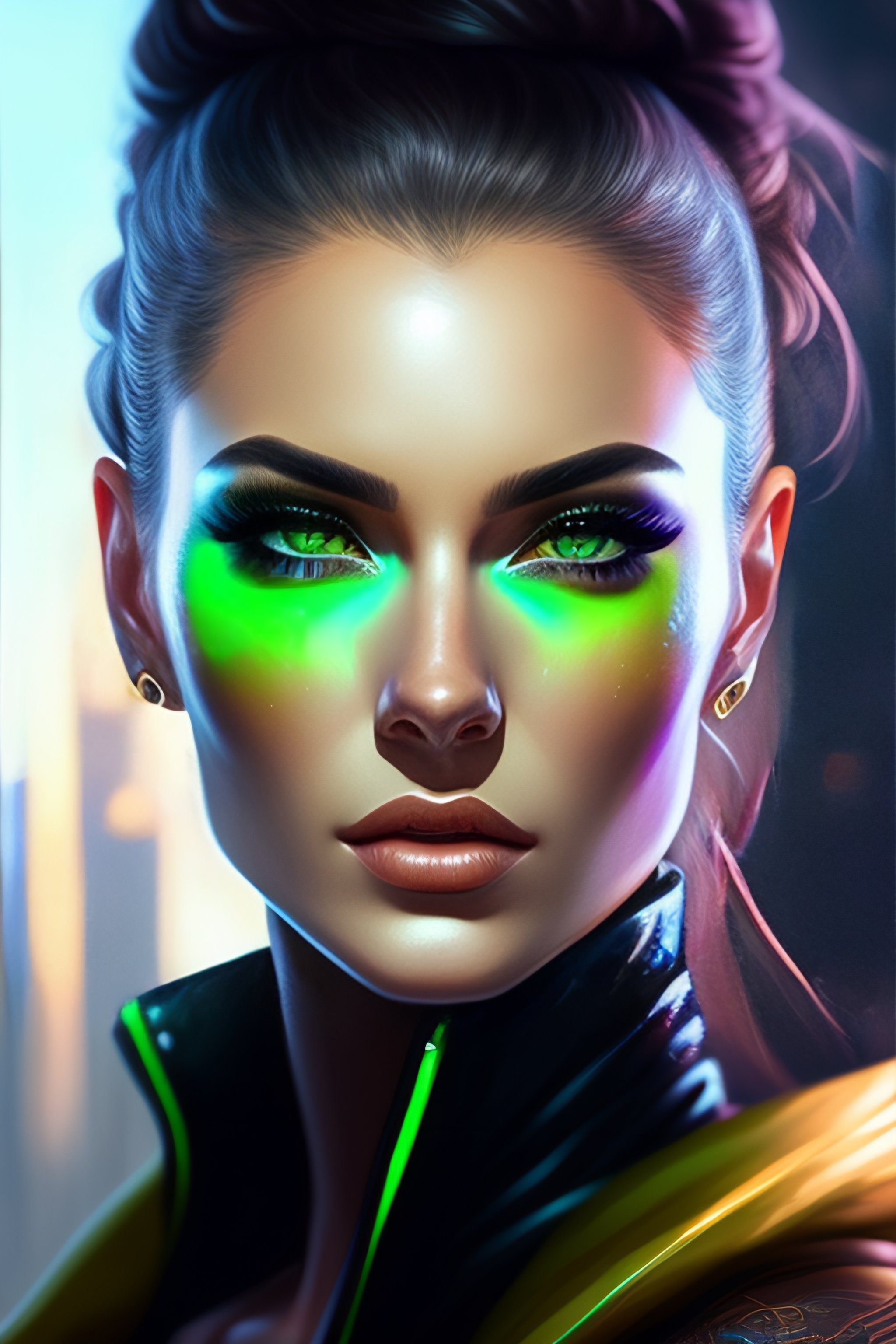 Beautiful, caucasian, woman, extremely detailed angry face, green eyes, looks realistic, hyper-detailed portrait, cyberpunk aesthetic, synthwave, sci-fi, ninchaku, artist artgerm i and wlop