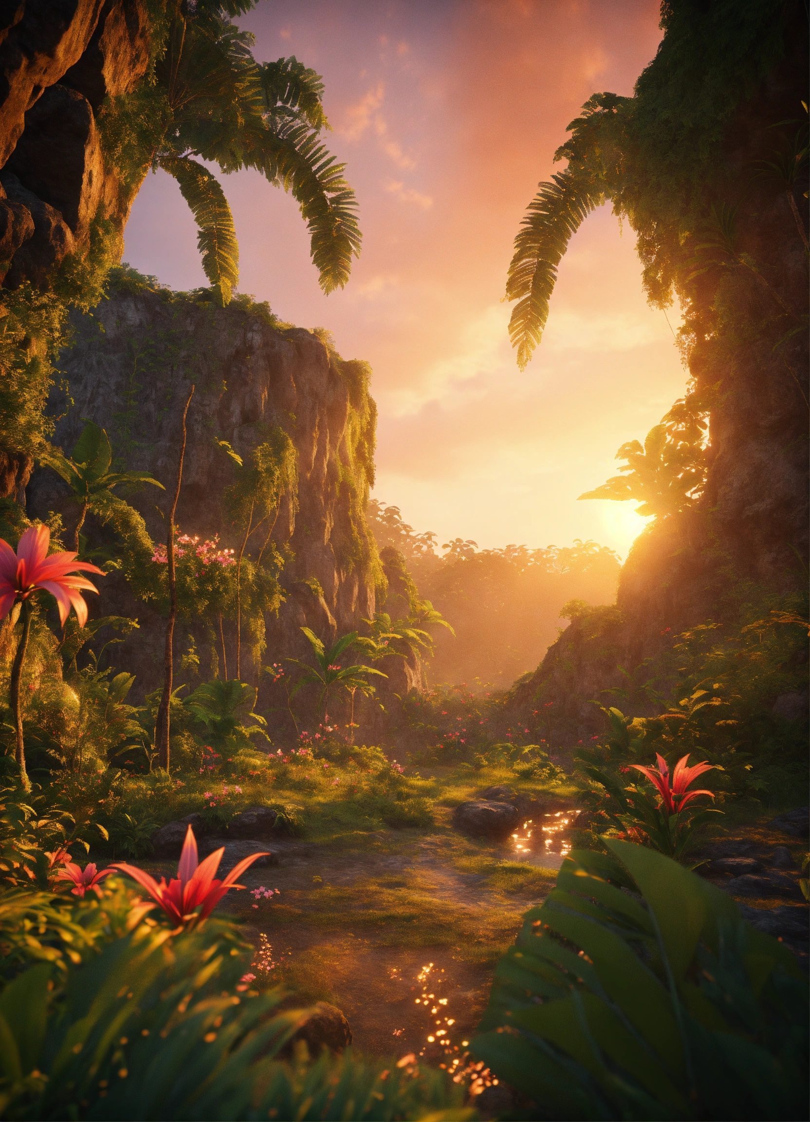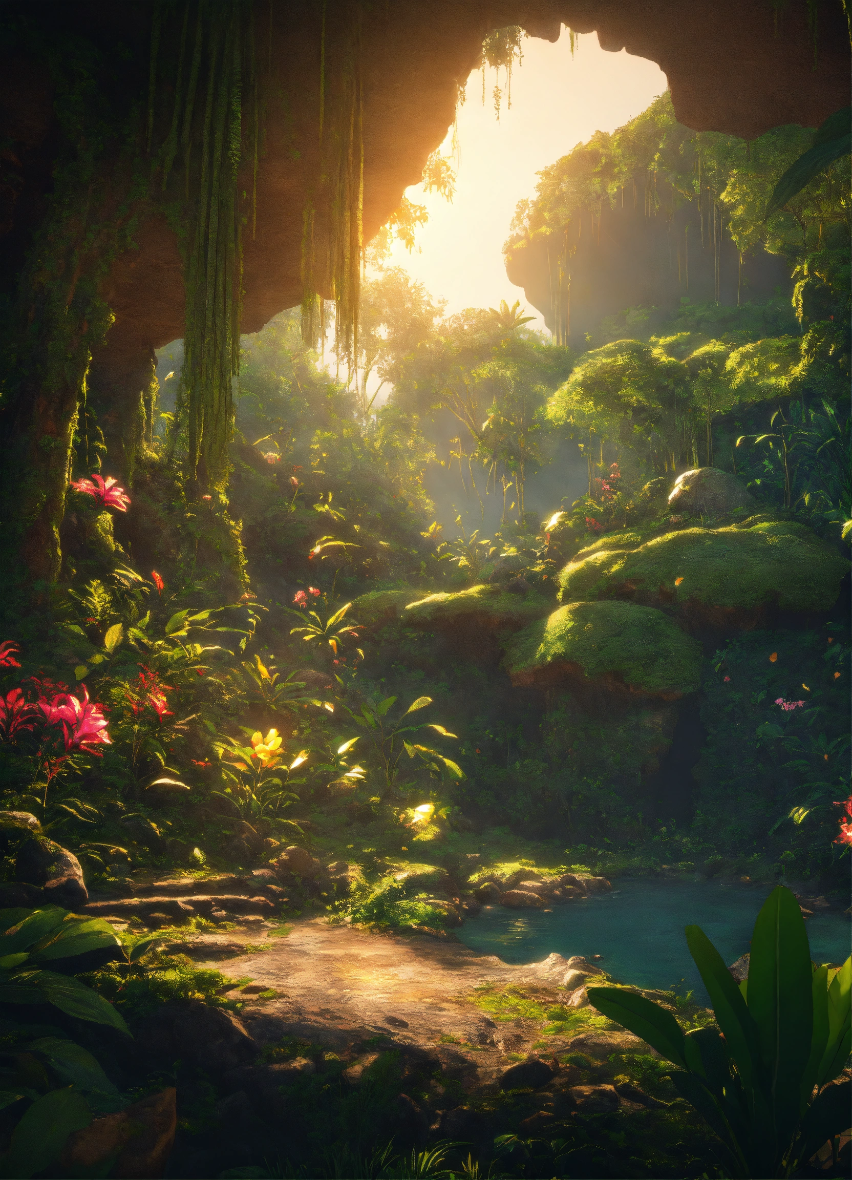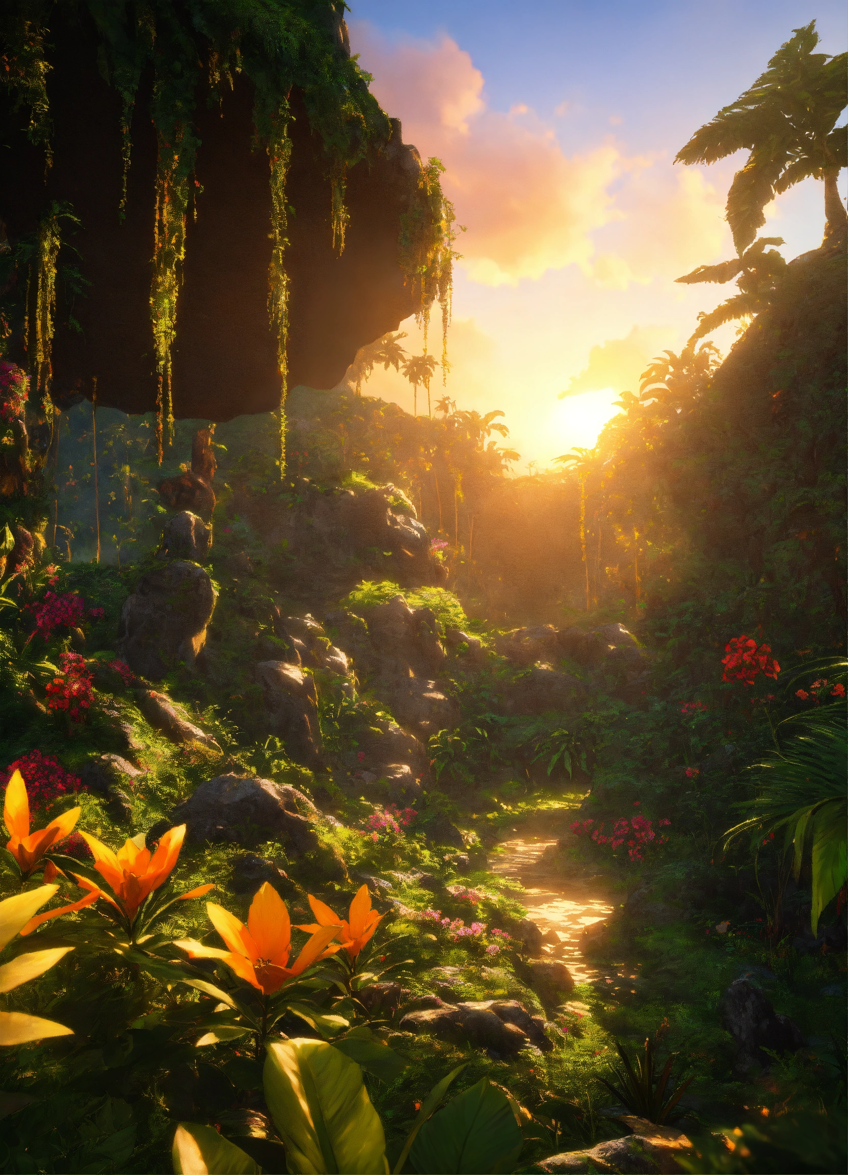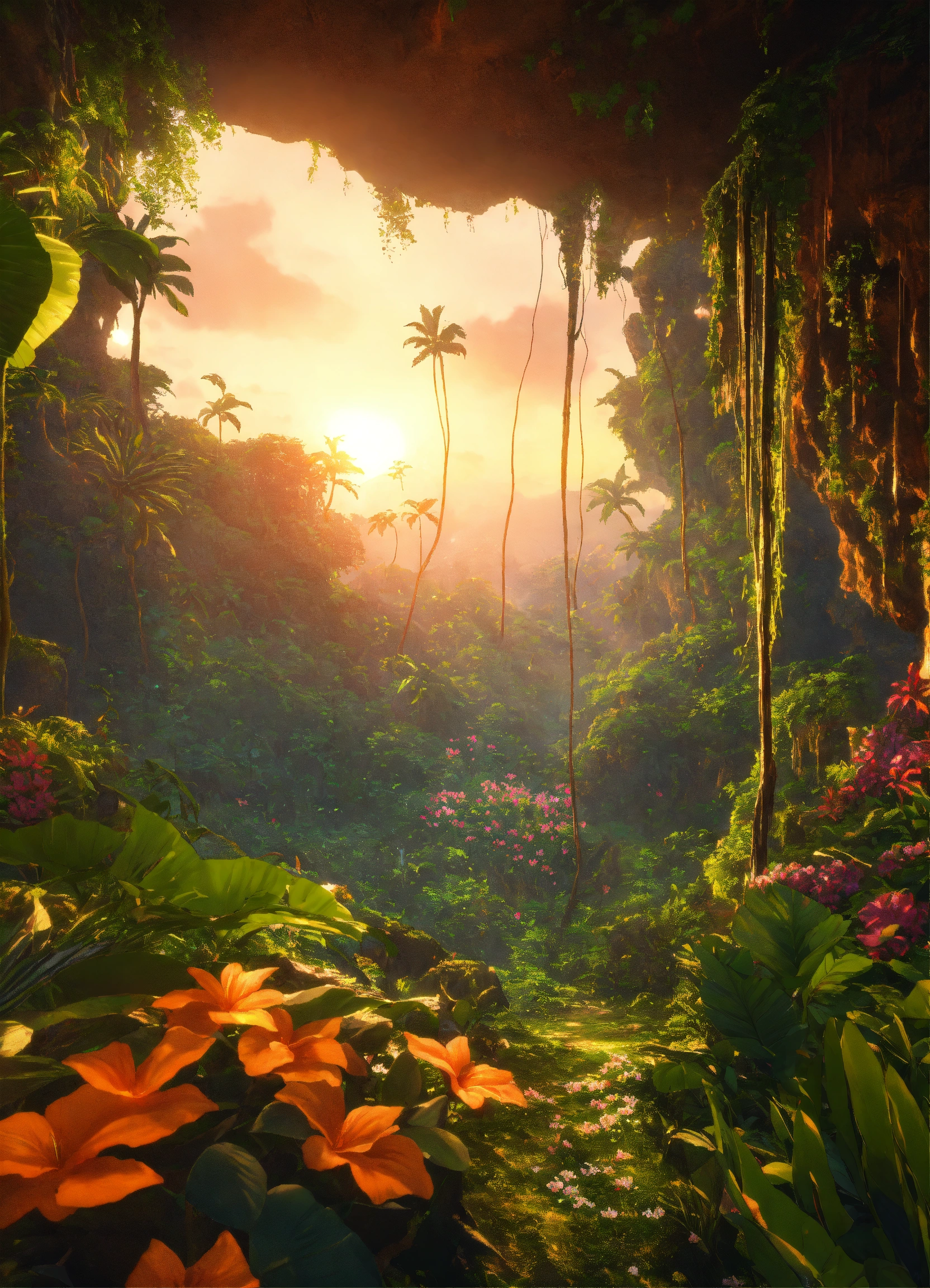 Dense tropical jungle, caves, tropical flowers, lush green grass, mythical creatures, hyper detailed 8k, unreal engine, soft golden sunset.