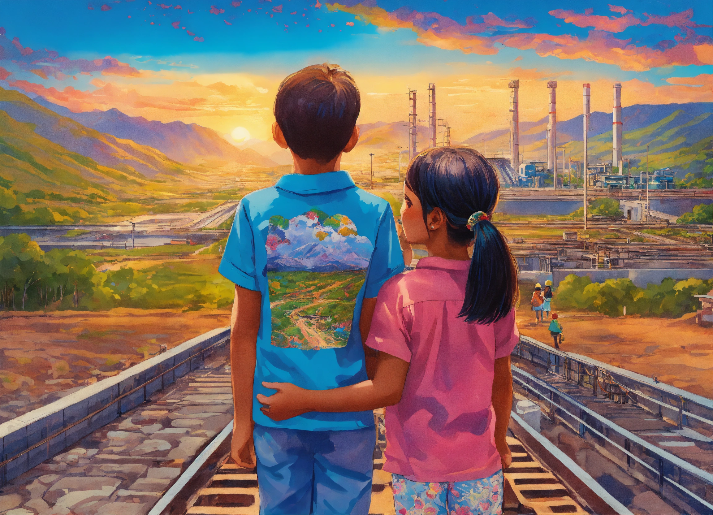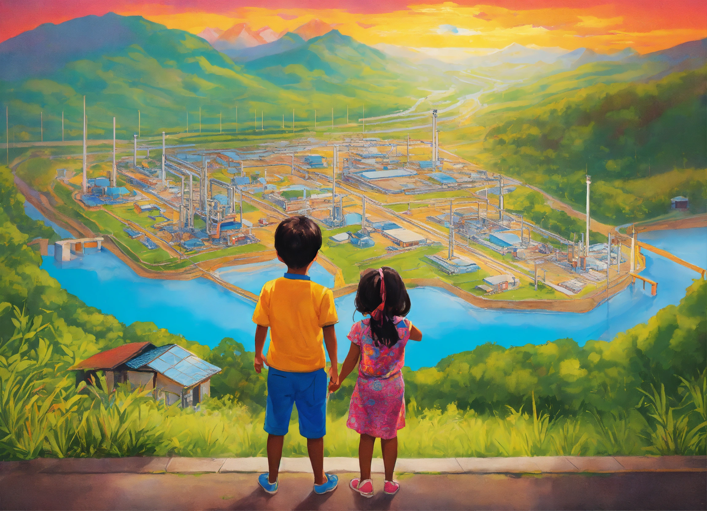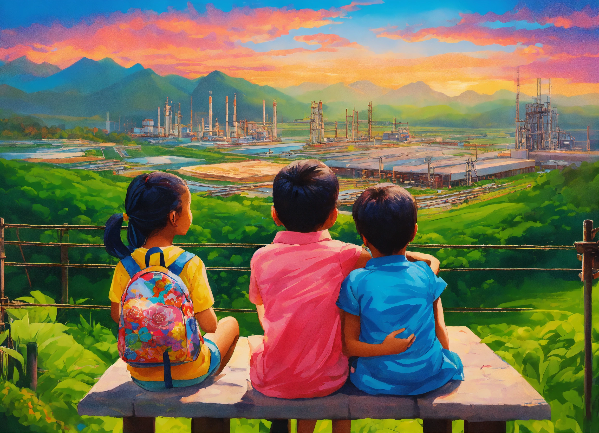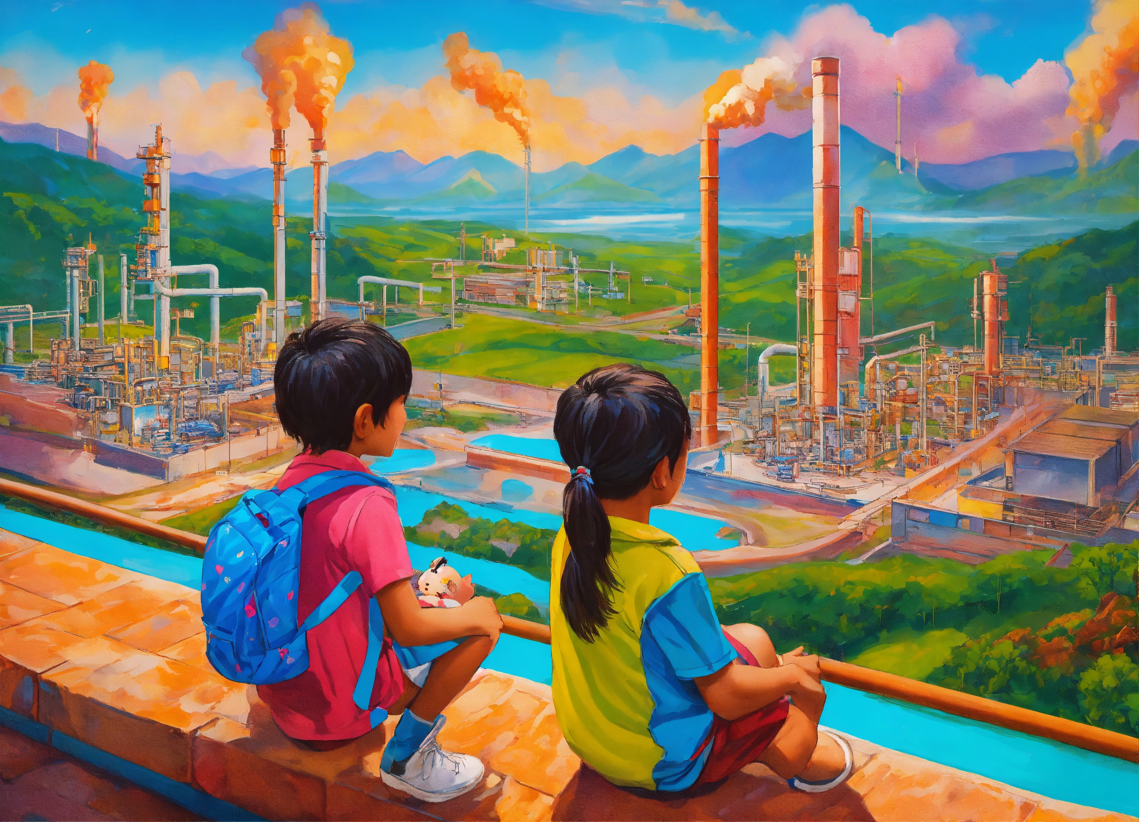 2 children, man and woman, indonesian faces, pointing at something, backs to camera, background of modern gas infrastructure, reservoirs, elevated toll road infrastructure, mountains, by lisa frank