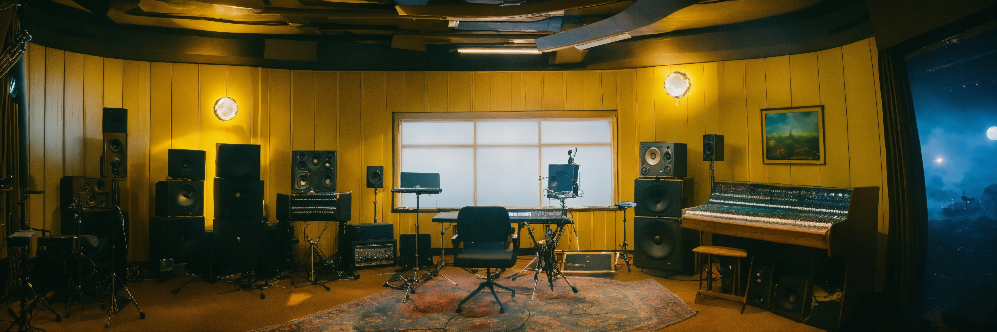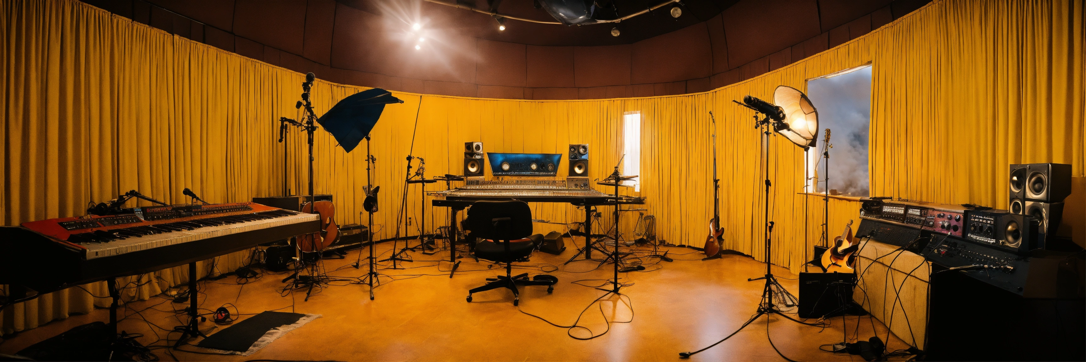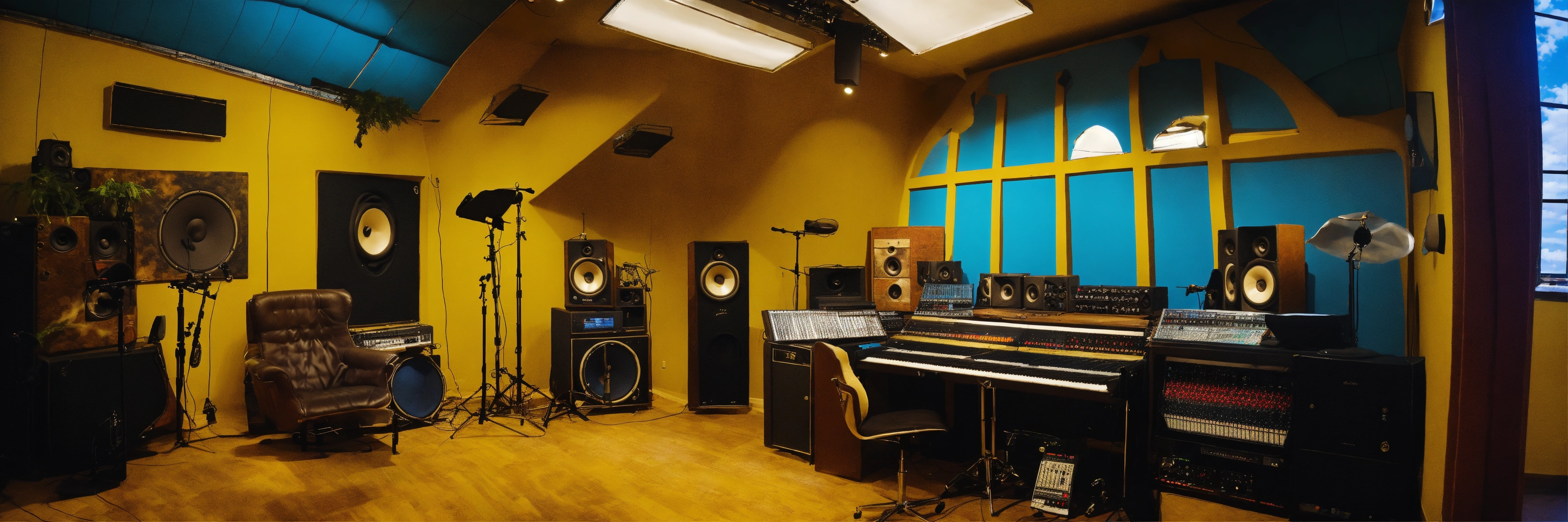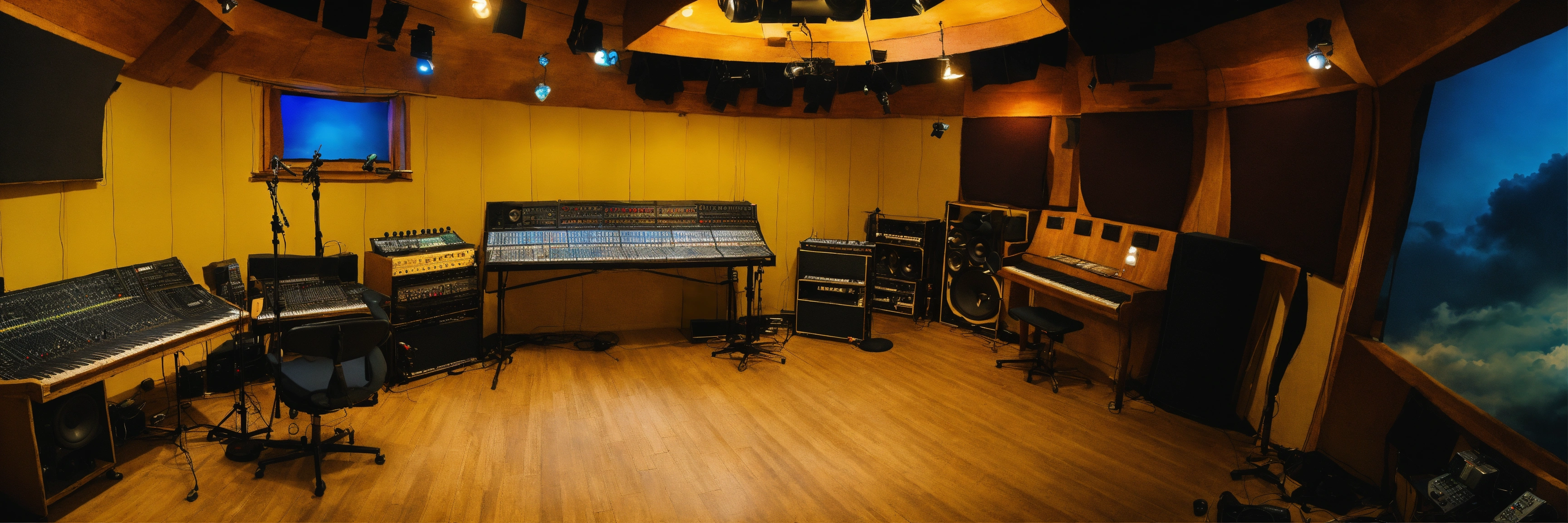 Many smoke and clouds throughout the inside the studio, fantasy, heaven bible, a 70s style music recording studio, many clouds on the ground around the estudio the studio walls are yellow and light blue