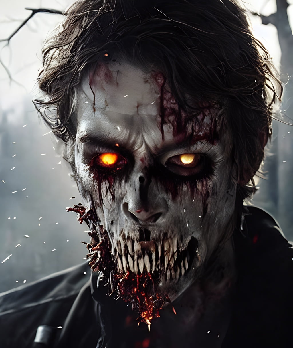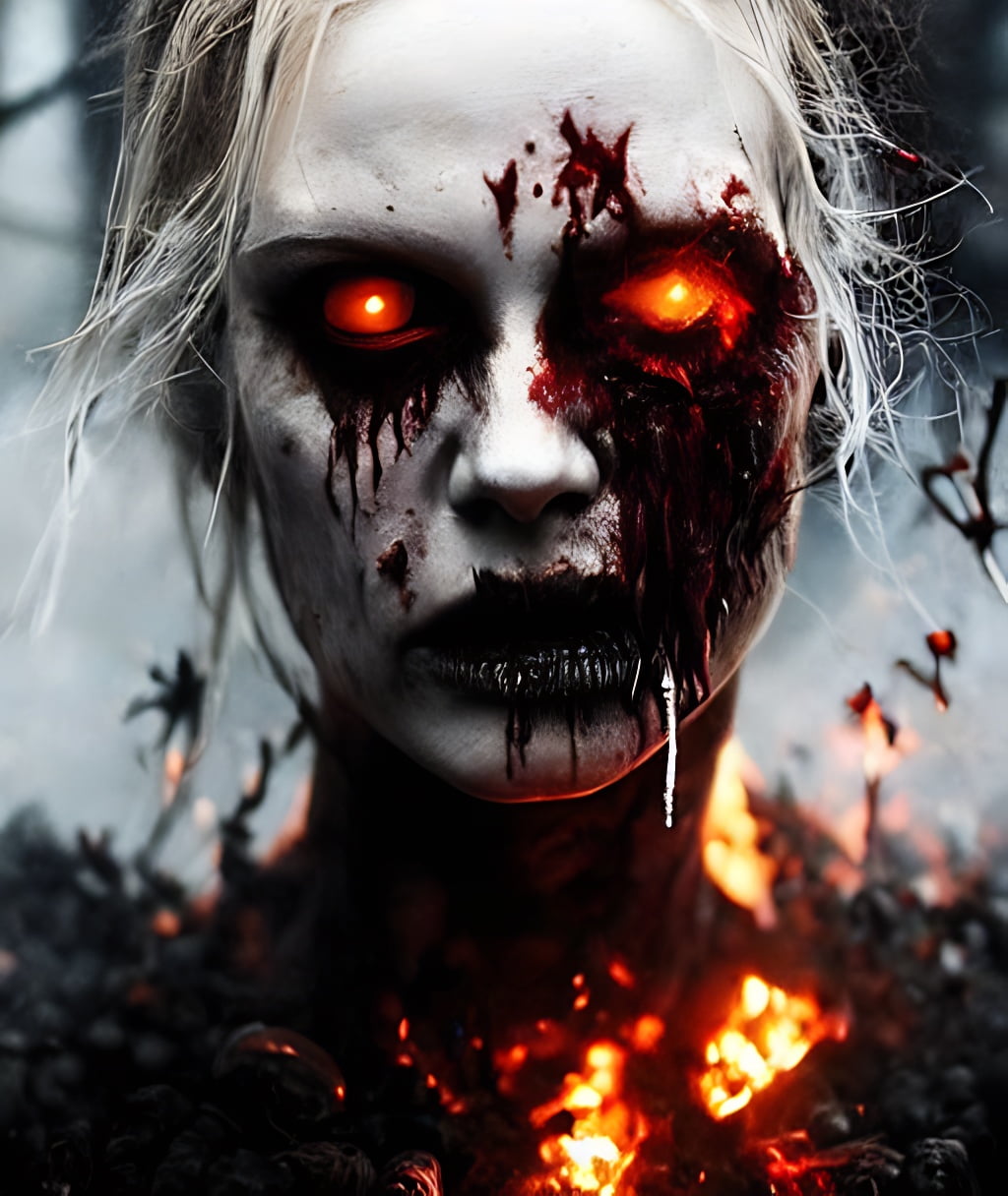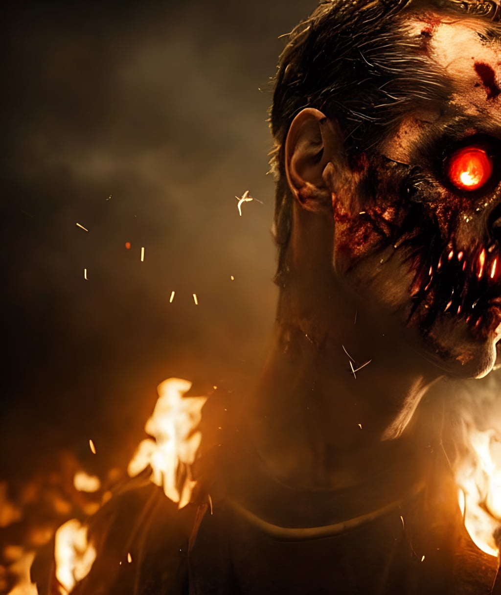 Hyper realistic photograph of a undead zombie, gore and horror look, hellfire, fire particles, dust and debris flying, cinematic scene (art by truls espedal) trending on artstation, highly realistic, 8k, cinematic lighting, ultra sharp