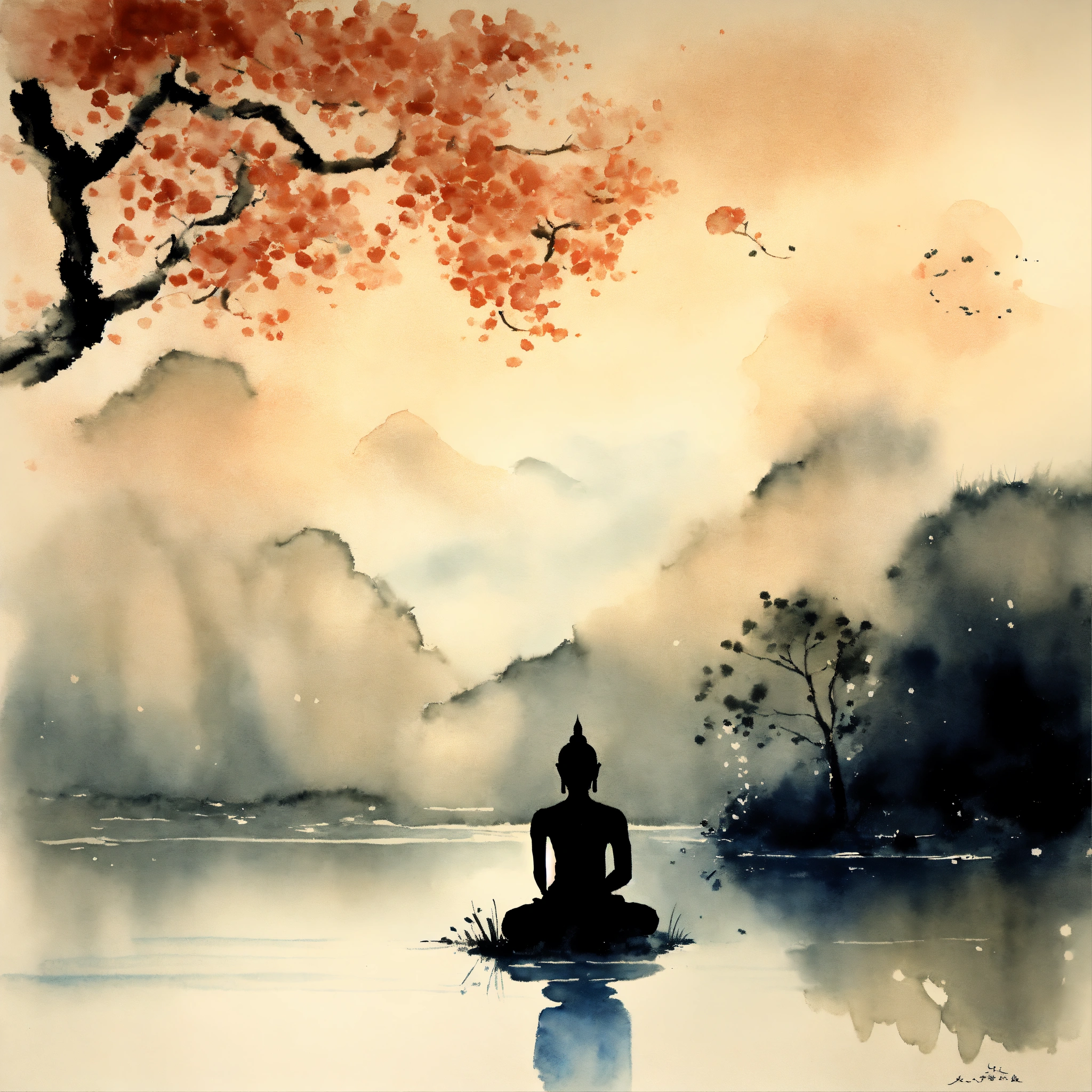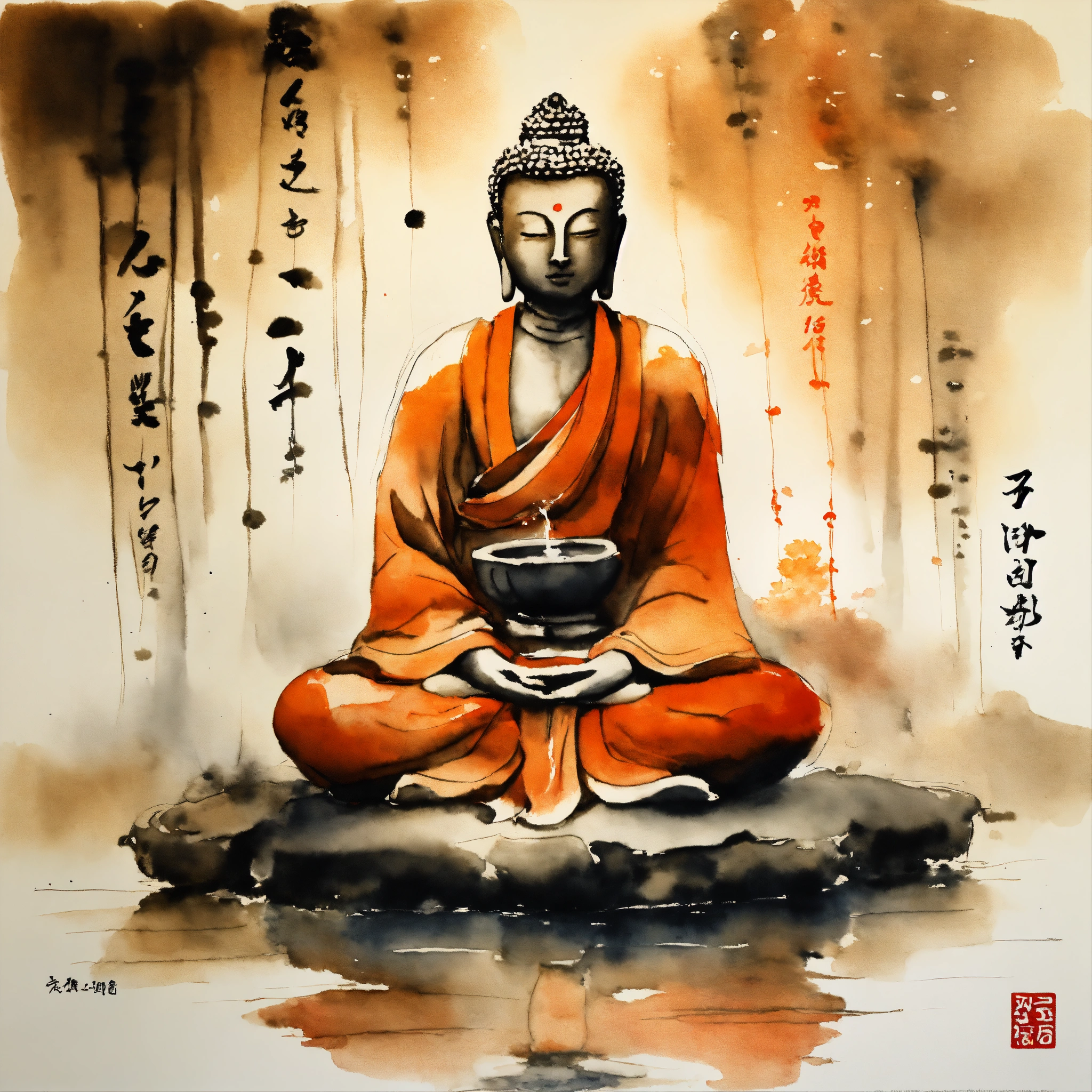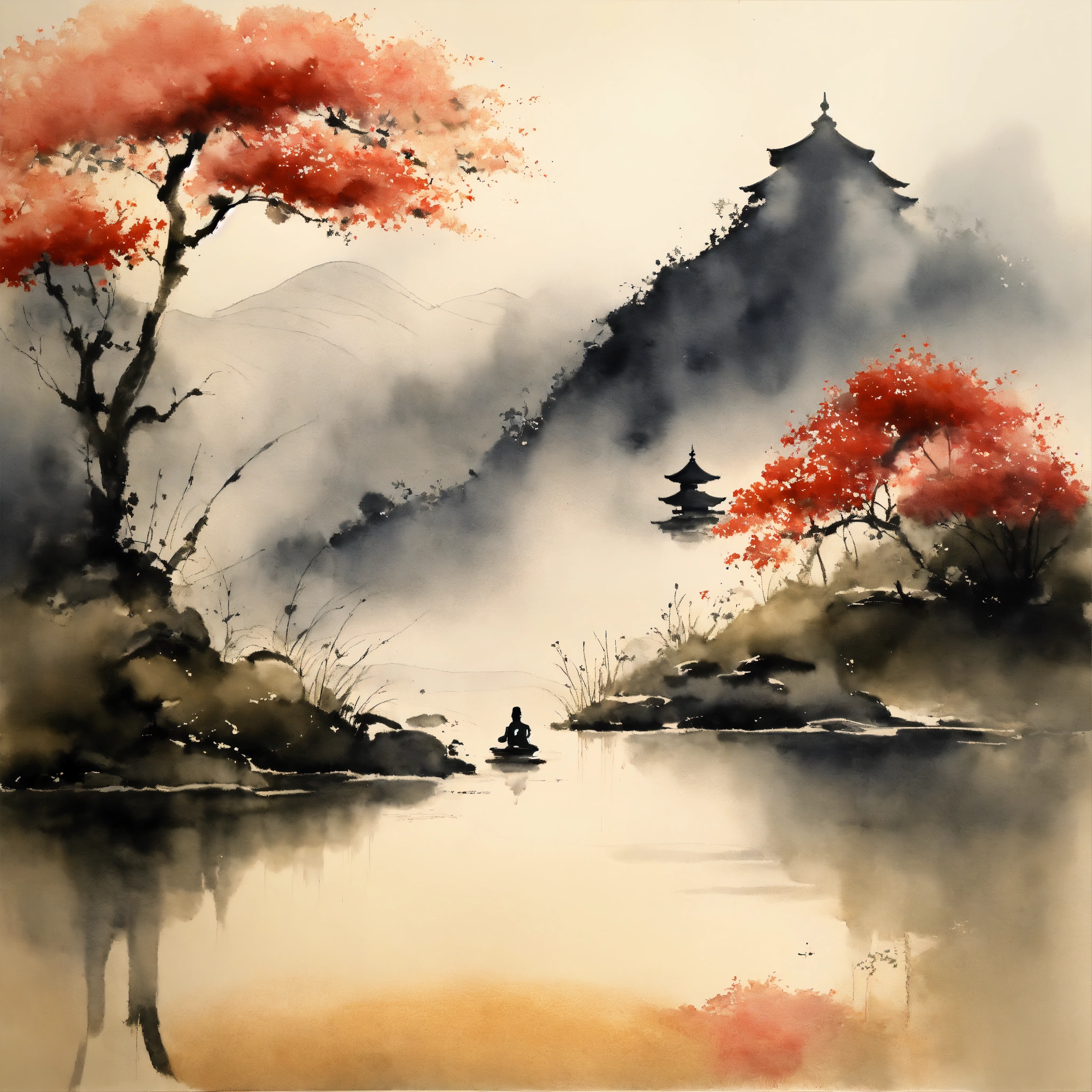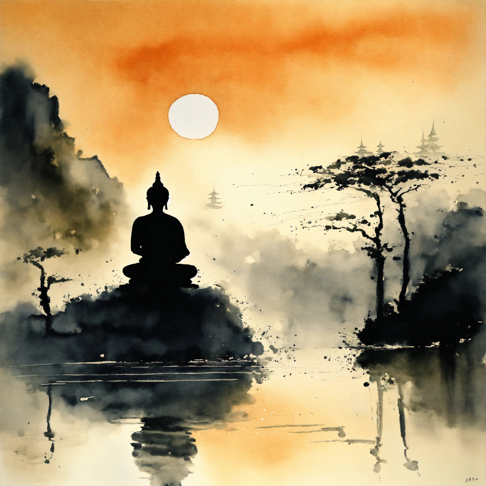 Draw, very small buda meditation and discipule zen in sumi-ei, very minimalist water painting in japanese, it is a style that focuses on creating a sense of fluidity and transparency using diluted watercolors, very delicate, few images, subtle brush strokes delicate, ethereal, very very fine strokes