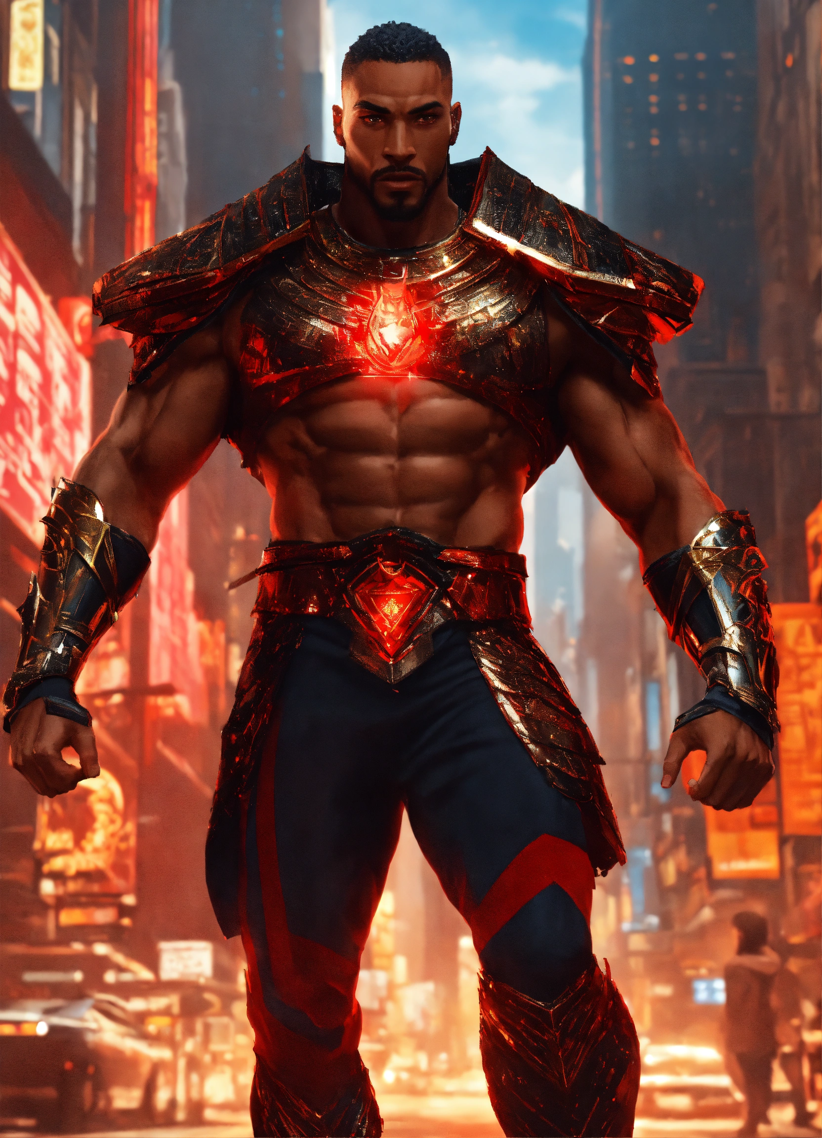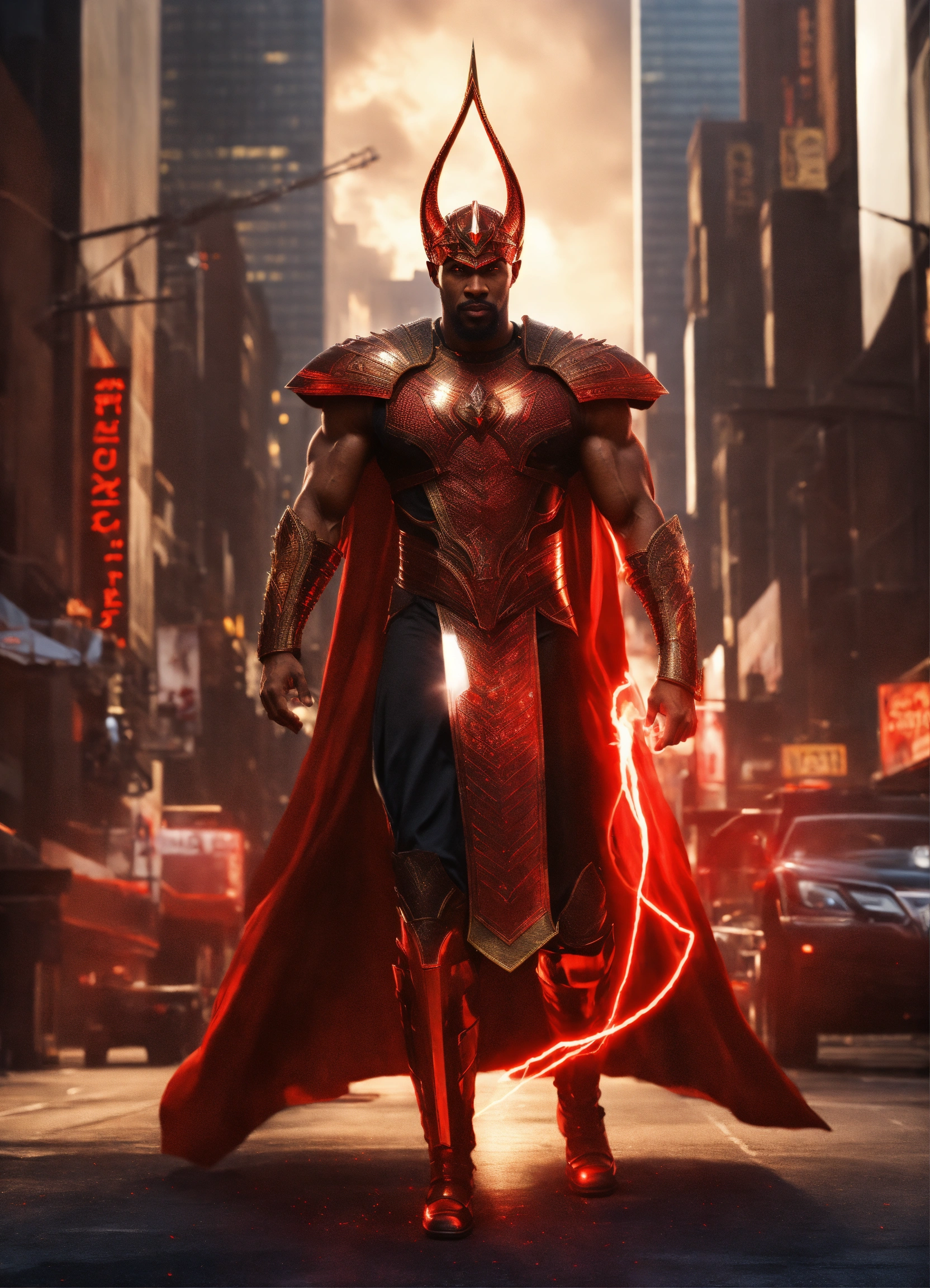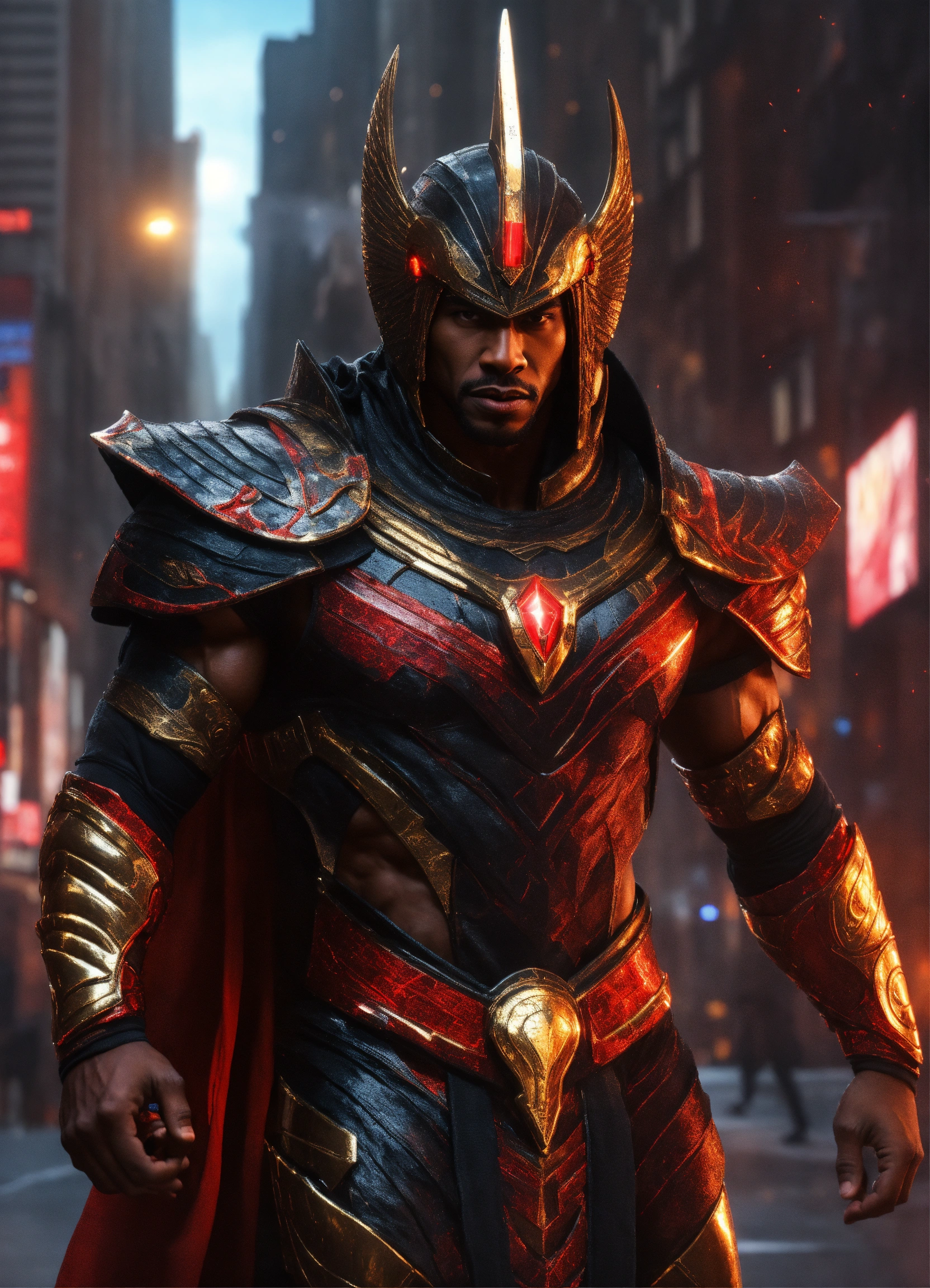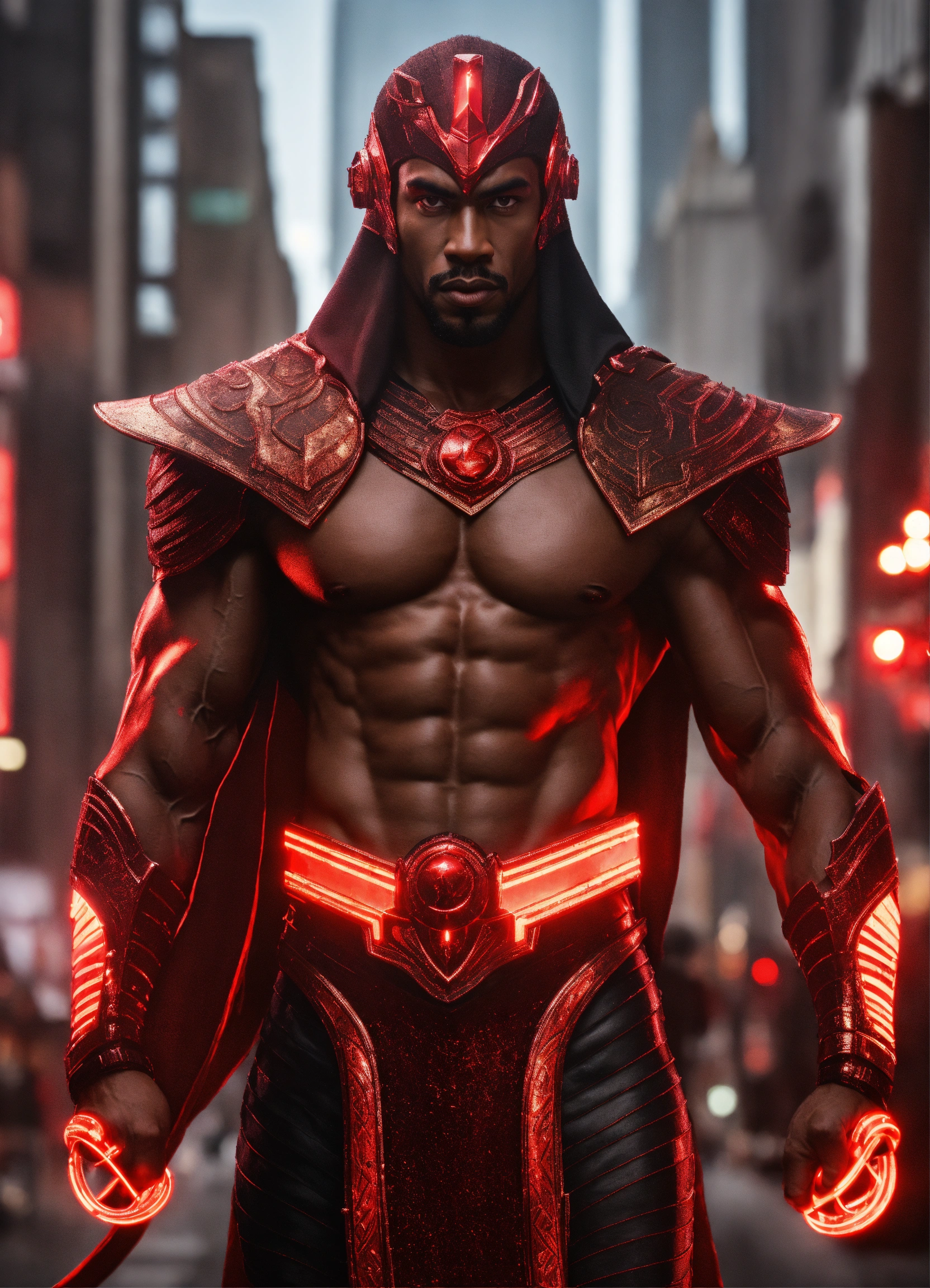 Evil god apophis, a fearsome strong handsome black god wizard, with short dark hair, a strong muscular handsome god, muscular wearing futuristic black and red egyptian armor, walking in new york red lightning around him, resolution 8k, insanely detailed