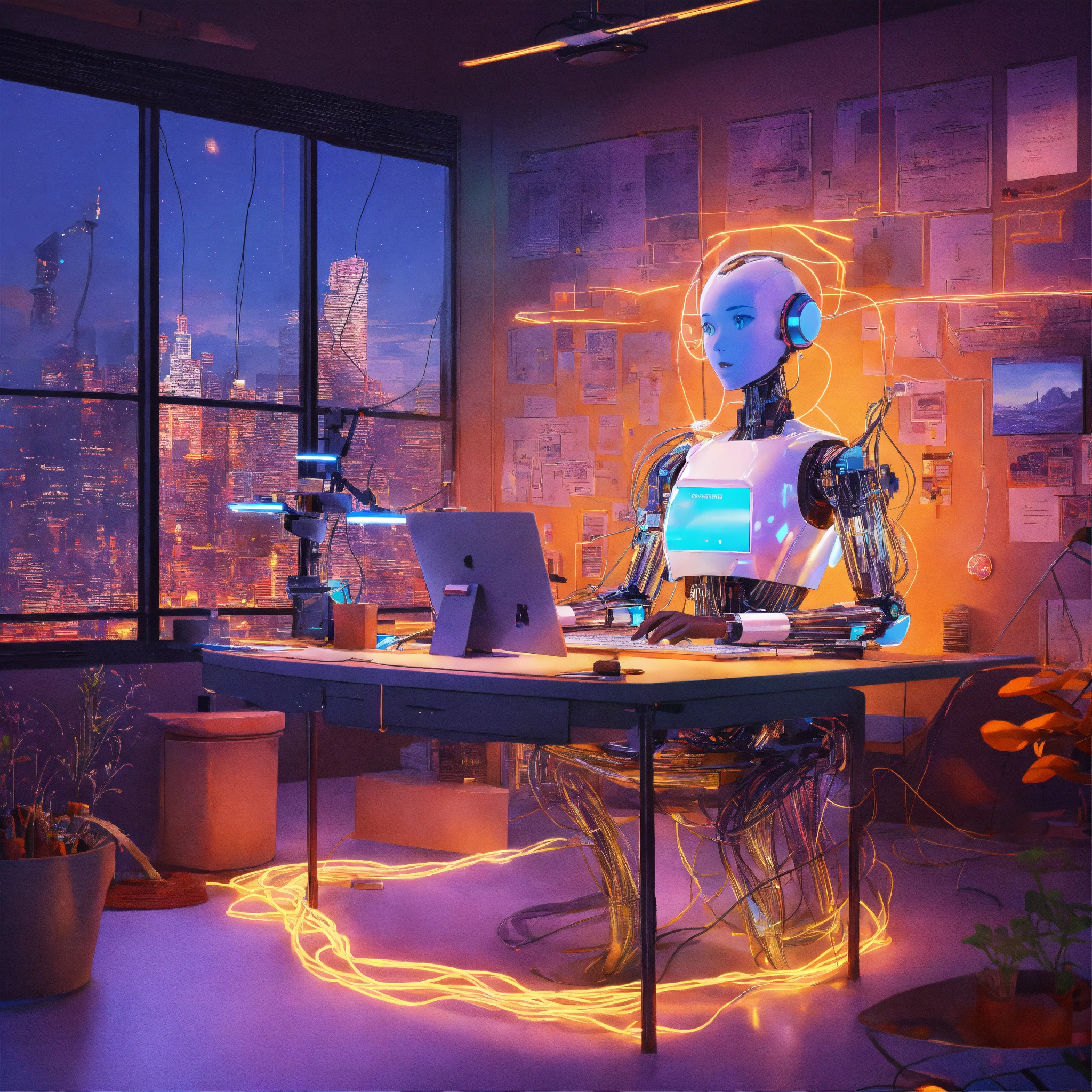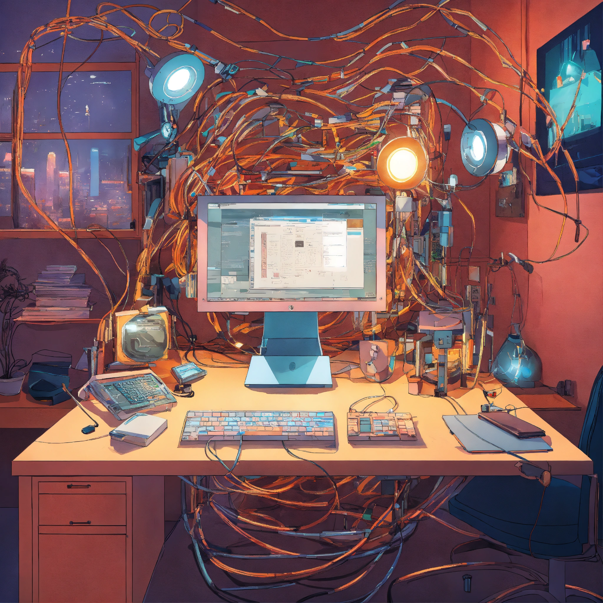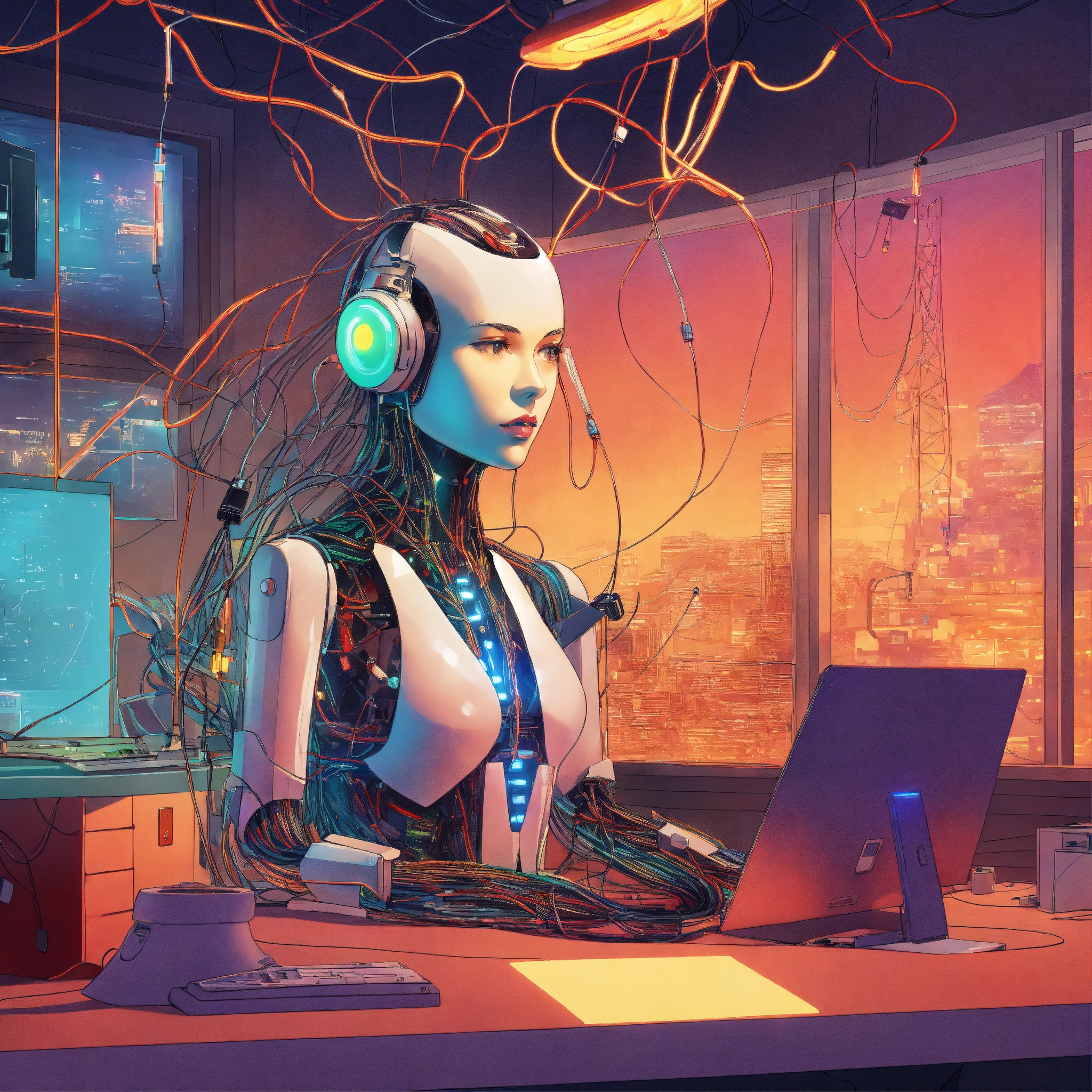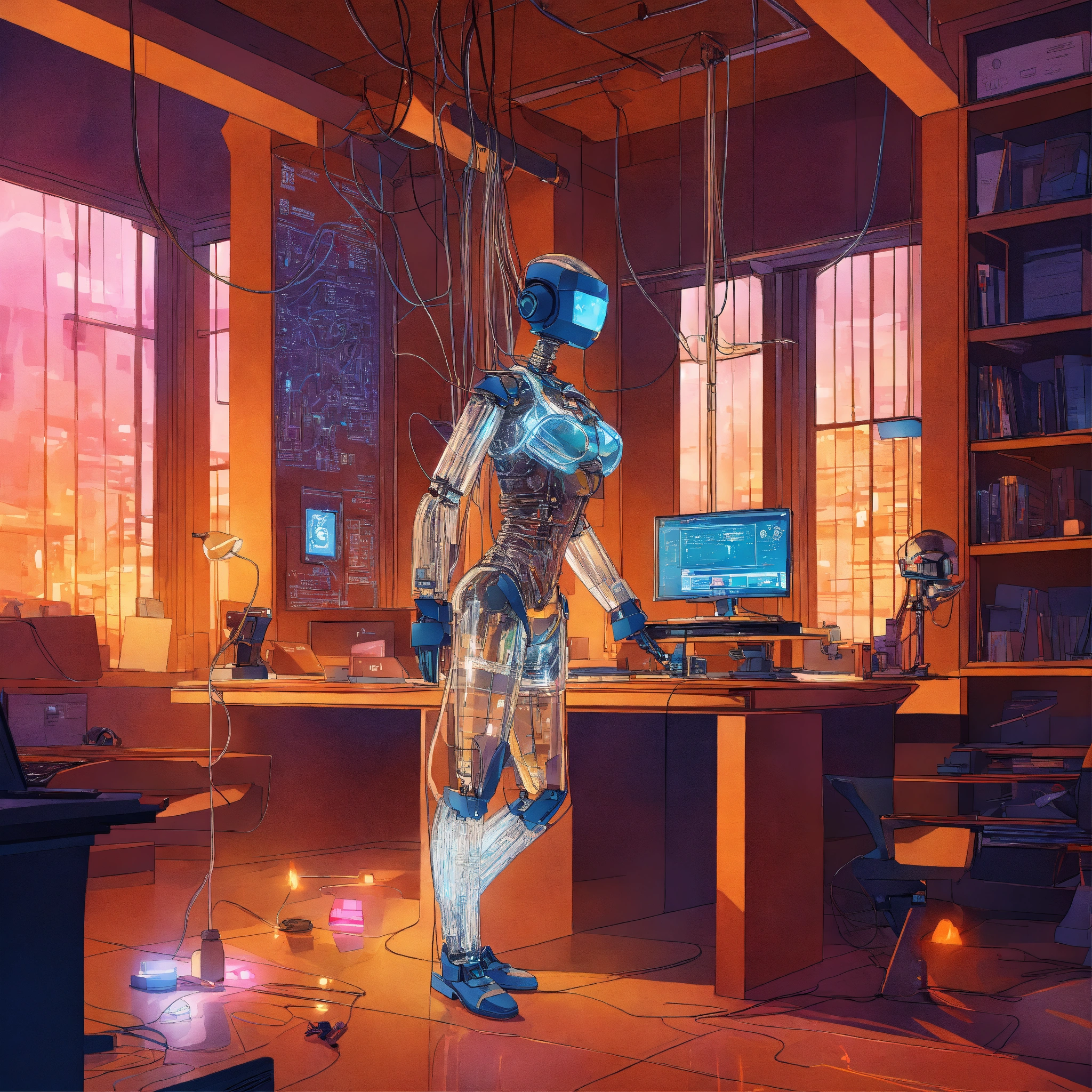 Create a vibrant, cartoon-style poster showing a body portrait of a person in an office setting filled with cables, wires, and glowing led lights. include futuristic, attractive transparent white plexiglass secretary robots with sleek designs, typing away. the scene is viewed from an 80-degree angle, giving it a dynamic and unusual perspective. the artwork should have a surreal and dream-like quality, reminiscent of early 20th-century surrealism, with a touch of abstract modernism and cartoonish flair to capture a unique and creative atmosphere.