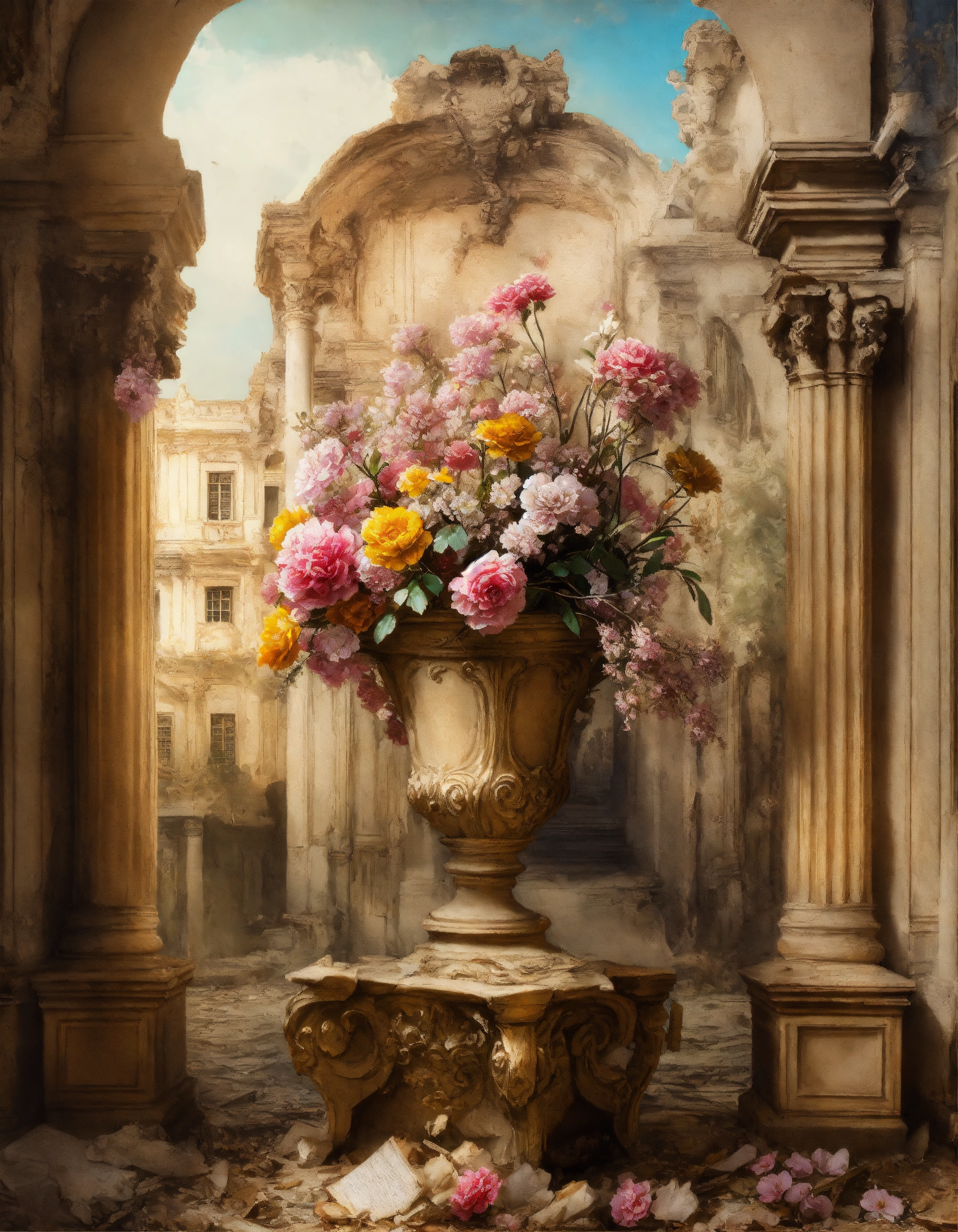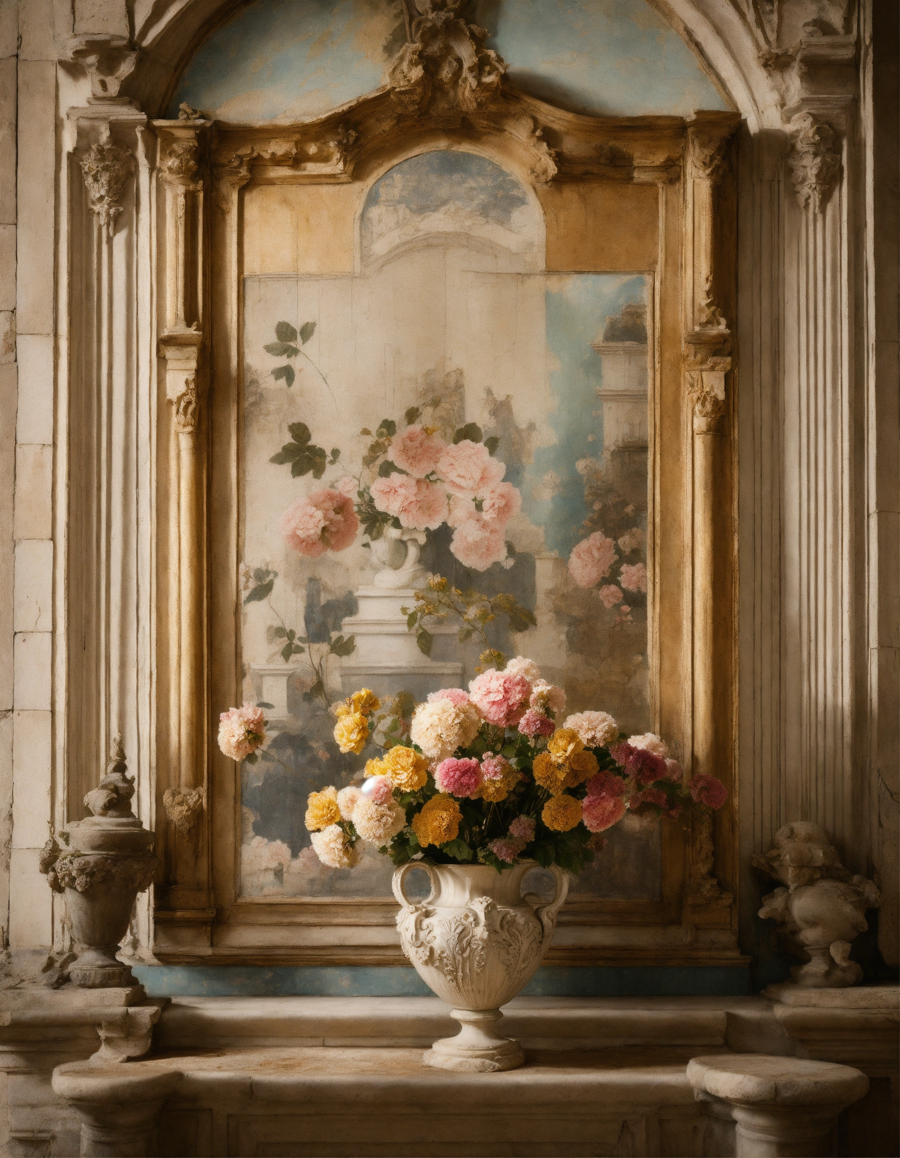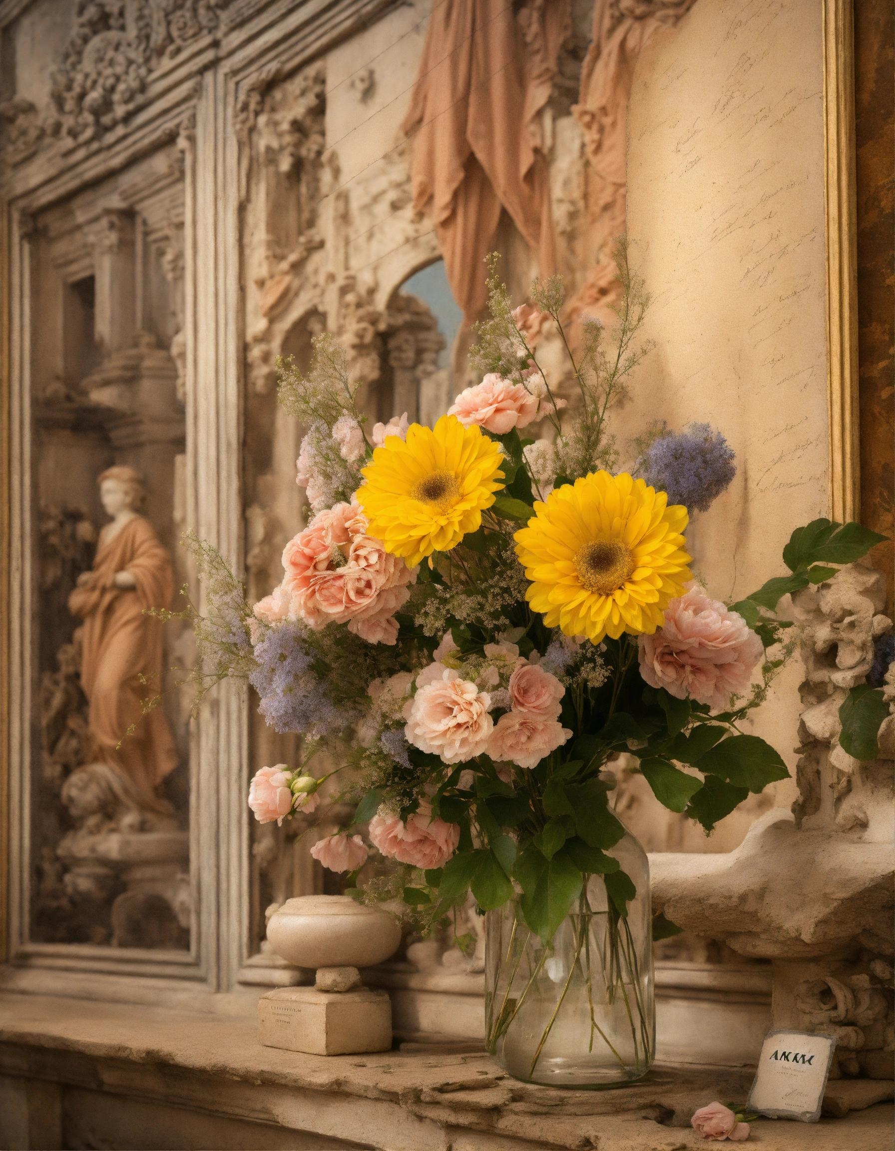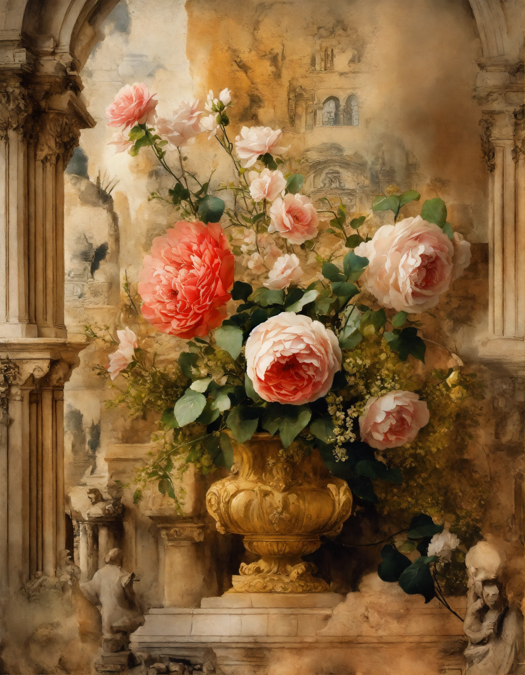 Baroque architectural details and destroyed sculptures, background with ancient architectural sketches, mixed media art style with collages of old labels, french country art, with beautiful soft flowers in the foreground, like a bouquet, natural wear on the labels, delicate and elegant atmosphere, initials akm