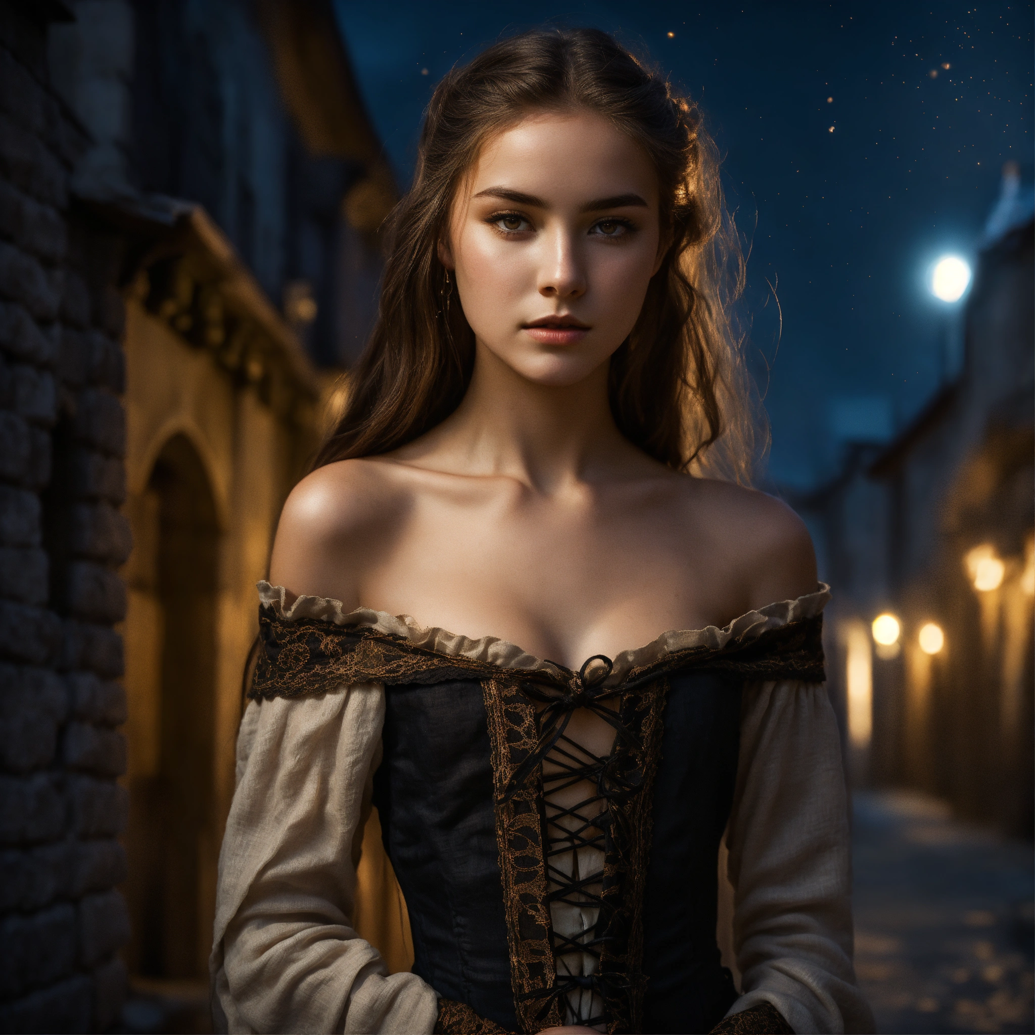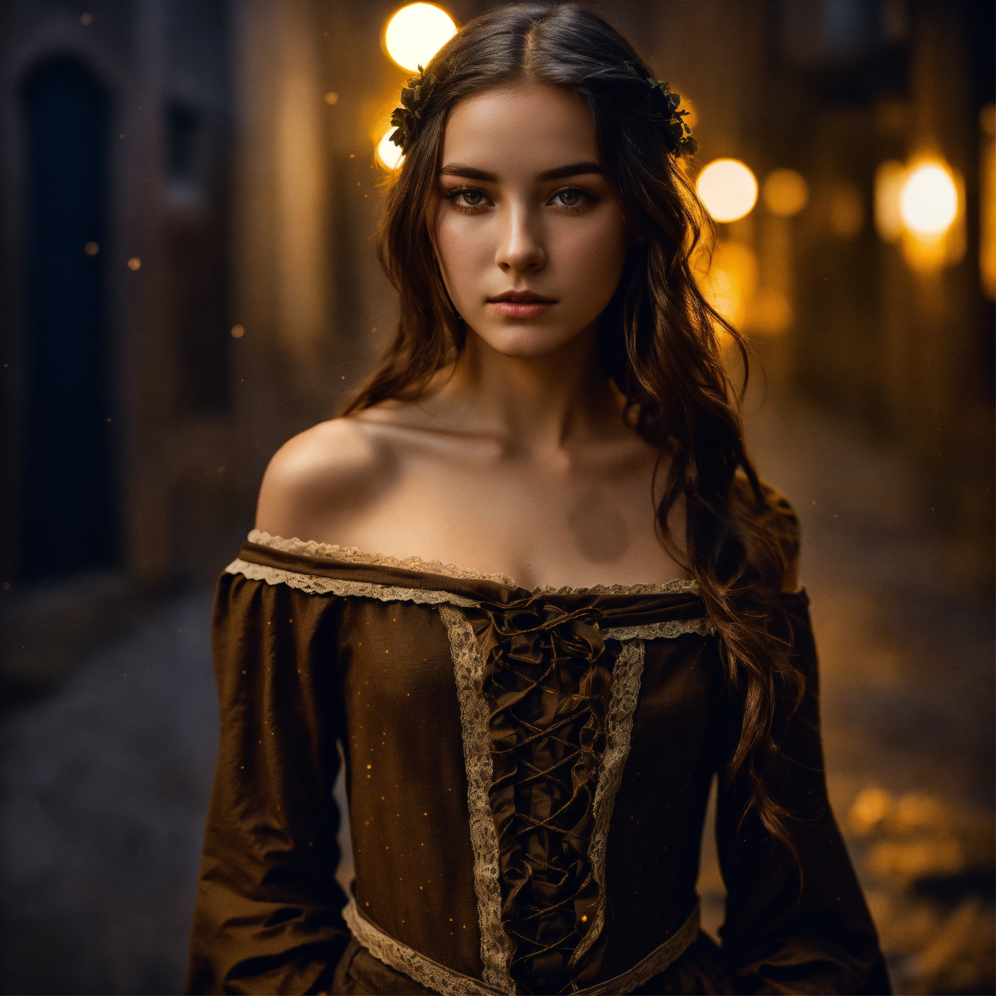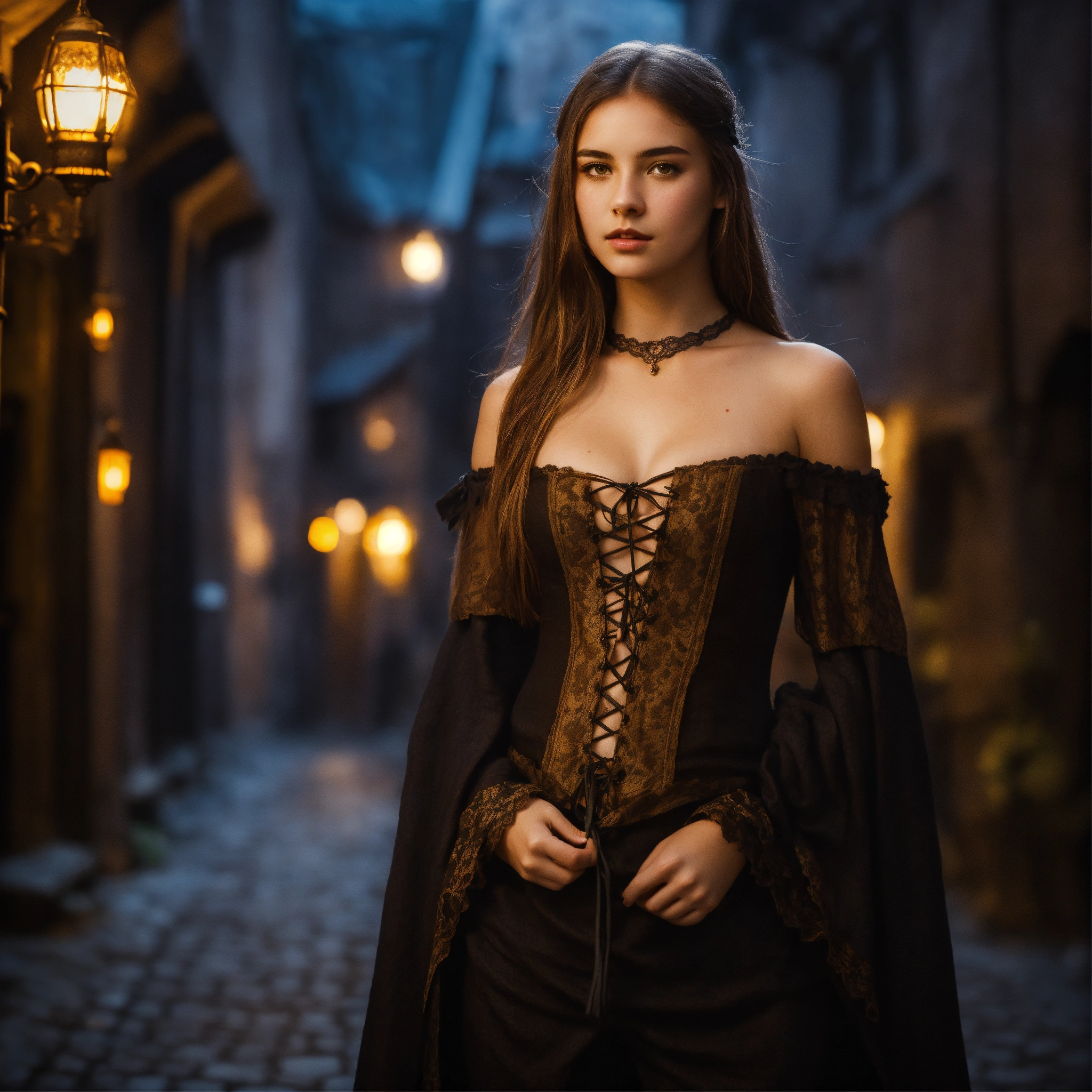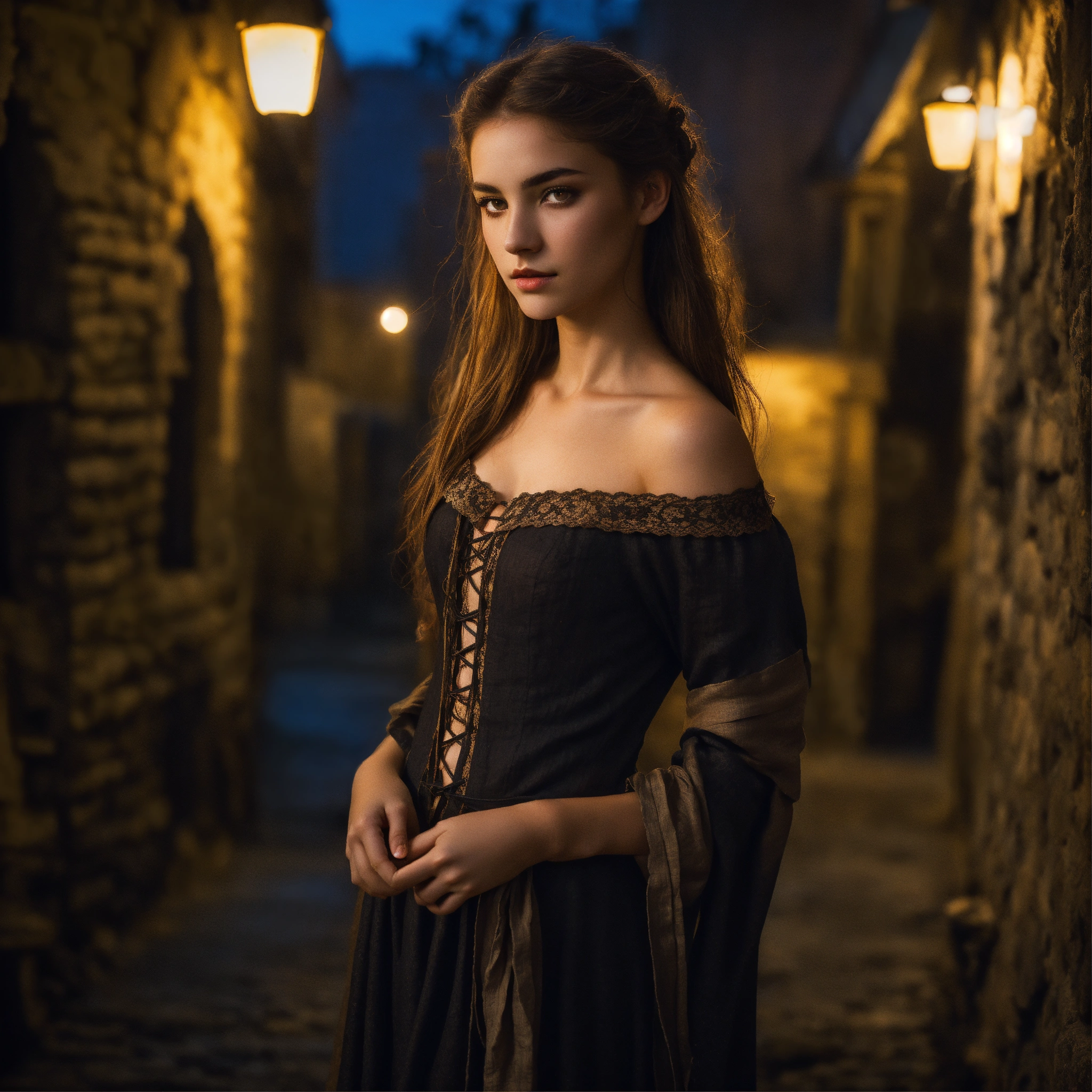 Portrait, goddess of beauty, childish, highly attractive 15 years old girl, long brown hair, captivating speckled golden glowing eyes, and pale skin, beautiful very narrow face with high cheekbones, thin eyebrows, very slim, lightly clad, black colored off-the-shoulder linen blouse combined with a brown lace-up corset, black neckerchief, black linen trousers, dark cloak, light boots, stands in the night in a dark medieval alley, graceful, wispy, intimate, most beautiful girl, verführerisch, darkness, mysterious, glowing eyes, dark, cold ambient lighting, focus on face, extremely detailed, fantasy, medieval town setting