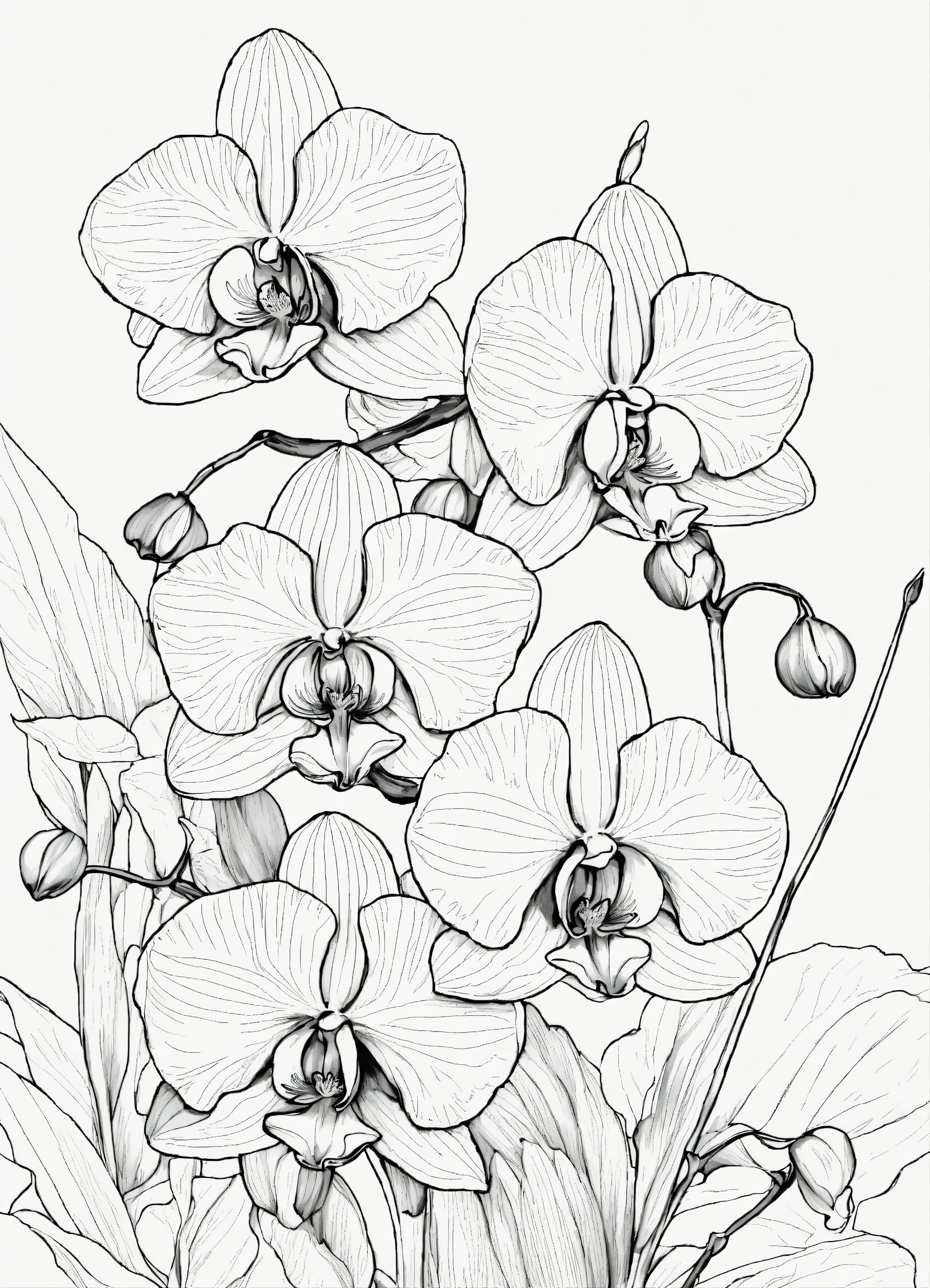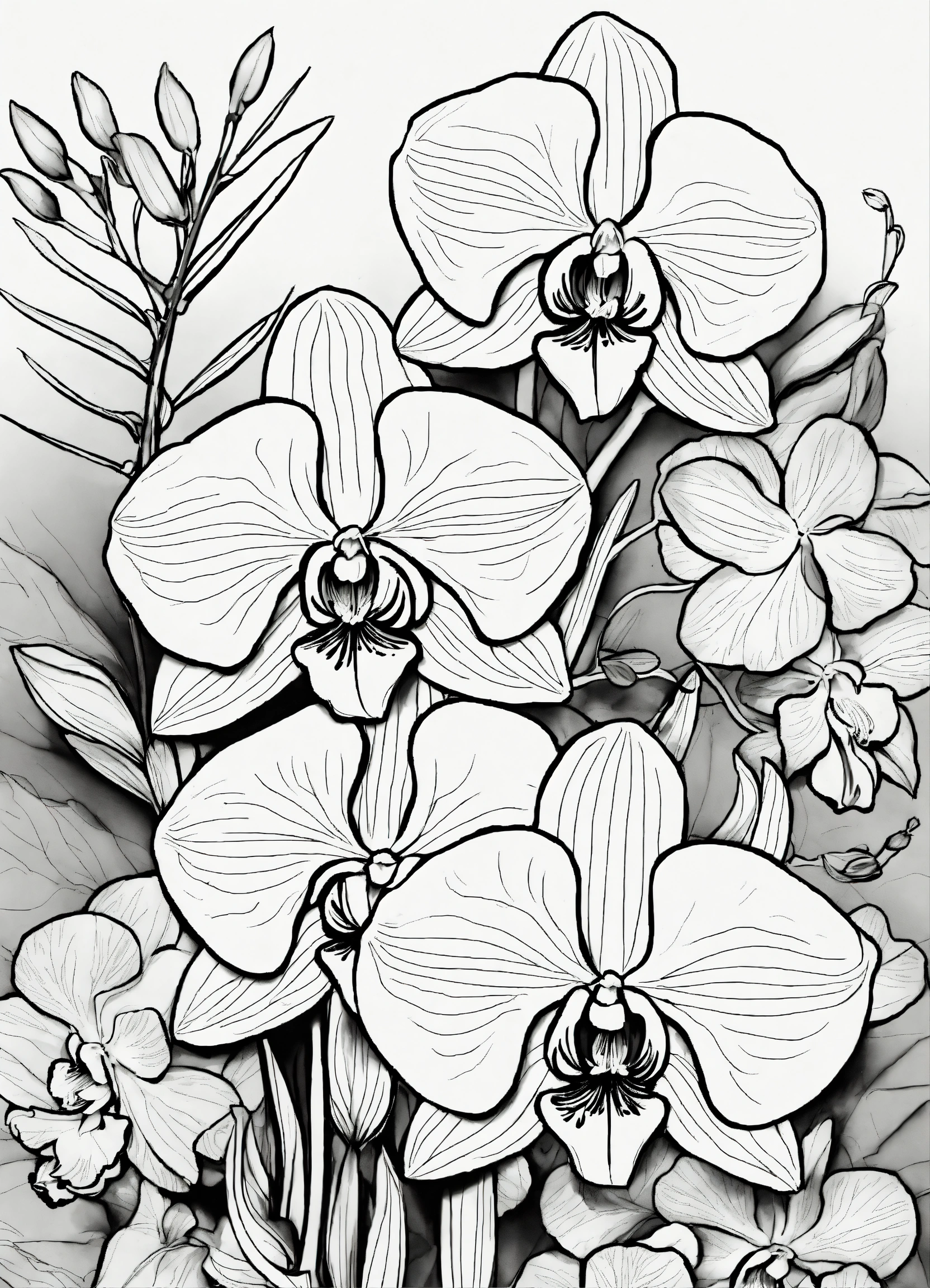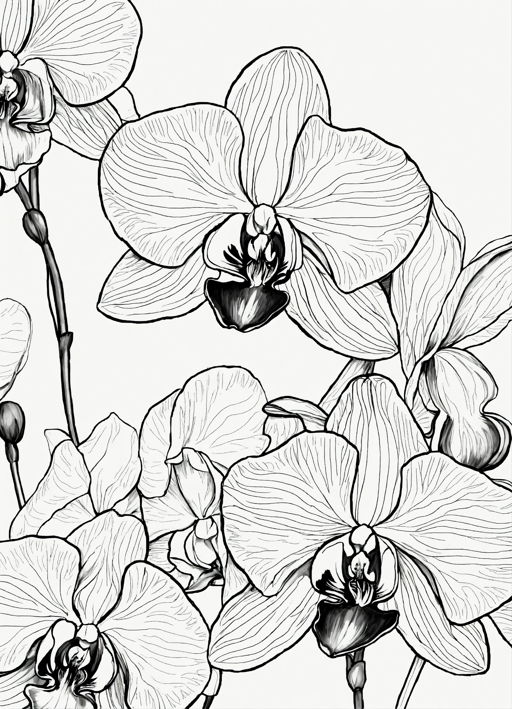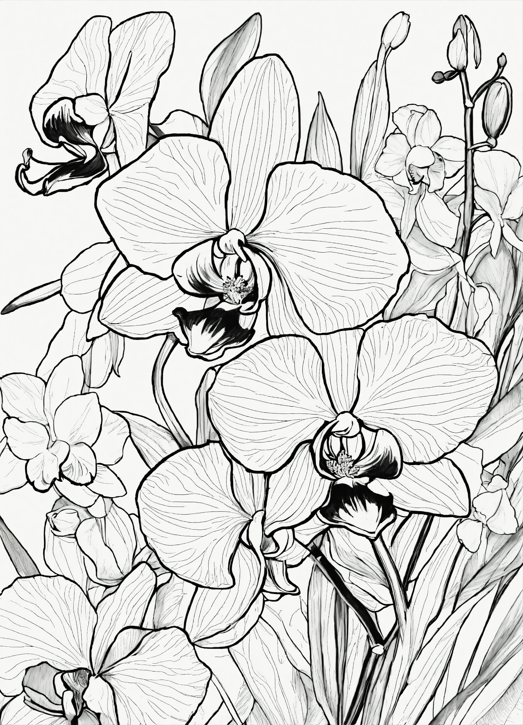 A black and white drawing for a coloring book, black thin lines. white background, the drawing of a beautiful set of orchids