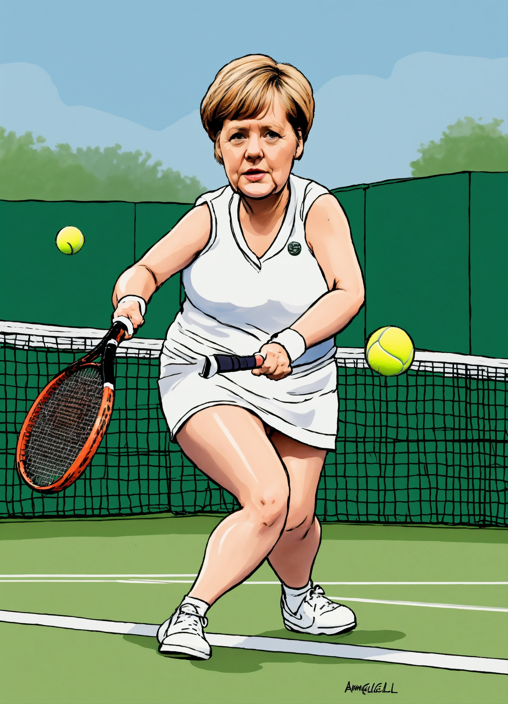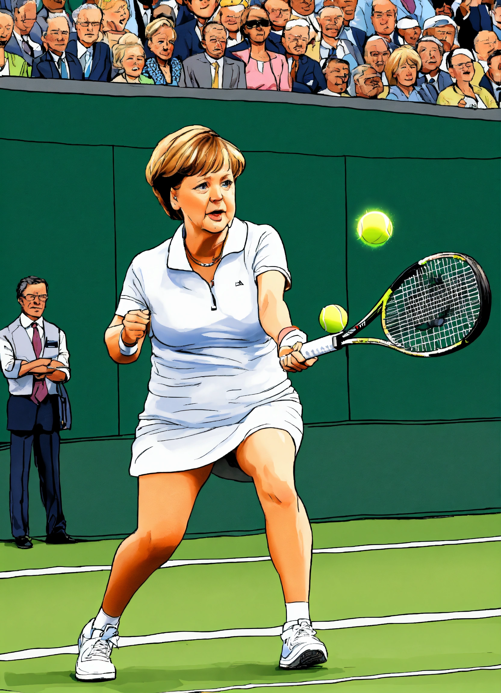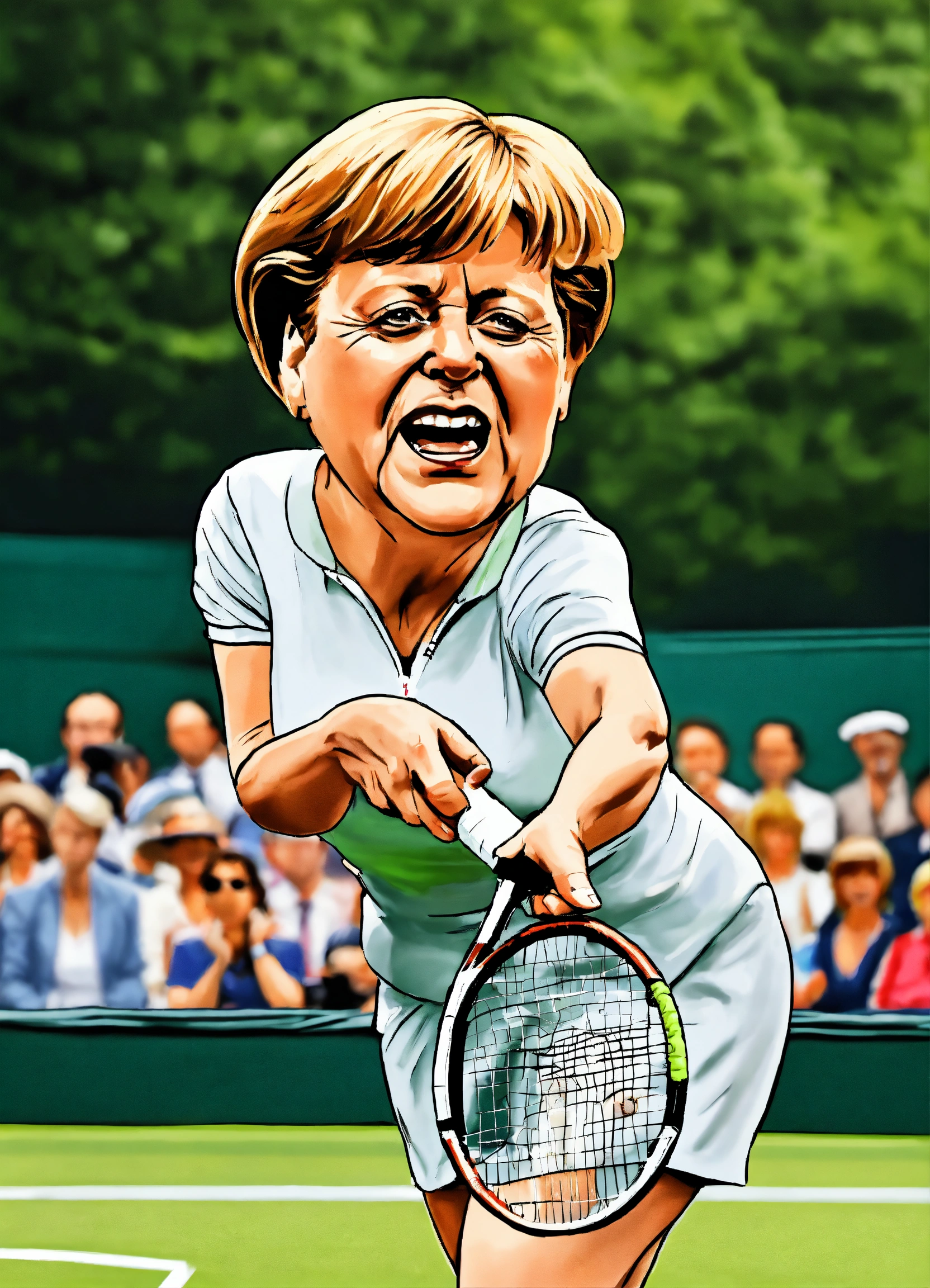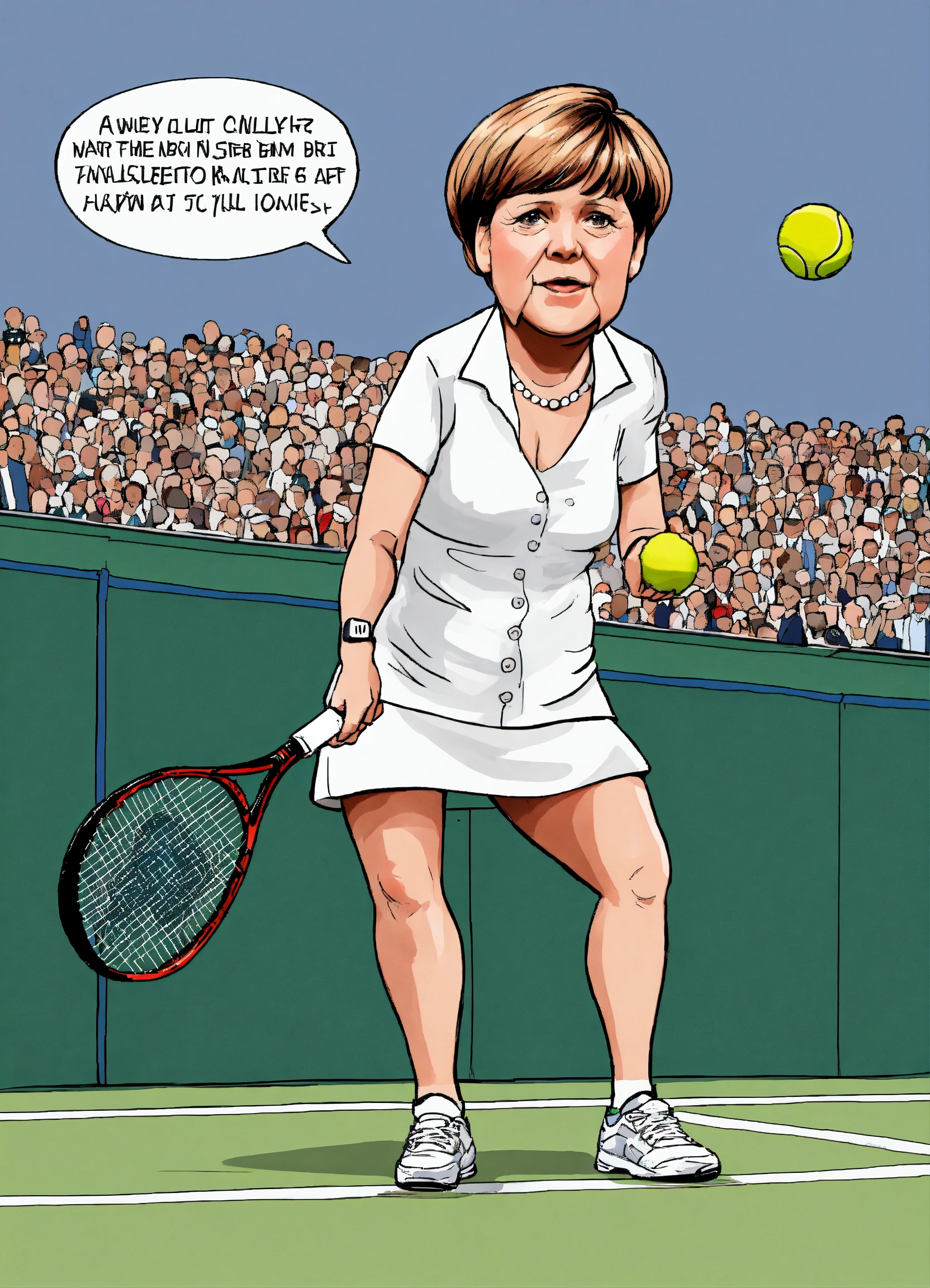 Angela merkel played tennis and dropped the ball at wimbledon. caricature. cartoon. small body, humor, speech bubble, funny