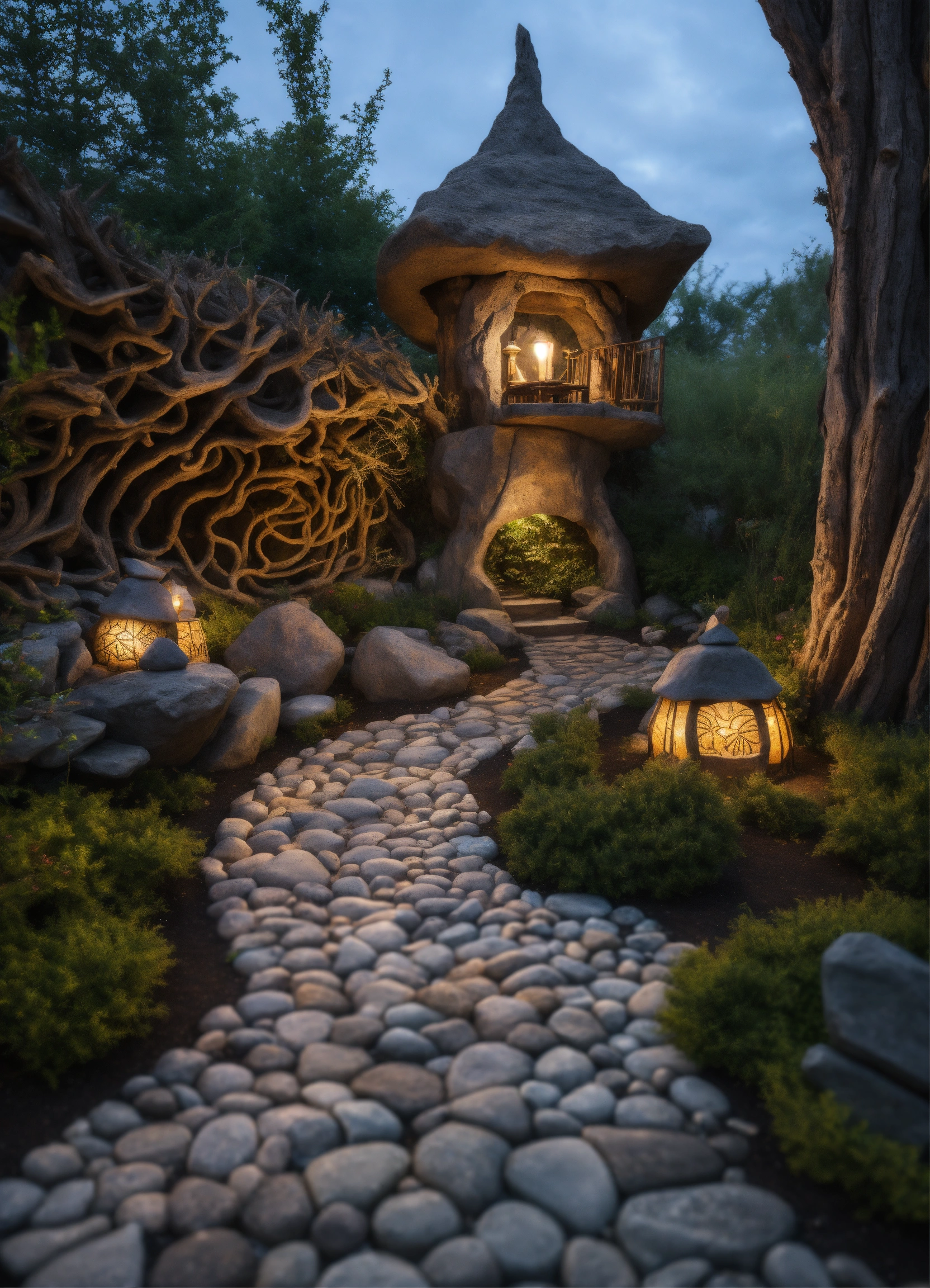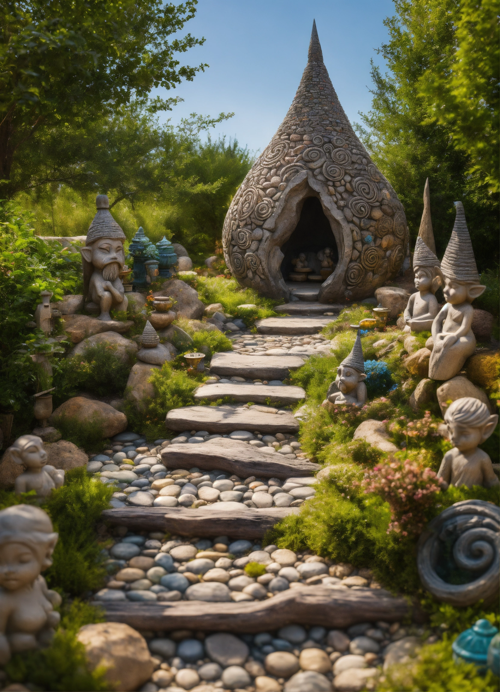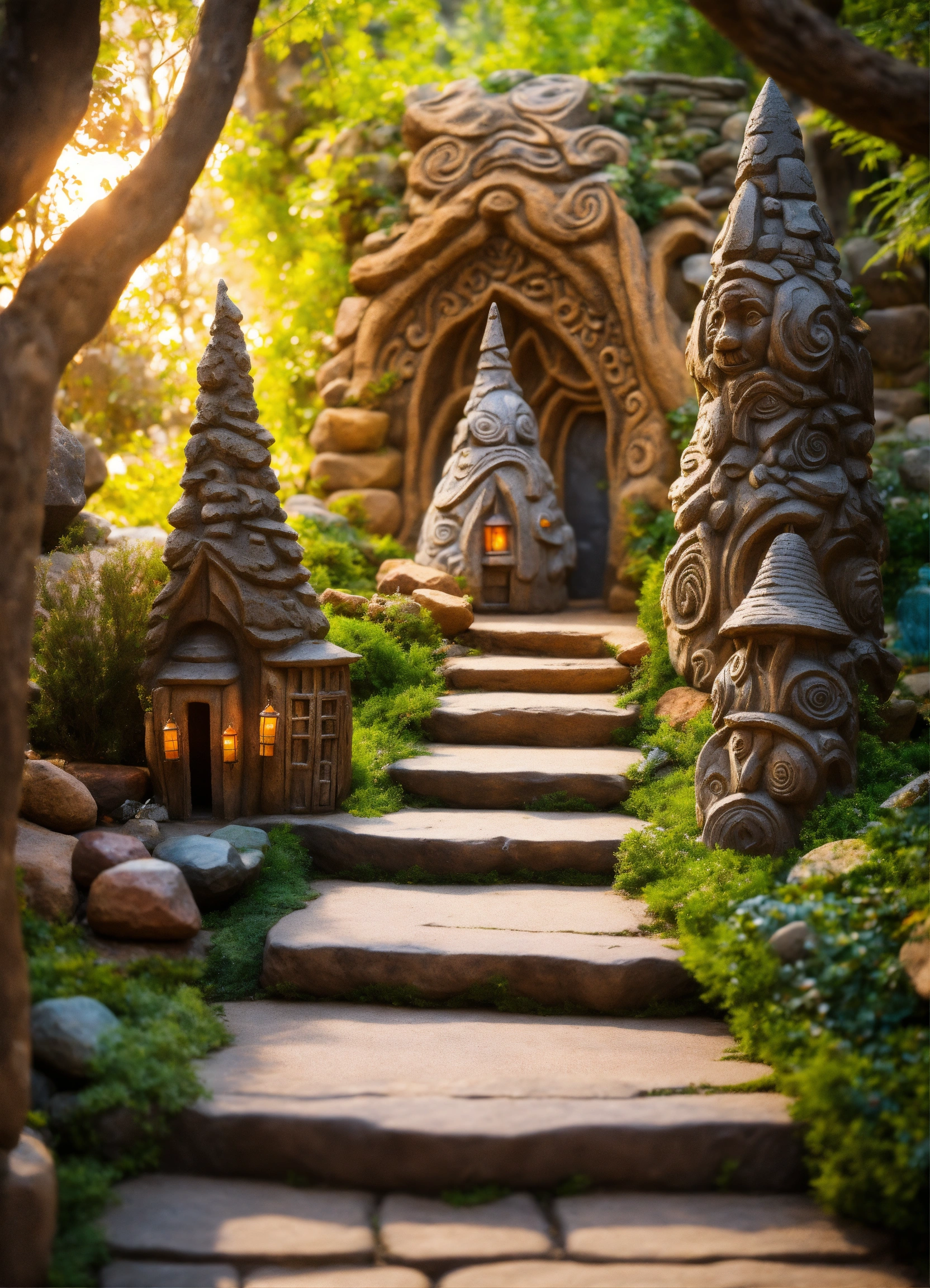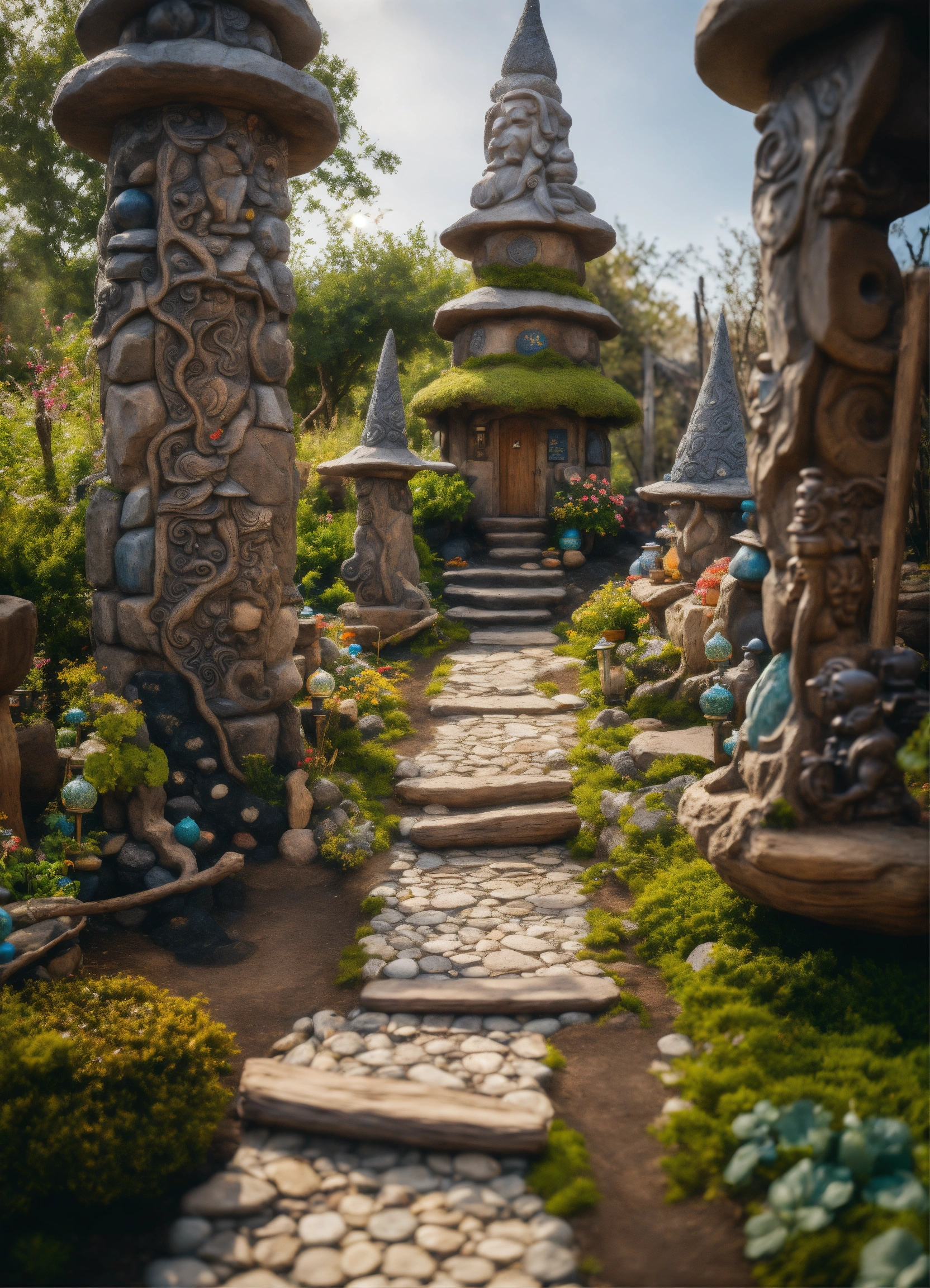 An ancient spiritual gnomes stone pathway rock garden.sculptured . style of alex grey, giger.unreal engine.totem sculptures.swirling patterned stone pathway courtyard.wood.stone.driftwood.statues. artistic sculpture.lanterns.air bnb tiny house