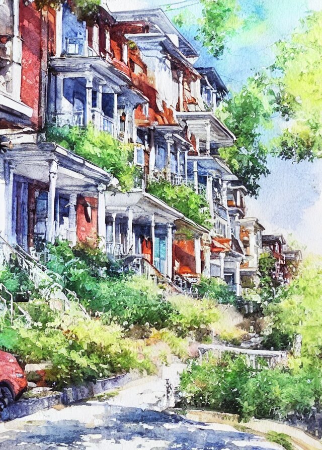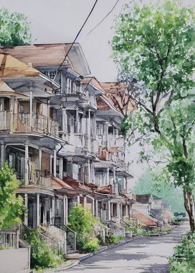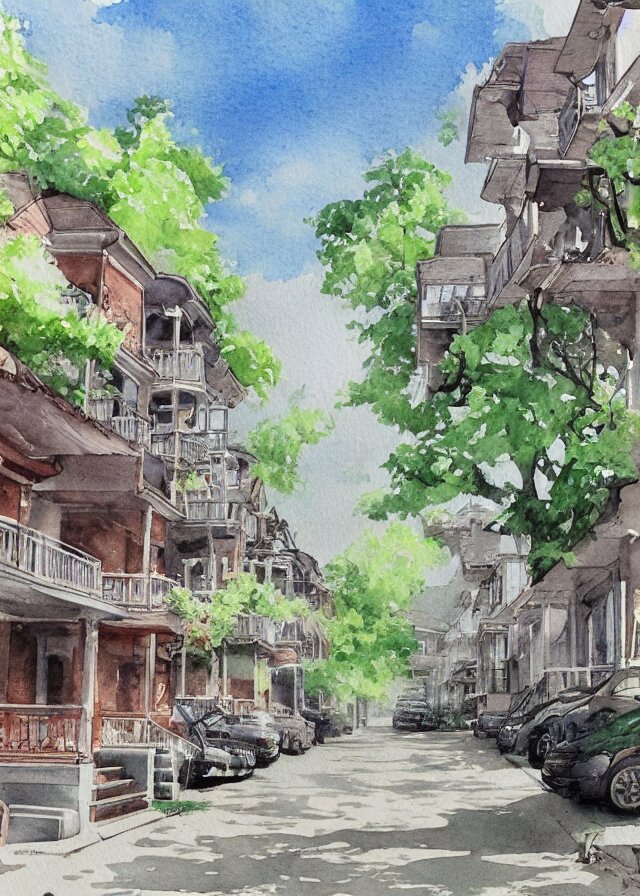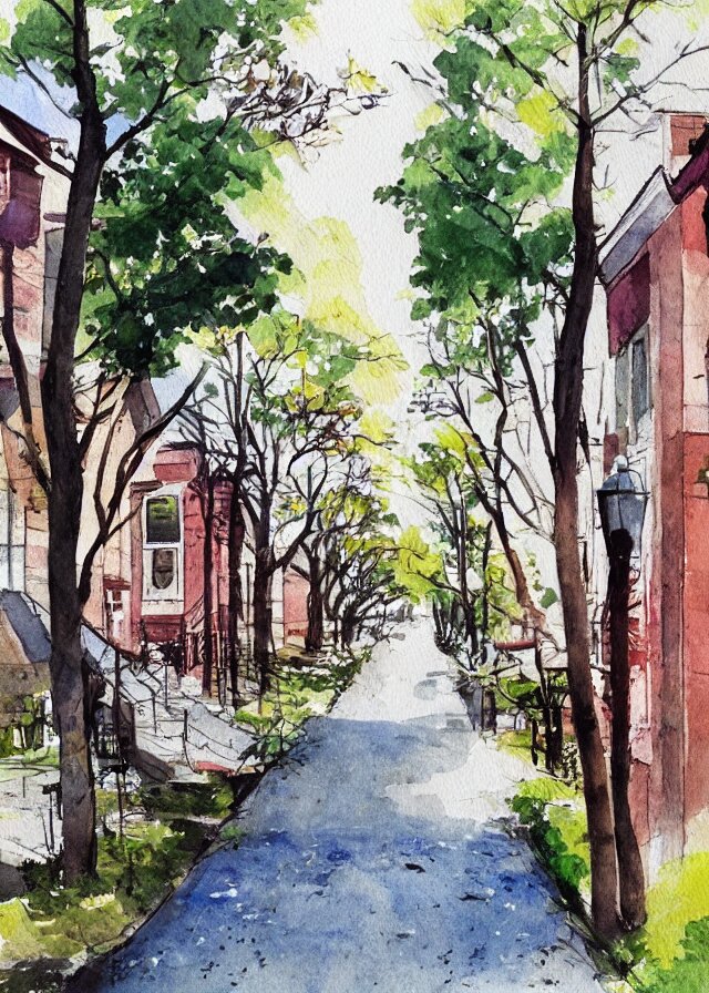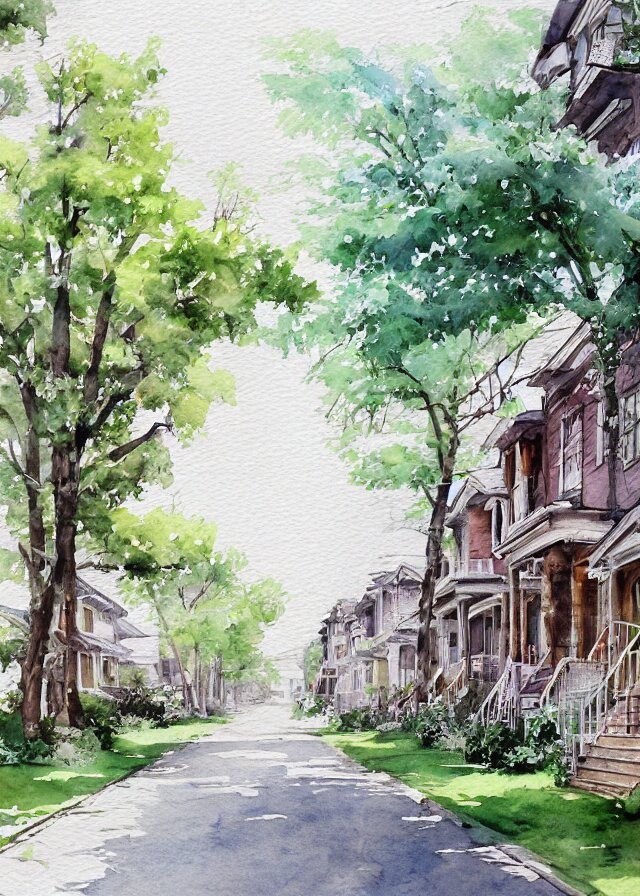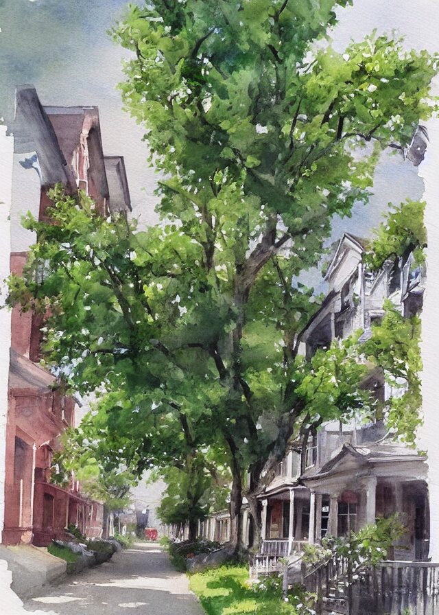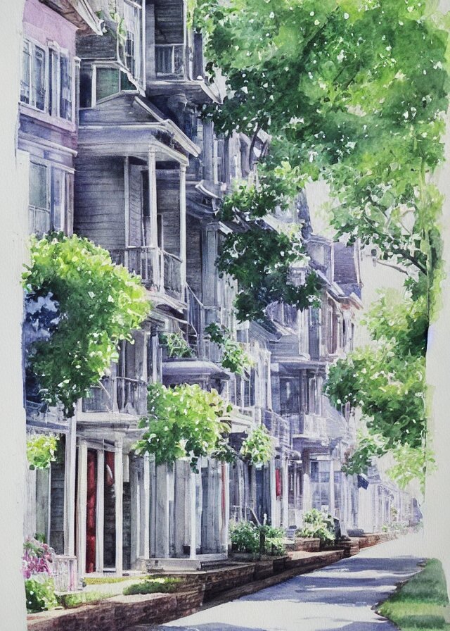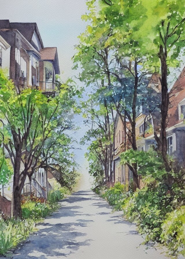 Street lined with old residential houses summer watercolor by arti chauhan trending on artstation