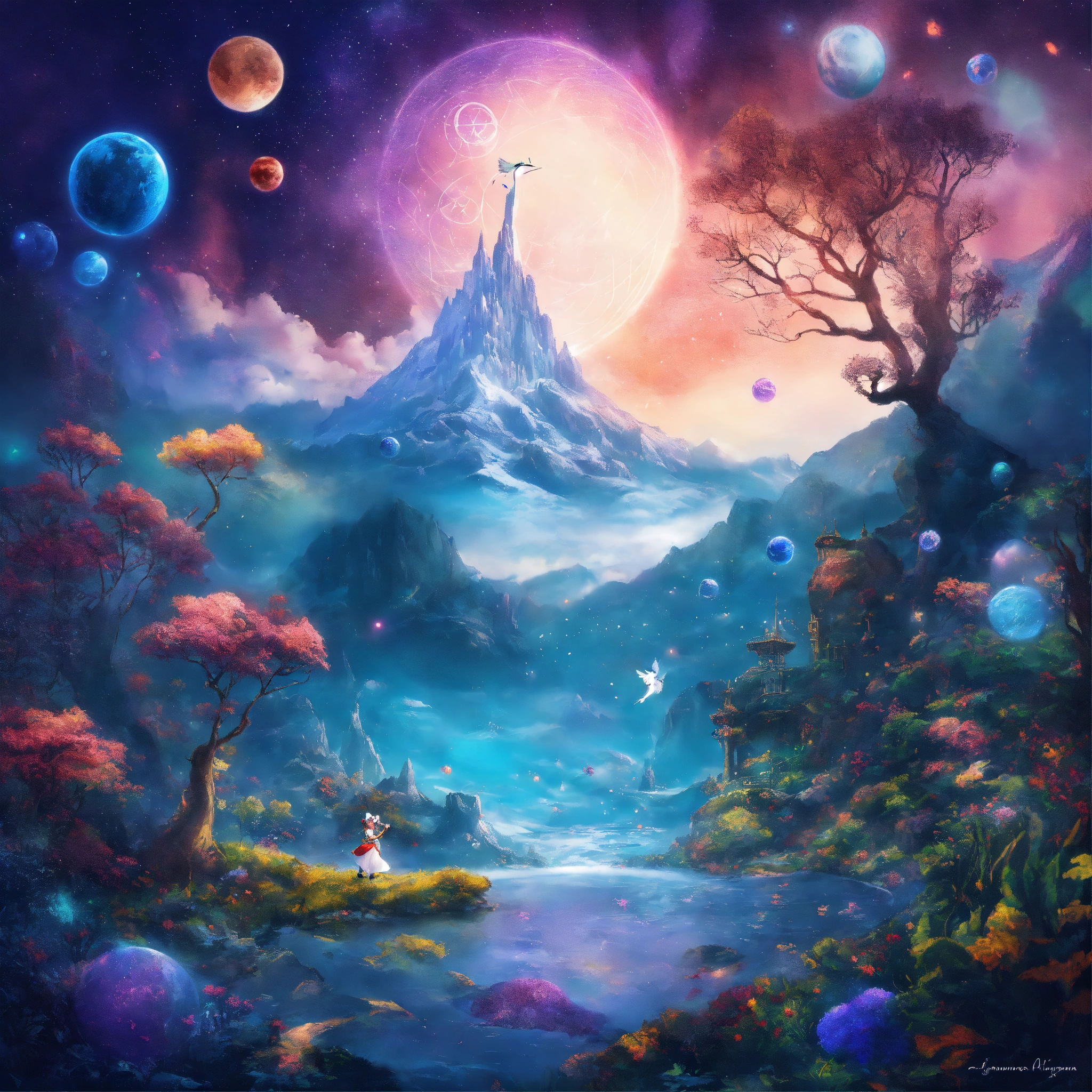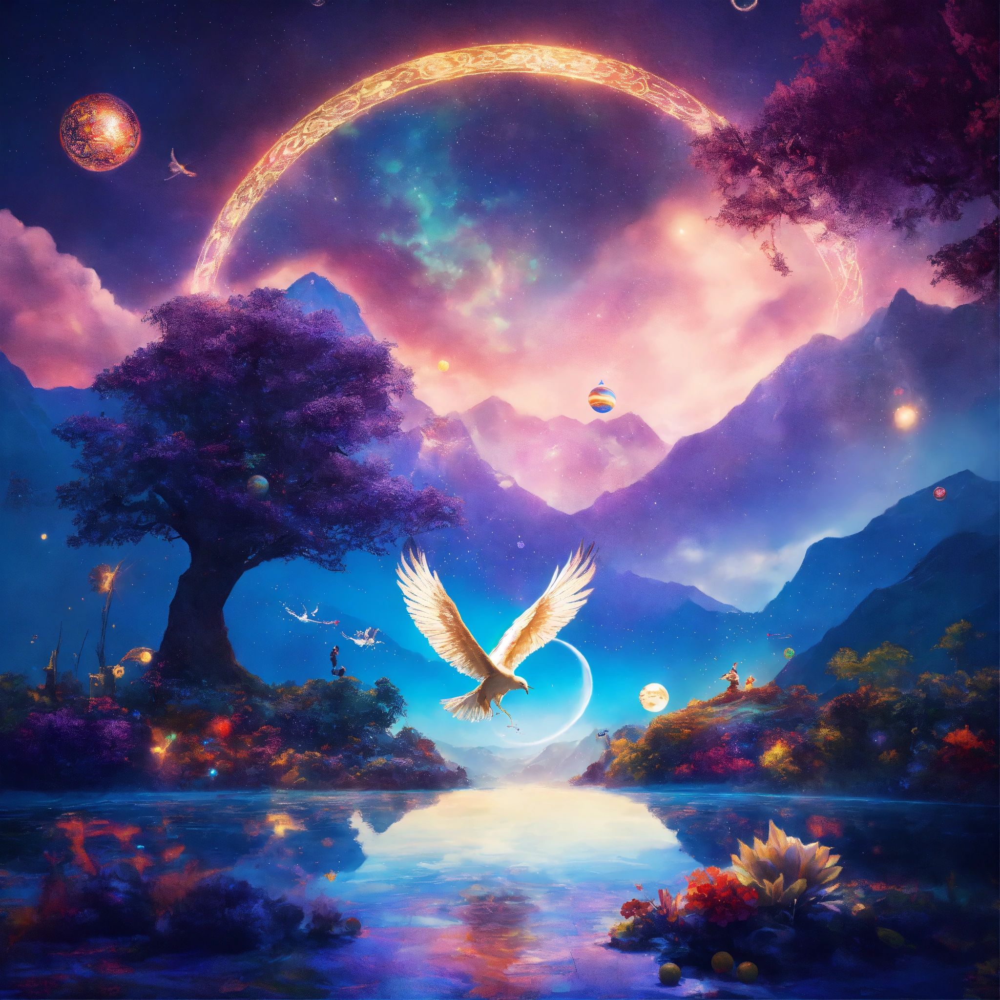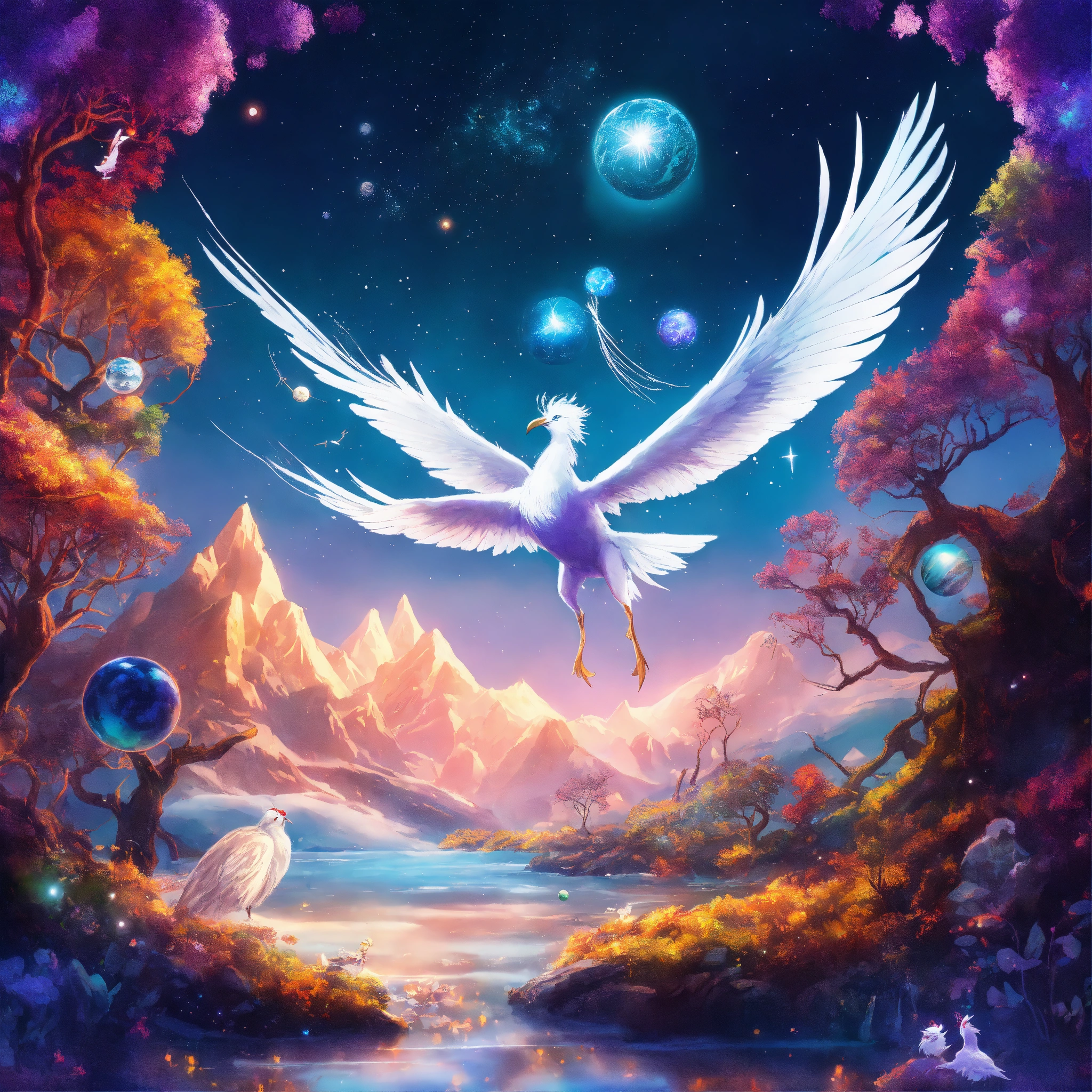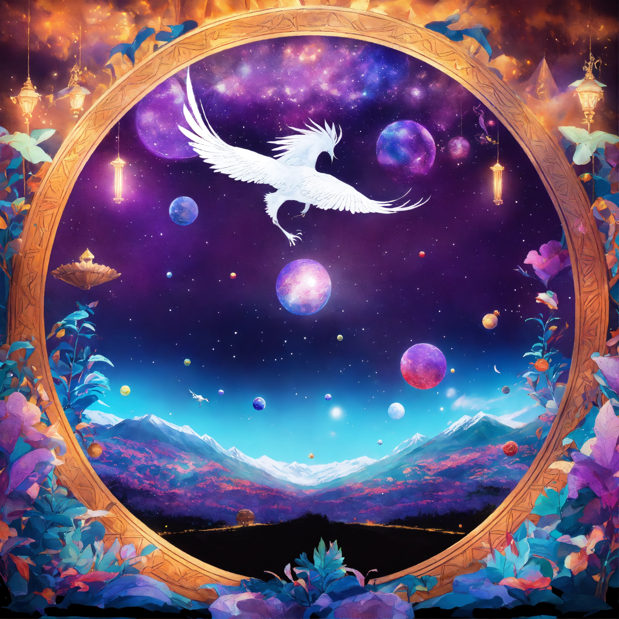 Underwater long exposure photography style, cartoon style, white giant bird circus flying in the cosmos with orbs and planets, x-ray style, jumping in martial arts posture, in the style of tim burton, lion king, the chronicles of narnia, beauty and the beast, and peter pan. with native american and sacred geometric patterns on the body. enchanting aura. the chronicles of narnia, wizard of oz, and alice in wonderland background with snow mountains, and trees with purple leaves.
