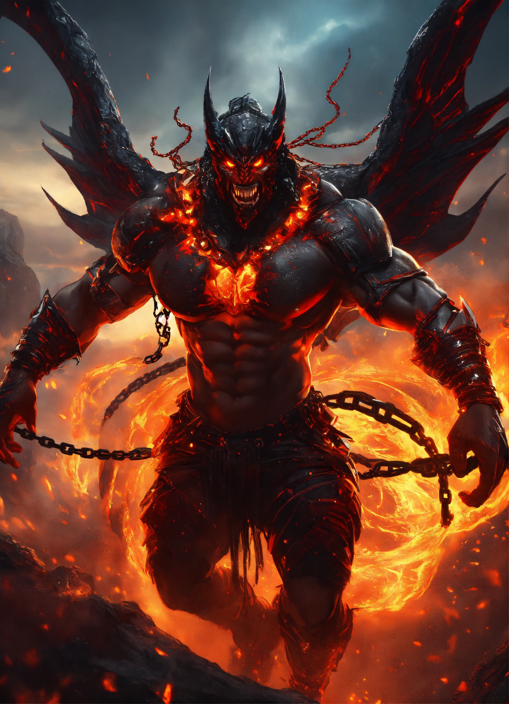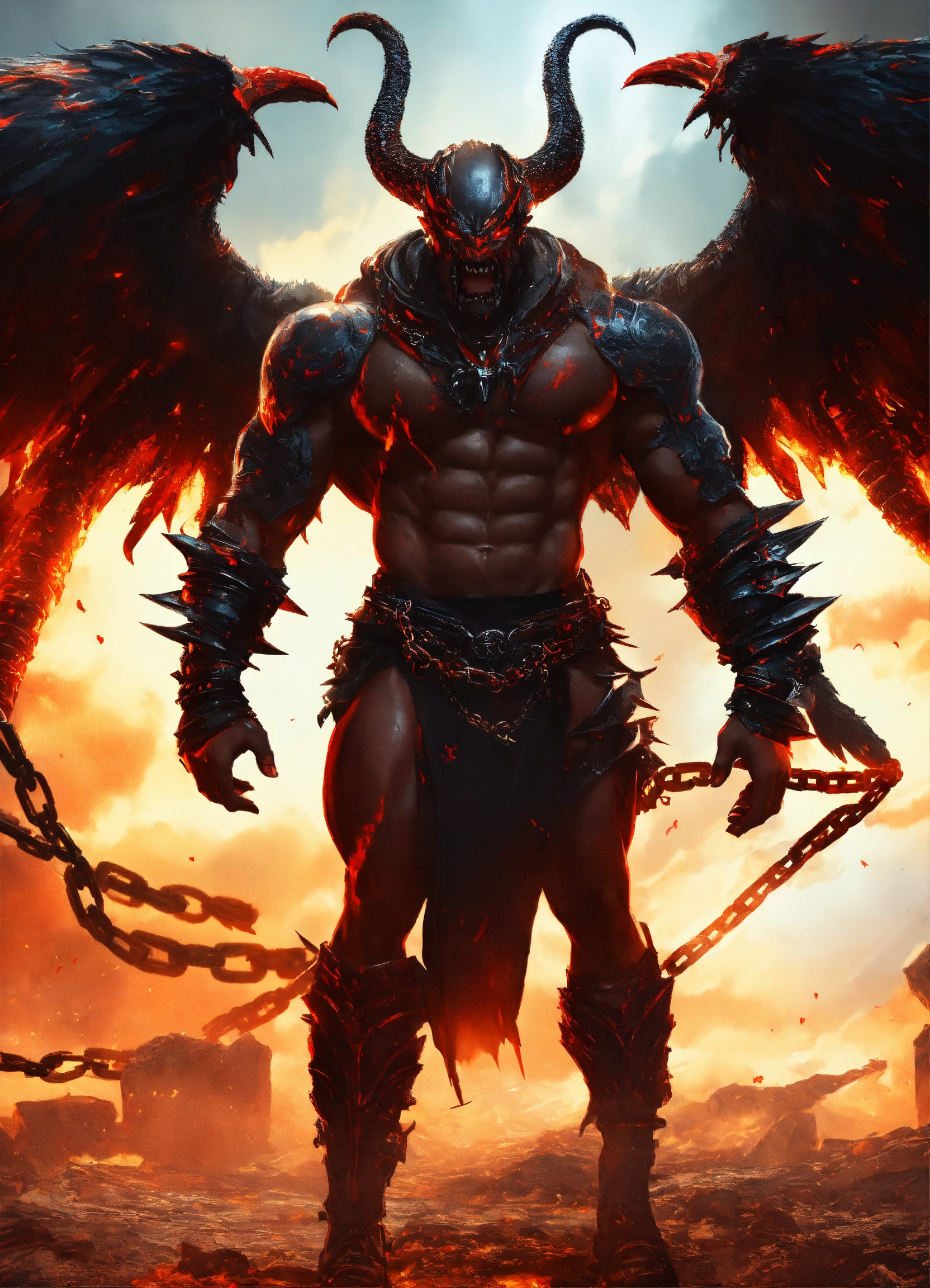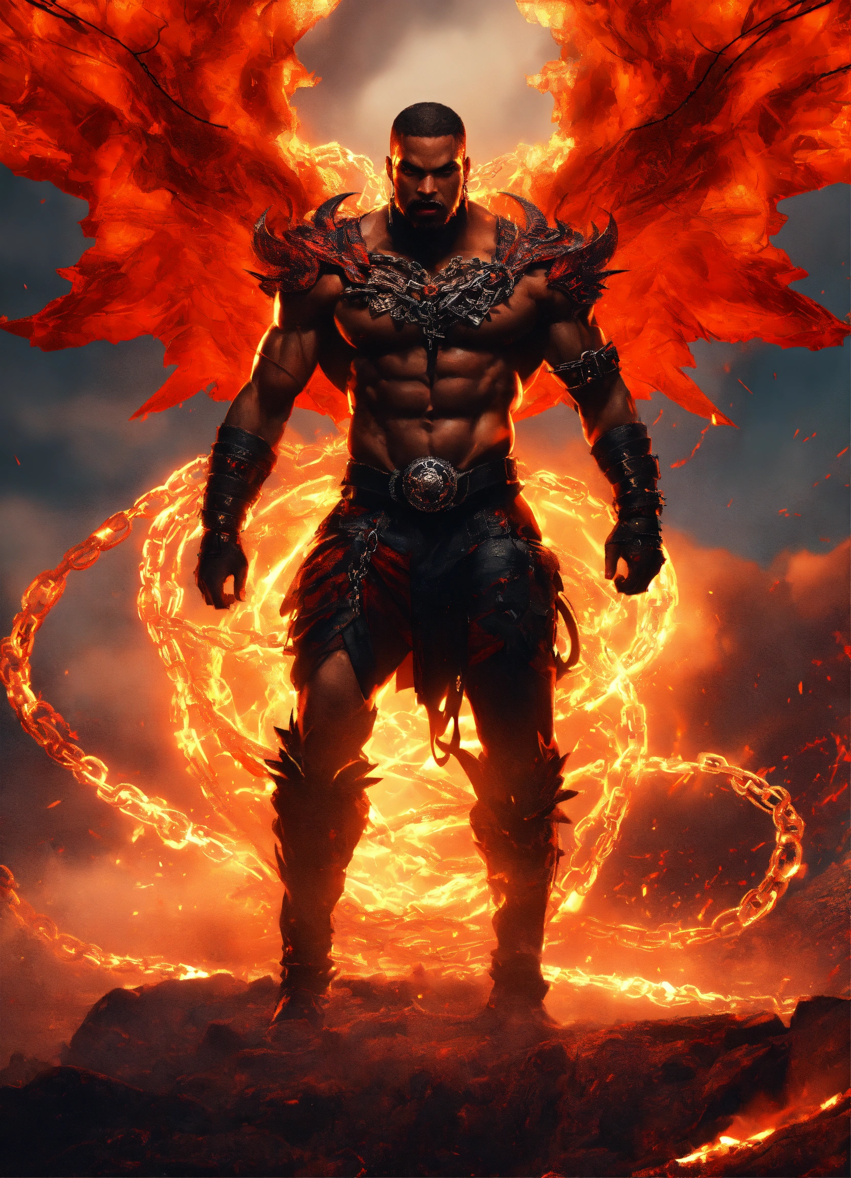 Full body huge muscular evil futuristic black warrior entangled in a red fiery spiral, strong fierce futuristic black demon warrior man with demon wings entangled in a fiery spiral carrying chains, fierce face with jagged teeth, strong muscular fully clothed wearing black warrior garb carrying chains, floating in the sky, fantasy, high detail, realistic photo, high detail, digital painting, cinematic, stunning, hyper-realistic, sharp focus, high resolution 8k, insanely detailed