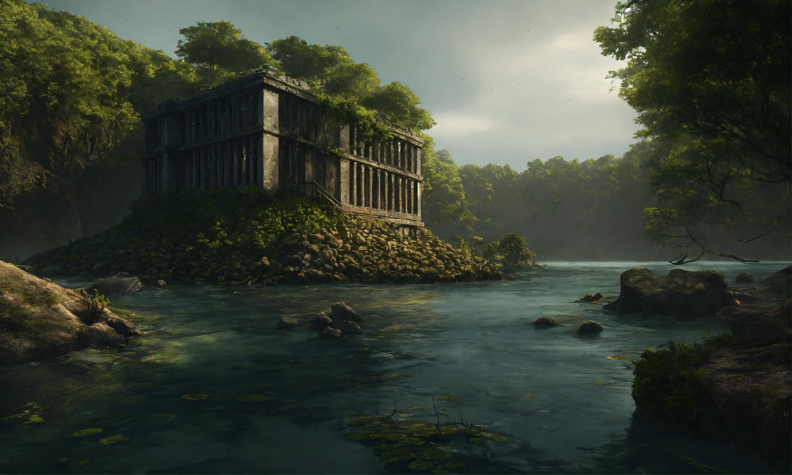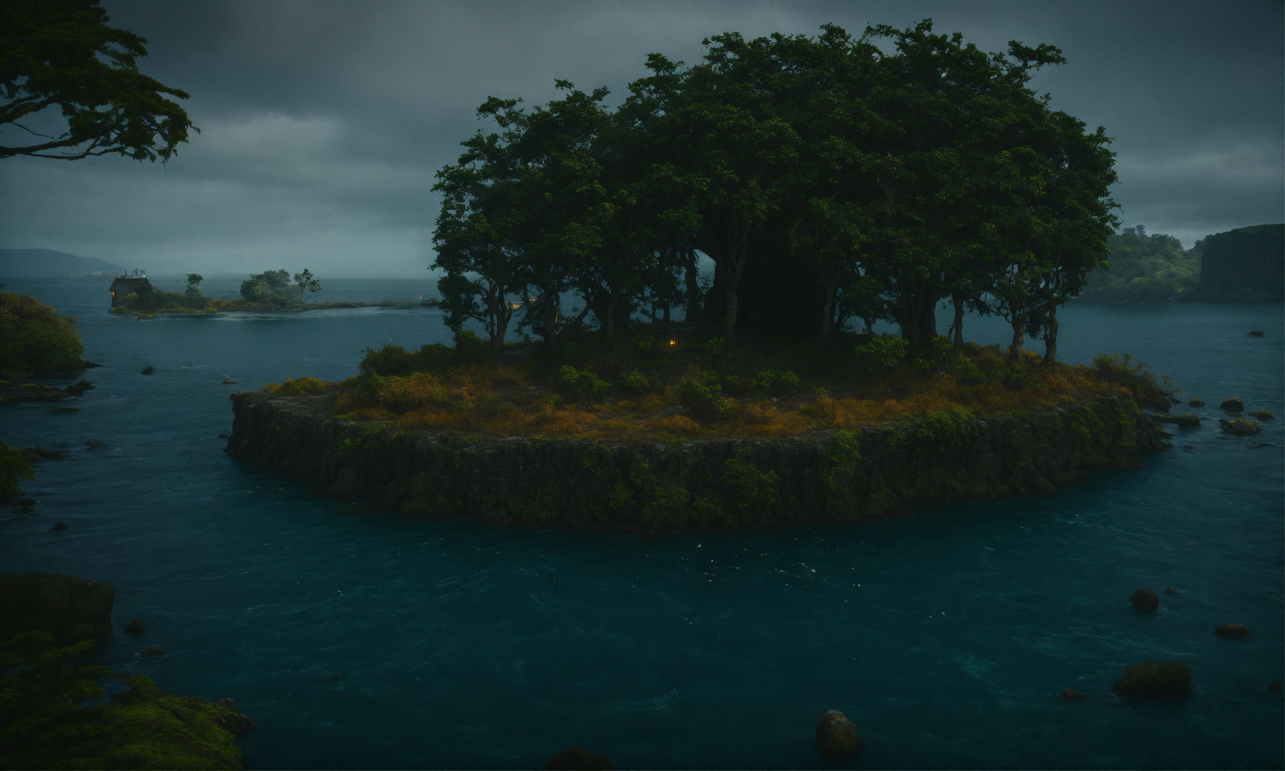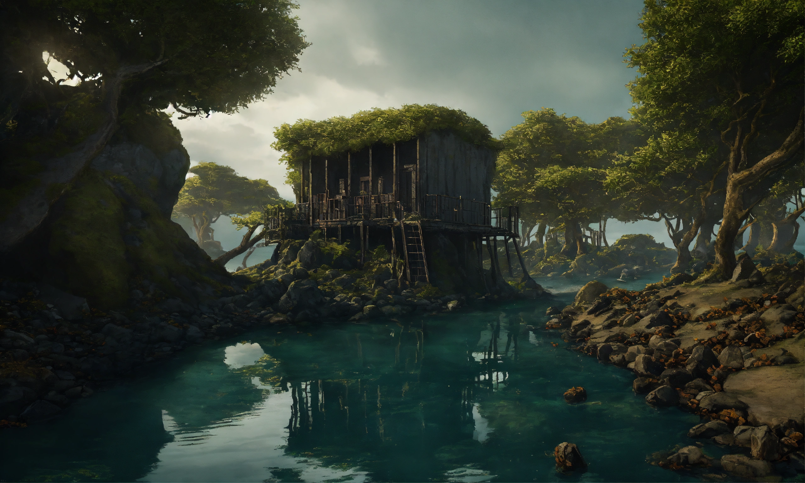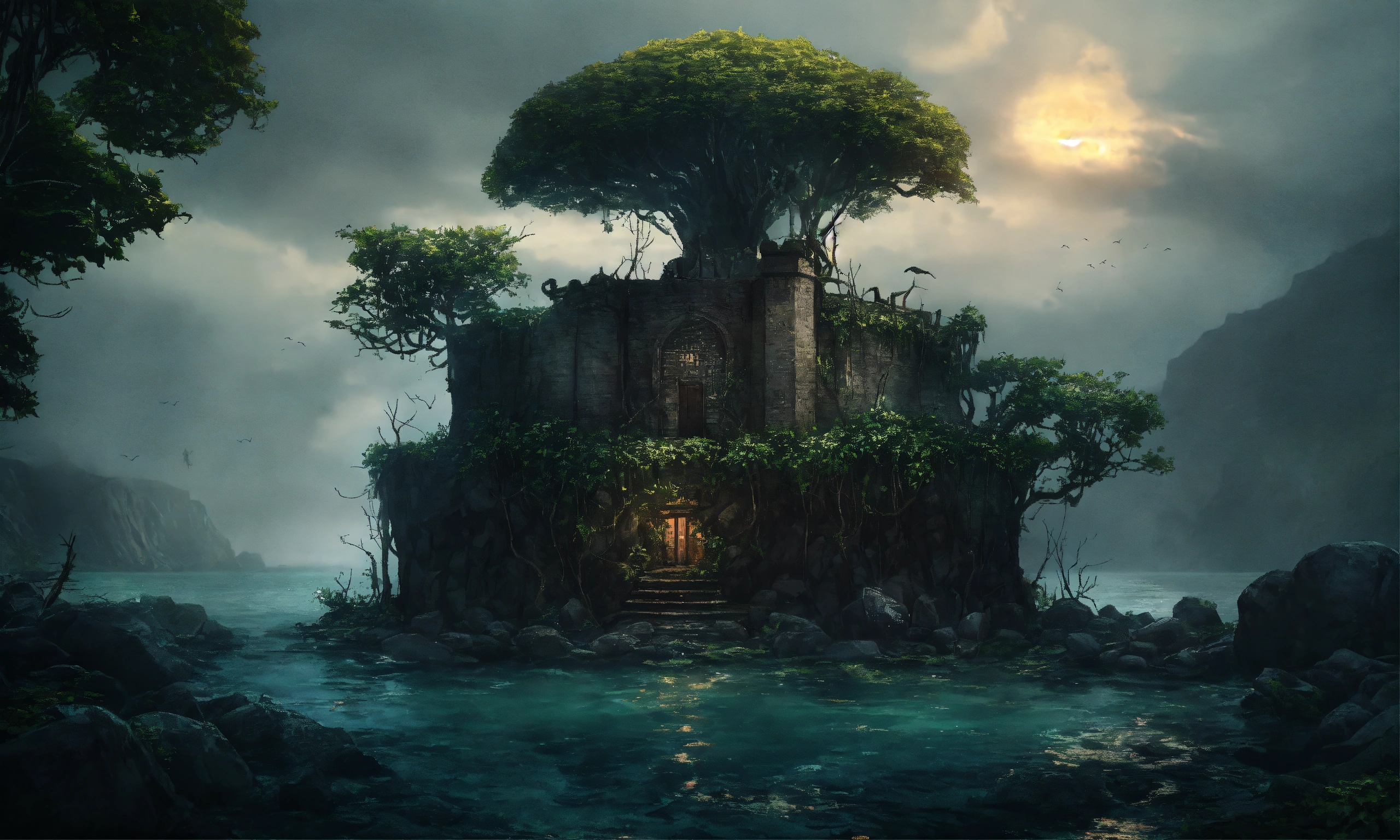 An prison of stones in a island surrounded with brambles and death trees everywhere around, the water surrounding the island is dark and looks terrifying
