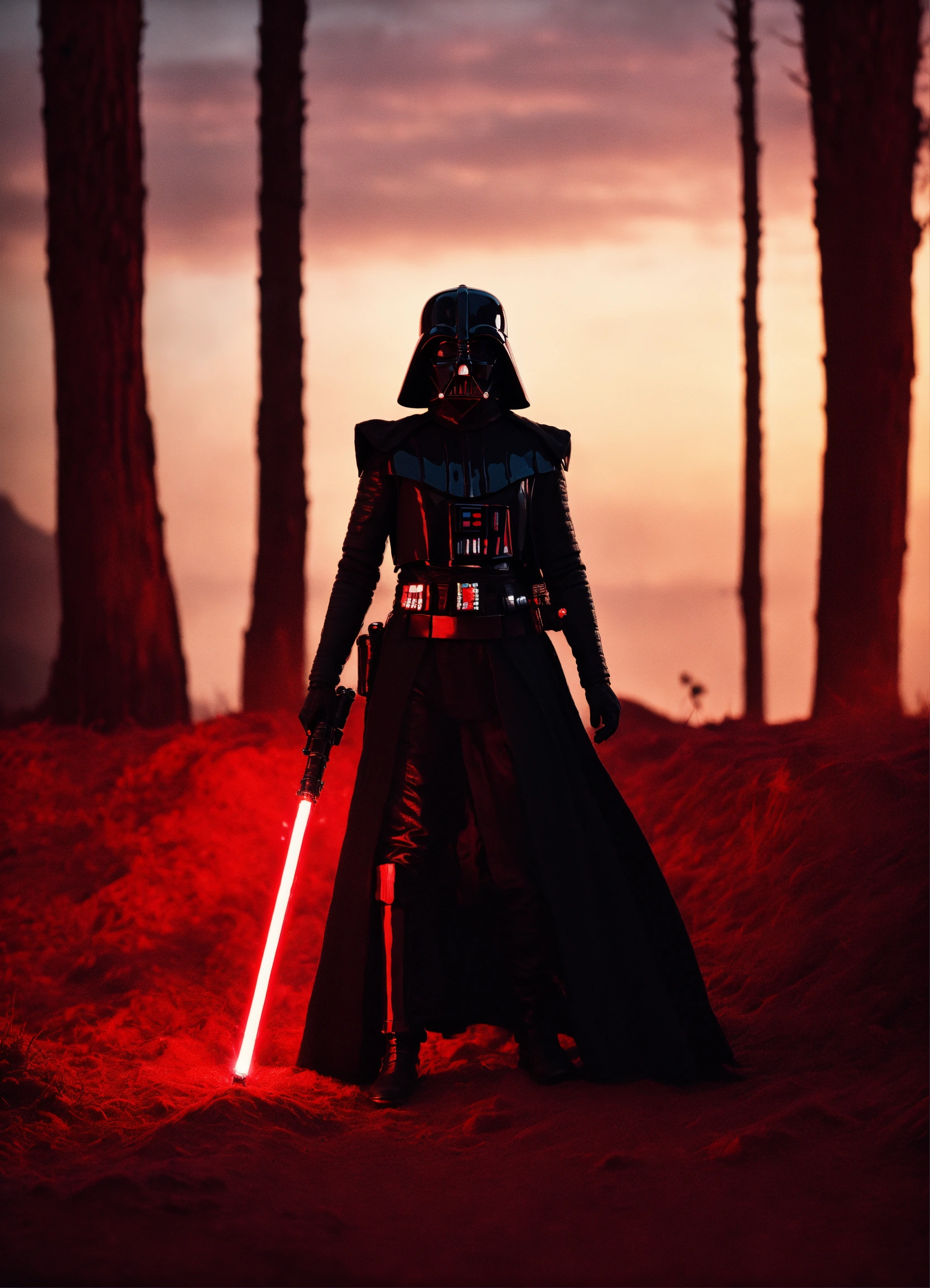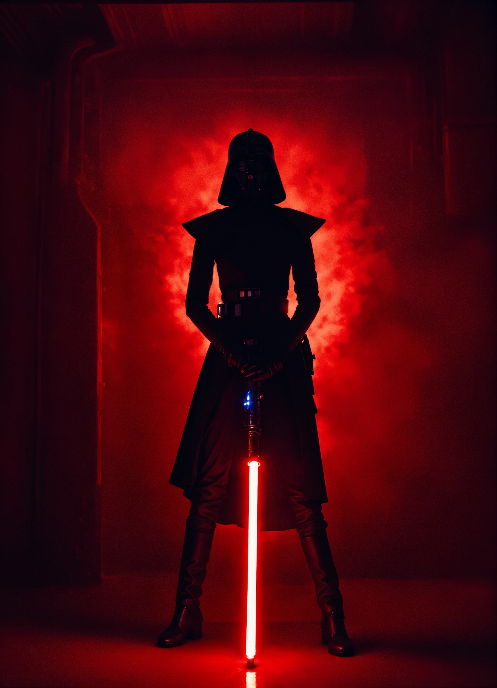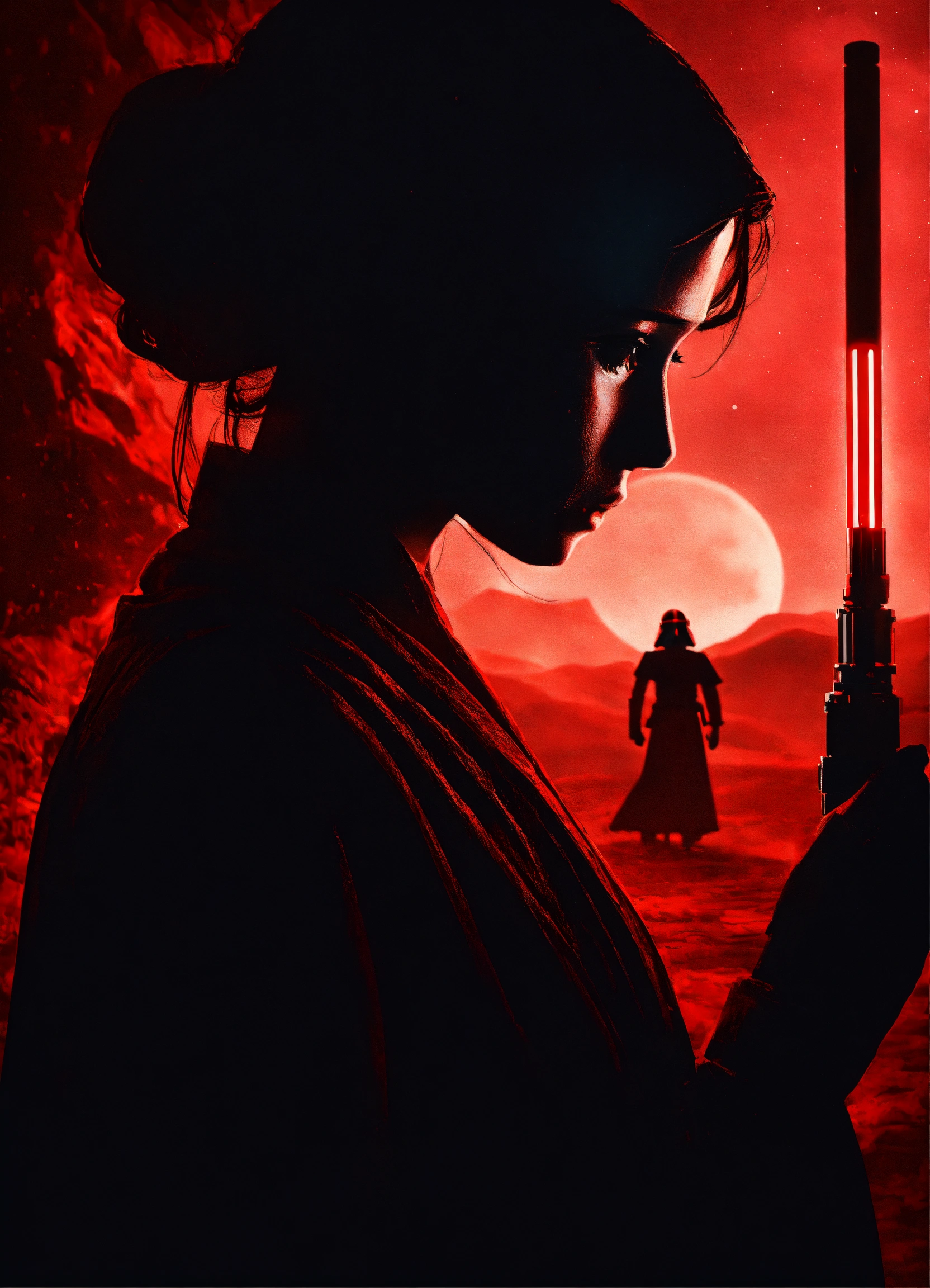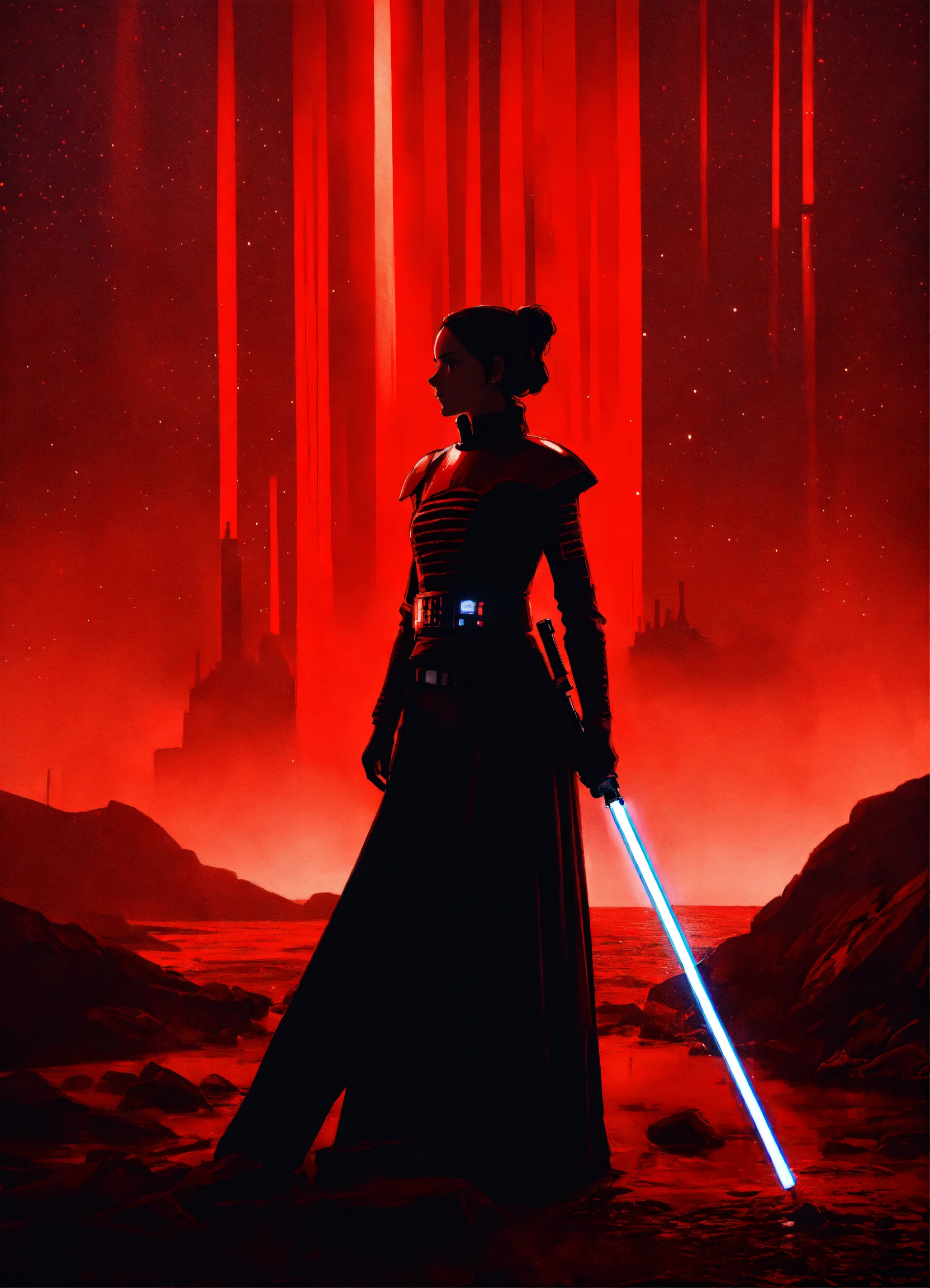 Portrait of a silhouette star wars figure in her red lightsaber, in the style of evocative environmental portraits, dark, red