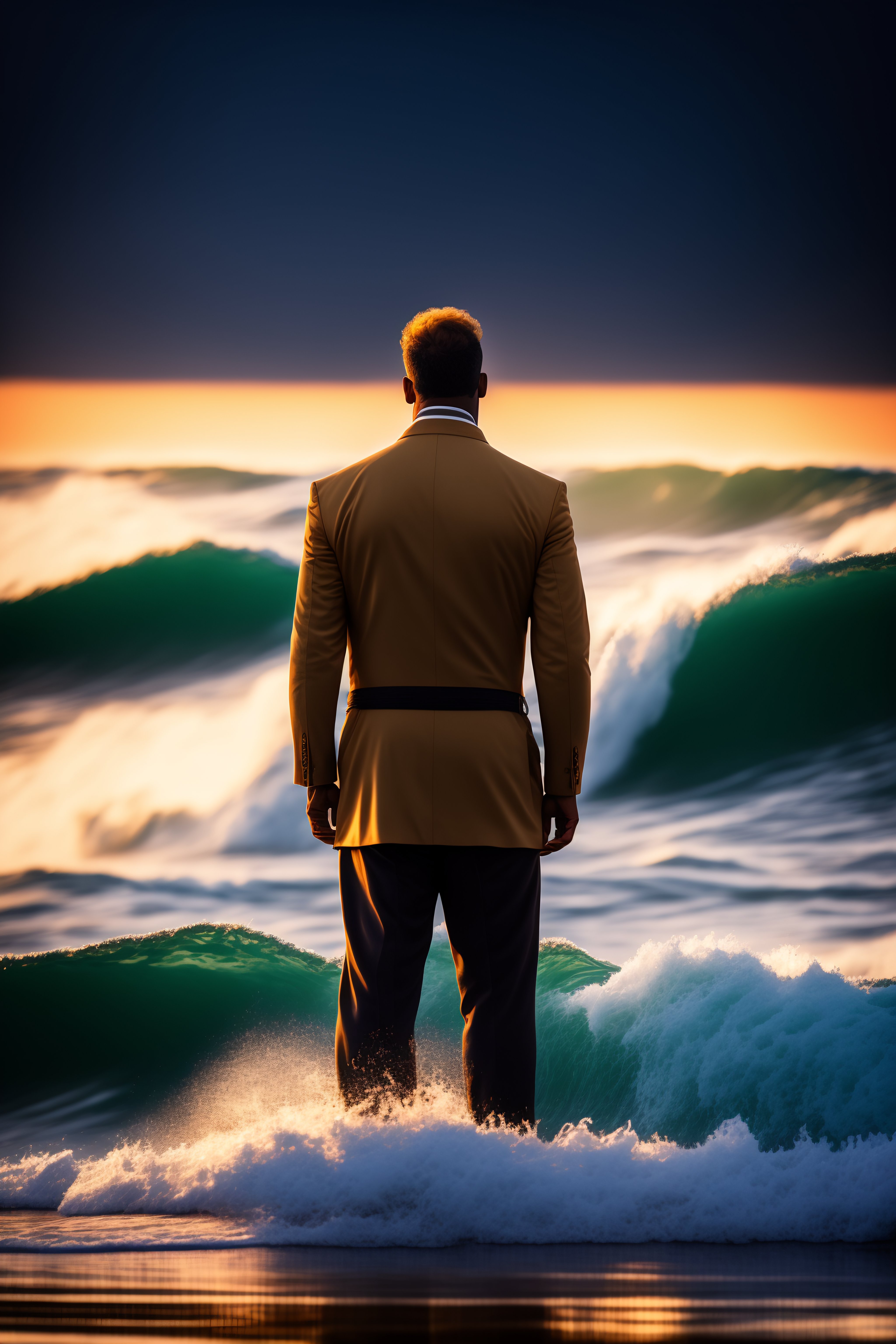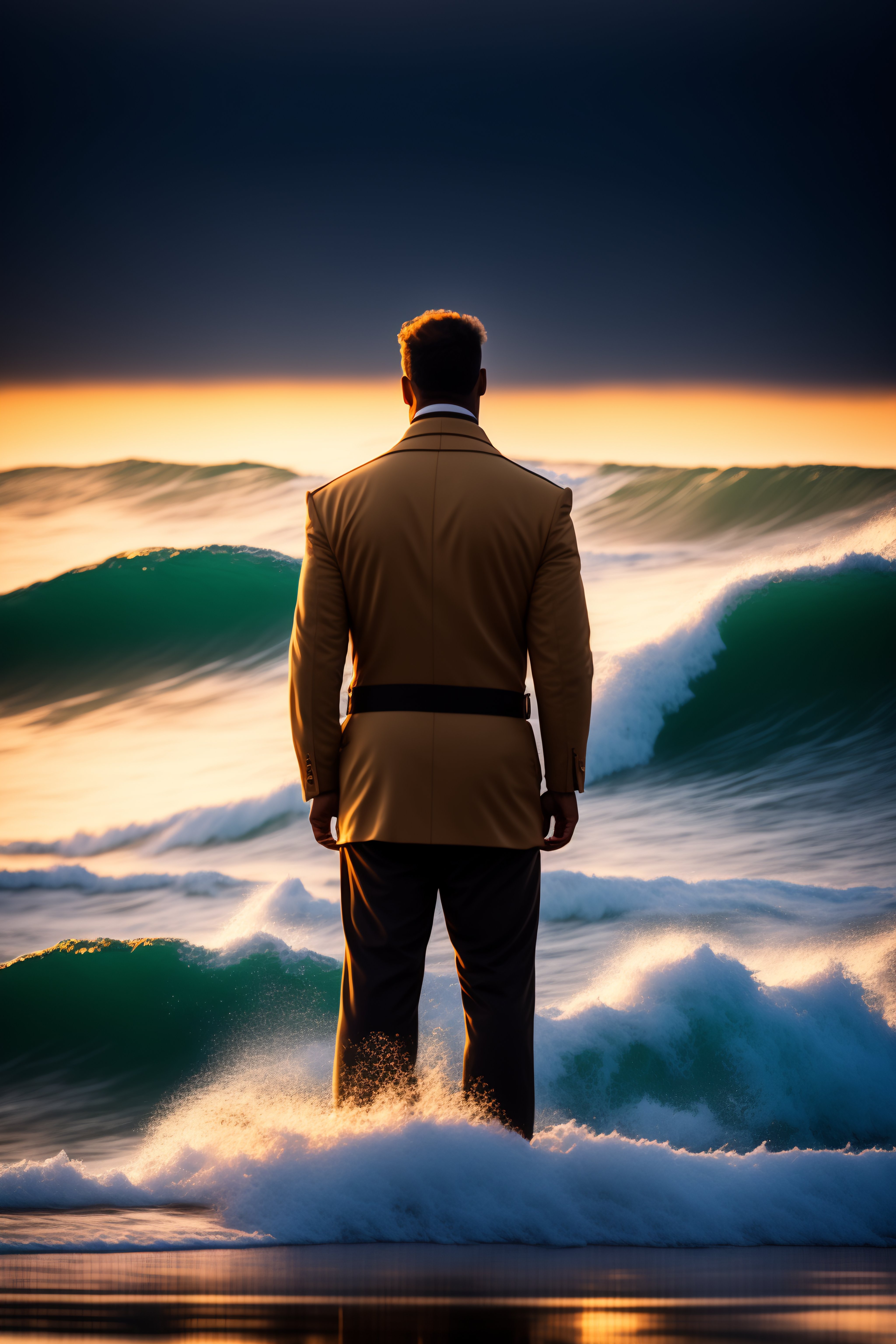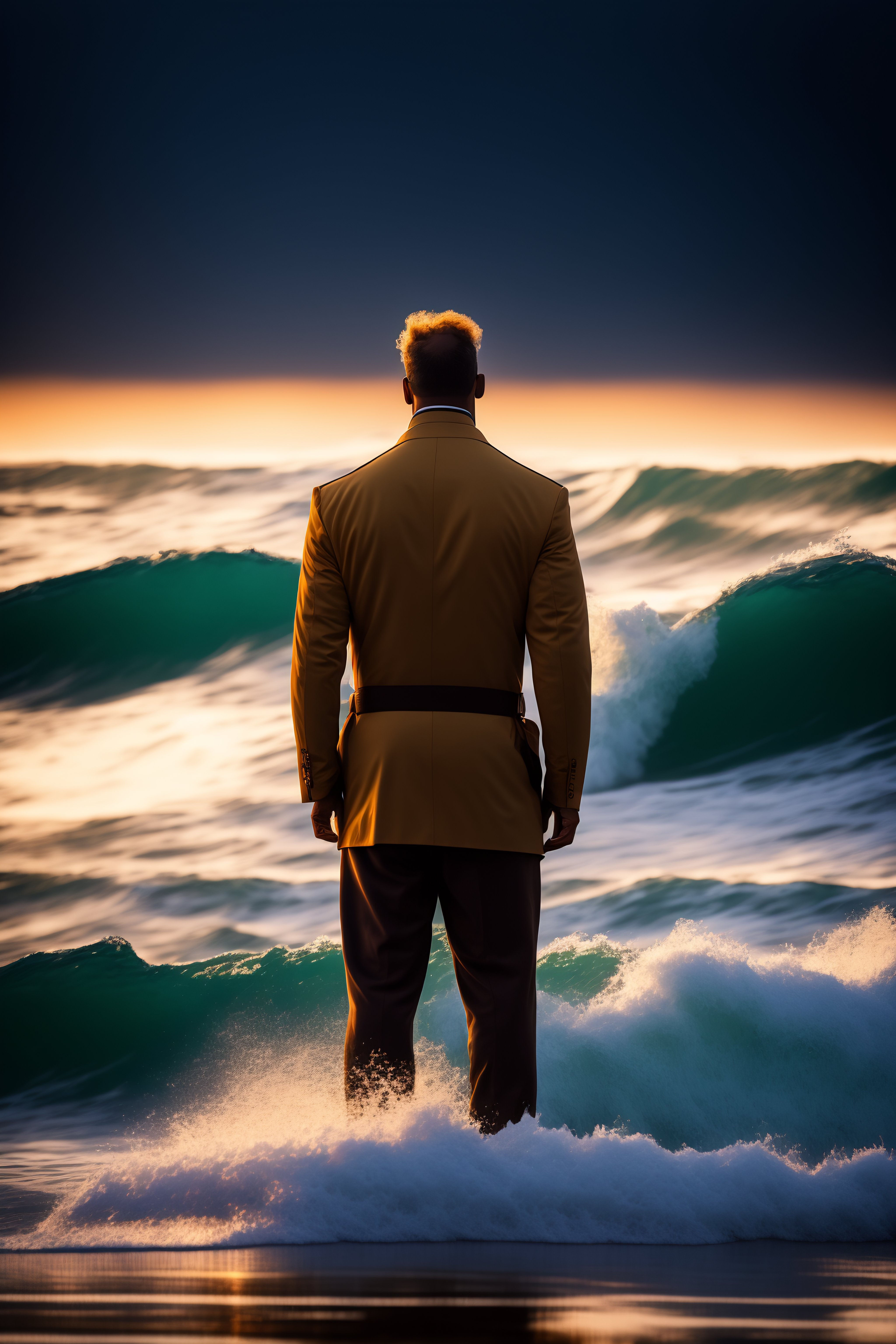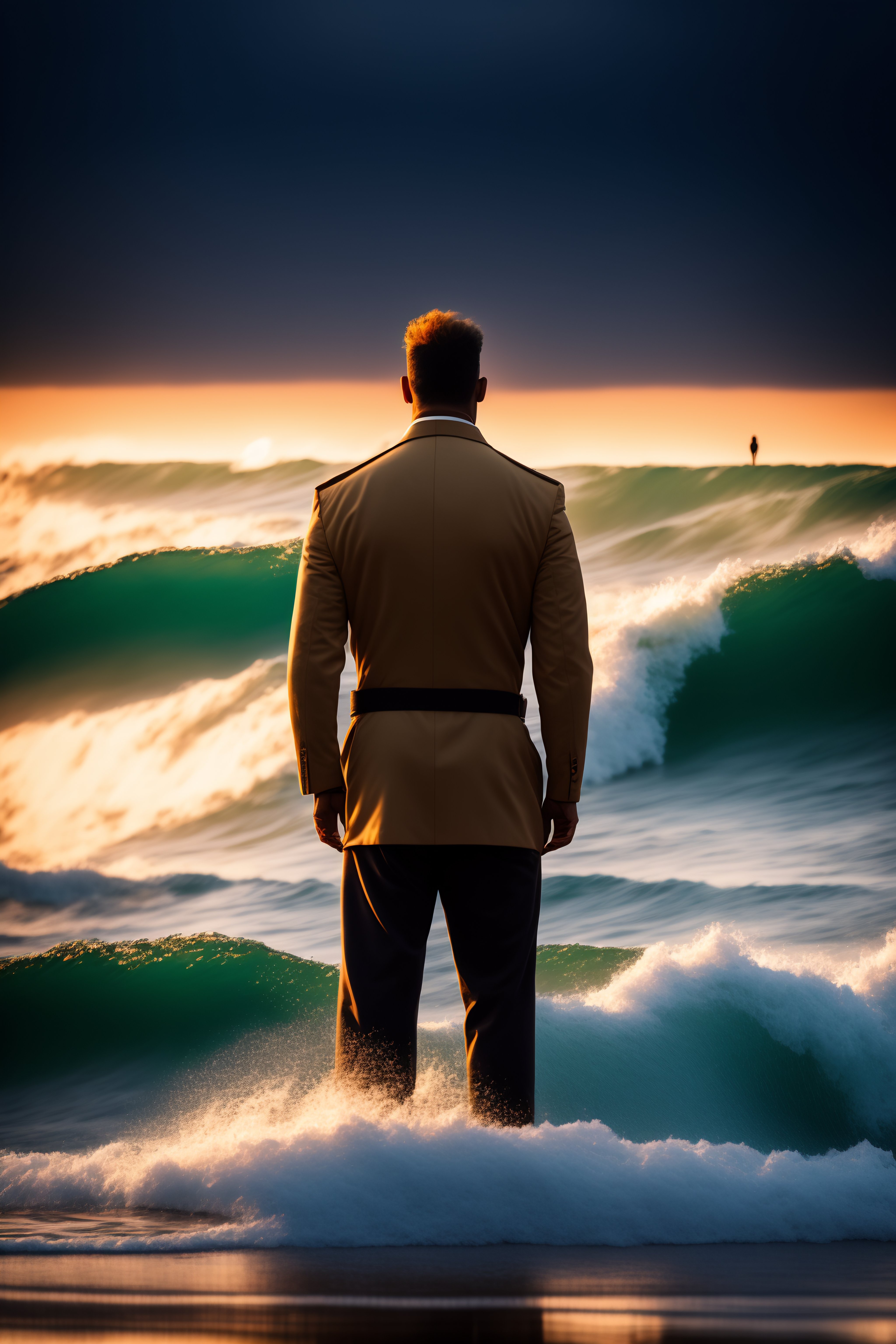 As the sun sets on the horizon, casting a golden glow over the landscape, a lone man stands at the edge of the sea. his stance is calm and composed, as if he is ready to take on the raging waves head-on. behind him, tall iron rods stand like sentinels, their bases buried deep in the ground. as the waves crash against the shore, the rods bend and sway under the force of the water. but the man remains resolute, standing tall as the waves wash over him. he may flicker and sway, but he never falls, standing firm in the face of the tumultuous sea. the power of the ocean may be great, but it is no match for the strength and determination of this solitary figure.