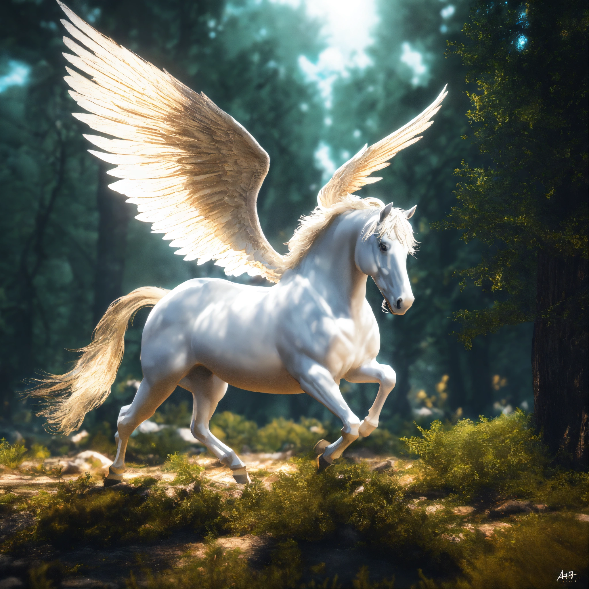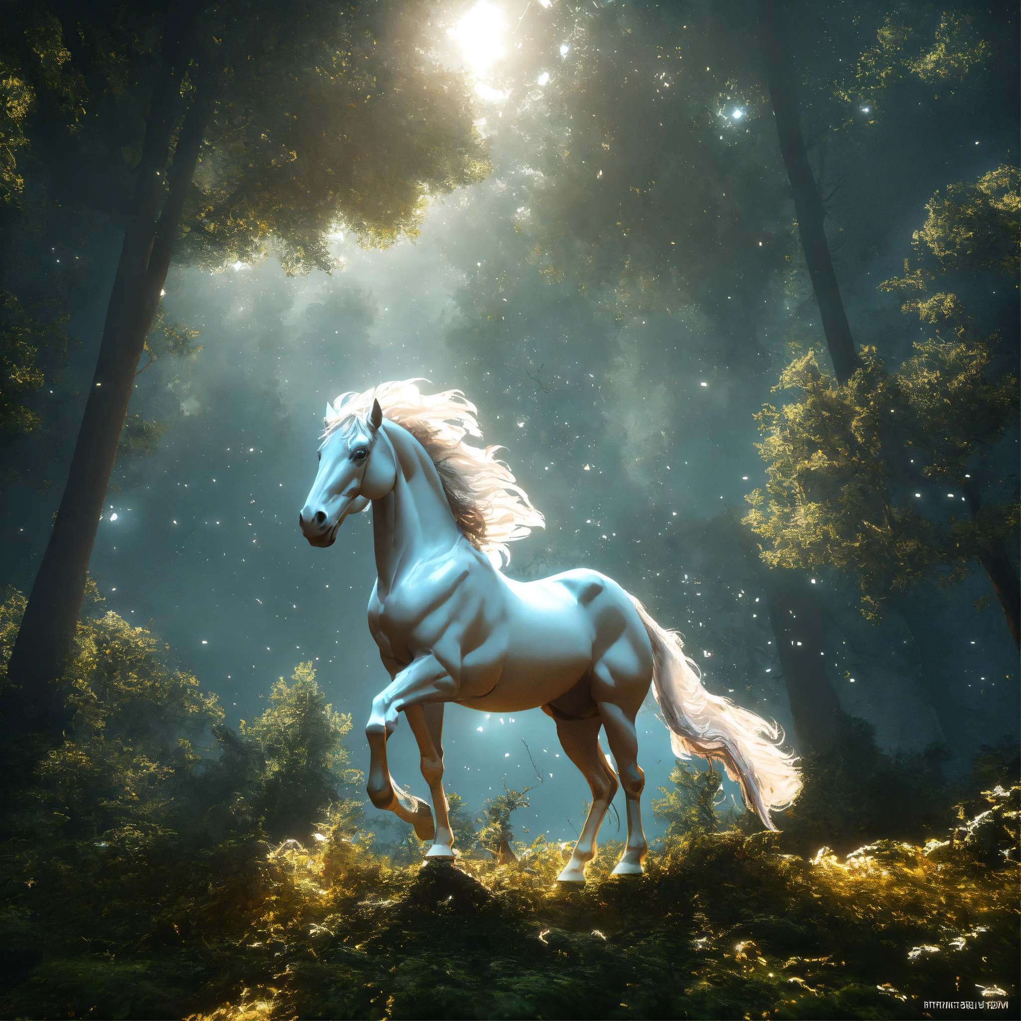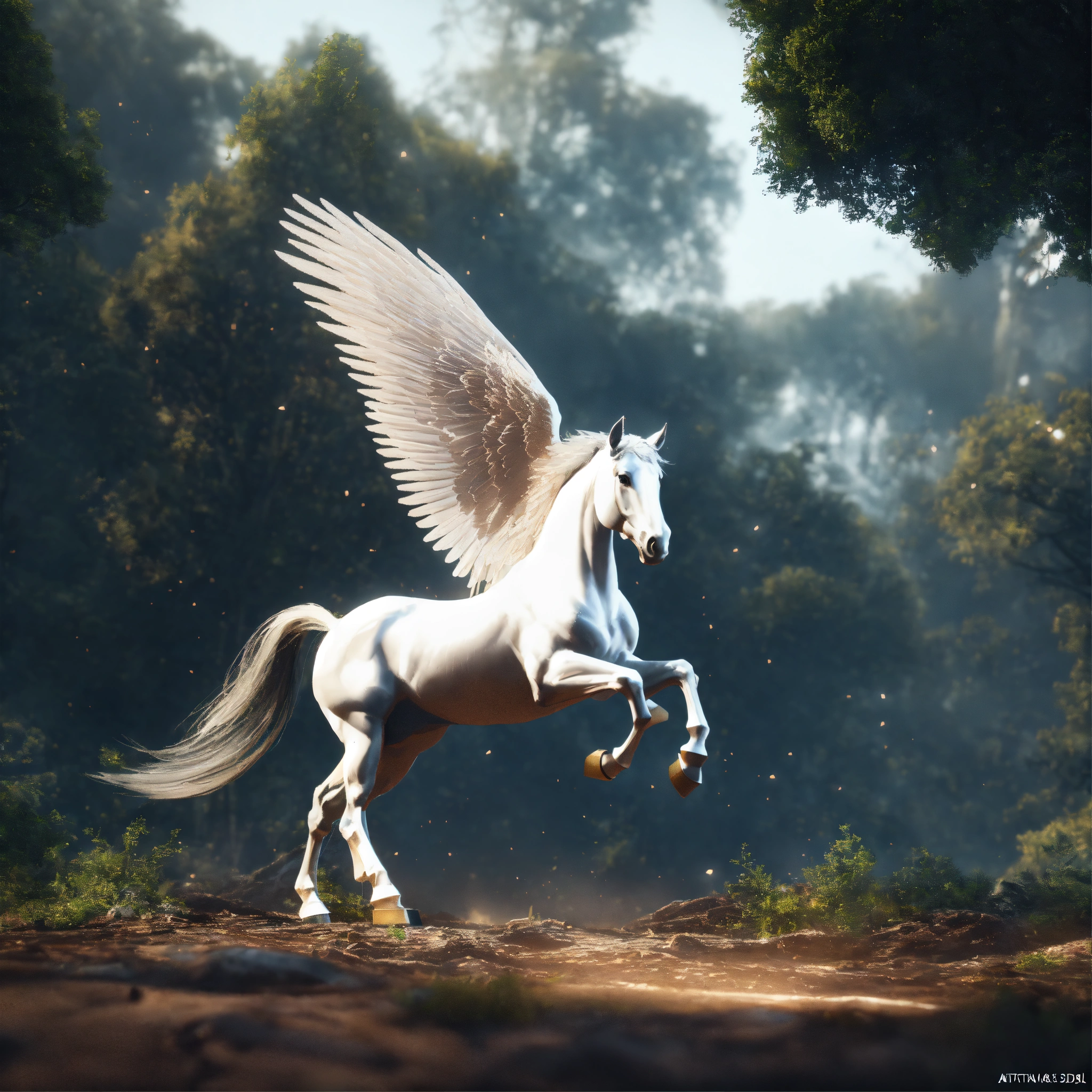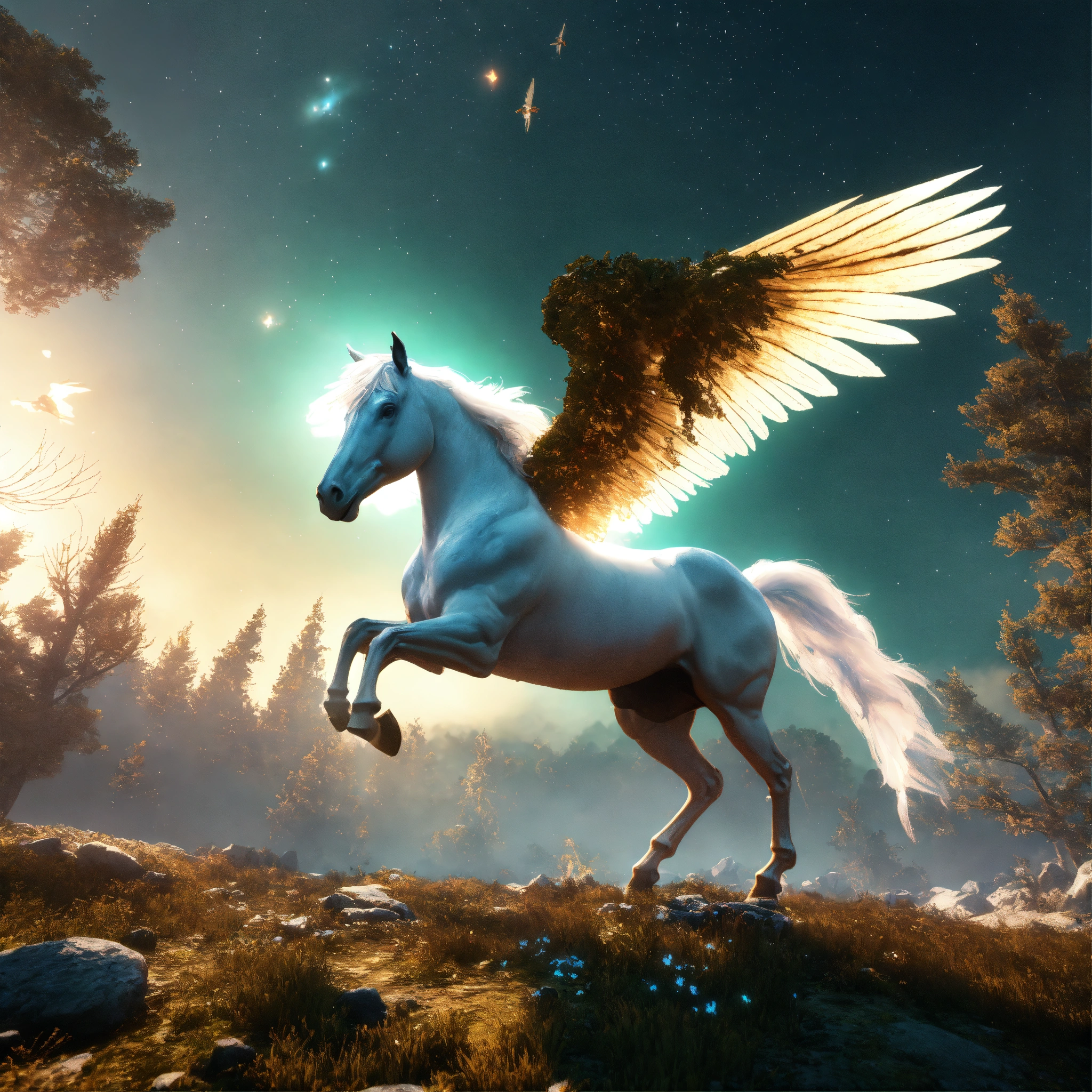 Winged horse white, fly in sky nebula, artstation scifi 3d scene of a showing forest, maximalism, ambient occlusion, atmospheric haze, unreal engine, hyper realism, realistic shading, cinematic composition, realistic render, octane render, detailed textures, photorealistic, wide shot