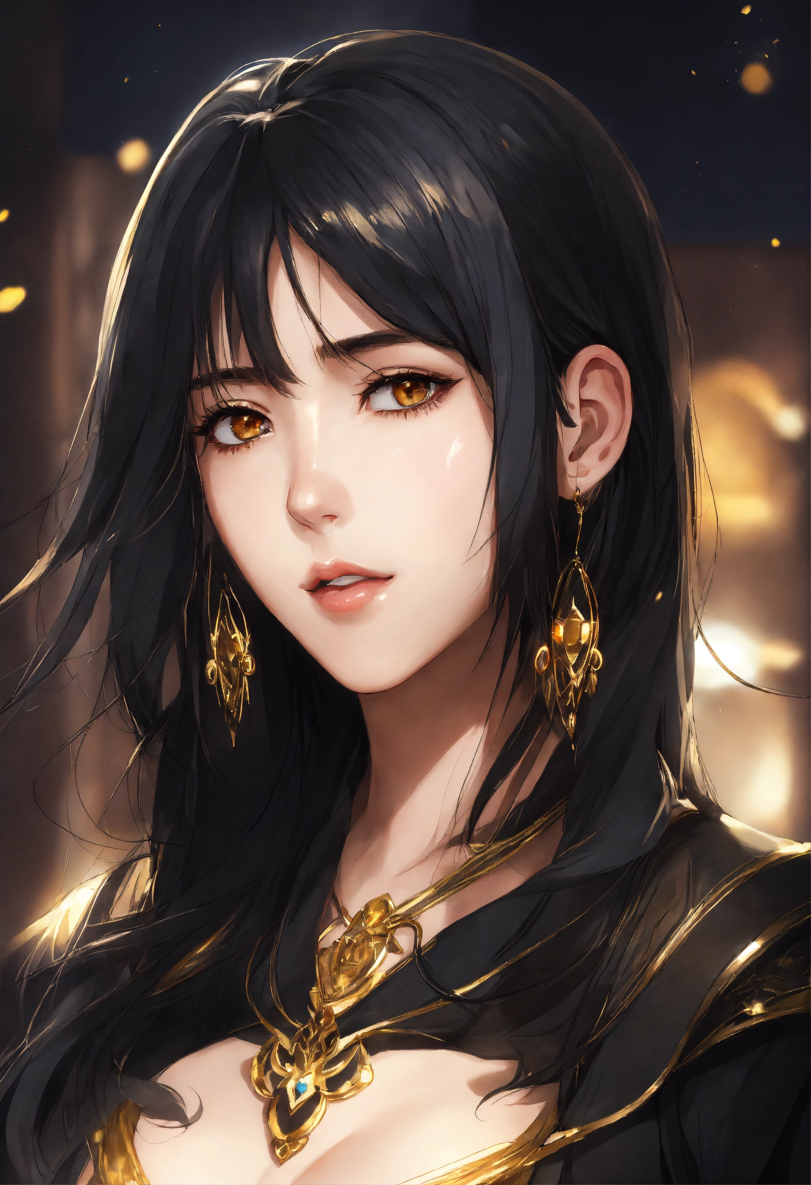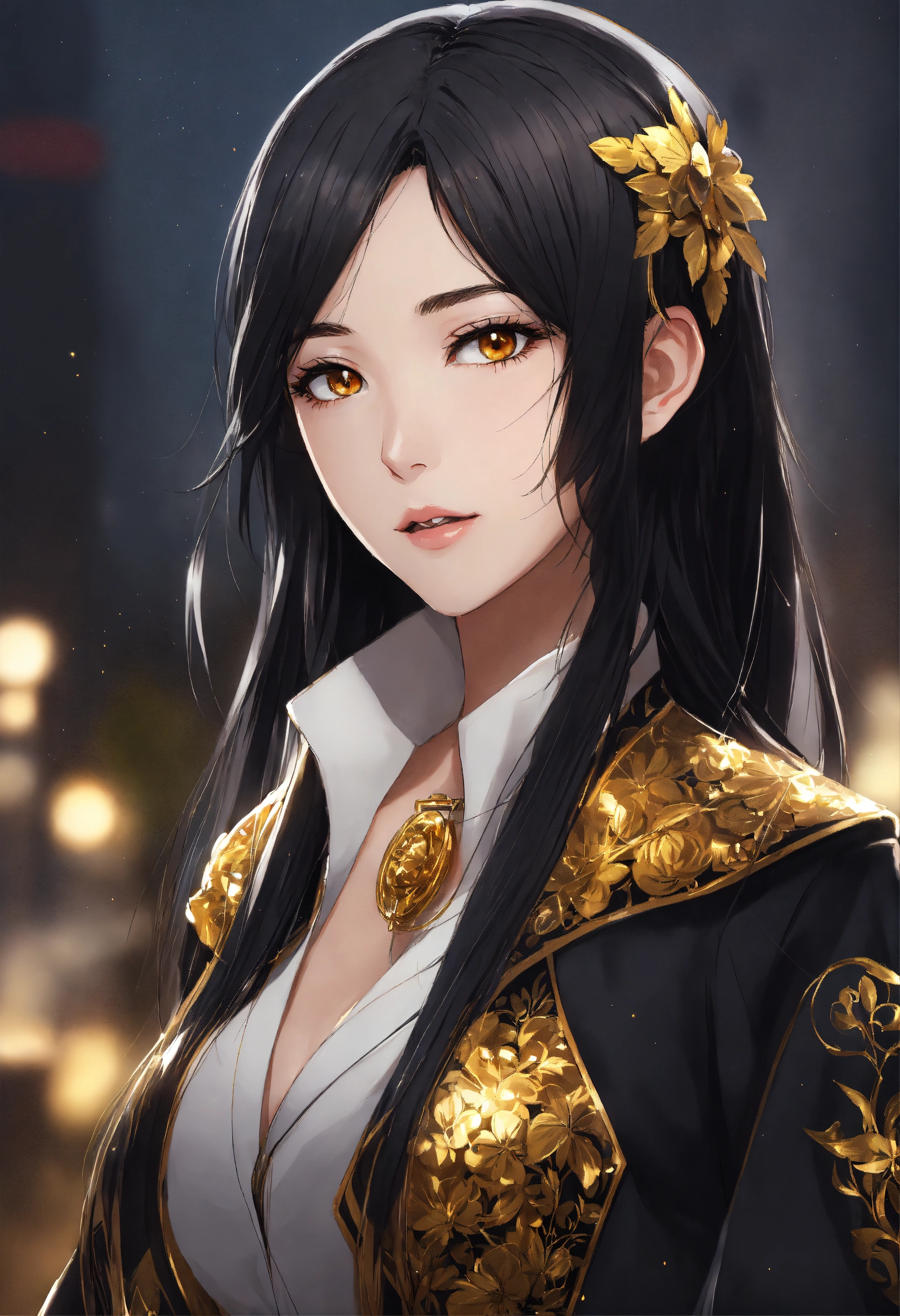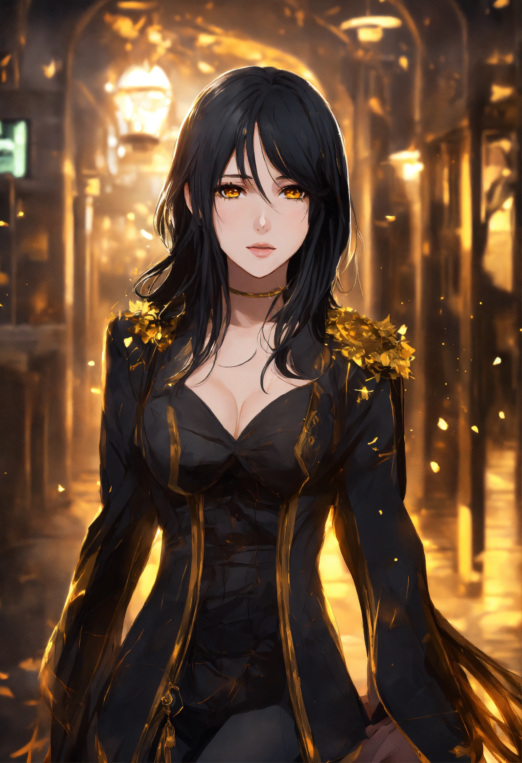 Woman 25 years old. shoulder length black straight hair. golden eyes. the face is beautiful, but not flashy. anime reskin style