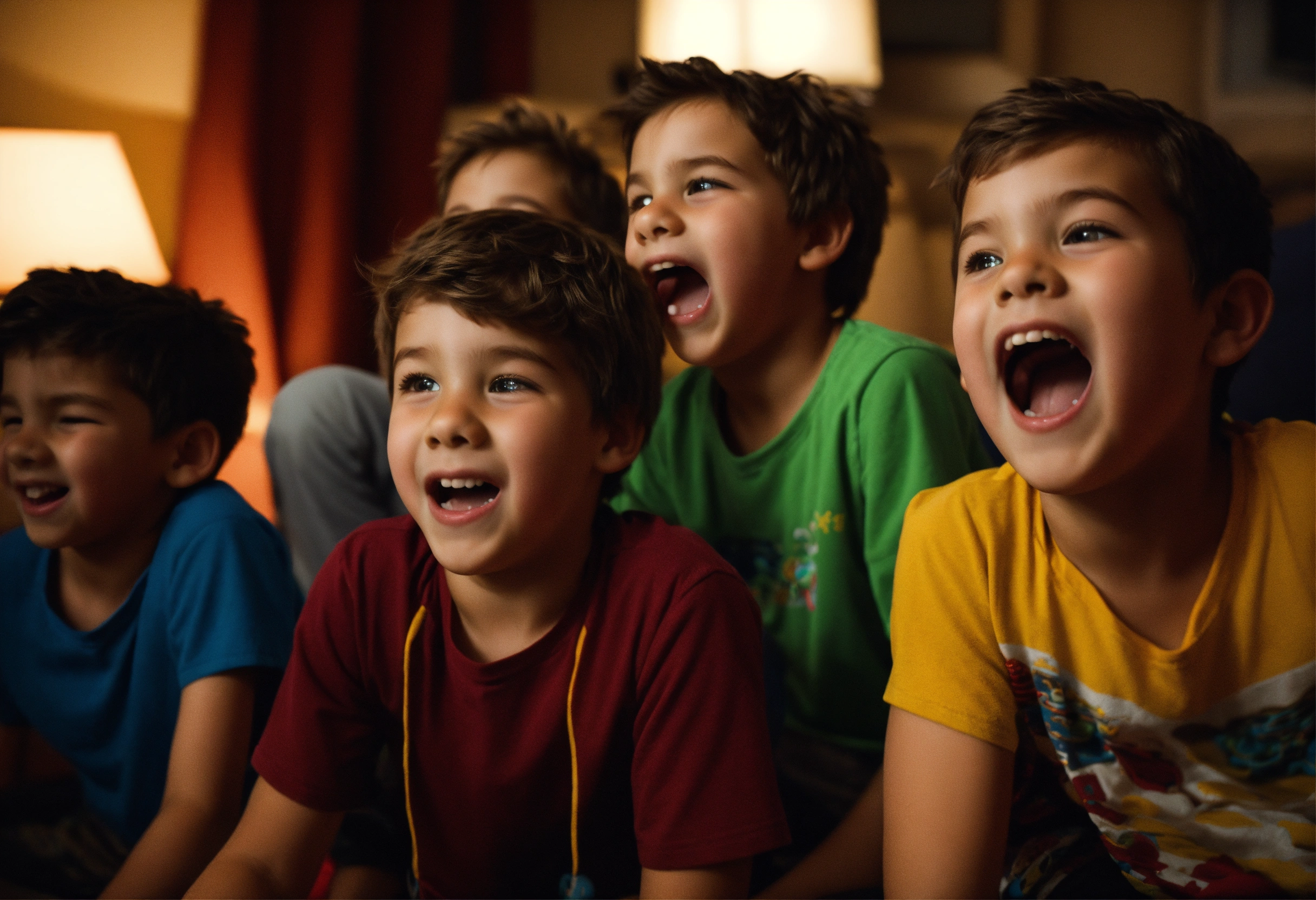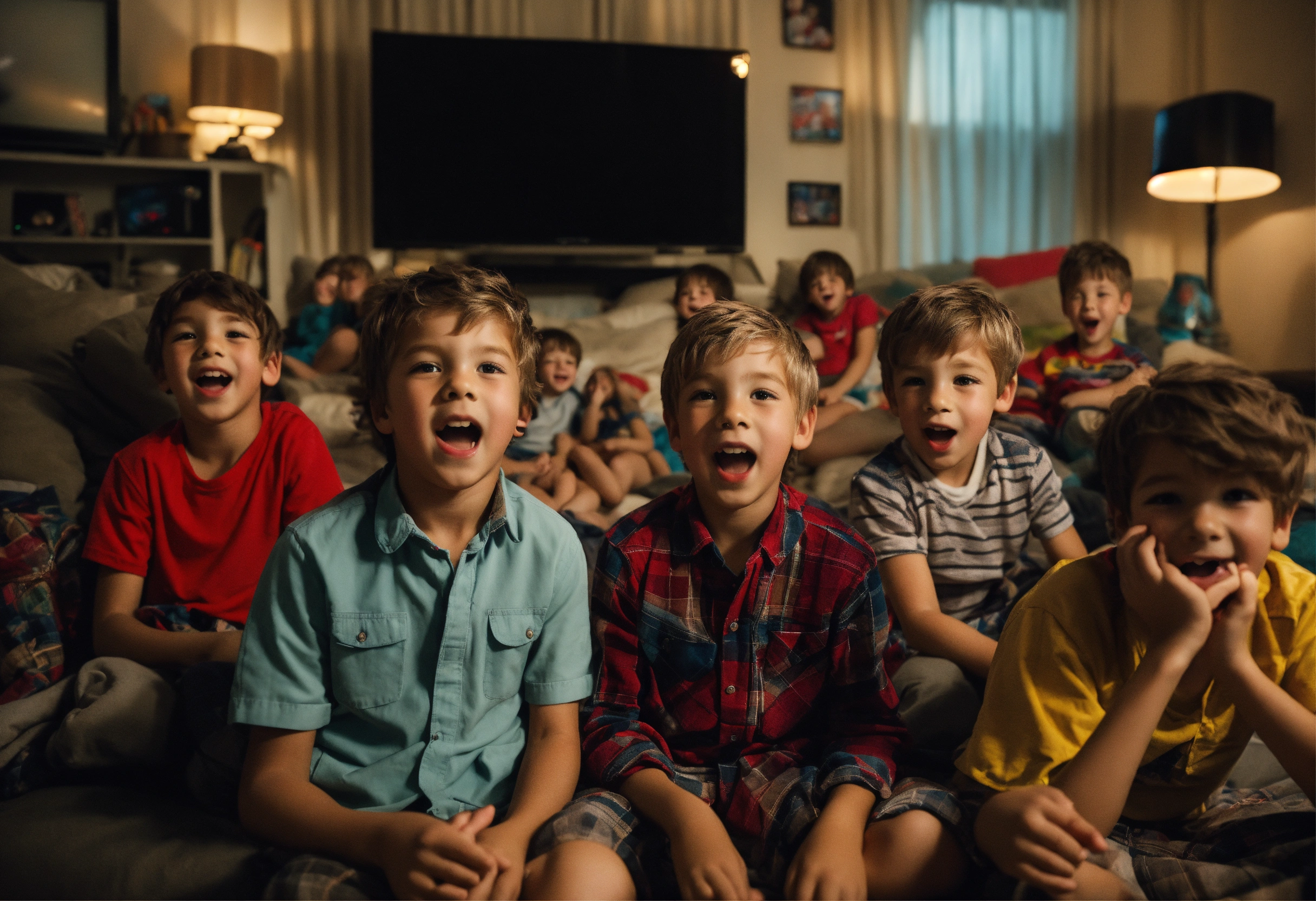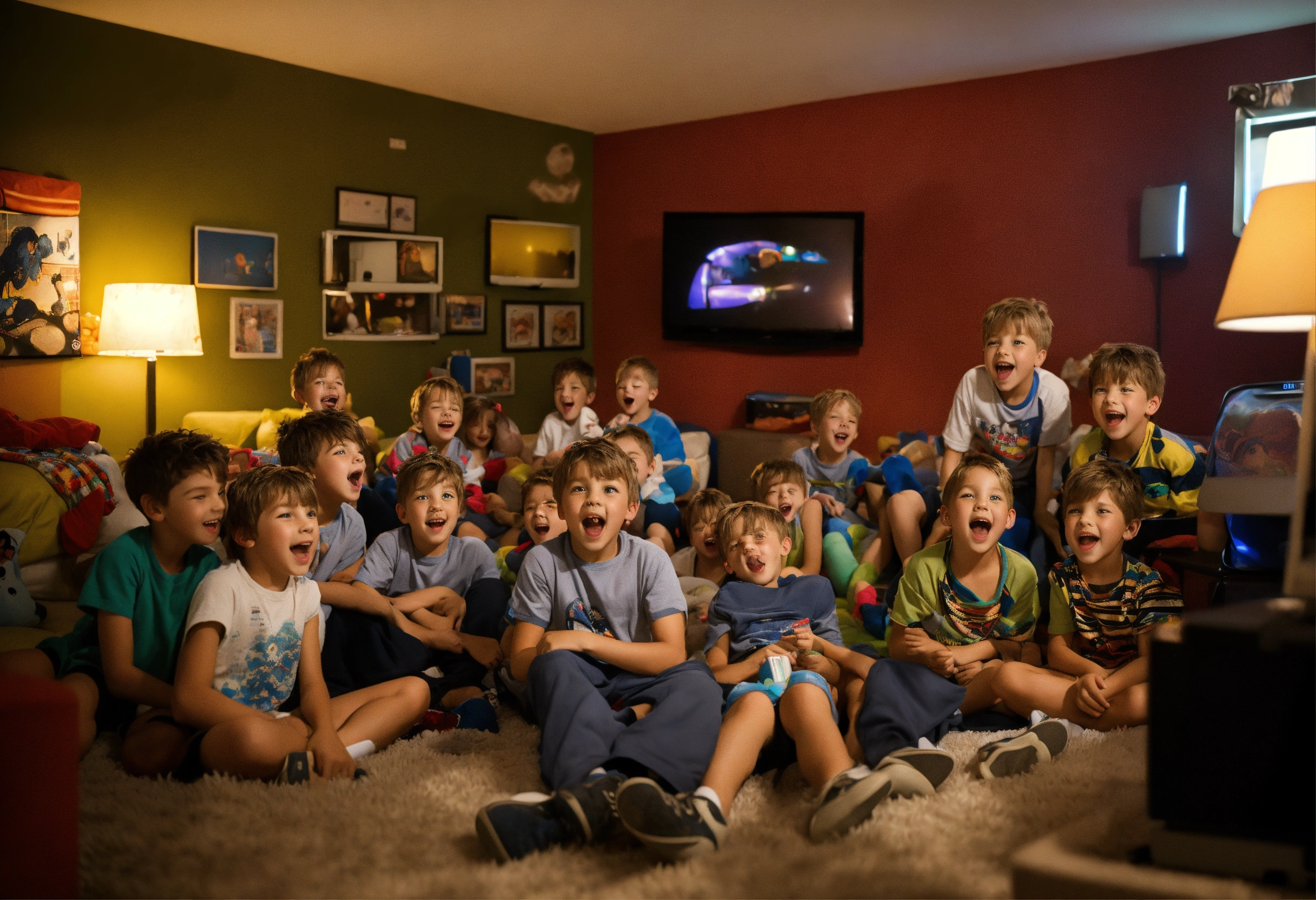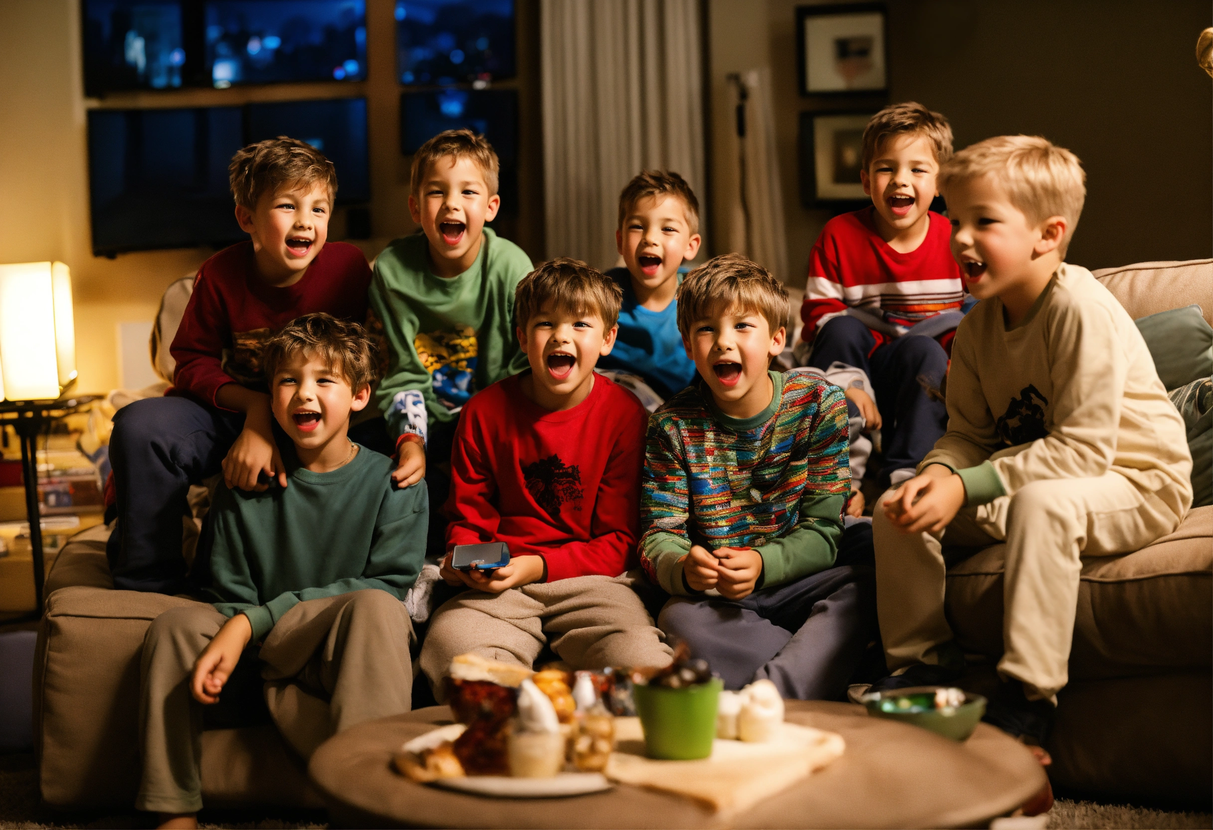 (photo, real1), group of rowdy little boys, single focal point, 8-year-old boys, varying faces, excited, shouting, cheering, sleepover party, slumber party, varying expressions, different expressions, (living room, tv room, interior environment, night time, sleepover party environment1), (wide shot, zoomed out1), (soft focus, depth of field1), varying hairstyles, varying body types